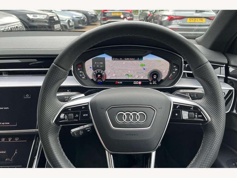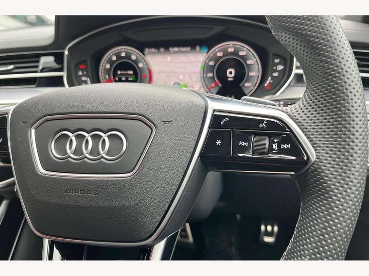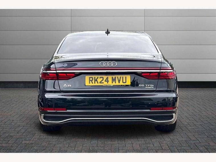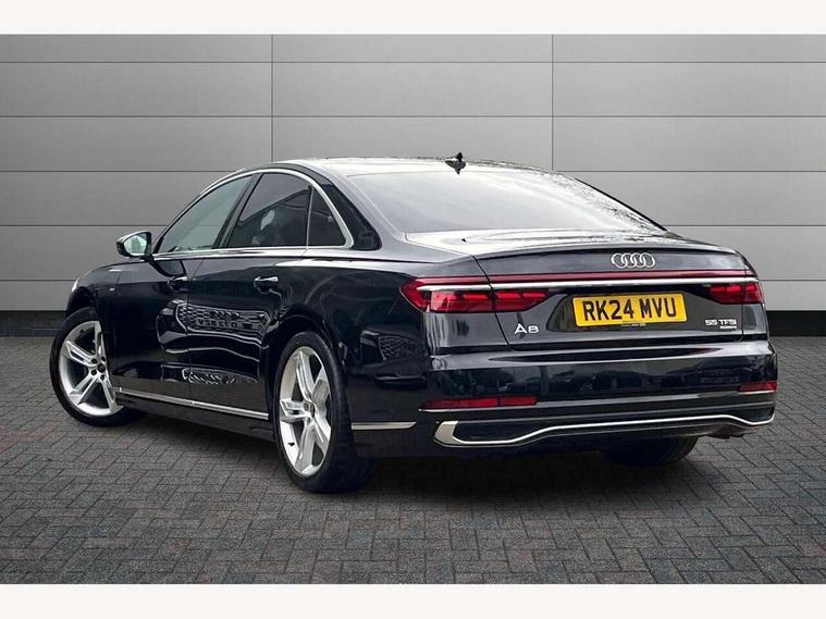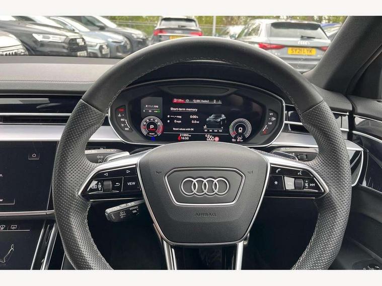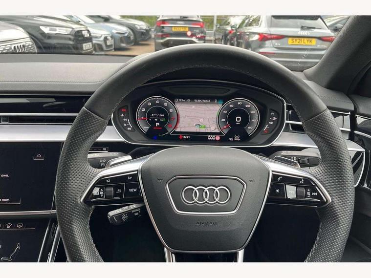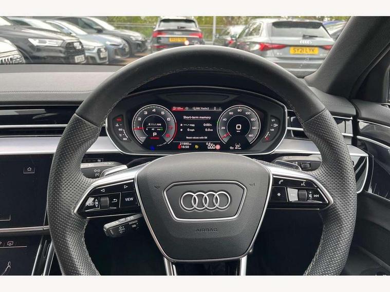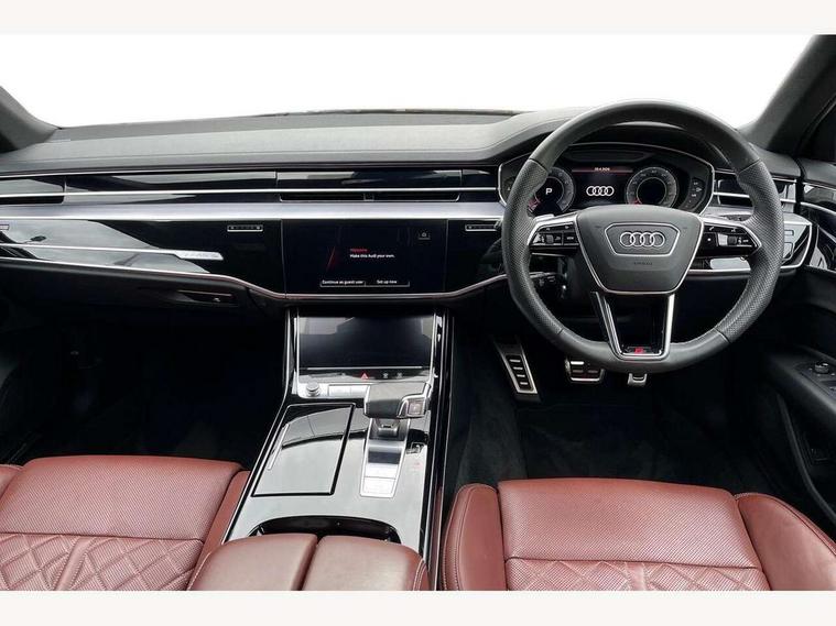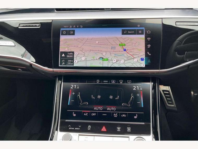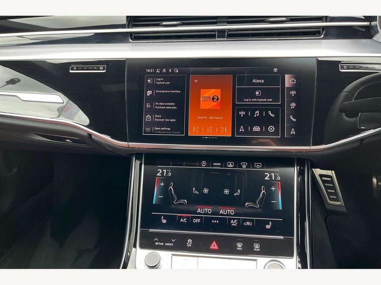 'Lights On' Reminder warning buzzer, Adaptive cruise control with cruise assist, emergency assist, efficiency assist, swerve assist, turn assist and speed limiter, Audi connect safety and service (e-call), Audi drive select, Audi parking system plus with front and rear sensors, Audi smartphone interface with app store includes wireless Apple carplay, Android auto and Amazon alexa integration, Audi virtual cockpit, Bluetooth interface, Camera based traffic sign recognition, Convenience key, Electro - mechanical power assisted steering, Head up Display, MMI navigation plus with MMI touch + Twin touch screens with haptic feedback, Operating buttons in black, glass look with haptic feedback including extended aluminium look, Power door closure, Power operated tailgate, Rear view camera, Remote fuel filler release, Service interval indicator, 48V Mild hybrid technology, 8 speed transmission with hill hold assist, 82 litre fuel tank, Adaptive air suspension, Quattro all wheel drive with self locking centre differential, Audi music interface, Audi sound system, DAB digital radio module, DVD System, MMI radio plus, USB connection, Acoustic double glazing, All-weather, manoeuvring, position, static cornering, turning and motorway lights with automatic dynamic headlight range control, Audi space frame, Auto dimming rear view mirror, Body colour bumpers, Body colour exterior mirror housings, Body colour side protection with aluminium trim strips, Electric front windows, Electric rear windows with isolation switch, Electric sunblinds for rear window and rear door windows, Electrically adjustable heated folding + automatically dimming exterior mirrors with memory function and integrated LED indicators, Front wash/wipe with interval delay, HD matrix LED headlights with dynamic light presentation and dynamic indicators, Headlight cleaning system, Heat insulating darkened glass in side and rear windows, Heat insulating glass windscreen, Heated rear window, Heated windscreen washer jets, High beam assist, LED brake lights, LED daytime running lights, LED third brake light, OLED rear lights with changeable rear light signature, Privacy glass, Rear boot, Rear side wing doors, Side skirts, Welcome/leaving lighting, 12V socket, 2 zone automatic air conditioning, 3 seat rear bench with centre armrest in 2nd row, 4 way electric lumbar support for driver and front passenger, Audi phone box light, Black cloth headlining, Centre console with cupholders, Comfort centre armrest front, Door pockets with bottle holder, Driver and front passenger side sunvisors with illuminated vanity mirrors, Dust/pollen filters, Electric front seats with memory function, Front floor mats, Glove compartment cooling, Heated front seats, Height/reach electric steering column with easy exit function, Illuminated door sill trims with aluminium inlays and S diamond emblem, Interior S Line Badging, Isofix child seat mounting points on outer rear seats, Leather gearknob, Passenger footwell storage net, Reading lights, Rear floor mats, Rear headrests, Roof mounted sunglasses holder, Single front passenger seat, Stainless steel pedals and footrest, Valcona leather upholstery with front sports seats in diamond quilted with S embossed logo, Chrome exterior pack - A8, Extended LED Interior multi coloured light pack - A8, High gloss styling pack - A8, S line exterior styling pack - A8, 3 point seatbelts on all rear seats, ABS/EBD, Active front headrest system, ASR traction control, Audi pre sense basic, Audi pre sense front, Black brake calipers, Driver/Front Passenger airbags, EDL traction control, Electromechanical parking brake, ESP, Extended pedestrian protection measures, Front and rear disc brakes, Front and rear side airbags with head airbag system, Front passenger airbag deactivation, Rear child proof door locks, Seatbelt reminder + electric contact in buckle + advanced safety equipment, Tyre pressure loss indicator, Warning triangle and first aid kit, Anti theft alarm tow away protection, Anti-theft wheel bolts and wheel loosening detection, Remote central locking, Dark matt brushed aluminium lower inlays, Piano black finish upper inlays,