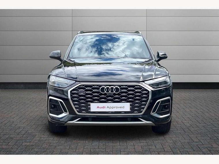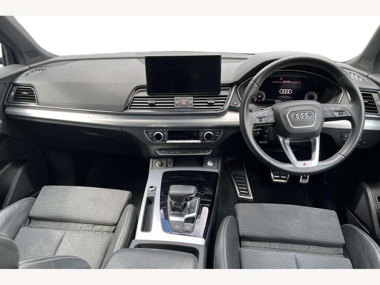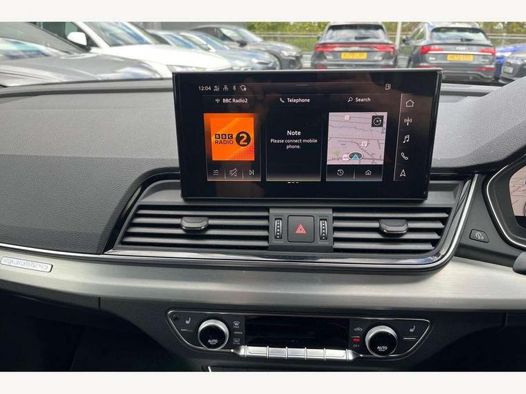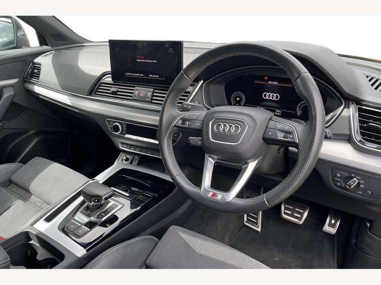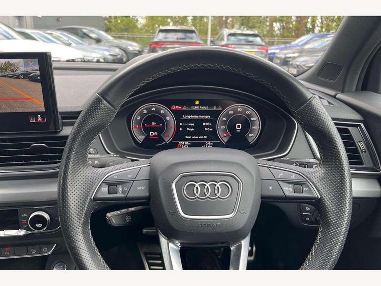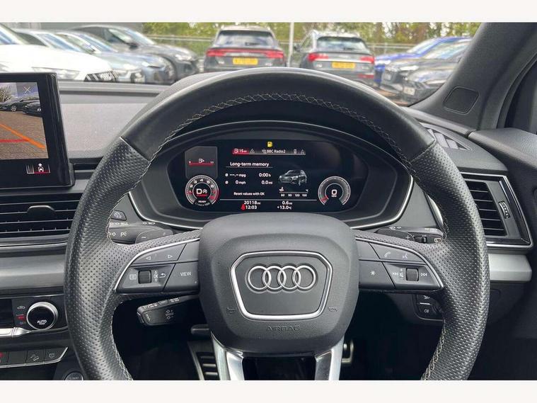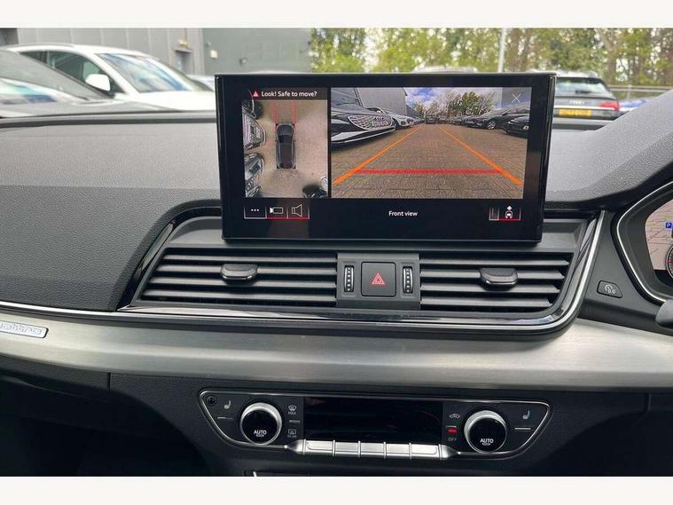 Acoustic front and rear parking sensor, Audi connect safety and service (e-call), Audi connect with Amazon Alexa Integration, Audi drive select, Audi virtual cockpit plus with 12.3" screen and three different layout designs, Audi wireless smartphone interface, Automatic start-stop system with coasting functionality and efficiency programme, Bluetooth interface, Electro - mechanical power assisted steering, MMI navigation plus with 10.1" touch screen, Power tailgate, Reversing camera, Service interval indicator, Voice control system with Audi hotword activation "Hey Audi", Quattro on demand, S line sports suspension, 2 x USB charging port with aux input socket, 8 loudspeakers, DAB Digital radio, Acoustic windscreen, Aluminium roof rails, Audi matrix LED headlights with dynamic front and rear indicators, Auto dimming door mirrors, Auto dimming frameless rear view mirror, Automatic headlight adjustment, Automatic headlights and windscreen wipers, Body colour door mirrors, Body colour rear diffuser with matt aluminium silver surrounds, Body colour underbody protection, Chrome plated exhaust trims, Daytime running lights, Door sills in Selenite silver, Electric adjustable/heated/folding door mirrors, Front air inlet surrounds in aluminium, Front and rear electric windows, Front radiator grille in honeycomb design, Headlight washers, High level LED brake light, Lower bumpers painted in contrast Manhattan grey, Rear chrome trim strip below lights, Rear privacy glass and rear side windows, Rear side wing doors, Rear wiper, Roof bars, S Line badges on the front wings, S Line front and rear bumpers, S Line rear spoiler, S Line side skirts, 3 rear headrests, 3 spoke leather multifunction steering wheel with S badging perforated leather grips, 40:20:40 split folding 3 rear bench seat in 2nd row with rear centre armrest, Black cloth headlining, Comfort front centre armrest, Contrast stitching on seats, steering wheel and gear lever gaiter, Deluxe 3 zone electronic climate control, Front head restraints, Front/rear floor mats, Gear lever in black leather, Heated front seats, Height/reach adjustable steering column, Illuminated door sill trims with S logo, Manual seat adjustment with 4-way electric lumbar support, Removable luggage compartment floor, Single front passenger seat, Stainless steel pedals, Sunvisors with vanity mirrors, Trunk roller cover, High gloss pack - Q5, LED interior light pack - Q5, 3 point seatbelts on all seats, 6 airbags - Driver, front passenger, curtain and side airbags, Electrically operated child locks on rear doors, Electromechanical parking brake, Electronic stabilisation control including ABS, ASR and EDL, First aid kit with warning triangle and vests, Front passenger airbag deactivation, Hill descent control, Hill hold assist, ISOFIX child seat mounting for front passenger seat and ISOFIX child seat mounting with Top Tether for outer rear seats, Multi collision brake assist, Pop-up bonnet for pedestrian protection, Pre sense city, Seat belt force limiter, Seatbelt monitoring, Tyre pressure warning, Anti theft alarm, Anti-theft wheel bolts, Keyless Go access/ignition system, Remote central locking, Air vents inserts and centre console in gloss black, Matt brushed aluminium inlays,