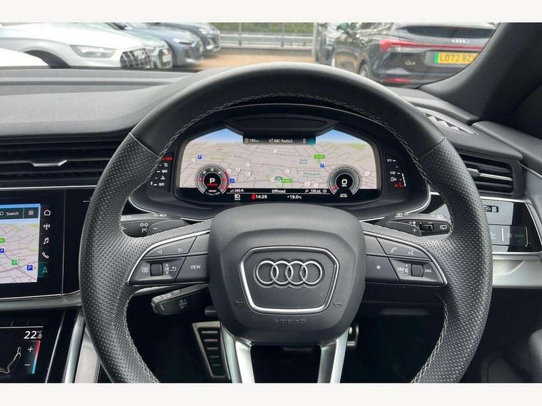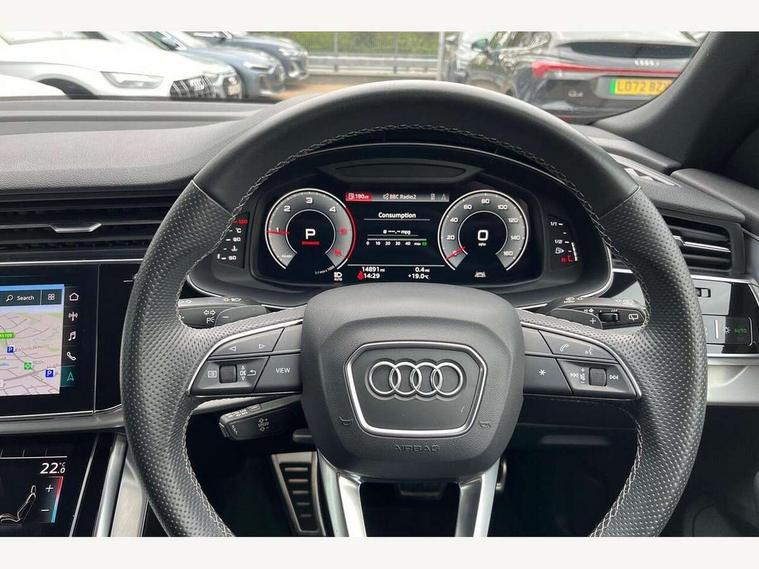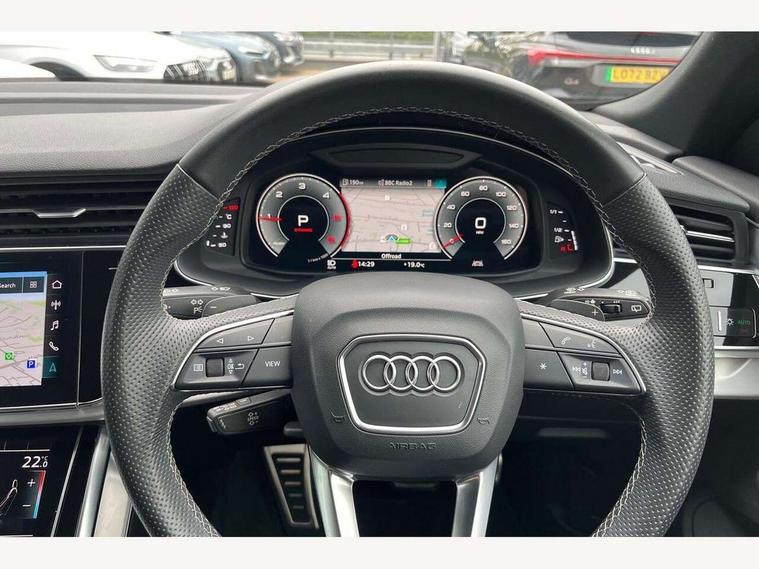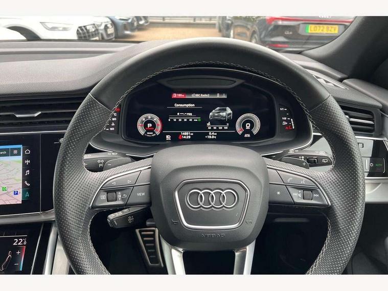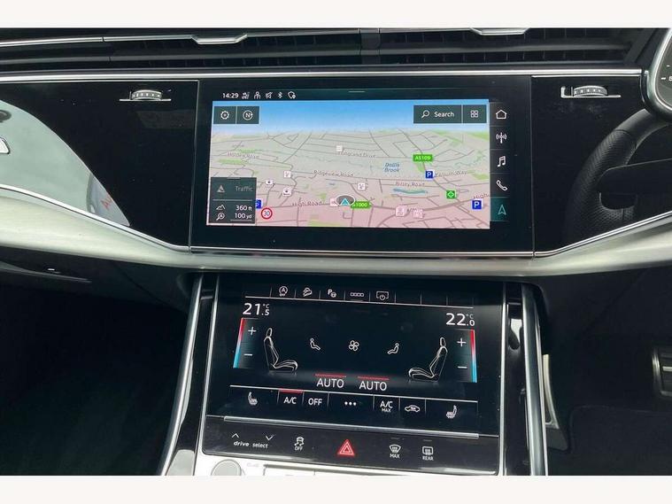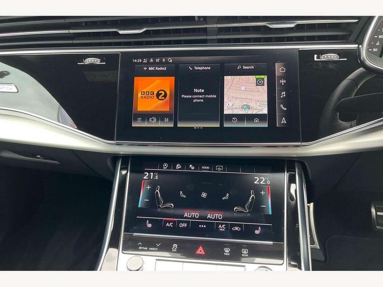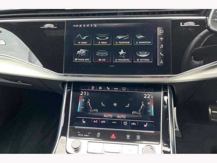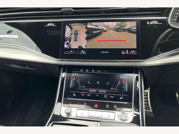10.1" and 8.6" Dual colour touchscreens, Audi active lane assist, Audi connect safety and service (e-call), Audi drive select, Audi parking system plus with front and rear sensors, Audi phone box with wireless charging, Audi smartphone interface with wireless Apple CarPlay, Audi virtual cockpit - 12.3" high resolution LCD display with fully customisable instrument cluster, Automatic start/stop system, Electro-mechanical PAS, Low washer fluid indicator, MMI - Multi Media Interface control system, MMI navigation plus with MMI touch, Natural voice recognition, On board computer, Operating buttons in black, glass look with haptic feedback, Power operated tailgate, Rear view camera, Service interval indicator, 48V Mild hybrid technology, Adaptive sport air suspension, Diesel particulate filter, Quattro all wheel drive with self locking centre differential, Audi music interface with 2 USB ports with charge and data functions, Audi sound system with 6 channel amplifier, 180 watt amplifying capacity and 10 loudspeakers including subwoofer, Aux-in socket, DAB Digital radio, Acoustic windscreen, Aluminium window trim, Audi HD Matrix LED headlights with dynamic front and rear indicators, Auto dimming frameless rear view mirror, Body colour door mirrors, Coming/leaving home lighting function, Electric front+rear windows, Electrically adjustable/heated/folding/auto dimming door mirrors with integrated LED indications + kerb view function for passenger side, Headlight washers, Heat insulating glass in windshield, Illuminated door sill trims with S line logo, LED signature daytime running lights, Platinum grey front spoiler lip and diffuser insert with honeycomb grille in black, Privacy glass - dark tinted rear and rear side windows from B-pillar backwards, Rain and light sensors, Rear wiper, S line badges on front wings, S Line body styling, S line bumpers in full body colour paint finish, S line roof spoiler, S Line side skirts, S line side ventilation grille, 2 zone automatic climate control, 4-way lumbar support for front seats, 40:20:40 split folding rear bench seat, Comfort front centre armrest, Driver seat memory function, Electrically adjustable front seats, Front head restraints, Front/rear floor mats, Heated front seats, ISOFIX child seat mounting for front passenger seat and 2 outer rear seats with top tether child seat mounting for all 3 rear seats, LED interior ambient lighting, Luggage compartment sill protection in stainless steel, Rear centre armrest with 2 cupholders, Rear headrests, Rear seat bench plus, Stainless steel pedals, Sunvisors with illuminated vanity mirrors, 3 point seatbelts on all seats, Audi pre sense front, Driver and front passenger, front side and curtain airbags, Electromechanical parking brake, Electronic Stability Control (ESC) including ABS, ASR and EDL, Front passenger airbag deactivation, Hill descent control, Hill hold assist, Predictive pedestrian protection, Seatbelt monitoring, Traction control, Tyre pressure loss indicator, Warning triangle and first aid kit, Anti theft alarm with tow away protection, Anti-theft wheel bolts and wheel loosening detection, Immobiliser, Keyless go with remote central locking, Tool kit, Tyre repair kit,