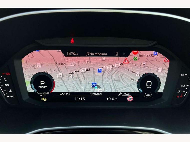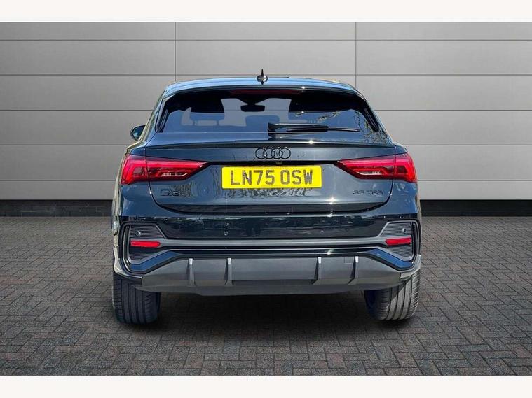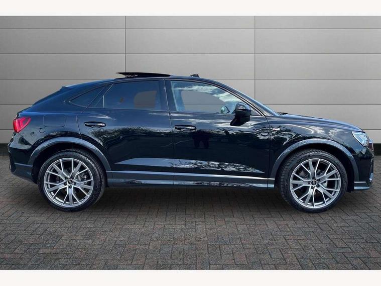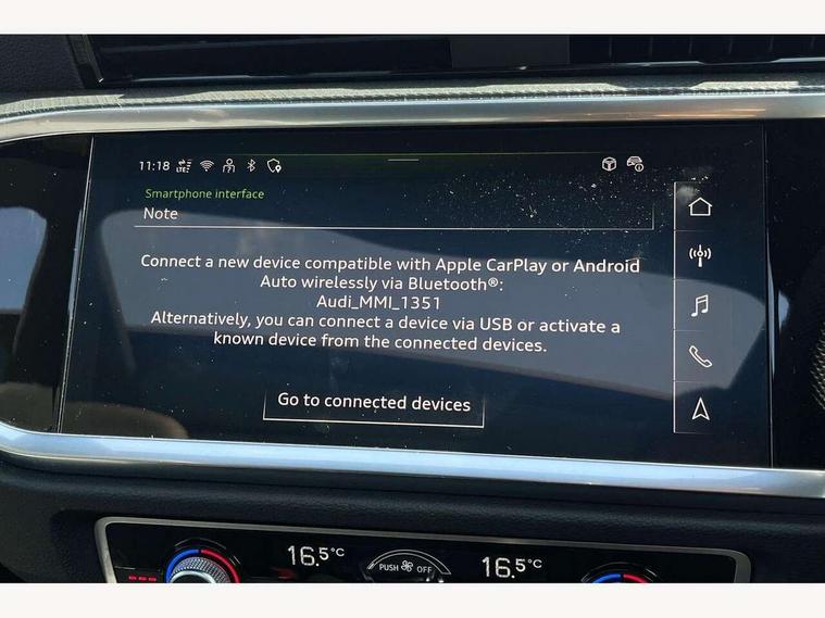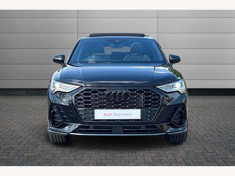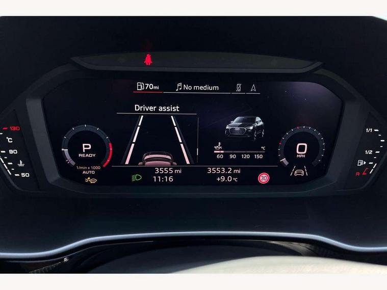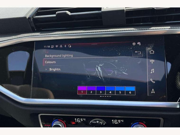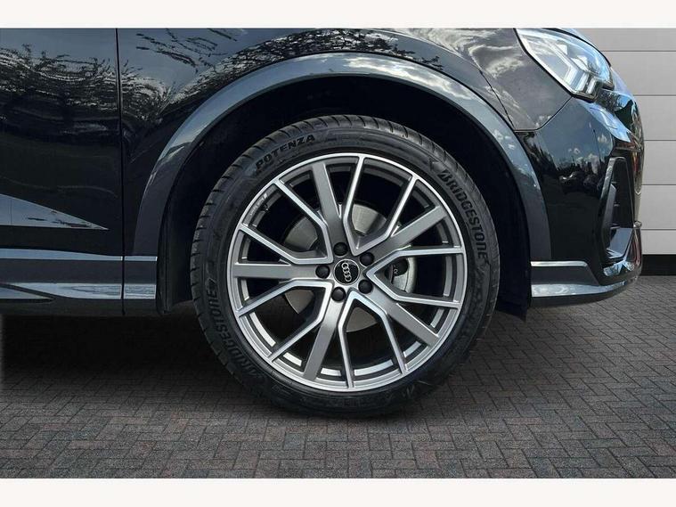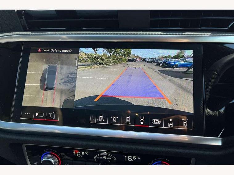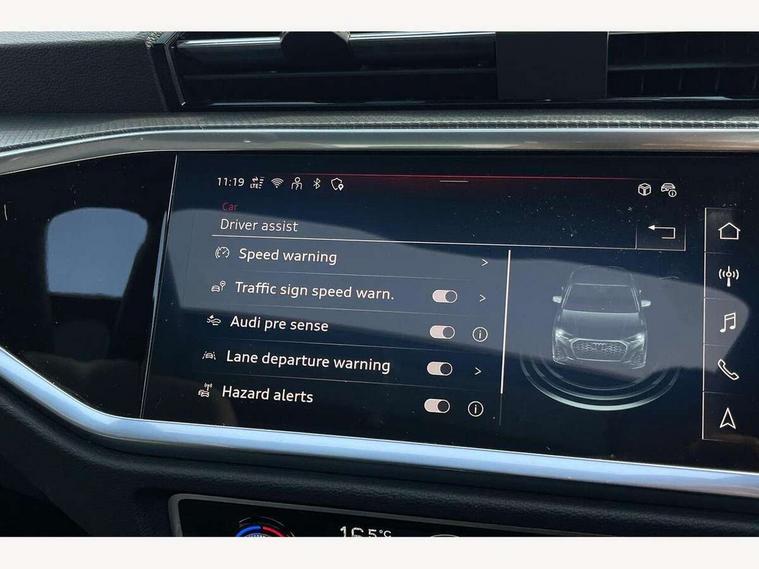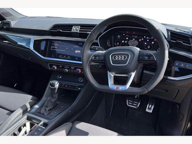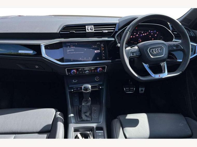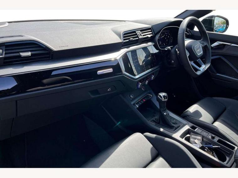 Audi connect safety and service, Audi drive select, Audi lane departure warning, Audi Virtual Cockpit - 10.25" display, Bluetooth interface, Camera based traffic sign recognition, Distraction and Fatigue warning, Legal emergency call, MMI Navigation Plus with high resolution 10.1 inch touchscreen colour display, Power operated tailgate, Progressive steering, Service interval indicator, Smartphone interface includes wireless Apple carplay/Android Auto, Start stop system with recuperation, Voice control system with natural language interaction, Sports suspension, 2 USB-C ports with charge and data functions, 6 passive loudspeakers, DAB digital radio module, Acoustic windscreen, Audi Beam uses LEDs to project the Audi logo onto the ground as you exit your Q3, Auto dimming door mirrors, Auto dimming frameless rear view mirror, Electrically folding, adjustable and heated door mirrors with integrated LED side indicators and kerb view function for passenger side, Front and rear electric windows, Front fog lights, Front underbody protection in manhattan grey paint finish, High gloss black finish B and C pillars, Honeycomb design radiator grille in matt anthracite black, LED Dynamic rear indicators, LED headlights with LED daytime running lights, LED rear lights, LED third brake light, Privacy glass dark tinted rear and rear-side windows (from B-pillar backwards), Rain and light sensors, Rear diffuser grille in grained matt black, Rear diffuser strip in matt anthracite black, Rear side wing doors, Rear underbody protection in matt black, Rear wiper, S line front and rear bumpers and side skirts in contrasting Manhattan grey paint finish, Variable front intermittent wipers, 12V socket in rear centre console, 3 seat bench in 2nd row, 40:20:40 folding with manual adjustment for 60:40 forwards/backwards position and backrest angle, Adjustable rear seat bench/backrest with centre armrest and cupholder, Black carpet mats, Black cloth headlining, Dual zone electronic climate control, Electric lumbar support, Front and rear black floor mats with contrast stitching in rock grey, Front and rear headrests, Front centre armrest, Height and reach adjustable steering wheel, Illuminated door sill trims with S logo, ISOFIX child seat mounting for front passenger with airbag deactivation and outer rear seat including top tether attachment point for outer rear seats, Luggage compartment sill protection in stainless steel, Manual front seats with height adjustment, Perforated leather gearknob, Single front passenger seat, Stainless steel pedals, Twin leather upholstery with front sport seats + S embossing, Black styling pack - Q3, Non smoking pack - Q3, 3x3 point rear seatbelts, 6 airbags - Driver, front passenger, curtain and side windows, Audi pre-sense front with pedestrain and cyclist recognition, Electrically operated child locks on rear doors, Electromechanical parking brake, Electronic stabilisation control including ABS, ASR and EDL, Front seatbelt reminder, Hill descent control, Hill hold assist, Pre sense basic, Seatbelt monitoring, Tyre pressure warning, Warning triangle and first aid kit, Anti theft wheel bolts, Immobiliser, Remote central locking, Thatcham approved category 1 anti theft alarm, Aluminium look interior elements, Detail dashboard around MMI touch colour display in glass look, black with surround in aluminium look, Leatherette door armrest, Piano black inlay,