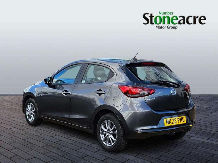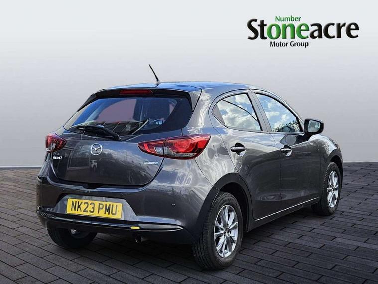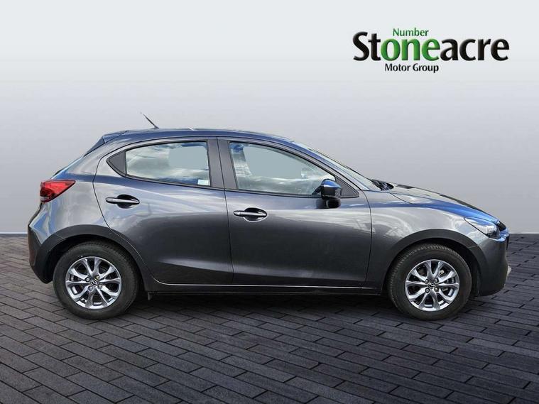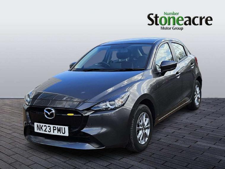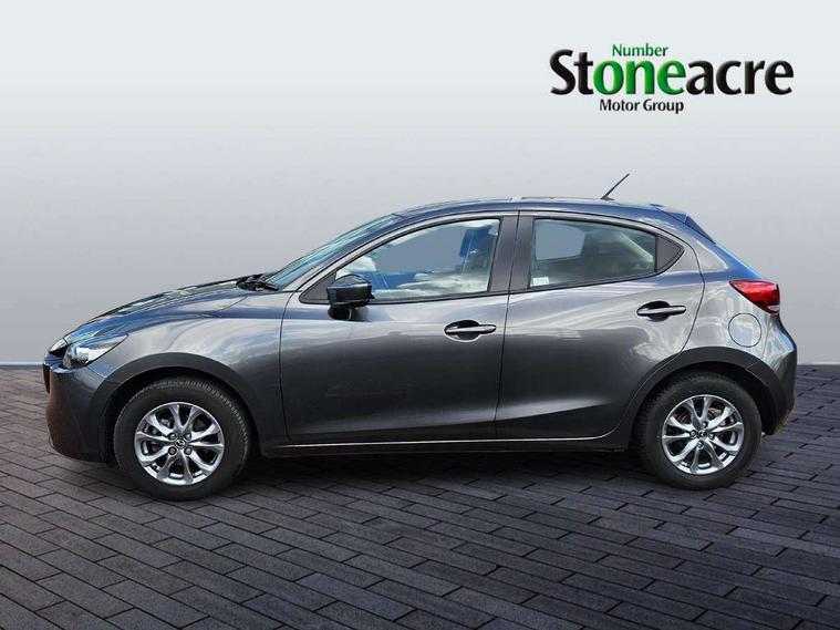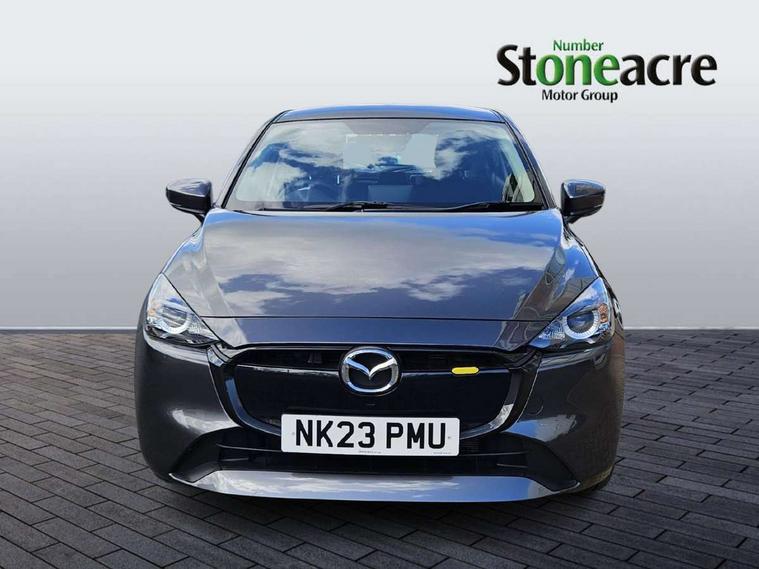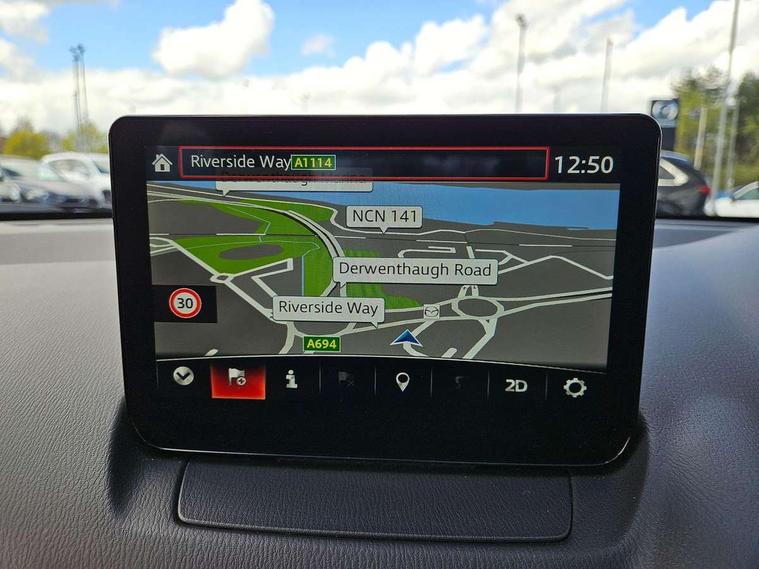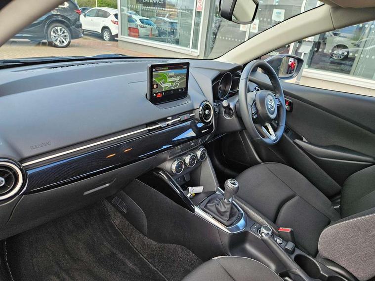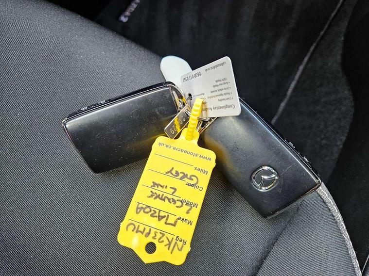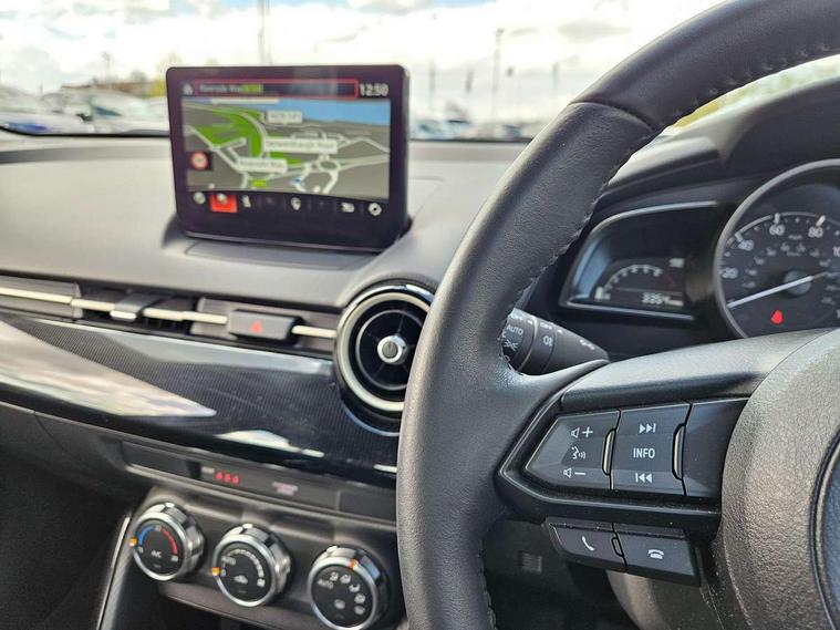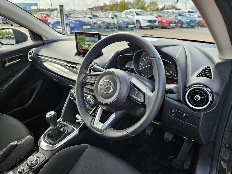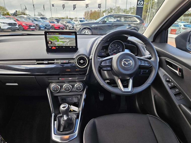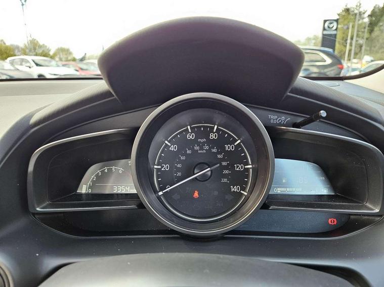 Adjustable speed limiter, Analogue speed display meter, Cruise control, Digital instrument cluster, Digital rev counter, E-call, Emergency stop signalling system, Engine start/stop button, Integrated bluetooth, Mazda connect with 8" colour touch screen, Navigation system, PAS, Rear parking sensor with audible and visual warning, Service indicator, Tailgate, Trip computer, Wireless Apple CarPlay and wired Android Auto, i-stop, AM/FM/DAB radio with 6 speakers with USB and AUX inputs, Multimedia Commander including separate volume dial, Steering wheel mounted audio/bluetooth controls, Auto dimming rear view mirror, Auto headlight levelling, Body colour door mirrors, Body coloured front bumper with black lower bezel, Body coloured rear bumper with black lower mouldings and yellow accent, Coming/leaving home lighting function, Dusk sensing headlights, Electric adjustable/heated/folding door mirrors, Electric front/rear windows with one touch auto up/down for driver's window, Gloss black finish signature wing, Halogen daytime running lights, Heated rear window, LED Headlights, LED indicator lights, LED third brake light, Rain sensing front wipers with adjustable sensitivity and speed, Rear side wing doors, Rear wiper, 3 seat bench in 2nd row, 60/40 split rear seats, Black/white air vent accents, Climate control air conditioning, Driver, Front passenger and two rear grab handles with coathooks, Drivers seat manual slide recline and height adjustment, Drivers/front passengers covered vanity mirrors and drivers ticket holder, Front centre storage with two cupholders, Front head restraints, Front passenger and driver door pockets, Front passenger seat manual slide, recline and height adjust, Front passenger seatback pockets, Gear shift indicator, Glovebox, Interior courtesy light with integrated spotlight, ISOFIX child seat anchorage points attached on outer rear seats, Leather handbrake, Leather steering wheel and gear knob, Luggage compartment light, Premium cloth upholstery, Single front passenger seat, Three height adjustable rear head restraints, Tilt/telescopic adjustable steering wheel, 2x3 point front seatbelts with pre-tensioners, 3 point seatbelts on all rear seats, Anti-lock braking system (ABS), Collision mitigation braking system, Dynamic stability control + Traction control, ESP, Front and rear curtain airbags, Front driver, passenger and rear seat seatbelt warning, Front dual stage driver and single stage front passenger airbags, Front side airbags, G-Vectoring control plus, Hill launch assist, Manual child lock in rear doors, Passenger airbag cut-off switch, Tyre pressure monitoring system, Deadlocking system, Power door locks, Remote central locking, Thatcham accredited alarm and immobiliser, 15" Silver alloy wheels, Emergency tyre repair kit,