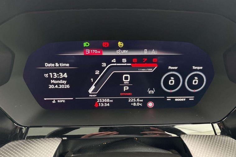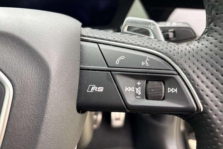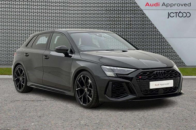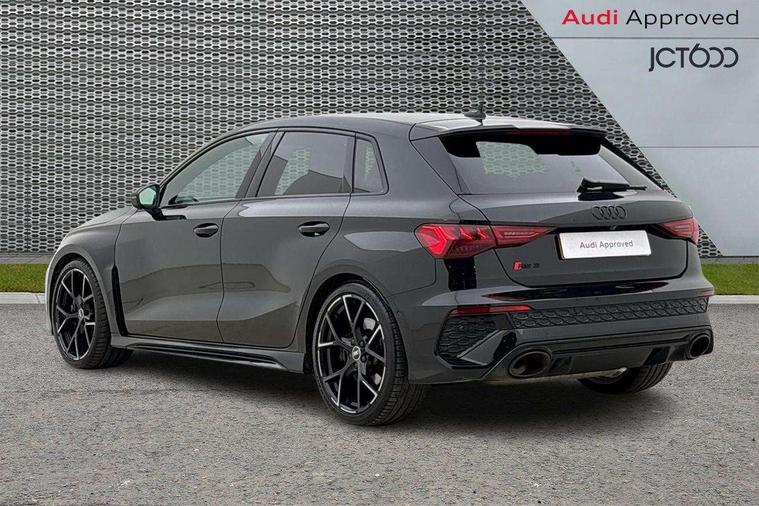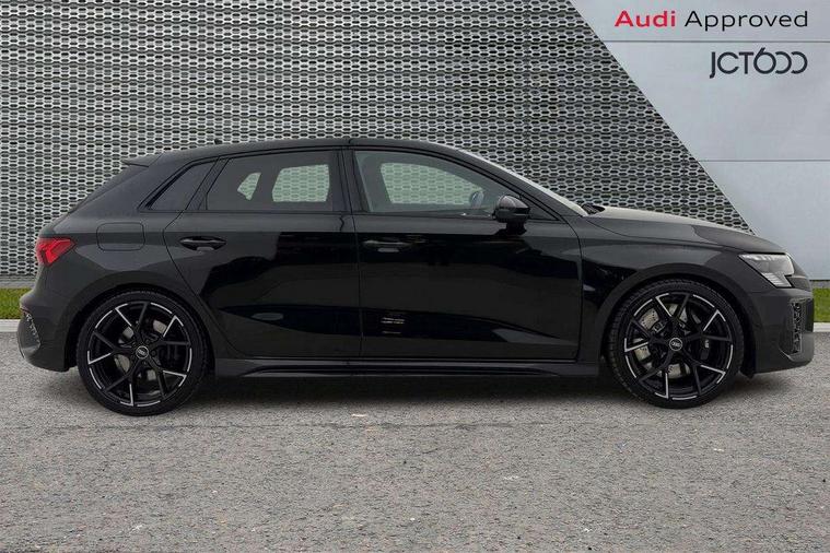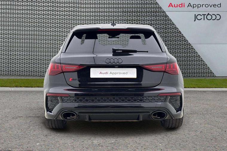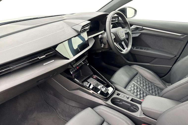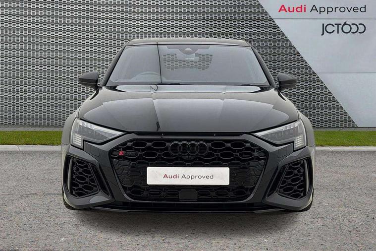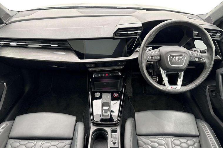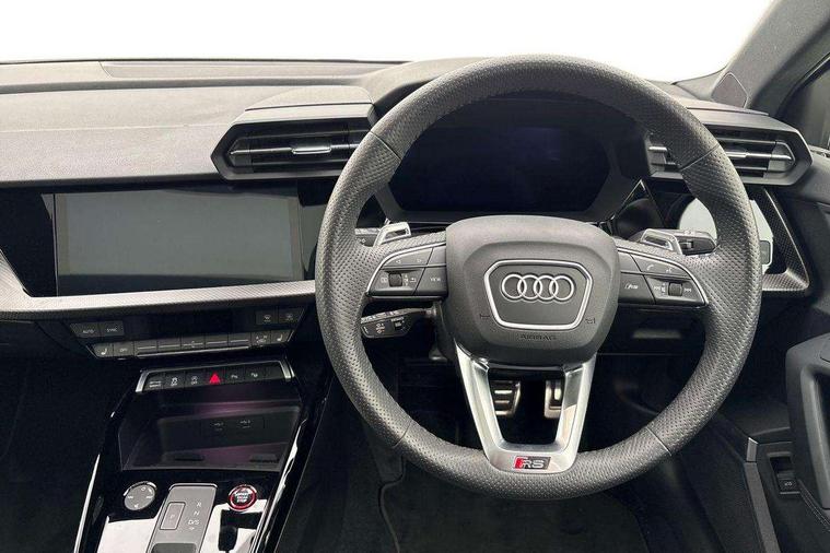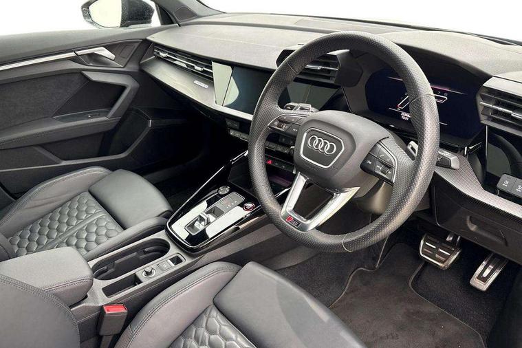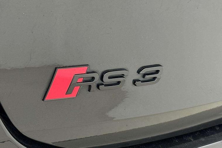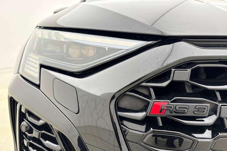 Adaptive cruise assist, Adaptive cruise control, Audi smartphone interface, Audi virtual cockpit with RS specific display 12.3" full colour digital instrument cluster, Automatic start/stop system with recuperation, Bluetooth interface, Camera based traffic sign recognition, Collision avoidance assistant, Emergency e-call, Head up Display, Lane departure warning system, Legal emergency call, Parking assist with parking system plus, Power operated tailgate - Luggage compartment lid opens electrically, Progressive power assisted steering, Reversing camera, Quattro permanent four wheel drive, Rear suspension, DAB Digital radio, 3rd brake light, Acoustic glass windscreen, Audi beam uses LEDs to project the Audi sport logo onto the ground as you exit your RS 3, Audi matrix LED headlights, LED rear lights, dynamic front and rear indicators and headlight cleaning system, Auto dimming rear view mirror, Black side skirts, Body colour roof, Carbon exterior door mirror, Carbon fibre engine cover, Daytime running lights, Electric adj heated/folding + auto dimming exterior mirrors with memory + LED indicator + auto kerb side function for passenger side exterior mirror, Front spoiler in high gloss black, Heat insulating glass windscreen, Light and rain sensors, Panoramic glass sunroof, Privacy glass - dark tinted rear and rear side windows from B-pillar backwards, Rear side wing doors, Rear window wiper and washer system, RS exterior features in gloss black, RS sports exhaust system, 3 seat bench in 2nd row, 3 spoke leather multifunction steering wheel with gear shift paddles, 4 way lumbar support for front seats, 40/20/40 split folding rear seat bench, Black cloth headlining, Dual zone electronic climate control, Electrically adjustable front seats with memory function for driver's side, Front and rear headrests, Front centre armrest, Front sports seats RS embossed logo, Front/rear floor mats, Heated front seats, Honeycomb stitching and RS embossing, Illuminated door sill trims inlays in aluminium with RS 3 logo, Illuminated vanity mirror, RS emblems, Single front passenger seat, Stainless steel pedals and front footrest in black, Aluminium interior elements pack - RS3, Ambient lighting pack - RS3, Comfort and sound pack - RS3, Driver assistance pack with 3 spoke leather multi function steering wheel - RS3, MMI navigation plus with MMI touch - RS3, RS bodystyling - RS3, Storage Pack - RS3, 3x3 point rear seat belts, ABS/EBD, ASR, Audi pre sense front, Driver/Front Passenger airbags, EDL, ESC - Electronic Stability Control + traction control, Front passenger airbag deactivation, Front side airbags with head airbags and interaction airbag, Hill hold assist, Seat belt reminder with passenger presence detection in rear, Tyre pressure loss indicator, Warning triangle and first aid kit, Anti theft alarm, Anti-theft wheel bolts, Electronically operated child lock, Remote control central locking, Full decorative carbon trim, 19" 5 Y spoke black with graphic print alloy wheels, Tool kit, Tyre repair kit,