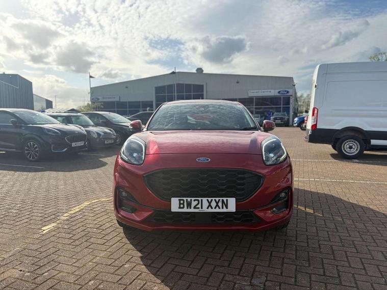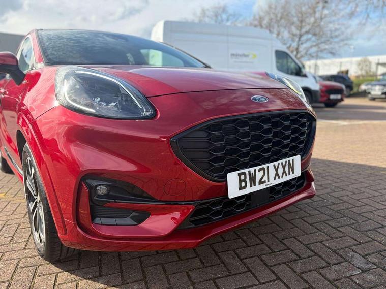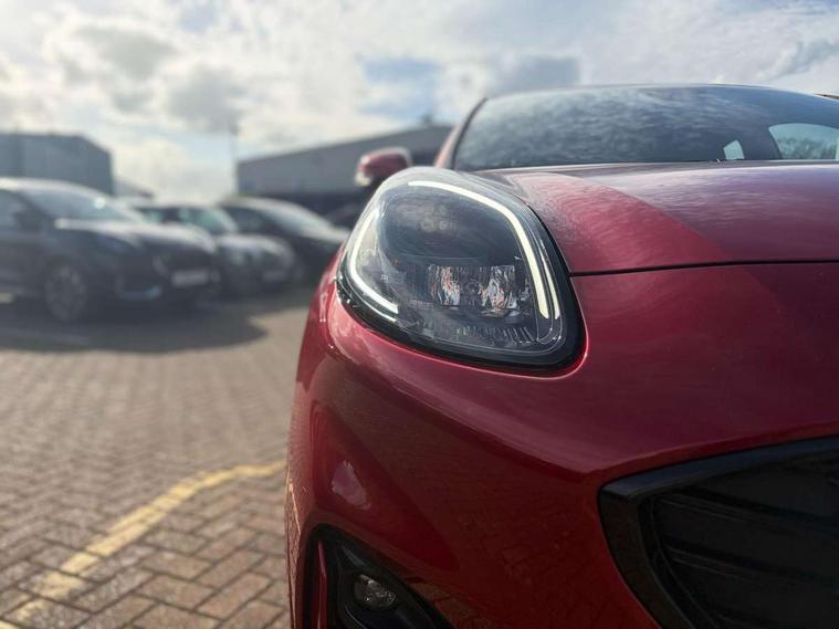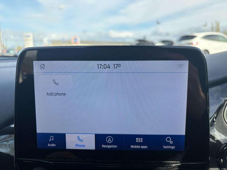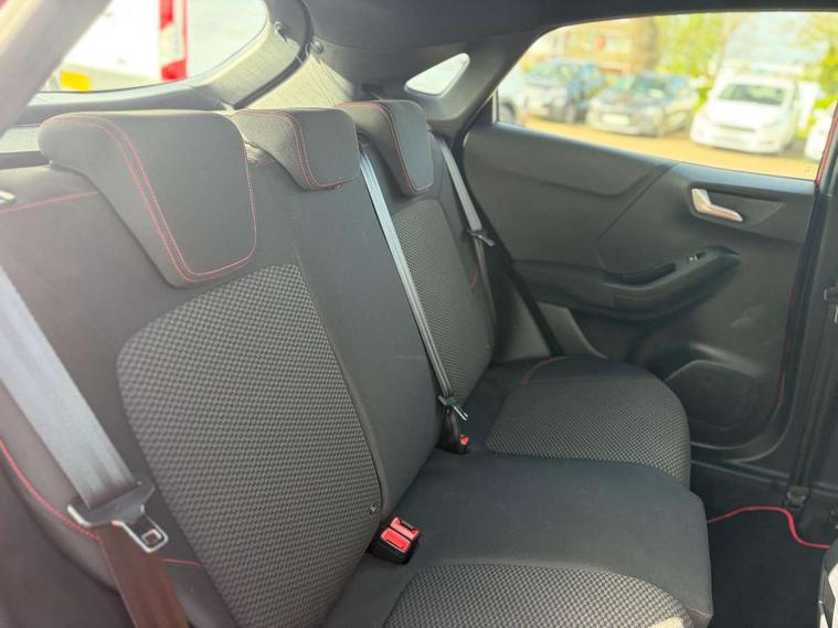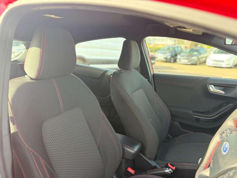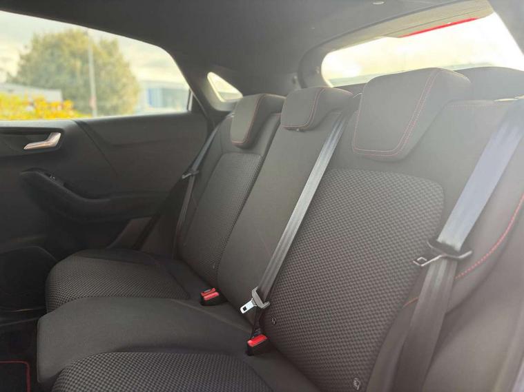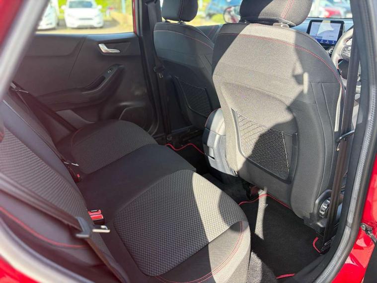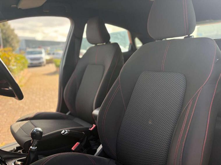 Ford easy fuel, Full digital 12.3" instrument cluster, Lane keeping aid with lane departure warning, Power assist steering, Power start button, Rear parking sensor, Selectable drive modes(Normal, sport, Eco, trail, slippery), Automatic headlights with rain sensing wipers and auto high beam, Body coloured door mirrors, Front fog lights with cornering lights and LED rear lamps, Power foldable heated door mirrors with puddle lamps, Projector headlamps with LED day time running lights, Quickclear heated windscreen, Rear wiper, ST-Line body kit with large rear spoiler wth sports suspension, Centre console with armrest and stowage, Cloth upholstery, Driver seat height/lumbar adjust, Ford megabox extended bootspace, Front and rear floor mats, Front and rear head restraints, Manual air conditioning, ST-Line flat bottomed sensico leather steering wheel with leather handbrake and aluminium gear knob, Ford SYNC 3 navigation pack - Puma, 3 rear seatbelts, Electronic stability control (ESC) and hill start assist, Pre-collision assist with autonomous emergency braking, pedestrian/cyclist detection & post-collision braking, Tyre pressure monitoring system (TPMS), Thatcham alarm,