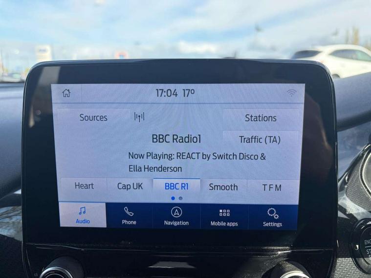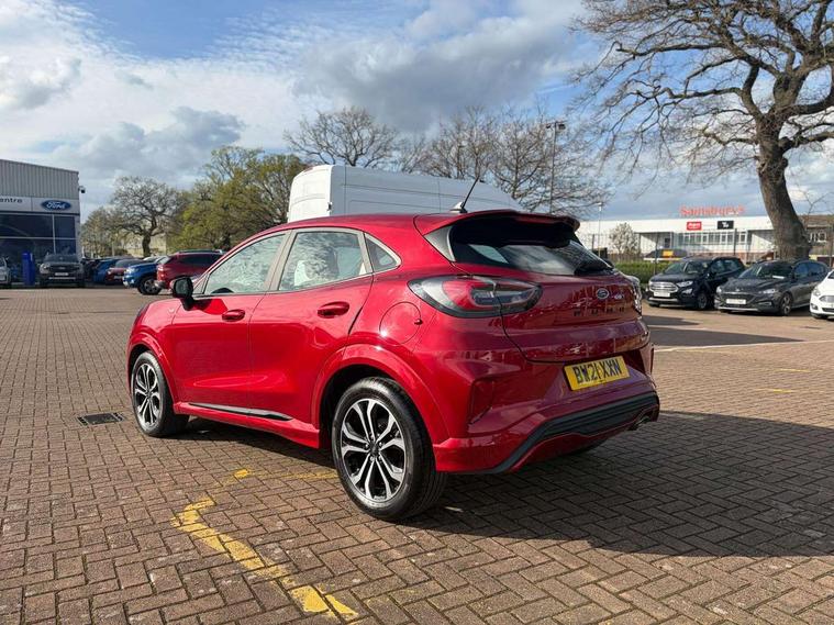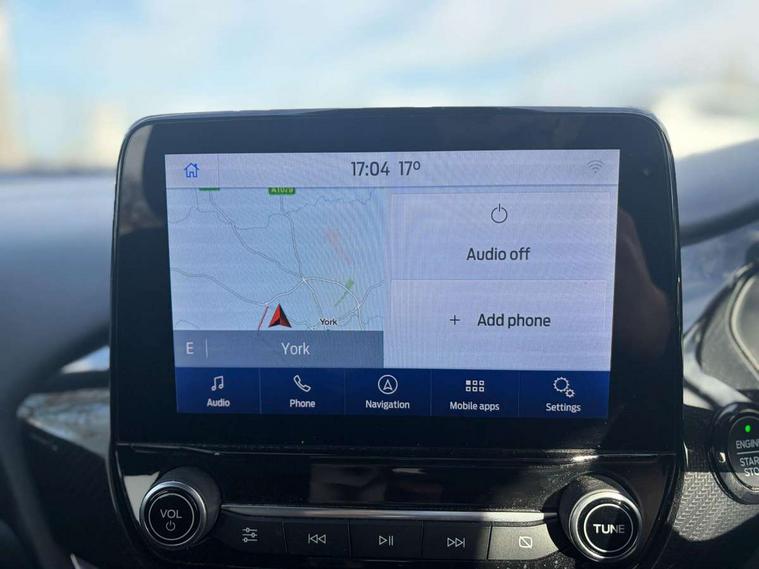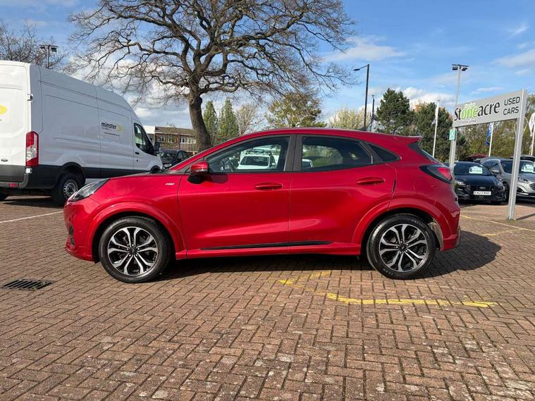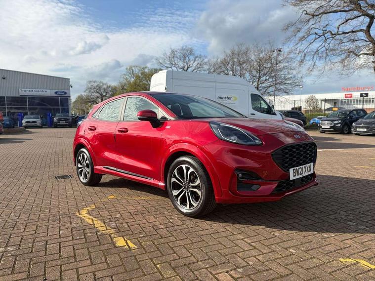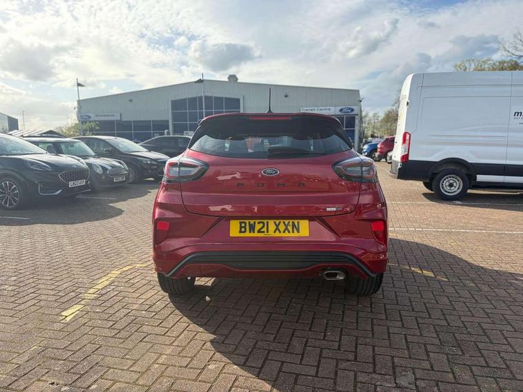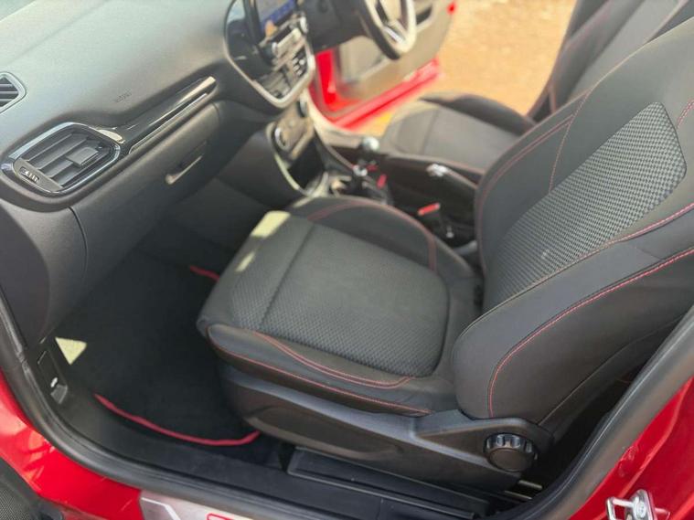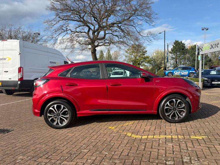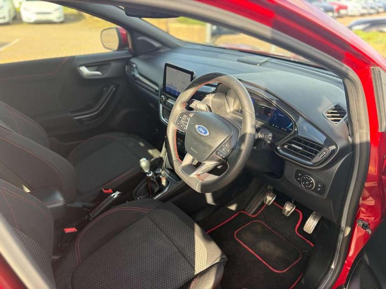 Ford easy fuel, Full digital 12.3" instrument cluster, Lane keeping aid with lane departure warning, Power assist steering, Power start button, Rear parking sensor, Selectable drive modes(Normal, sport, Eco, trail, slippery), Automatic headlights with rain sensing wipers and auto high beam, Body coloured door mirrors, Front fog lights with cornering lights and LED rear lamps, Power foldable heated door mirrors with puddle lamps, Projector headlamps with LED day time running lights, Quickclear heated windscreen, Rear wiper, ST-Line body kit with large rear spoiler wth sports suspension, Centre console with armrest and stowage, Cloth upholstery, Driver seat height/lumbar adjust, Ford megabox extended bootspace, Front and rear floor mats, Front and rear head restraints, Manual air conditioning, ST-Line flat bottomed sensico leather steering wheel with leather handbrake and aluminium gear knob, Ford SYNC 3 navigation pack - Puma, 3 rear seatbelts, Electronic stability control (ESC) and hill start assist, Pre-collision assist with autonomous emergency braking, pedestrian/cyclist detection & post-collision braking, Tyre pressure monitoring system (TPMS), Thatcham alarm,