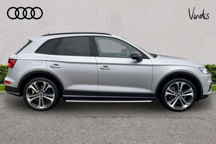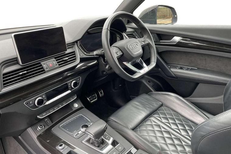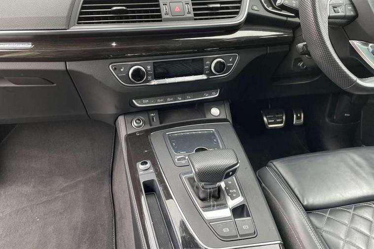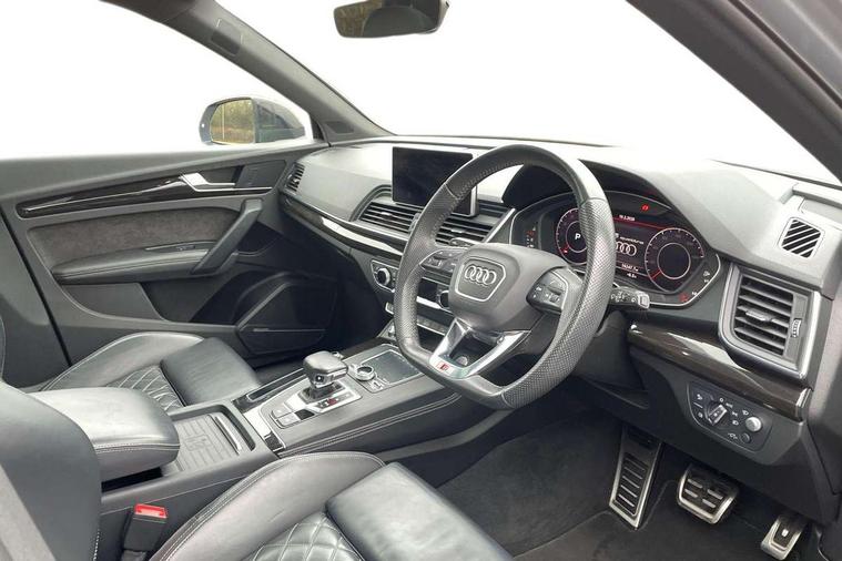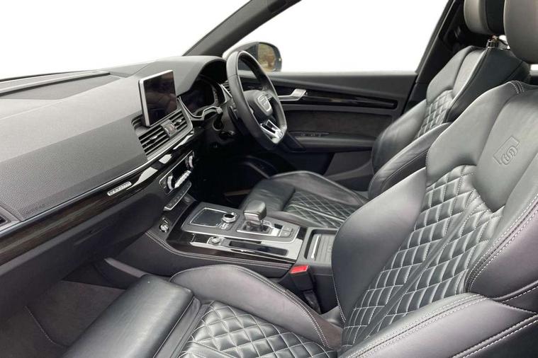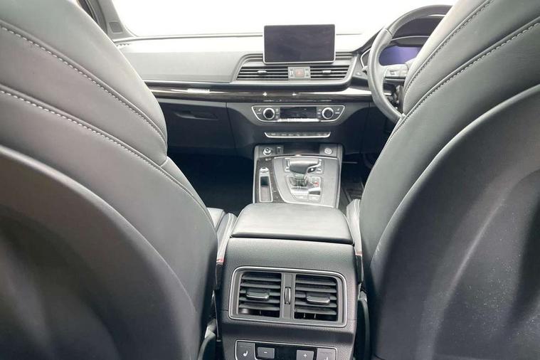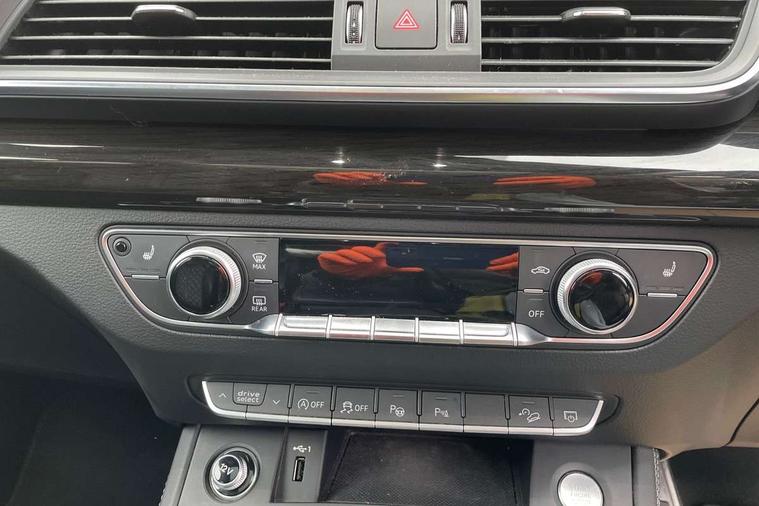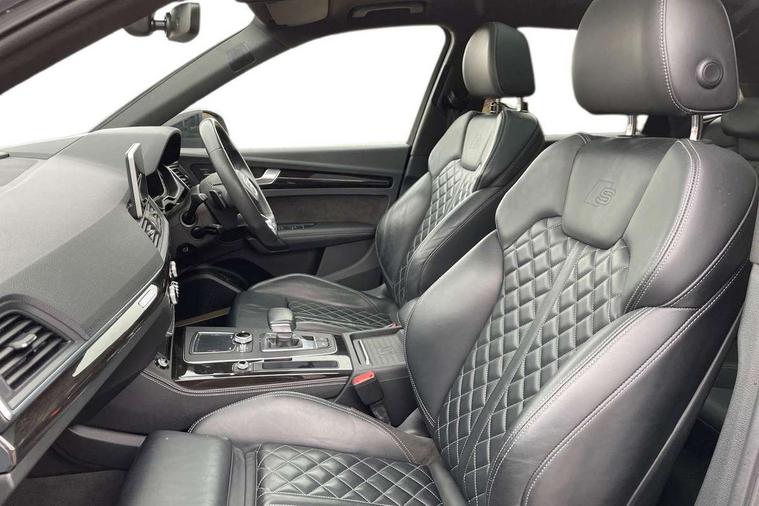 360 degree view camera, Adaptive cruise control with Stop and Go and traffic jam assist, Audi active lane assist, Audi connect infotainment services, Audi connect safety and service (e-call), Audi drive select, Audi phone box with wireless charging, Audi pre-sense front with collision avoidance assist and turn assist, Audi side assist, Audi smartphone interface, Audi virtual cockpit - 12.3" high resolution LCD digital instrument cluster display, Automatic start-stop system with coasting functionality and efficiency programme, Camera based traffic sign recognition, Electro - mechanical power assisted steering, Head up Display, MMI navigation plus with 8.3" colour MMI screen and MMI touch, Mobile telephone preparation - bluetooth interface, Park assist system, Power tailgate, Predictive efficiency assistant, Rear cross traffic assist, Service interval indicator, Voice control system, Adaptive comfort suspension with damping control, Quattro on demand, 2 x USB charging port with aux input socket, 2x SD card slot, CD player, DAB Digital radio, MMI radio plus with 7" colour MMI screen and MMI controller, Acoustic windscreen, Air inlets in matt titanium black with blades in matt aluminium silver, Audi Beam uses LEDs to project the Audi Sport logo, Audi matrix LED headlights with LED rear lights + dynamic front and rear indicators, Auto dimming rear view mirror, Automatic headlight levelling, Black roof rails, Body colour rear diffuser with matt aluminium silver surrounds, Body colour underbody protection, Chrome exhaust tailpipe, Contrast bumpers in Manhattan grey, Electric panoramic glass sunroof, Electrically folding/heated/auto dimming door mirrors with memory function, Front and rear bottom section bumpers in Manhattan grey, Front and rear electric windows, High beam assistant, Light and rain sensor for auto activation of lights and windscreen wipers, Loading sill protector in stainless steel, Privacy glass with front acoustic glazing, Rear wiper, Running boards, Titanium black door mirror housings, 3 rear headrests, 3 spoke flat bottom high multi-function leather steering wheel, 3 zone climate control, 40/20/40 split folding rear seats with rear centre armrest, Black cloth headlining, Contrast stitching on seats, steering wheel and gear lever gaiter, Electric steering wheel adjustment, Electrically adjustable front seats with driver memory, Fine Nappa leather upholstery, Front centre armrest, Front sports seats in fine nappa leather, Front/rear floor mats, Heated front and outer rear seats, Height adjustable front head restraints, ISOFIX child seat mounting and top tether, Luggage compartment carpet, Massage function for front seats, Perforated leather gearknob, Rear seat bench plus, Removable luggage compartment floor, Stainless steel pedals, Sunvisors with vanity mirrors, Trunk roller cover, Comfort and sound pack with reversing camera - Q5, Extended interior upholstery pack - Q5, Extended LED Interior Lighting Pack - Q5, Non Smokers pack, Parking Assistance Pack - Q5, Titanium black styling pack - Q5, Tour pack - Q5, 3 point seatbelts on all seats, 6 airbags - Driver, front passenger, curtain and side airbags, Audi pre sense basic and rear, Electromechanical parking brake, Electronic stabilisation control including ABS, ASR and EDL, Exit warning, Front passenger airbag deactivation, Hill descent control, Hill hold assist, Multi collision brake assist, Pop-up bonnet for pedestrian protection, Pre sense city, Seat belt force limiter, Seatbelt monitoring, Tyre pressure warning, Warning triangle and first aid kit, Anti theft alarm, Anti-theft wheel bolts, Keyless Go access/ignition system, Remote central locking, 21" 5 twin-spoke module design Audi sport alloy wheels with matt grey inlays, Tool kit, Tyre repair kit,