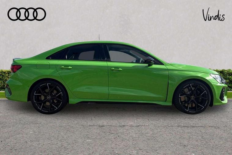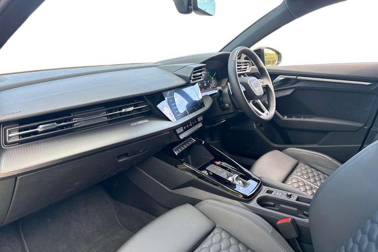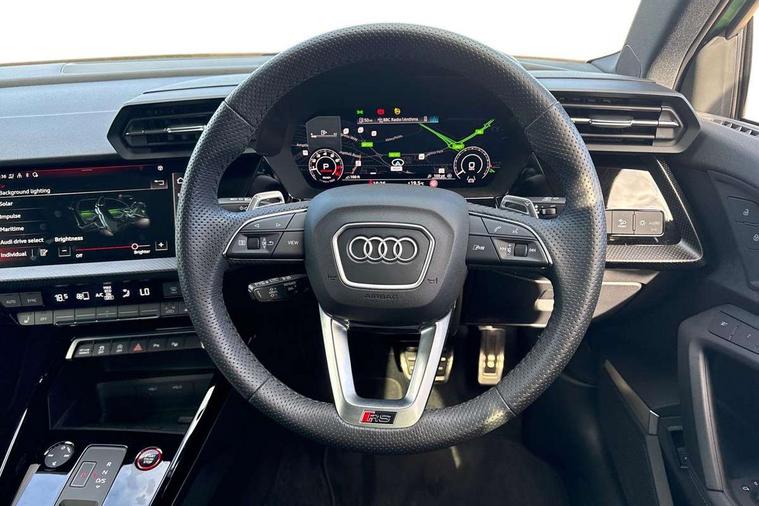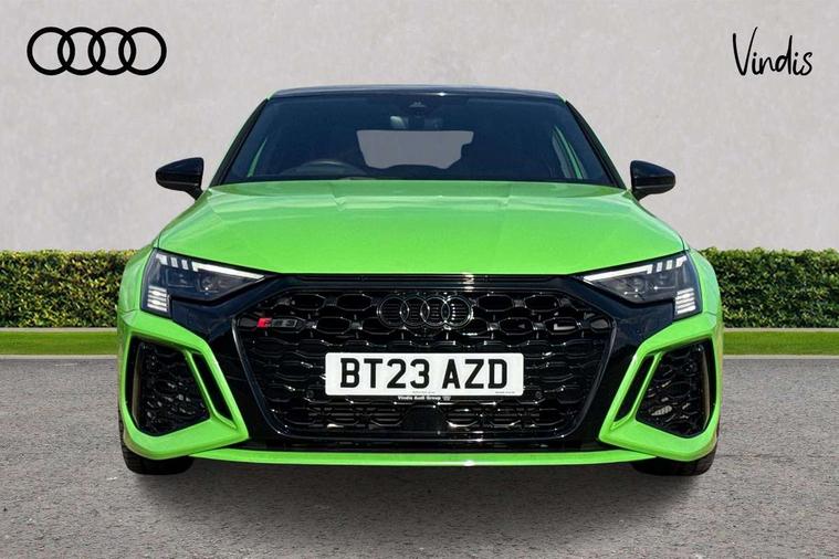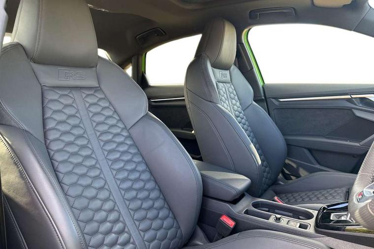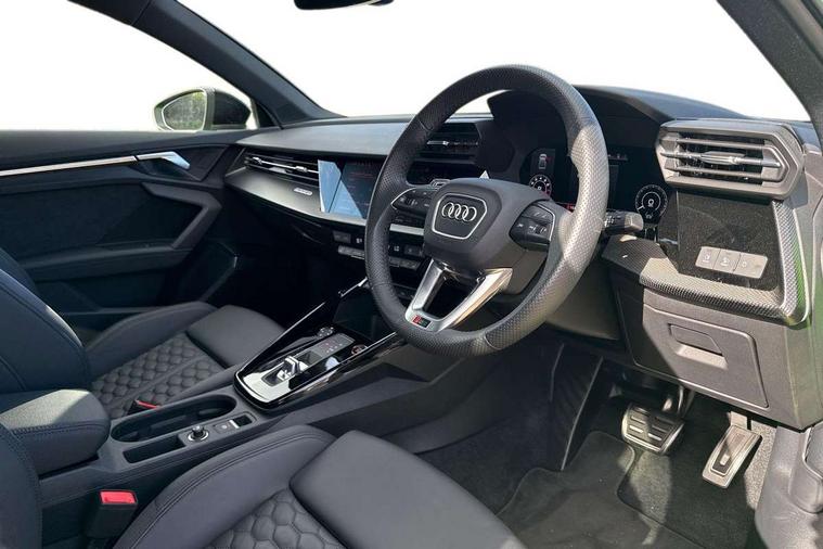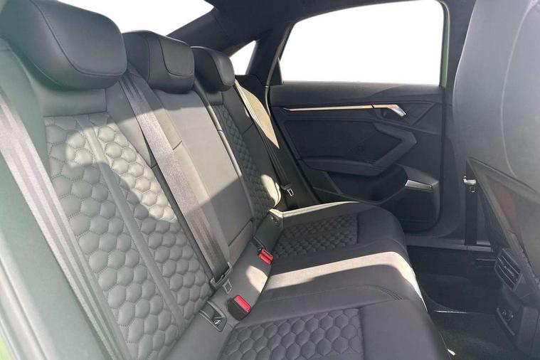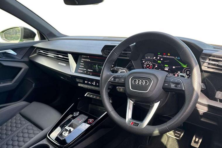 Audi smartphone interface, Audi virtual cockpit with RS specific display 12.3" full colour digital instrument cluster, Automatic start/stop system with recuperation, Bluetooth interface, Collision avoidance assistant, Emergency e-call, Head up Display, Lane departure warning system, Legal emergency call, Parking assist with parking system plus, Power operated tailgate - Luggage compartment lid opens electrically, Progressive power assisted steering, Reversing camera, Quattro permanent four wheel drive, Rear suspension, DAB Digital radio, 3rd brake light, Acoustic glass windscreen, Audi beam uses LEDs to project the Audi sport logo onto the ground as you exit your RS 3, Audi matrix LED headlights, LED rear lights, dynamic front and rear indicators and headlight cleaning system, Auto dimming rear view mirror, Black side skirts, Body colour roof, Carbon fibre engine cover, Electric adj heated/folding + auto dimming exterior mirrors with memory + LED indicator + auto kerb side function for passenger side exterior mirror, Front spoiler in high gloss black, Heat insulating glass windscreen, LED daytime running lights, Light and rain sensors, Panoramic glass sunroof, Privacy glass - dark tinted rear and rear side windows from B-pillar backwards, Rear boot, Rear side wing doors, RS exterior features in gloss black, RS sports exhaust system, 3 seat bench in 2nd row, 3 spoke leather multifunction steering wheel with gear shift paddles, 4 way lumbar support for front seats, 40/20/40 split folding rear seat bench, Black cloth headlining, Dual zone electronic climate control, Electrically adjustable front seats with memory function for driver's side, Front and rear headrests, Front centre armrest, Front sports seats RS embossed logo, Front/rear floor mats, Heated front seats, Honeycomb stitching and RS embossing, Illuminated door sill trims inlays in aluminium with RS 3 logo, RS emblems, Single front passenger seat, Stainless steel pedals and front footrest in black, Aluminium interior elements pack - RS3, Ambient lighting pack - RS3, Comfort and sound pack - RS3, Driver assistance pack with 3 spoke leather multi function steering wheel - RS3, MMI navigation plus with MMI touch - RS3, RS bodystyling - RS3, Storage Pack - RS3, 3x3 point rear seat belts, ABS/EBD, ASR, Audi pre sense front, Driver/Front Passenger airbags, EDL, ESC - Electronic Stability Control + traction control, Front passenger airbag deactivation, Front side airbags with head airbags and interaction airbag, Hill hold assist, Seat belt reminder with passenger presence detection in rear, Tyre pressure loss indicator, Warning triangle and first aid kit, Anti theft alarm, Anti-theft wheel bolts, Electronically operated child lock, Remote control central locking, Full decorative carbon trim, 19" 5 Y spoke black with graphic print alloy wheels, Tool kit, Tyre repair kit,