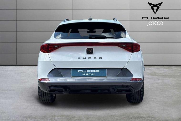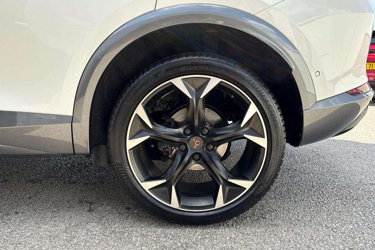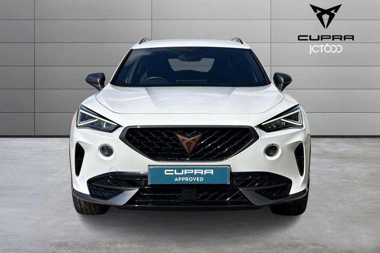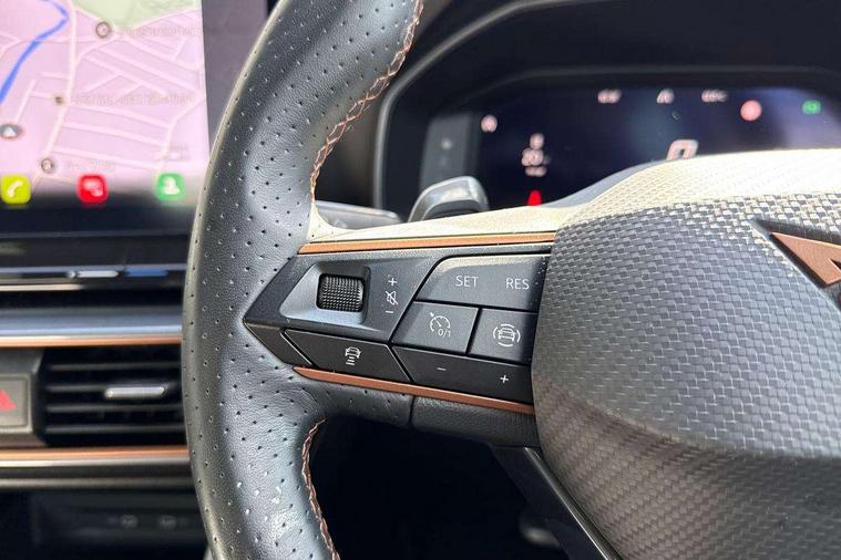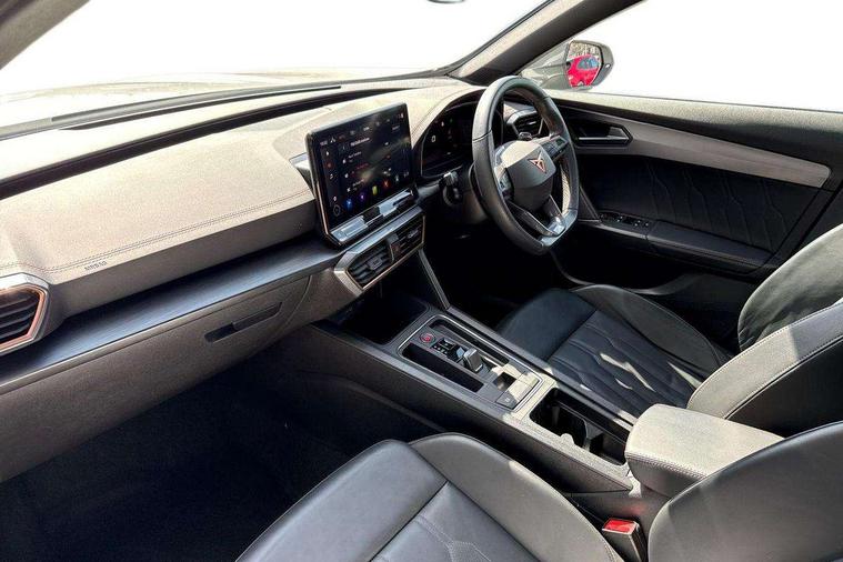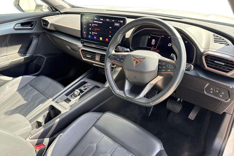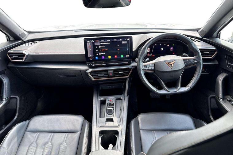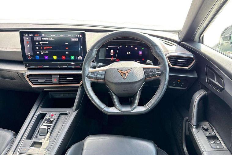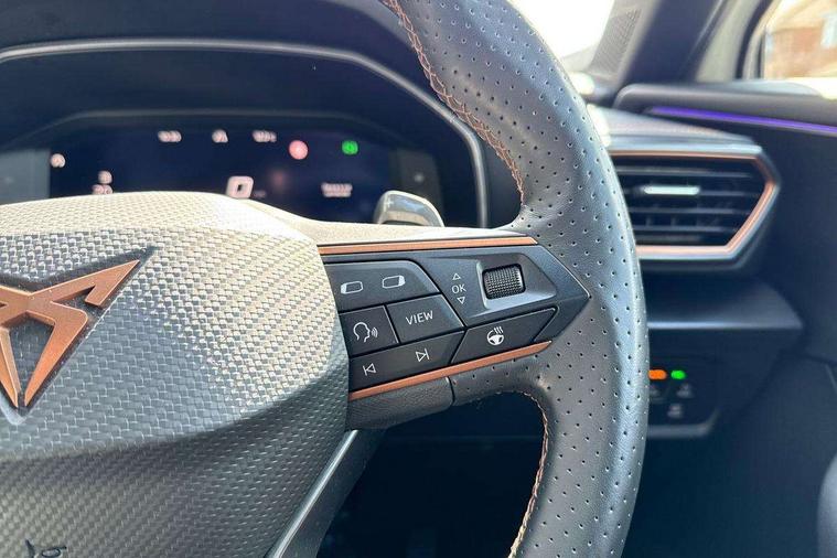 Digital cockpit and configurable dashboard, Driver alert system, Driving profile selection, Forward collision warning with automatic braking, Lane assist, Navigation system with 12'' Touchscreen Display, Park assist (inc front/rear parking sensors), PAS, Predictive adaptive cruise control with speed limiter, Rear view camera, RPM, trip computer, outside temp gauge, instrument light brightness, low fuel warning light, lights on reminder, gearshift indicator, Service interval indicator, Start/stop system with regenerative braking, Voice control system, Wired Android Auto, Wireless apple carplay, Wireless phone charger, Electronic locking differential and dynamic traction support, Standard suspension, 2 front and 2 rear USB type C sockets, Auxiliary input socket, DAB radio, Auto dimming rear view mirror, Body colour door handles, Body coloured bumpers, Dark grey wing mirror, Daytime running light with automatic headlight control and coming home feature, Dynamic headlight range control, Electric front/rear windows, Electrically adjustable heated and folding door mirrors with memory function, Front fog lamps with cornering function, Gloss black roof rails and window surrounds, LED Headlights, LED Taillights with dynamic indicator, Rain sensing wipers, Rear diffuser with black simulated exhaust pipes, Rear side wing doors, Rear wash/wipe, Third brake light, Tinted rear windows, Welcome lights, 12v power supply in centre console, 12V socket, 12v socket in loadspace, 2 front and 2 rear reading lights, 230V socket, 3 seat bench in 2nd row, 60/40 split rear bench seat with armrest and mechanical seat release, Black headlining, Dust/pollen filter, Front and rear head restraints, Front centre armrest, Height/reach adjust steering wheel, Illuminated interior front door sills, Illuminated sunvisor with mirror, Isofix, Leather multi function heated steering wheel with gear shift paddles, Luggage tie-down hooks, Single front passenger seat, Three zone climate control with control panel in rear, Variable luggage/load compartment floor, Wraparound lighting, Genuine Nappa leather Pack - Cupra, 3 point seatbelts on all rear seats, ABS, Brake control system - ESC and brake booster, Child proof door locks, Driver and front passenger airbags with front passenger airbag de-activation, Electronic parking brake, Front and rear disc brakes, Front side curtain airbags, Hill hold control, Public e-call, Seat belt reminder for front and rear seats, Tyre pressure monitoring system, Anti theft alarm system, Keyless entry and start system (KESSY), Locking wheel bolts, Copper and aluminium interior detailing, 19" 'Exclusive' machined sport matte black and silver alloy wheels,