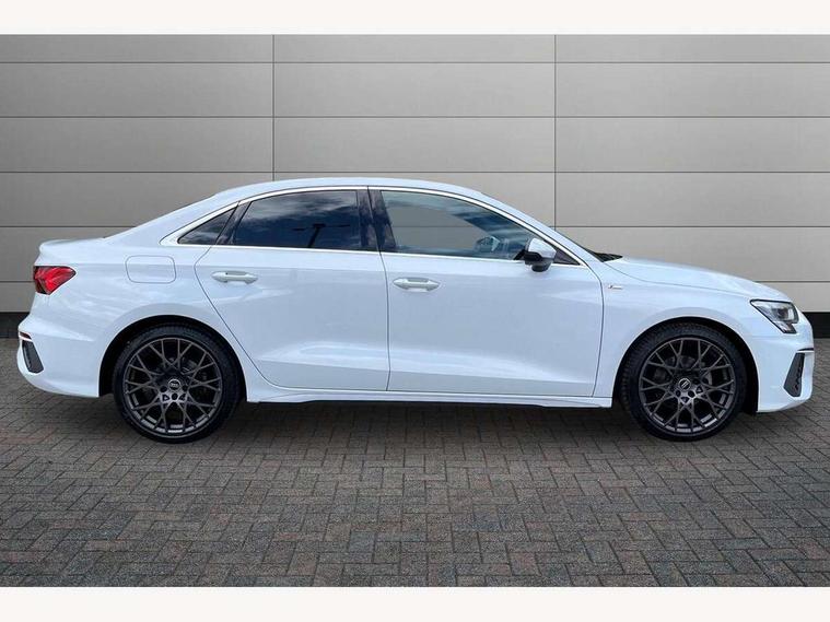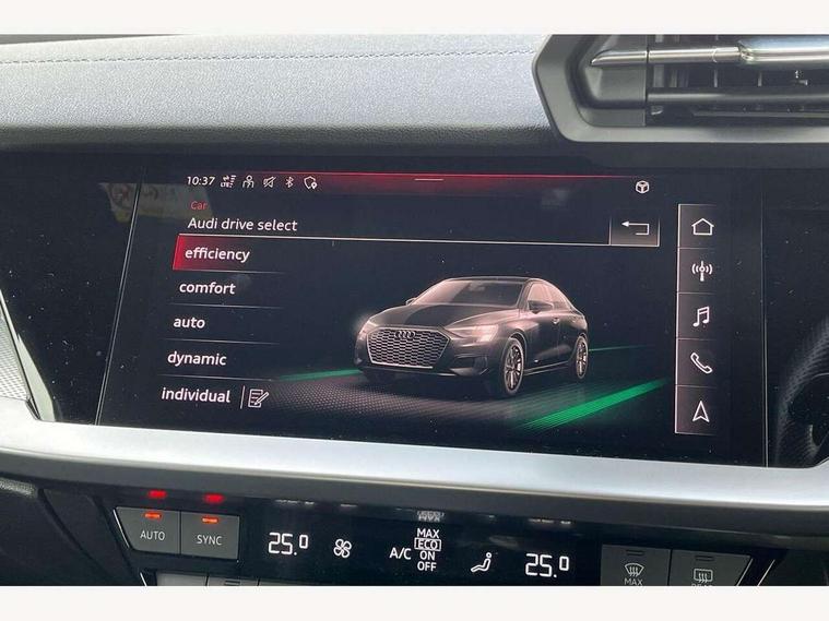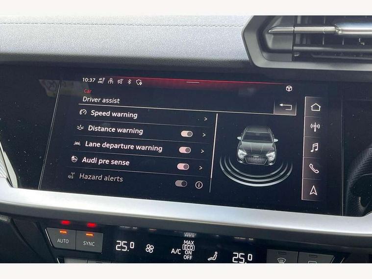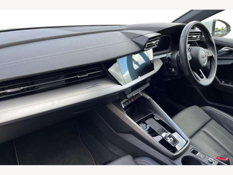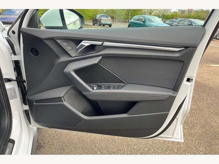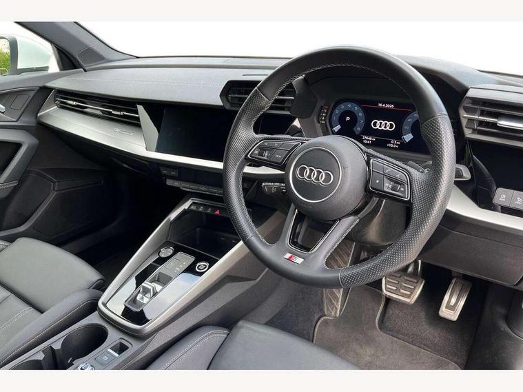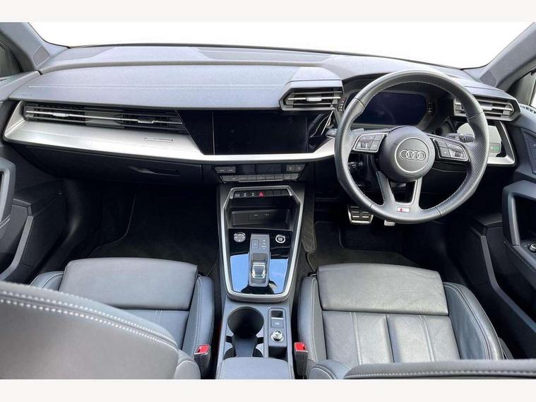 Audi connect emergency call and service, Audi drive select (Auto, Comfort, Dynamic, Efficiency and Individual), Audi smartphone interface, Audi Virtual Cockpit - 10.25" digital and colour instrument cluster, Automatic start/stop system with recuperation, Bluetooth interface, Collision avoidance assistant, Electromechanical power speed sensitive steering, Lane departure warning system, MMI Navigation Plus with high resolution 10.1" colour touch screen display, Service indicator, Voice control system with natural language interaction, 2x USB Type C ports (for charging and data transfer), 6 passive loudspeakers, CD player, DAB Digital radio, 3rd brake light, Acoustic glass windscreen, Aluminium window trim, Auto dimming frameless rear view mirror, Electrically adjustable/heated/folding/dimming door mirrors with kerb view includes integrated LED indications + kerb view function for passenger side, Front electric windows, Illuminated door sills with aluminium inserts at the front with S logo, LED daytime running lights, LED headlights with LED rear lights and dynamic rear indicators, Light and rain sensors, Model and engine designation badges at rear, Privacy glass - dark tinted rear window, rear door and side windows, Rear boot, Rear electric windows, Rear side wing doors, S line bumpers, S roof spoiler, 12V socket and storage compartment in front centre console, 3 seat bench in 2nd row, 40/20/40 split folding rear seat bench with cupholder, Black cloth headlining, Dual zone electronic climate control, Electronically operated child locks, Front and rear centre armrest in leather, Front and rear headrests, Front/rear floor mats, Height and reach adjustable steering wheel, Illuminated vanity mirror, Interior lighting - glove compartment light and right hand side, Luggage compartment floor covering, Manual boot compartment lid, Manually adjustable front sport seats, Seat side bolsters, Single front passenger seat, Stainless steel pedals and front footrest in black, Twin leather upholstery with front sports seats S embossed logo, Aluminium interior elements pack - A3 Saloon, LED interior lighting pack - A3 Saloon, S line styling pack - A3 Saloon, 3x3 point rear seat belts, Driver and front passenger airbag with passenger airbag deactivation, Electronic Stabilisation Control (ESC) including ABS, ASR and EDL, First aid kit with warning triangle and 2 safety vests, Front side airbags with head airbags and interaction airbag, Hill hold assist, Pre-sense front with pedestrian and cyclist detection, Seatbelt monitoring, Tyre pressure loss indicator, Anti theft alarm, Anti-theft wheel bolts, Immobiliser, Remote control central locking, Aluminium air vent surrounds, Aluminium trim elements, Dark spectrum aluminium inlays, accent surfaces in the dashboard and centre console in platinum grey silk effect paint finish,
