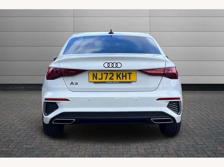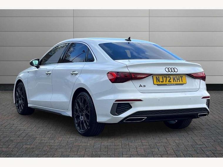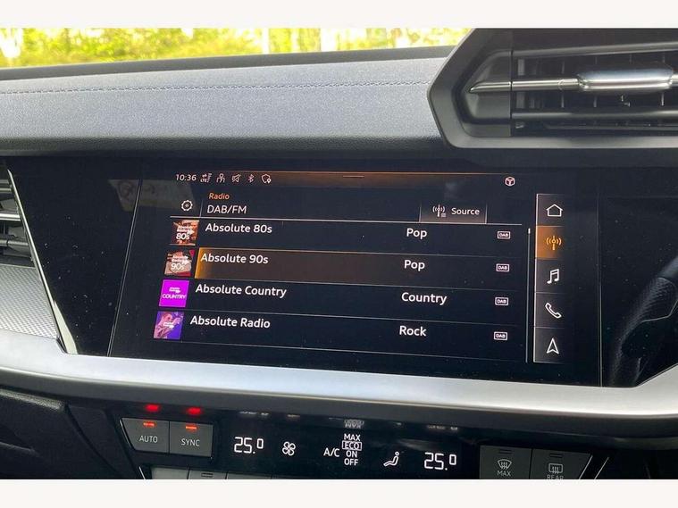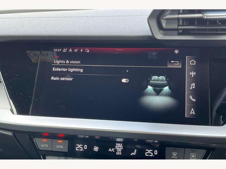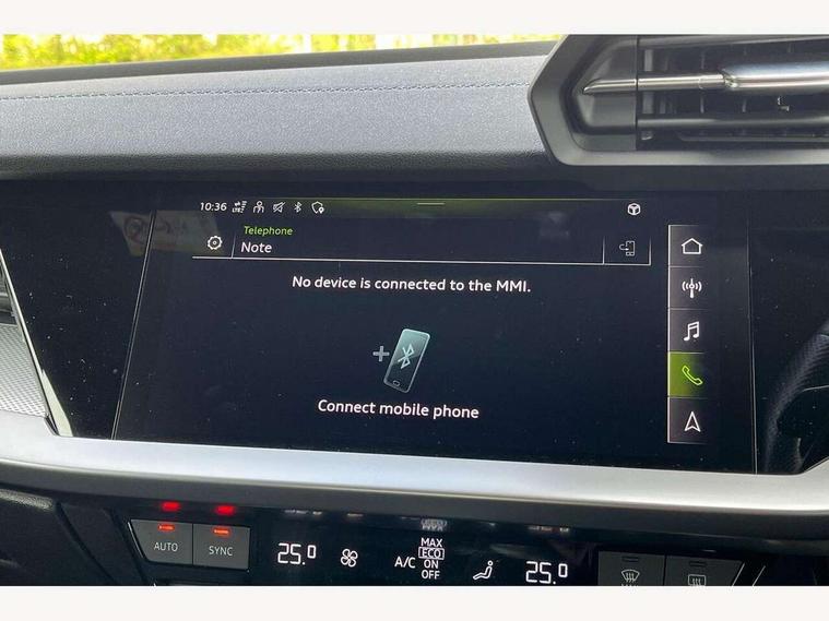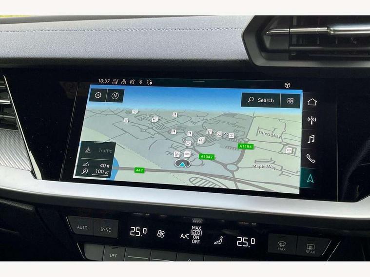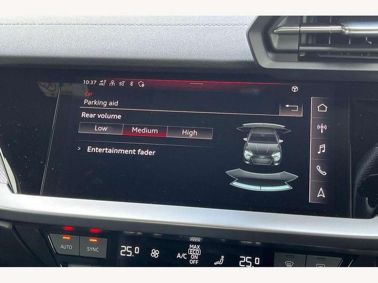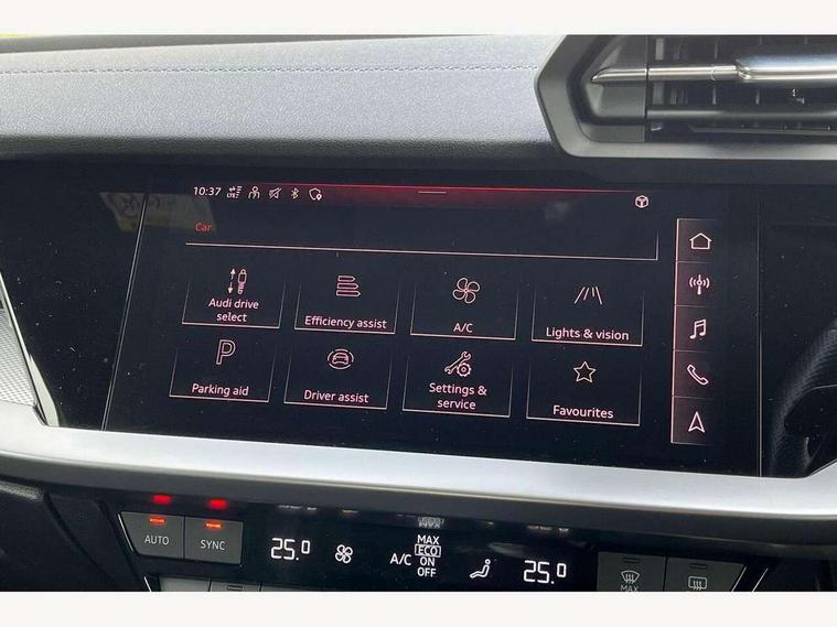 Audi connect emergency call and service, Audi drive select (Auto, Comfort, Dynamic, Efficiency and Individual), Audi smartphone interface, Audi Virtual Cockpit - 10.25" digital and colour instrument cluster, Automatic start/stop system with recuperation, Bluetooth interface, Collision avoidance assistant, Electromechanical power speed sensitive steering, Lane departure warning system, MMI Navigation Plus with high resolution 10.1" colour touch screen display, Service indicator, Voice control system with natural language interaction, 2x USB Type C ports (for charging and data transfer), 6 passive loudspeakers, CD player, DAB Digital radio, 3rd brake light, Acoustic glass windscreen, Aluminium window trim, Auto dimming frameless rear view mirror, Electrically adjustable/heated/folding/dimming door mirrors with kerb view includes integrated LED indications + kerb view function for passenger side, Front electric windows, Illuminated door sills with aluminium inserts at the front with S logo, LED daytime running lights, LED headlights with LED rear lights and dynamic rear indicators, Light and rain sensors, Model and engine designation badges at rear, Privacy glass - dark tinted rear window, rear door and side windows, Rear boot, Rear electric windows, Rear side wing doors, S line bumpers, S roof spoiler, 12V socket and storage compartment in front centre console, 3 seat bench in 2nd row, 40/20/40 split folding rear seat bench with cupholder, Black cloth headlining, Dual zone electronic climate control, Electronically operated child locks, Front and rear centre armrest in leather, Front and rear headrests, Front/rear floor mats, Height and reach adjustable steering wheel, Illuminated vanity mirror, Interior lighting - glove compartment light and right hand side, Luggage compartment floor covering, Manual boot compartment lid, Manually adjustable front sport seats, Seat side bolsters, Single front passenger seat, Stainless steel pedals and front footrest in black, Twin leather upholstery with front sports seats S embossed logo, Aluminium interior elements pack - A3 Saloon, LED interior lighting pack - A3 Saloon, S line styling pack - A3 Saloon, 3x3 point rear seat belts, Driver and front passenger airbag with passenger airbag deactivation, Electronic Stabilisation Control (ESC) including ABS, ASR and EDL, First aid kit with warning triangle and 2 safety vests, Front side airbags with head airbags and interaction airbag, Hill hold assist, Pre-sense front with pedestrian and cyclist detection, Seatbelt monitoring, Tyre pressure loss indicator, Anti theft alarm, Anti-theft wheel bolts, Immobiliser, Remote control central locking, Aluminium air vent surrounds, Aluminium trim elements, Dark spectrum aluminium inlays, accent surfaces in the dashboard and centre console in platinum grey silk effect paint finish,