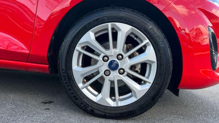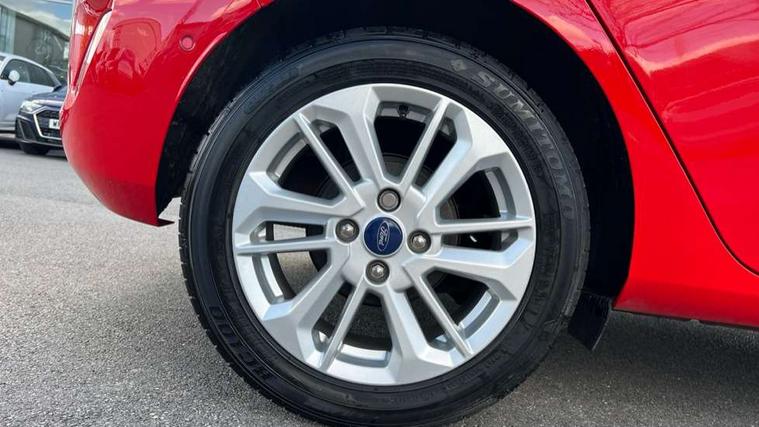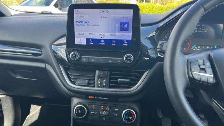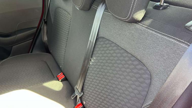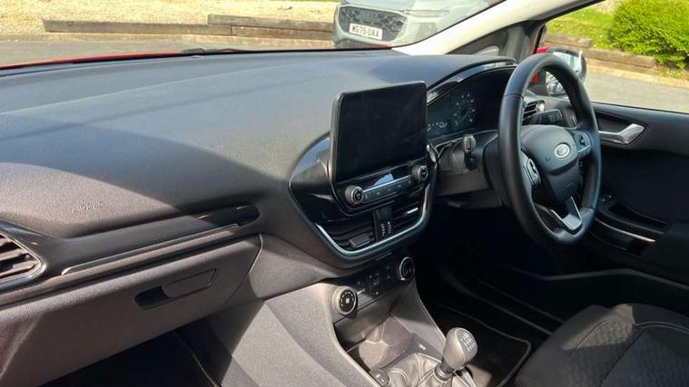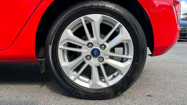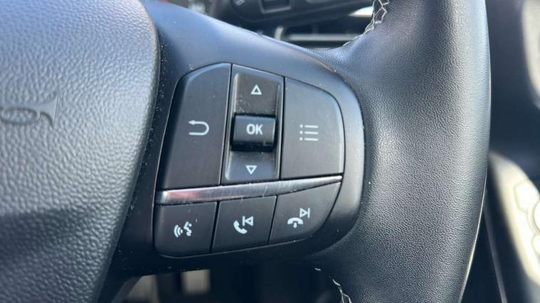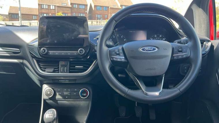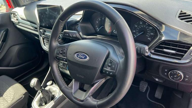 Bluetooth system, Electric power steering, Ford easy fuel, Ford SYNC 3 Navigation system incl 8" touchscreen, 7 speakers, FordPass connect, Apple carplay, android auto, voice control and emergency assistance, Rear parking distance sensors, Selectable drive modes (Normal, Sport, Track), Trip computer, 2 USB ports, Auxiliary input socket, DAB Digital radio, Steering wheel mounted controls, Body colour bumpers, Body colour door handles, Body colour rear spoiler, Body coloured electrically operated and heated door mirrors with side indicators, Chrome beltline trim, Chrome front grille, Chrome lower window surround, Cornering front fog lights, Electric front windows/one touch facility, Electric rear windows, Quickclear heated windscreen, Rain sensing wipers and auto dimming rear view mirror, Rear privacy glass, Rear wiper, 3 spoke leather trimmed steering wheel with audio control, 60/40 split folding rear seat, Adjustable head restraints, Boot carpet, Centre console with opening armrest, 2x cupholders, 12v and USB, Chrome inner door handles, Cloth upholstery, Footwell illumination, Front floor mats in velour, Front map reading lights, Front seat and rear pockets, Illuminated glovebox, Leather gaiter, Load area light, Luxury woven headliner, Manual 2 way passenger seat adjust, Manual 4-way driver seat adjust, Manual air conditioning, Overhead console with sunglasses holder, Pollen filter, Rake/reach adjustable steering wheel, Sensico wrapped steering wheel, NCAP Pack - Fiesta, 3 point seatbelts on all rear seats, ABS+EBA, Curtain airbags, Driver and passenger airbags, Drivers knee airbag, Electronic stability control with hill start assist, Front passenger airbag deactivation, Front side airbags, Seatbelt warning, Two tone horn, Tyre pressure monitoring system, Keyless start with 'Ford Power' starter button, MyKey system, Remote central locking & engine immobiliser, Thatcham Cat.1 alarm, 16" 10 spoke alloy wheels,
