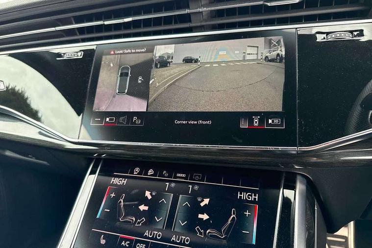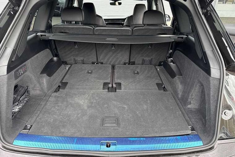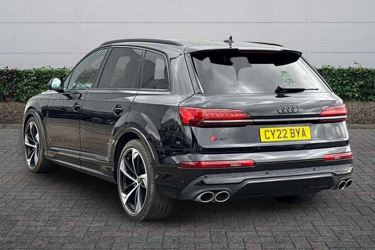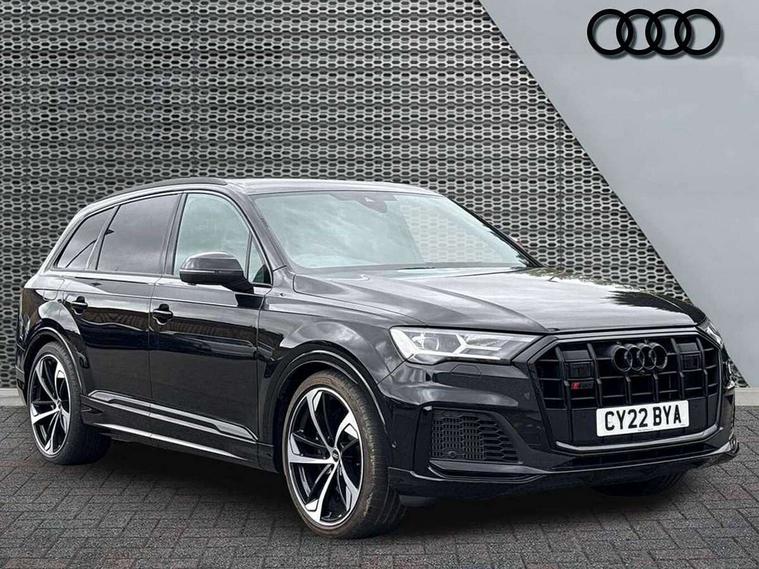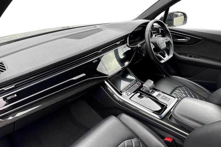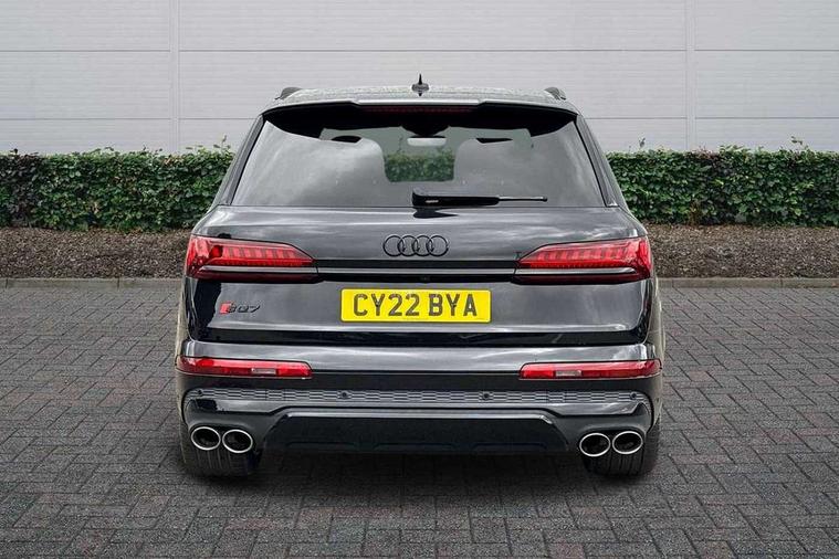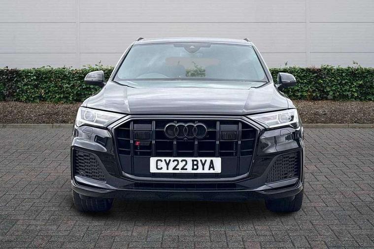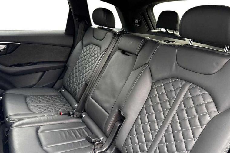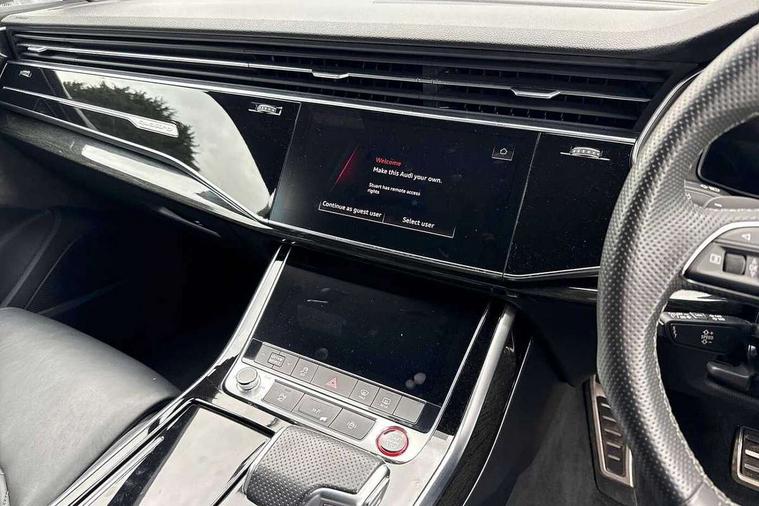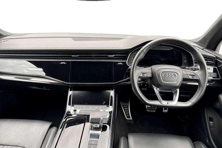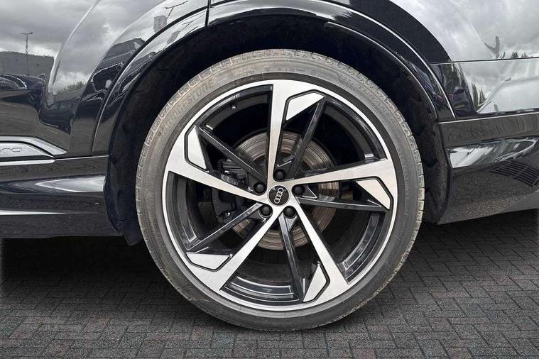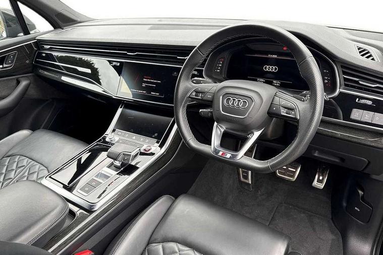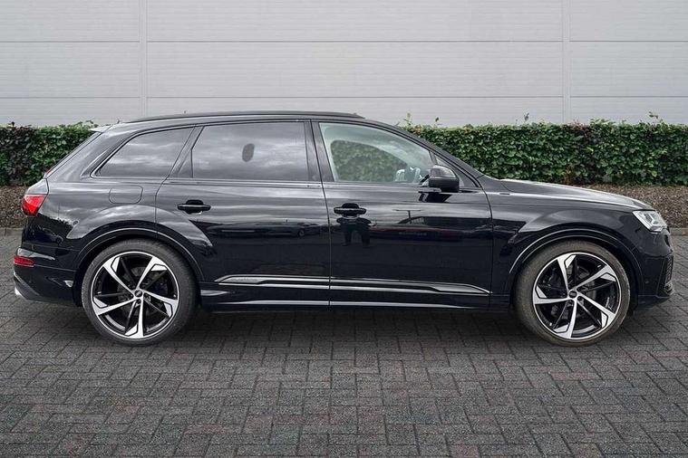 All wheel steering, Audi connect safety and service (e-call), Audi connect with Amazon Alexa Integration, Audi drive select (Auto, Comfort, Dynamic, Efficiency, Individual, Off-road and All road), Audi virtual cockpit - 12.3" high-resolution LCD display with fully customisable instrument cluster, Bluetooth interface, Camera based traffic sign recognition, MMI navigation plus with MMI touch screens includes 10.1" and 8.6" screens with haptic feedback, Natural voice recognition, Parking system plus with 360 degree display (front, rear and side sensors) - acoustic and visual park assist system, Power operated tailgate, Rear view camera, Smartphone interface includes wireless Apple carplay/Android Auto, Start/stop system, 48V Mild hybrid technology, 85 litre fuel tank, Quattro all wheel drive with self locking centre differential, S specific adaptive air sport suspension, Audi music interface - front 2 USB-C ports with charger and data functions, Audi sound system with 6 channel amplifier, 180 watt amplifying capacity and 10 loudspeakers including subwoofer, DAB digital radio module, 3rd brake light, Audi Beam uses LEDs to project Audi logo onto the ground as you exit your SQ7, Audi matrix LED headlights with dynamic front and rear indicators, Auto dimming frameless rear view mirror, Black roof rails, Electrically adj heated/folding + automatically dimming exterior mirrors with memory + automatic kerb side function for passenger side exterior mirror, Gloss black finish for exterior Audi rings and SQ7 logos, Heat insulating glass in windshield, Integrated LED indications in door mirrors, LED daytime running lights, LED rear tail lights, Privacy glass - dark tinted rear and rear side windows from B-pillar backwards, Rear side wing doors, Rear wiper, S front and rear bumpers, S specific rear bumper with 4 exhaust pipes, 2 seat bench in 3rd row, 3 seat bench in 2nd row, 4 zone deluxe automatic climate control, 7 seat layout with ISOFIX points for the front passenger seat and rear passenger seat, Black cloth headlining, Comfort front centre armrest, Electric adjustable front seats/backrest bolsters, lumbar support, memory functionality, Folding rear seats, Front head restraints, Front/rear floor mats, Heated front seats, Illuminated door sill trims with S logo, LED interior ambient lighting, Luggage compartment cover, Luggage compartment sill protection in stainless steel, Rear head restraints, Single front passenger seat, Stainless steel pedals, Sunvisors with illuminated vanity mirrors, Valcona leather upholstery with front super sport seat S embossed logo, Titanium black styling pack - Q7/SQ7, 3 point seatbelts on all rear seats, Audi pre sense front, Child locks on rear doors, Driver and front passenger, front side and curtain airbags, Electromechanical parking brake, Electronic Stabilisation Control (ESC) including ABS, ASR and EDL, Extended pedestrian protection measures, Hill hold assist, Seatbelt monitoring, Tyre pressure loss indicator, Warning triangle and first aid kit, Anti theft alarm, Anti-theft wheel bolts and wheel loosening detection, Keyless Go, Remote central locking, Polished oak trim with grey finish inlay, 22" 5 arm trapezoid design audi sport alloy wheels in anthracite black with gloss turned finish, Tool kit, Tyre repair kit,