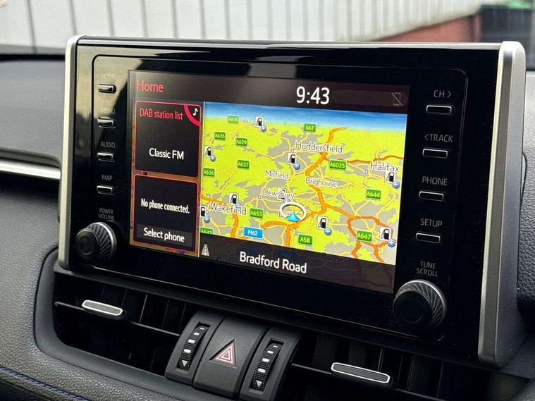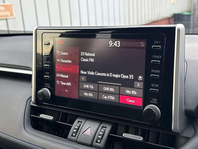 7" TFT multi information display, Analog tachometer, Apple car play and Android auto, Blind spot monitoring with rear cross traffic alert, Bluetooth system, Cyclist Detection, Drive mode selector, eCall emergency call system, ECO-driving indicator, Electric power steering, EV audible alert, Front parking sensors, Full range intelligent adaptive cruise control, Hybrid system indicator, Lane departure warning system, Lane trace assist, Lights on warning, Memory on adjustable speed limiter, My T Connected services, Night Time Pedestrian Detection, Power boot opening and closing, Push button start, Rear parking camera, Rear parking sensors, Remote boot door release in cabin, Remote boot door release in key, Road sign assist - RSA, Touch 2 Go navigation system including 3D maps and voice control, Traffic sign recognition, Trip computer, Voice control system, Vehicle Stability Control (VSC), 6 speakers, 8" Multimedia display touch screen, Auxiliary socket for external MP3 player, DAB audio, Toyota touch media system, USB connection, Adaptive automatic high beam, Automatic headlamp levelling, Automatic headlights, Automatic wipers, Automatically retractable door mirrors, Black rear spoiler, Black roof rails, Black Shark-fin antenna, Body colour door handles, Door mirror puddle lights, Dual exhaust pipes, Electric adjustable door mirrors, Electrochromatic rear view mirror, Emergency brake-light signal (EBS), Follow me home headlights, Front fog lights, Glass black protection moulding on side doors, Gloss black door mirrors, Gloss black front and rear bumper, Heated door mirrors, LED daytime running lights, LED High mounted stop lamp, LED rear combination lights, Meshed upper front grille, Power front windows, Power rear windows, Privacy glass, Projector LED headlights, Rear screen wiper - intermittent, Rear windscreen defogger, Silver front under-run, Silver rear under-run, Trailer sway control, Turning signal integrated indicators in door mirrors, 3 rear headrests, 60/40 split fold rear seat back, Black roof lining, Boot light, Clean air filter, Driver and front passenger personal light, Driver and front passenger Whiplash Injury Lessening seats, Driver and passenger sunvisors with illuminated vanity mirrors, Dual sided deck board in boot, Dual zone automatic air conditioning, Dynamic sports seats, Floor mats, Folding rear centre armrest, Front and rear bottle holders, Front centre armrest, Front footwell lights, Front headrests, Front seat and rear pockets, Front/rear roof mounted assist grips, Heated driver and front passenger seats, Illuminated entry system, Isofix child seat preparation, Leather gear shift with chrome surround, Light blue ambient lighting on front cupholders and open tray, Manual telescopic and tilt 3-spoke leather steering wheel with Chrome insert, Manually reclining and sliding front passenger seat, Multimedia switches on steering wheel, Pollen filter, Power height-adjustable sliding reclining and lumbar support for driver seat, Rear coat hooks, Rear door armrests, Rear passenger air vents, Rear view display in display audio screen with dynamic guide lines, Reclining rear seats, Satin chrome interior door handles, Sunglasses holder, Synthetic leather upholstery, Telephone and voice recognition switches on steering wheel, 3x3 point rear seatbelts, ABS/EBD, Acoustic vehicle alerting system, Adjustable front driver and passenger seat belt extender, Brake assist function, Brake hold function, Child proof door locks, Collision mitigation braking system, Driver/Front Passenger airbags, Driver/front passenger side airbags, Drivers knee airbag, Electronic parking brake, Electronic Stability Programme (ESP), Front and rear curtain airbags, Front and rear seatbelt reminder, Front passenger airbag detector, Hill start assist, Passenger airbag cut-off device, Pedestrian detection, Pre collision system, Seatbelt pretensioners with load limiters, Toyota safety sense, Traction control, Tyre pressure warning, Glass-breaking alarm sensors, Immobiliser, Intrusion alarm, Light - on and Key in reminder, Motion sensor alarm, Remote central locking, Smart entry + Smart start, Speed sensitive auto door locking, Tilt detection sensors, Piano black centre console with silver insert, Soft-touch black lower dashboard, Soft-touch black upper dashboard with silver insert, 19" 5 Spoke black alloy wheels, Tyre repair kit,