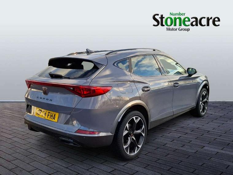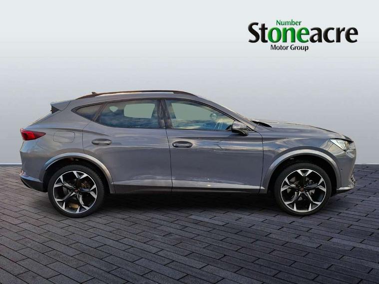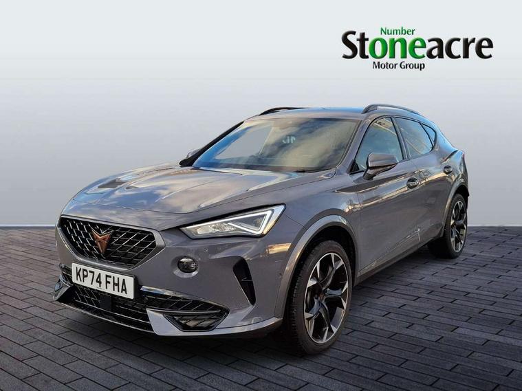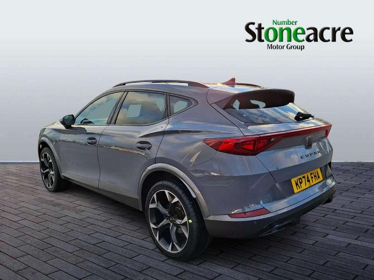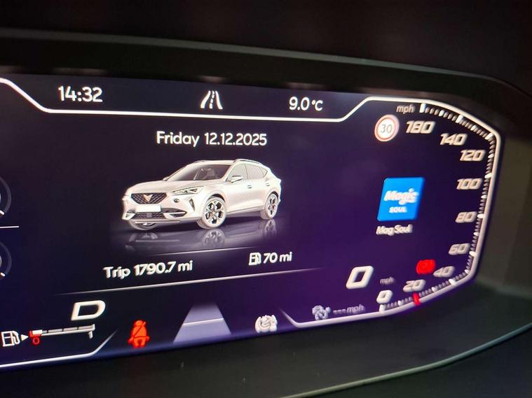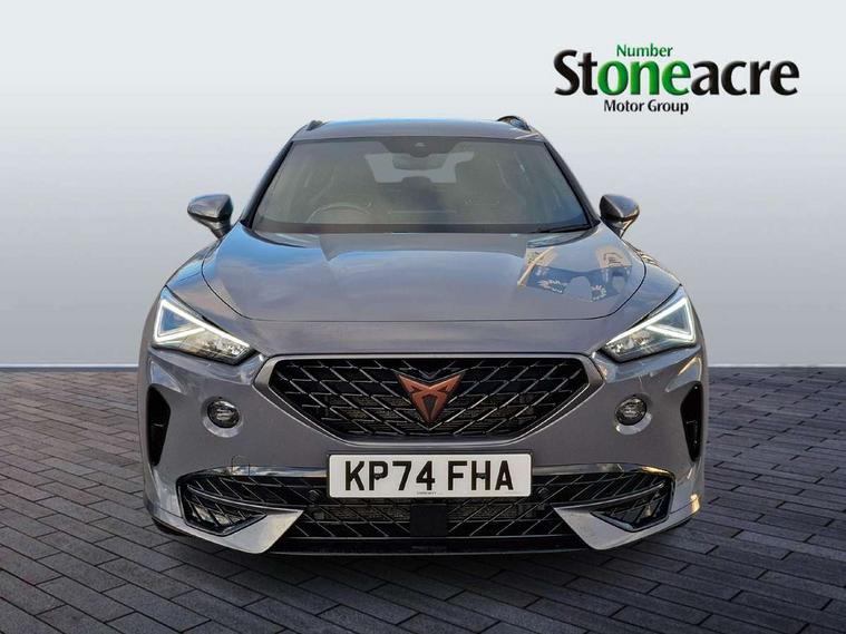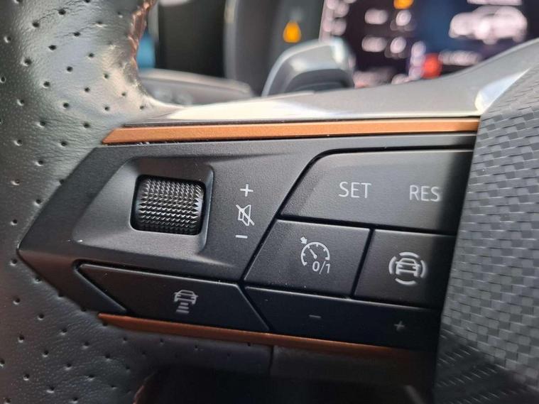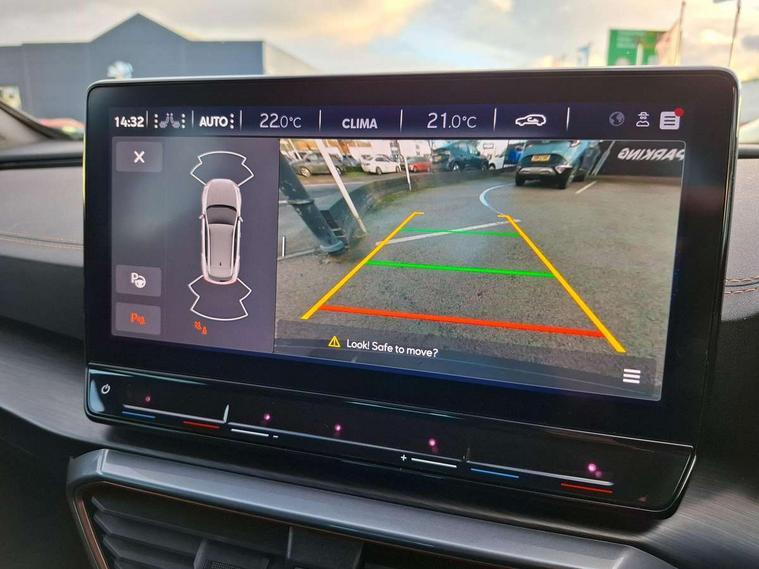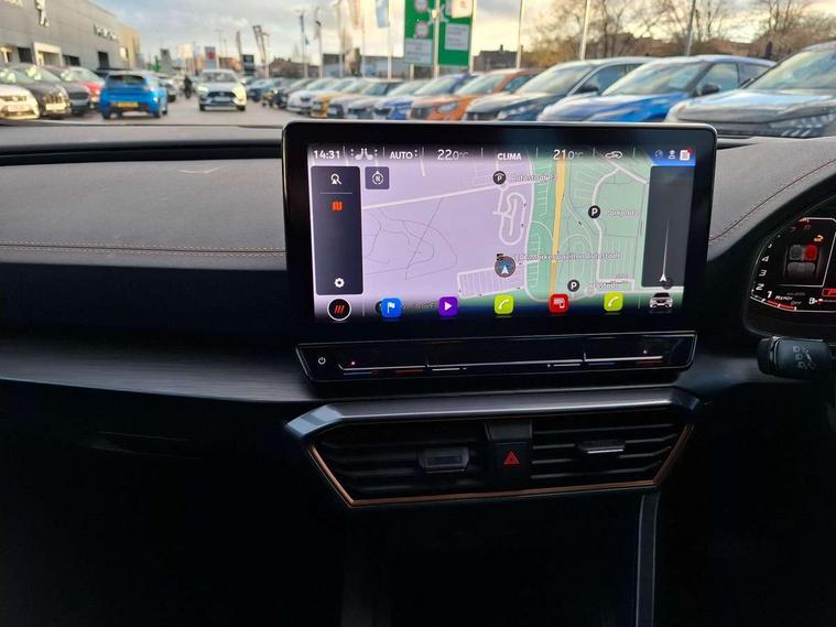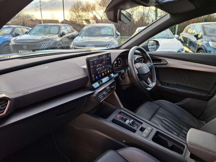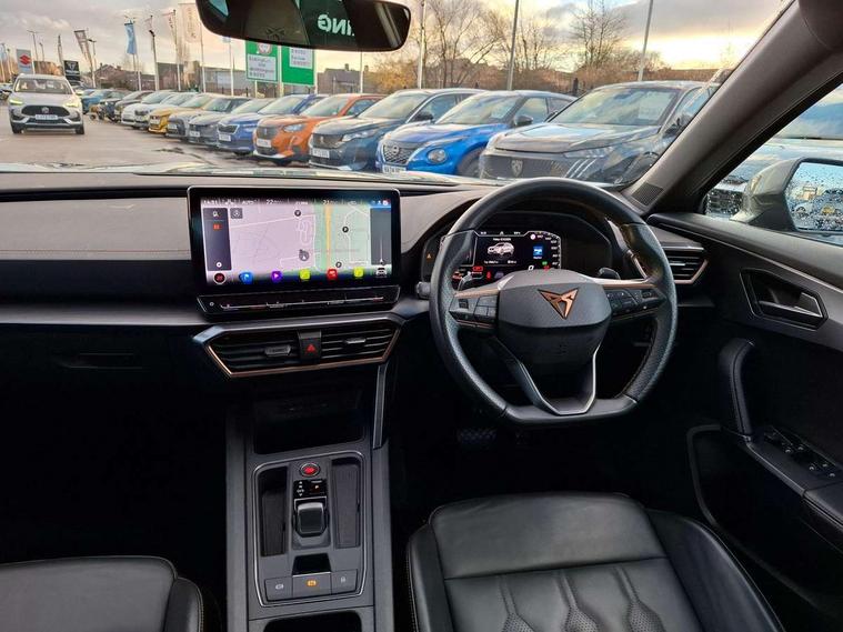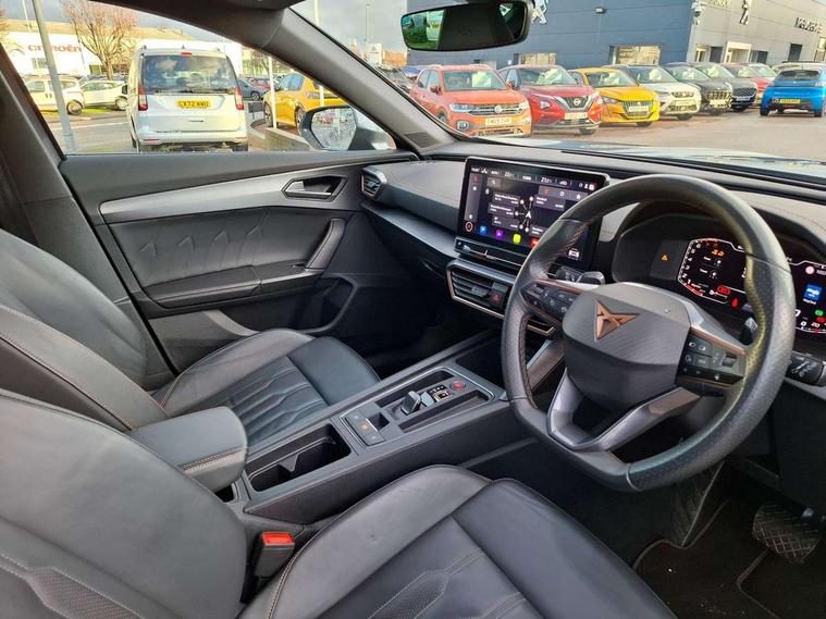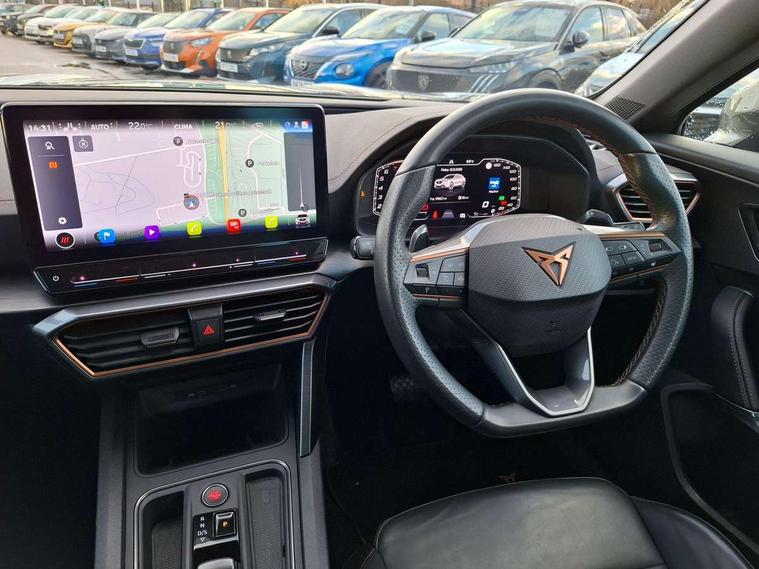 Digital cockpit and configurable dashboard, Driver alert system, Driving profile selection, Forward collision warning with automatic braking, Lane assist, Navigation system with 12'' Touchscreen Display, Park assist (inc front/rear parking sensors), PAS, Predictive adaptive cruise control with speed limiter, Rear view camera, RPM, trip computer, outside temp gauge, instrument light brightness, low fuel warning light, lights on reminder, gearshift indicator, Service interval indicator, Start/stop system with regenerative braking, Voice control system, Wired Android Auto, Wireless apple carplay, Wireless phone charger, Electronic locking differential and dynamic traction support, Standard suspension, 2 front and 2 rear USB type C sockets, Auxiliary input socket, DAB radio, Auto dimming rear view mirror, Body colour door handles, Body coloured bumpers, Dark grey wing mirror, Daytime running light with automatic headlight control and coming home feature, Dynamic headlight range control, Electric front/rear windows, Electrically adjustable heated and folding door mirrors with memory function, Front fog lamps with cornering function, Gloss black roof rails and window surrounds, LED Headlights, LED Taillights with dynamic indicator, Rain sensing wipers, Rear diffuser with black simulated exhaust pipes, Rear side wing doors, Rear wash/wipe, Third brake light, Tinted rear windows, Welcome lights, 12v power supply in centre console, 12V socket, 12v socket in loadspace, 2 front and 2 rear reading lights, 230V socket, 3 seat bench in 2nd row, 60/40 split rear bench seat with armrest and mechanical seat release, Black headlining, Dust/pollen filter, Front and rear head restraints, Front centre armrest, Height/reach adjust steering wheel, Illuminated interior front door sills, Illuminated sunvisor with mirror, Isofix, Leather multi function heated steering wheel with gear shift paddles, Luggage tie-down hooks, Single front passenger seat, Three zone climate control with control panel in rear, Variable luggage/load compartment floor, Wraparound lighting, Genuine Nappa leather Pack - Cupra, 3 point seatbelts on all rear seats, ABS, Brake control system - ESC and brake booster, Child proof door locks, Driver and front passenger airbags with front passenger airbag de-activation, Electronic parking brake, Front and rear disc brakes, Front side curtain airbags, Hill hold control, Public e-call, Seat belt reminder for front and rear seats, Tyre pressure monitoring system, Anti theft alarm system, Keyless entry and start system (KESSY), Locking wheel bolts, Copper and aluminium interior detailing, 19" 'Exclusive' machined sport matte black and silver alloy wheels,