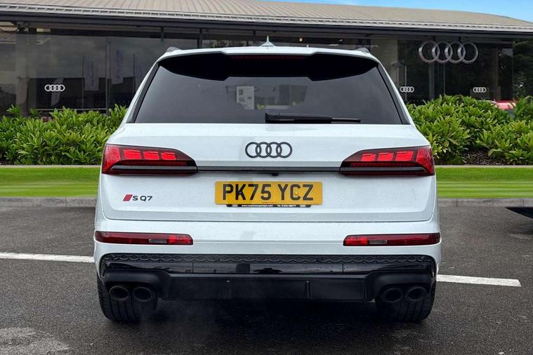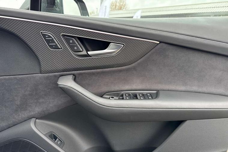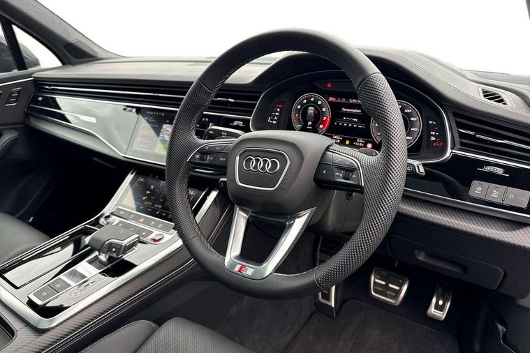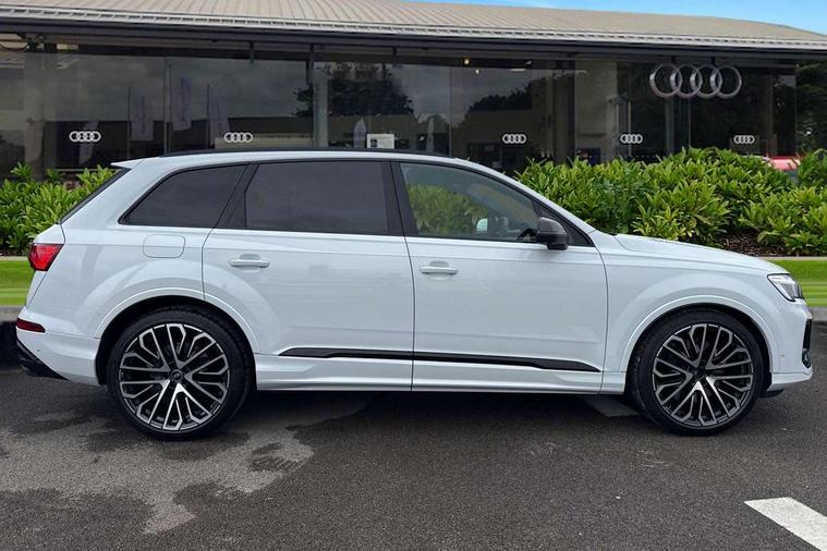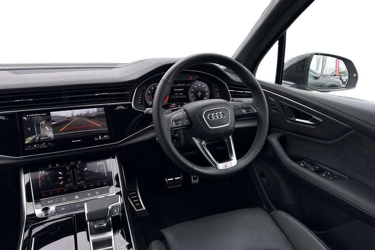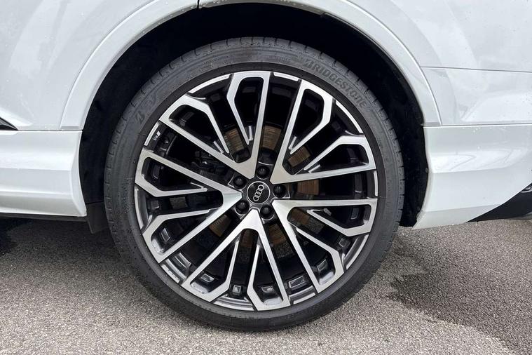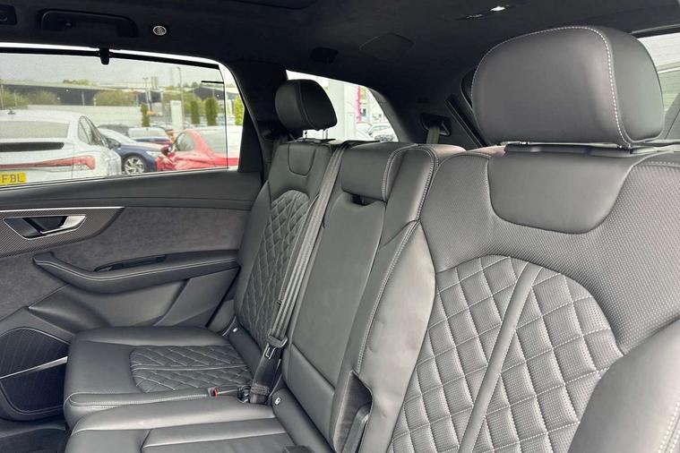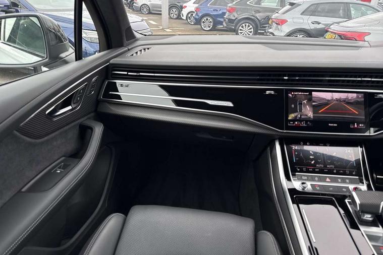 360 degree camera, Audi connect safety and service (e-call), Audi connect with Amazon Alexa Integration, Audi drive select (Auto, Comfort, Dynamic, Efficiency, Individual, Off-road and All road), Audi phone box light with wireless charging, Audi virtual cockpit plus, Bluetooth interface, Camera based traffic sign recognition, Collision avoidance assistant, Electromechanical power steering, Head up Display, MMI navigation plus with MMI touch screens includes 10.1" and 8.6" screens with haptic feedback, Natural voice recognition, Operating buttons in Matte black, Power door closure, Power operated tailgate, Smartphone interface includes wireless Apple carplay/Android Auto, Start/stop system, 48V Mild hybrid technology, 85 litre fuel tank, Electromechanical active roll stabilisation, Quattro with sport differential, S specific adaptive air sport suspension, Audi music interface - front 2 USB-C ports with charger and data functions, Bang + Olufsen premium sound system, DAB digital radio module, Adaptive windscreen wipers with integrated washer jets, Aluminium window trim, Audi Beam uses LEDs to project Audi rhombus S logo onto the ground as you exit your SQ7, Auto dimming frameless rear view mirror, Black roof rails, Digital OLED rear combination lamps, Electrically adj heated/folding + automatically dimming exterior mirrors with memory + automatic kerb side function for passenger side exterior mirror, HD Matrix LED headlights with Audi laser light, Headlight washers, Heat insulating glass in windshield, Integrated LED indications in door mirrors, LED 3rd brake light, LED daytime running lights, LED rear tail lights, Loading edge protection in stainless steel, Privacy glass - dark tinted rear and rear side windows from B-pillar backwards, Rear side wing doors, Rear wiper, 2 seat bench in 3rd row, 3 seat bench in 2nd row, 3 spoke heated leather multi-function steering wheel including paddle shift, 4 zone deluxe automatic climate control, 7 seat layout with ISOFIX points for the front passenger seat and rear passenger seat, Black carpets, Black dinamica headlining, Comfort front centre armrest, Double sun visors with illuminated vanity mirrors, Electric adjustable front seats/backrest bolsters, lumbar support, memory functionality, Electric luggage compartment cover, Electric steering wheel adjustment, Folding rear seats, Front head restraints, Front/rear floor mats, Heated front seats, Illuminated door sill trims with S logo, ISOFIX child seat mounting for front passenger seat and 2 outer rear seats with top tether child seat mounting for all 3 rear seats, Luggage compartment sill protection in stainless steel, Rear head restraints, Rear seat bench plus for the second row, with forwards/backwards sliding adjustment and backrest angle adjustment, Seat ventilation and massage function in the front, Single front passenger seat, Stainless steel pedals, Upper interior element with contrasting stitching, Valcona leather upholstery with front super sport seat S embossed logo, Black styling pack plus - Q7, City assist pack without Pre sense basic - Q7, Extended leather pack - SQ7, Multi-coloured extended LED Interior lighting pack - Q7, Technology Pack Pro S Without Advance Key - SQ7, Technology pack pro S without Audi pre sense basic - SQ7, Tour pack with swerve assist - Q7, 3 point seatbelts on all rear seats, Audi pre sense front, Child locks on rear doors, Convenience key with safelock and gesture tailgate, Driver and front passenger, front side and curtain airbags, Electromechanical parking brake, Electronic Stabilisation Control (ESC) including ABS, ASR and EDL, Extended pedestrian protection measures, Hill hold assist, Seatbelt reminder, Tyre pressure loss indicator, Warning triangle and first aid kit, Anti theft alarm with tow away protection, Anti-theft wheel bolts and wheel loosening detection, Remote central locking, Black dashboard, Tool kit, Tyre repair kit,