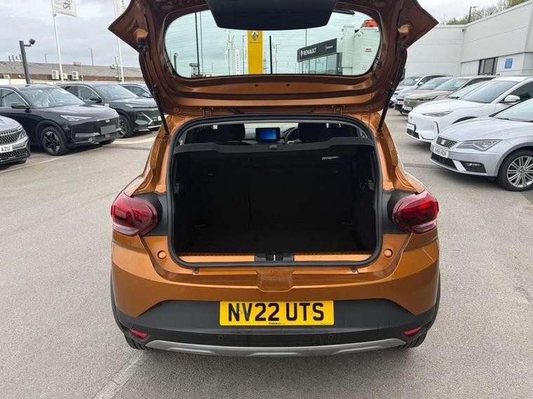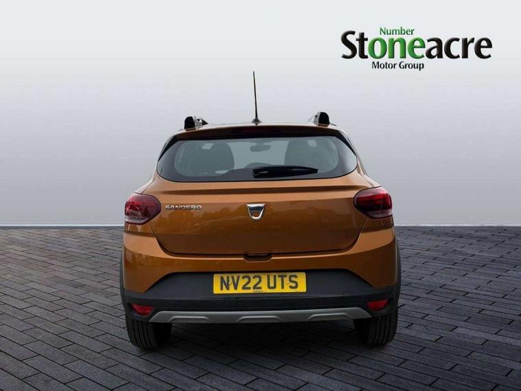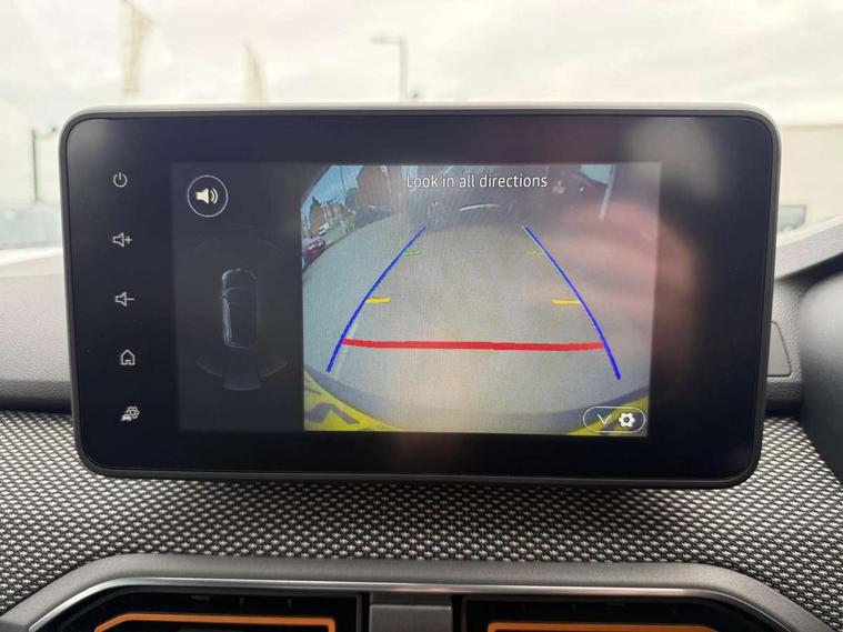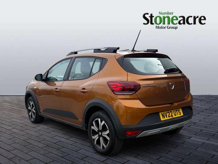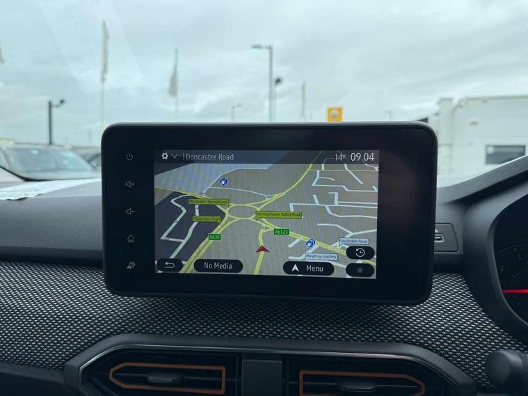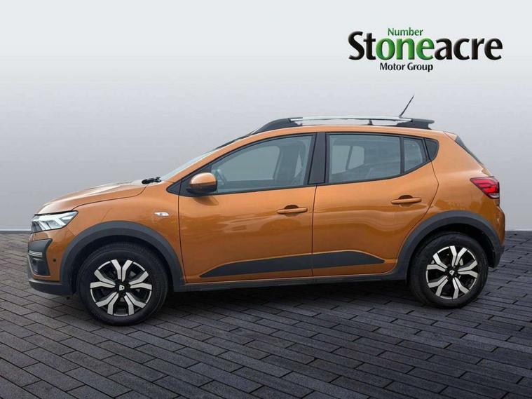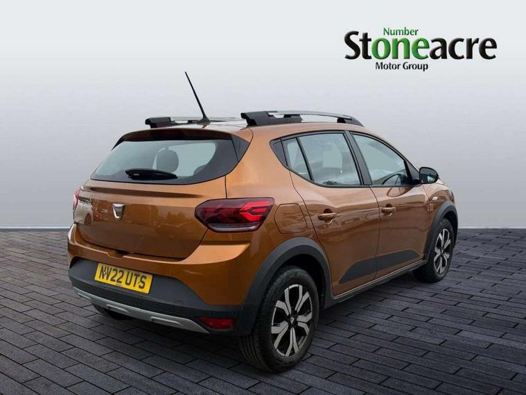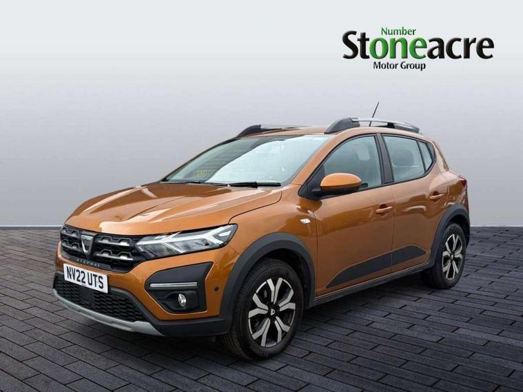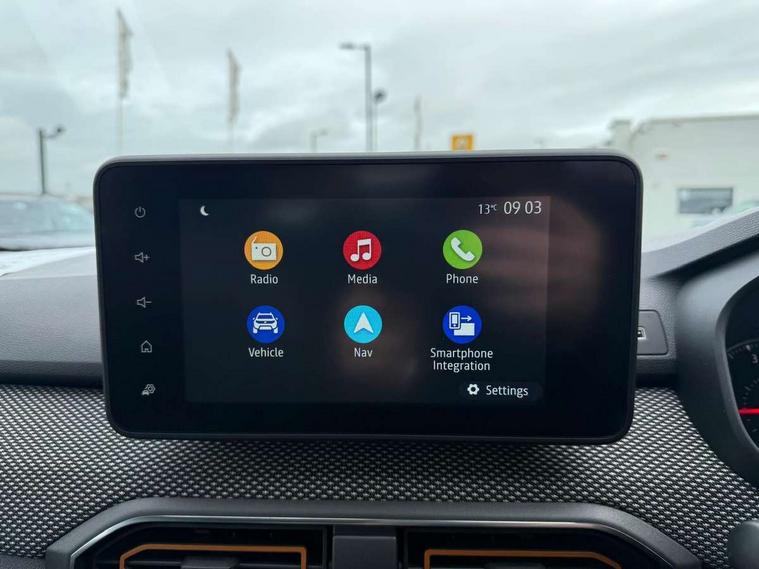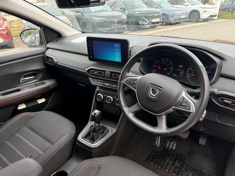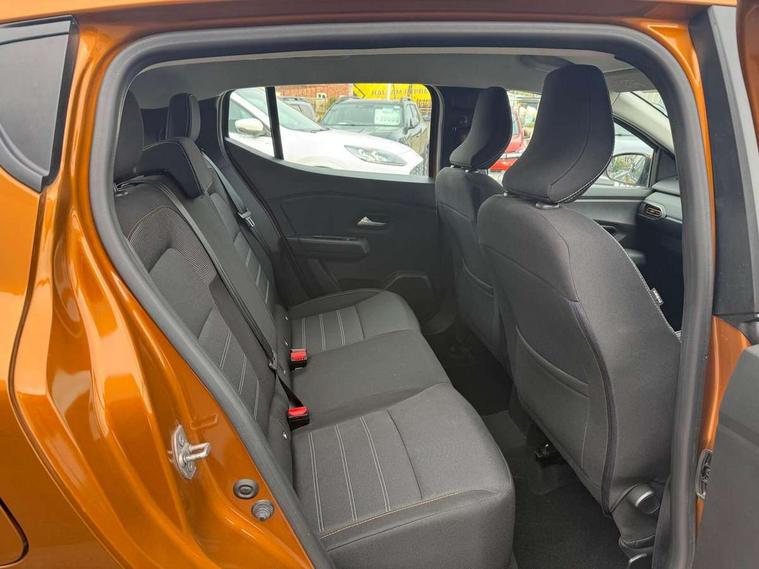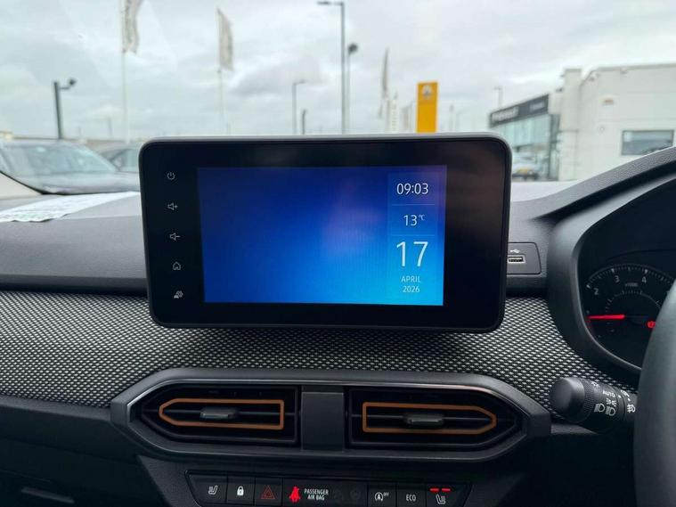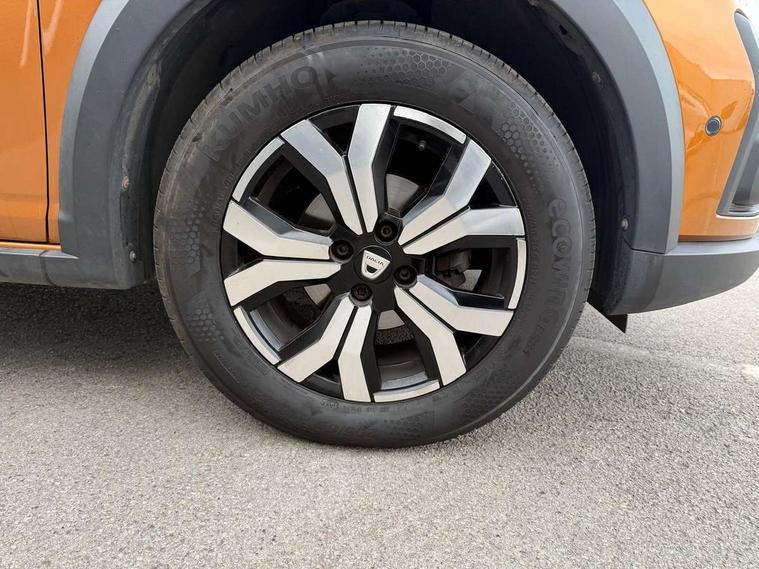 3.5" TFT instrument panel with on-board computer, Blind spot warning, Cruise control with speed limiter, eCall emergency call system, Eco mode, Electric power assisted steering, Front parking sensors, Rear parking sensors, Rev counter, Reversing camera, Stop/start system, 8" MediaNav - DAB Radio, Wifi smartphone replication, Bluetooth, 6 speakres, Apple CarPlay and Android Auto, USB connection for data transfer and charging, USB socket, 3 speed windscreen wipers, Auto lighting, Automatic wipers, Body colour door handles, Body colour door mirrors, Body coloured bumpers, Chrome longitudinal roof bars, Chrome radiator grille, Electrically adjustable and heated door mirrors, Front fog lights, Heated rear window, High level third brake light, LED automatic daytime running lights, LED Y-shape Dacia signature lighting, Modular roof bars, One touch electric front windows, Rear electric windows, Rear side wing doors, Rear wash/wipe, Stepway inscription on radiator grille and roof bars, Tinted windows, 1/3 to 2/3 split folding rear seats, 12 volt front socket, 12 volt rear socket, 3 height adjustable rear headrests, 3 seat rear bench, Automatic air conditioning, Driver + passenger vanity mirrors, Fabric upholstery, Fixed smartphone holder on dashboard, Height adjustable driver seat, Height adjustable front headrests, Height/depth adjustable steering wheel, High central armrest with console storage, Isofix points for child seats in both outer rear seats, Satin chrome interior door handles, Satin Chrome/Copper orange air vents, Single front passenger seat, Soft feel steering wheel, Steering wheel controls, 3x3 point rear seatbelts, ABS and Emergency brake assist, Automatic emergency braking system, Child locks on rear doors, Door open warning, Driver airbag, Electronic parking brake, ESC (Electronic Stability Control), ESP + Hill Start Assist, Front curtain airbags, Front seatbelt pretensioners, Front side airbags, Height adjustable front seatbelts, Passenger airbag, Seatbelt reminder for driver and front passenger, Tyre pressure monitor, Automatic central locking, Immobiliser, Keyless entry, Remote central locking, Decopart on instrument panel and door with textile, 16" Diamond-effect alloy wheels,