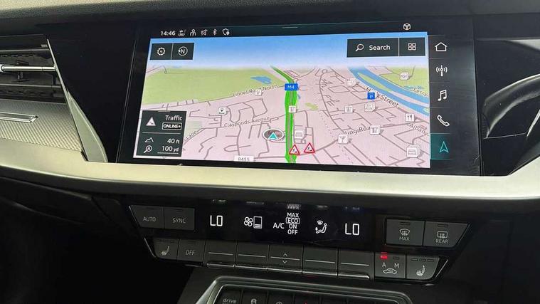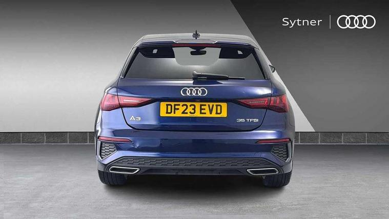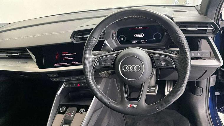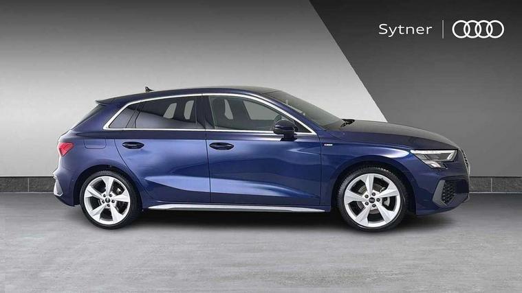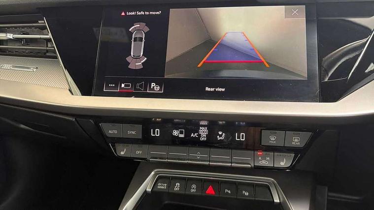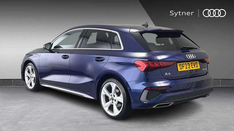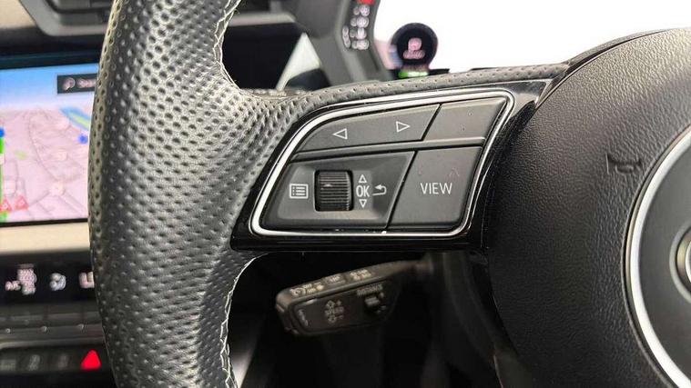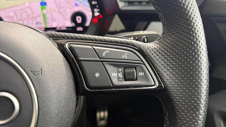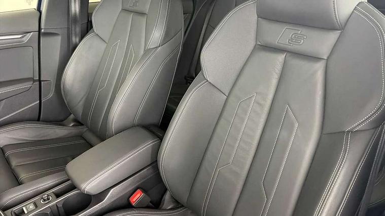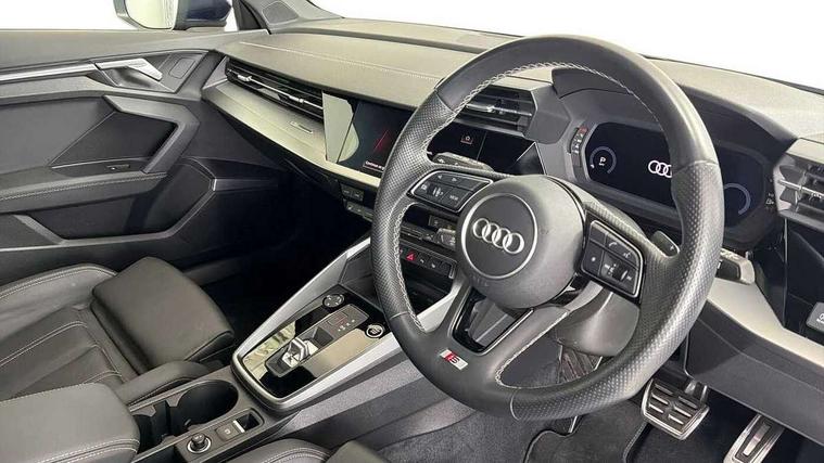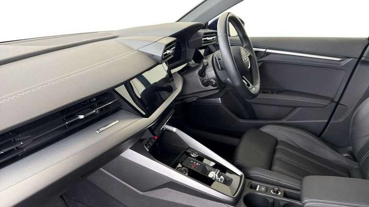 Audi drive select (Auto, Comfort, Dynamic, Efficiency and Individual), Audi smartphone interface, Audi Virtual Cockpit - 10.25" digital and colour instrument cluster, Automatic start/stop system with recuperation, Bluetooth interface, Camera based traffic sign recognition, Collision avoidance assistant, e-Call (emergency call), Electromechanical power speed sensitive steering, Lane departure warning system, MMI Navigation Plus with high resolution 10.1" colour touch screen display, Service indicator, Trip computer, Voice control system with natural language interaction, Sports suspension, 2xUSB-C connection with data and charging functions, 6 passive loudspeakers, DAB Digital radio, 3rd brake light, Acoustic glass windscreen, Aluminium window trim, Auto dimming frameless rear view mirror, Body colour exterior mirrors, Electrically adjustable/heated/folding/auto dimming door mirrors with integrated LED indications + kerb view function for passenger side, Front electric windows, Illuminated aluminium inserts front door sills with S logo, LED daytime running lights, LED headlights with LED rear lights and dynamic rear indicators, Light and rain sensors, Privacy glass - dark tinted rear window, rear door and side windows, Rear electric windows, Rear side air outlets in grained matt black, Rear side wing doors, Rear wiper, S line bumpers, S roof spoiler, 12V socket and storage compartment in front centre console, 3 seat bench in 2nd row, 3 spoke leather multifunction steering wheel with paddle shift, 4 way electrically adjustable lumbar support for driver and front passenger, 60/40 split folding rear seat bench, Black cloth headlining, Dual zone electronic climate control, Front and rear centre armrest in leather, Front and rear headrests, Front/rear floor mats, Height and reach adjustable steering wheel, Interior lighting - glove compartment light and right hand side, Luggage compartment floor covering, Manual boot compartment lid, Manually adjustable front seats, Seat side bolsters, Single front passenger seat, Stainless steel pedals and front footrest in black, Twin leather upholstery with front sports seats S embossed logo, Aluminium interior elements pack - A3 Sportback, LED interior lighting pack - A3 Sportback, S line styling pack - A3 Sportback, 3x3 point rear seat belts, Driver and front passenger airbag with passenger airbag deactivation, Electronic Stabilisation Control (ESC) including ABS, ASR and EDL, First aid kit with warning triangle and 2 safety vests, Front side airbags with head airbags and interaction airbag, Pre-sense front with pedestrian and cyclist detection, Seatbelt monitoring, Tyre pressure loss indicator, Anti theft alarm, Anti-theft wheel bolts, Electronically operated child lock, Immobiliser, Remote control central locking, Dark spectrum aluminium inlays, accent surfaces in the dashboard and centre console in platinum grey silk effect paint finish,