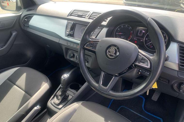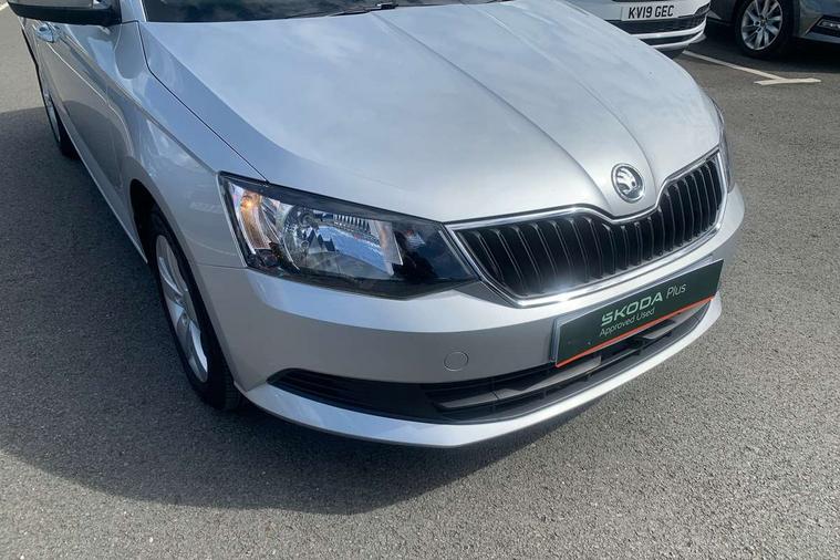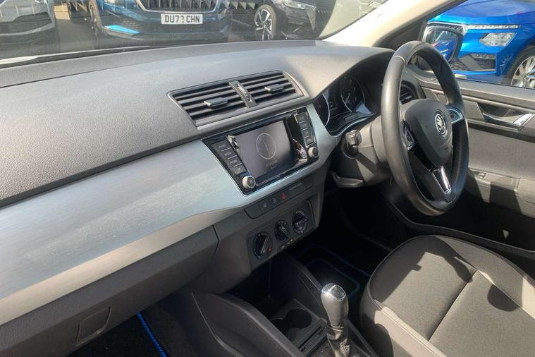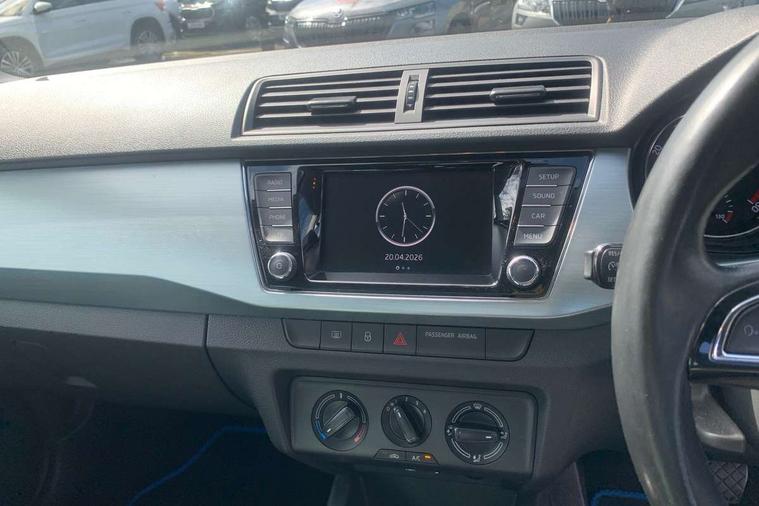 Bluetooth system, Exterior temperature gauge, Front assistant collision mitigation, Multi function trip computer, PAS, Service interval indicator, SmartLink, 6.5" touchscreen, Auxiliary socket for external MP3 player, Bolero Radio, DAB Digital radio, SD card slot, USB interface, Body colour bumpers, Body colour door handles, Chrome grille surround, Electric front windows, Electrically adjustable and heated door mirrors, Heated rear window, Height adjustable headlamps, Intermittent rear wash/wipe, Tinted rear windows, Tinted windscreen, 1.5L bottle holder in front door panels, 2 height adjustable rear headrests, 60/40 split folding rear seat, Boot stowage box, Cargo area storage tray, Driver + passenger vanity mirrors, Folding grab handles, Front reading lights, Height adjustable driver's seat, Height adjustable front headrests, Height adjustable passenger seat, Height/reach adjust steering wheel, Interior light with delay, Leather gearshift, Leather handbrake, Lower glovebox cover, Luggage load hooks, Parcel shelf, Pollen filter, Rear courtesy light, Rear storage trays, Ticket holder, Two rear outer seat isofix location points, Umbrella under front passenger seat, Arkamys surround sound pack - Fabia, Chrome Pack - Fabia, 3x3 point rear seatbelts, ABS, Curtain airbags, Driver and passenger airbags, Driver and passenger side airbags, EDS, ESC with ASR, Front seatbelt pretensioners, Hill hold control, Hydraulic Brake Assist (HBA), Motor Slip Regulation (MSR) - Engine Drag Torque Control, Passenger airbag deactivate switch, Seatbelt warning, Tyre pressure monitor, Alarm with interior monitoring, Immobiliser, Locking wheel bolts, Remote central locking,