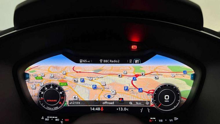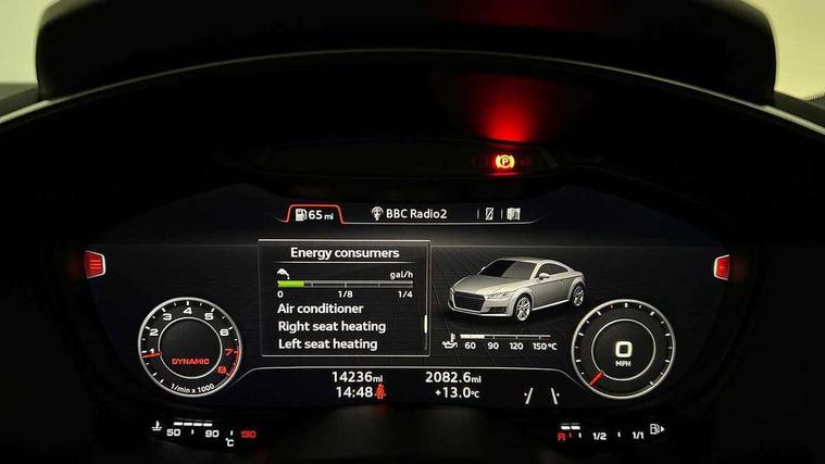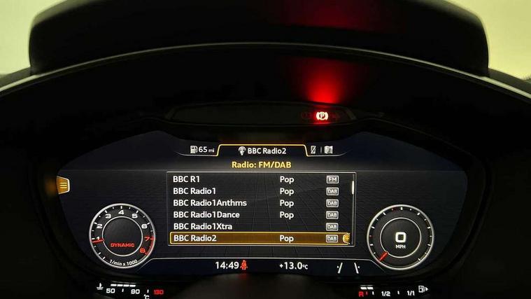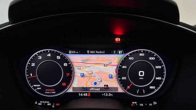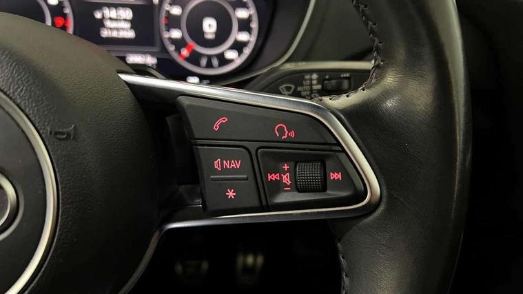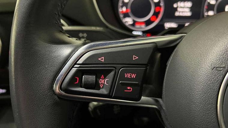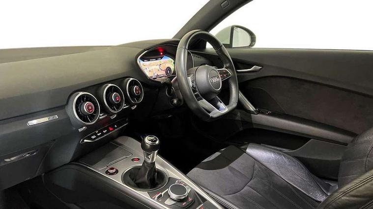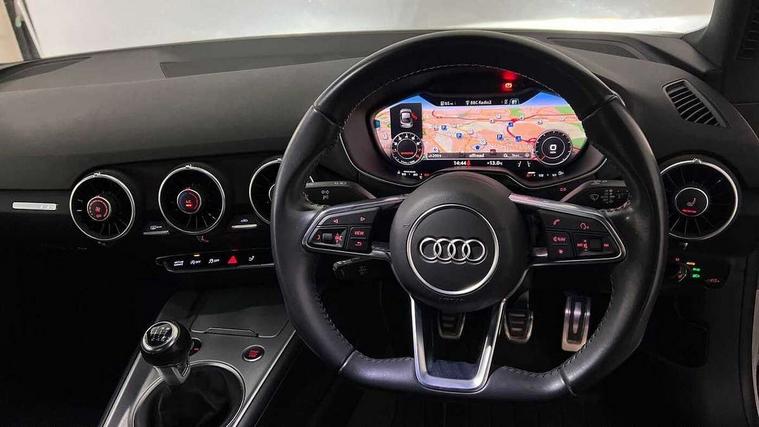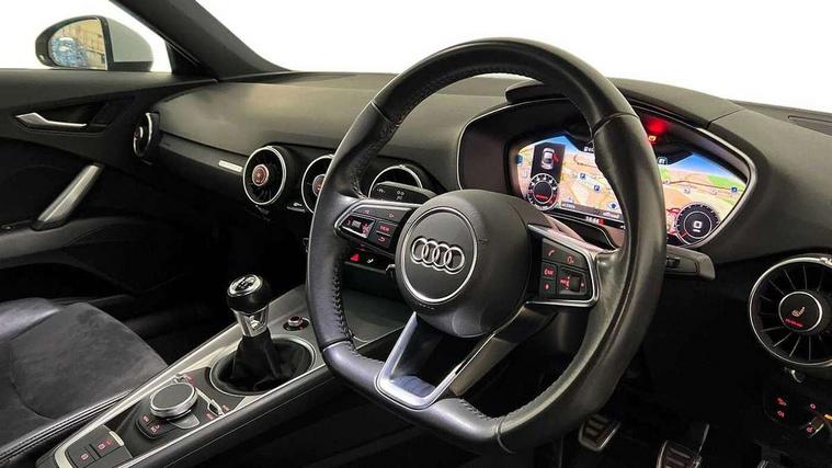 Audi active lane assist, Audi drive select with 4 Pre configured modes, Audi virtual cockpit - 12.3" high-resolution LCD display with fully customisable instrument cluster, Cruise control + speed limiter, MMI touch panel, Mobile phone preparation with bluetooth interface, Progressive power assisted steering, Rear parking sensors, Service interval indicator, Start/Stop system with energy recuperation, TP memo, Sports suspension, 8 Speakers, AM/FM radio, Audi music interface, Bluetooth audio streaming, DAB Digital radio, MMI Radio with CD player and SD/XC card slot, Auto dimming rear view mirror, Body colour bumpers, Electric front windows, Front fog lights, Green tinted heat insulating glass, Light and rain sensors, Retractable rear boot spoiler, Sunband for windscreen, Xenon headlights with LED daytime running lights with automatic headline range control + LED rear lights, brake lights and rear indicators, 12V socket, 3 spoke flat bottomed multi-function leather sport steering wheel, Alcantara/Leather upholstery includes seat centre panels, door trim inserts in black Alcantara with side bolsters, head restraints in black leather, Aluminium door sill trims, Front centre armrest, Heated front seats, Height adjustable driver's seat, Height adjustable front head restraints, Height/reach adjust steering wheel, ISOFIX child seat mounting for front passenger seat with airbag deactivation, Reading lights, Rear top tether child seat ISOFIX attachment, Split folding rear seat, Top tether anchor plate for isofix child seat, Non smoking pack - TT/TT RS, 3 point front seat belts, ABS, ASR traction control, Brake energy regeneration, Curtain airbags, Driver and front passenger airbag with front passenger airbag deactivation, EDL traction control, Electromechanical parking brake, ESP, First aid kit, Front side airbags, Head airbags, Hill hold assist, Seatbelt warning, Tyre pressure warning, Warning triangle, Anti theft alarm, Anti theft wheel bolts, Immobiliser, Keyless Go, Remote central locking, Aluminium design inlays, Tool kit, Tyre repair kit,