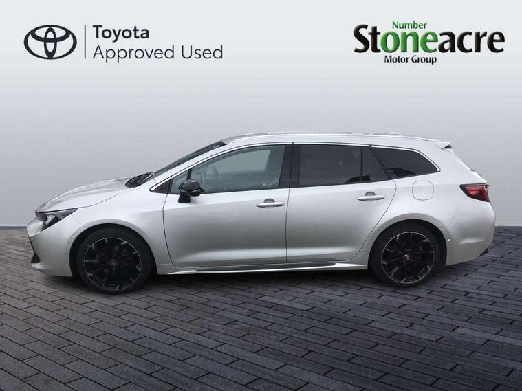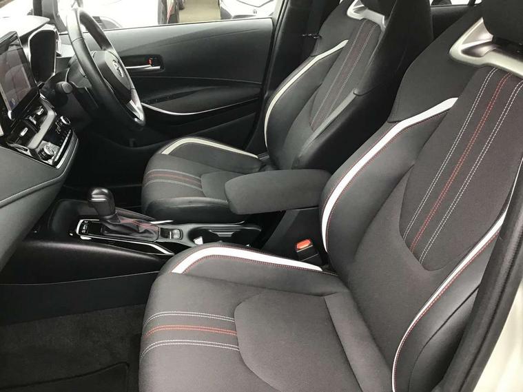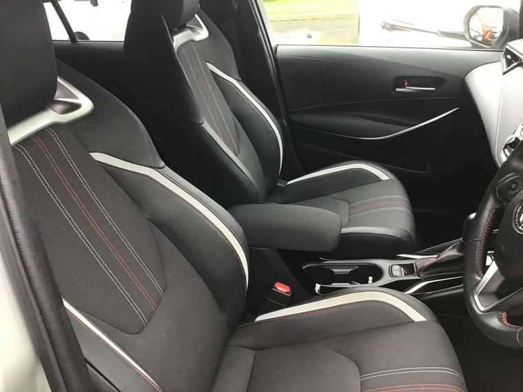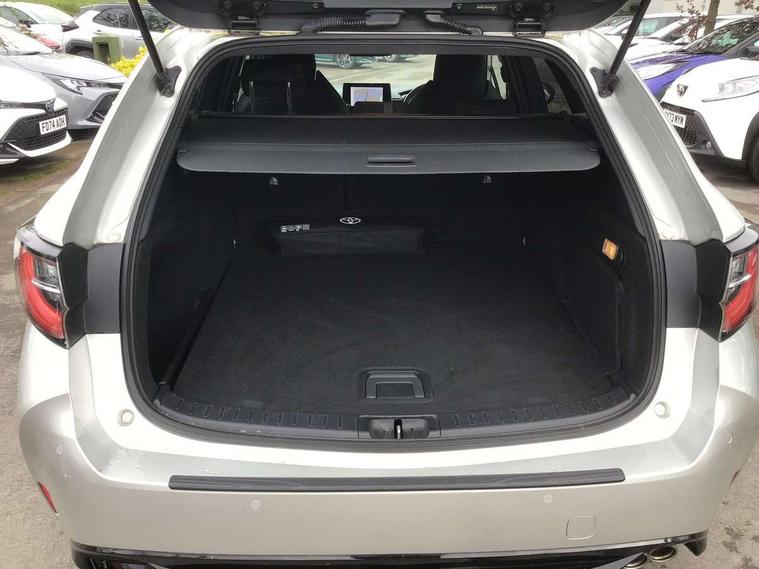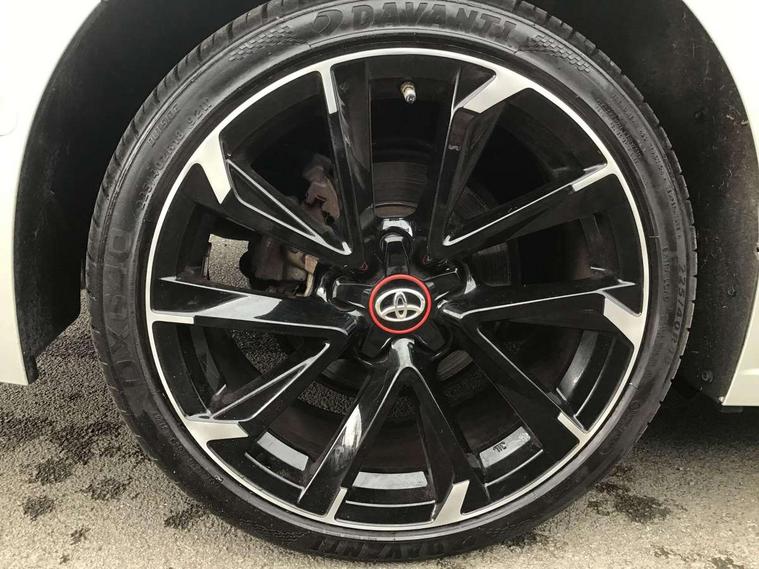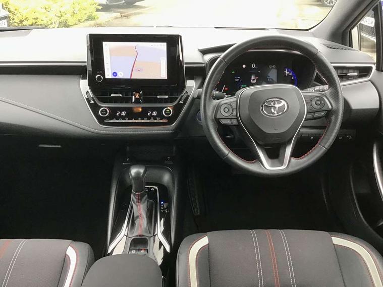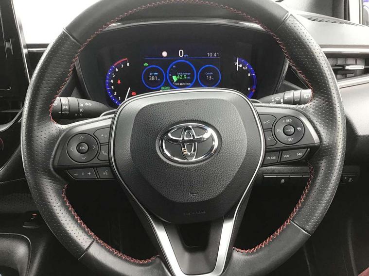 Satin chrome dash trim, Soft touch texture on uppder dashboard, Stitching on lower dashboard, Stitching on upper dashboard, Parking pack - Corolla, Toyota safety sense 2 pack - Corolla, Tyre repair kit, Unique wheel finish with red wheel cap, Acoustic vehicle alert system (AVAS), Alarm with motion sensor and immobilizer, Remote central locking + deadlocks, Smart entry, 6 speakers, 8" Touchscreen with MM19 Multimedia system and voice recognition, AM/FM radio, DAB Digital radio, Toyota touch 2 with go navigation system, USB and Aux in connectors + 12V front outlet, USB charging port in centre storage box, 3x3 point rear seatbelts, Adjustable driver and front passenger seat belt extender to top anchor point, Anti lock braking system + Electronic brake force distribution, Brake assist function, Child locks on rear doors, Downhill Assist Control (DAC), Electronic parking brake, Emergency brake light signal (EBS), Front passenger airbag on/off switch, Front seatbelt reminder, HAC-Hill-start Assist Control, Rear seat belt reminder, Seatbelt pretensioners and force limiters, Supplemental restraint system (SRS) 7 airbags - dual driver, dual side curtain, side impact and driver knee airbags, Traction control, Tyre pressure warning system, Anti-jam protection on power windows, Auto dimming inside rear view mirror, Auto up and down function on all power windows, Automatic folding mirrors, Automatic headlights with high beam assist, Black toyota logo in front, Body colour rear spoiler, Body coloured bumpers, Body coloured door mirrors, Body coloured outside door handles, Dark chrome aluminium roof rails, Follow me home headlights, GR sport scuff plates, LED daytime running lights, LED front fog lights, LED Headlights, LED High mounted stop light, LED rear combi lights with LED lightguide, Noise reduction layer on front windows, Piano black surround on lower front grille with dark chrome mesh effect, Power adjustable heated door mirrors, Power front windows, Power rear windows, Privacy glass, Rain sensing wipers, Rear side wing doors, Rear window defogger, Rear window wiper, Reverse tilting door mirrors, Shark fin antenna, Time adjustment on intermittent wiper, Turning signal integrated indicators in door mirrors, Unique lower skirt, Unique side rocker with black insert, UV-filter on driver and passenger windows, 12v power outlet - luggage side, 3 rear headrests, 3 seat bench in 2nd row, 3 spoke leather steering wheel + gear knob, 60/40 split folding rear seat, Adjustable speed limiter switch on steering wheel, Alcantara/partial leather upholstery, Audio, multimedia and telephone switches on steering wheel, Boot light, Boot underfloor storage, Clean air filter, Driver and front passenger personal light, Driver and passenger assist grip, Driver and passenger seatback pockets, Driver and passenger sun visor with mirror and light, Dual sided deck board in boot, Dual zone automatic air conditioning with ECO mode switch, Fabric armrests, Front and rear cup and bottle holders, Front and rear door pockets, Front head restraints, Front passenger seat, Heated driver and front passenger seats, Illuminated entry system in room lamp, ISOFIX seat fixing (2 fixings on rear outer seats), Leather gear shift with satin chrome on gear shift console, Luggage utility boot rails, Manual height adjustable for driver and front passenger seat, Paddle shifts, Pollen filter, Power adjustable lumbar support on driver seat, Power window switches with satin chrome inserts, Rear armrest with 2 cupholders, Rear passenger air vents, Rear passenger coat hooks (2), Rear passenger personal lights, Retractable tonneau cover with luggage partition net, Satin chrome inside door handles, Shopping bag hooks in luggage compartment, Sliding armrest on centre console box, Slow opening glovebox with lights, Sports seats, Tilt/telescopic steering column, Tonneau cover with under floor storage, Voice recognition switch on steering wheel, Whiplash Injury Lessening (WIL) feature (active headrest) for seats, 7" Multi information display screen, Bluetooth telephone connectivity, Connected car functionality upgrade, tracker, remote status and e-care, Dynamic radar cruise control (with RSA) including switch on steering wheel, E-call, Electrically assisted power steering, EV drive indicator, Head up Display, Intelligent park assist, Lane Departure Alert (LDA) switch on steering wheel, Memory on adjustable speed limiter, Push button start, Reversing camera, Smartphone integration with Apple CarPlay and Android auto, Gasoline particulate filter, Vehicle Stability Control (VSC),