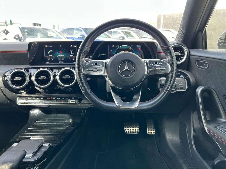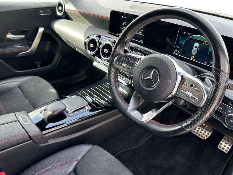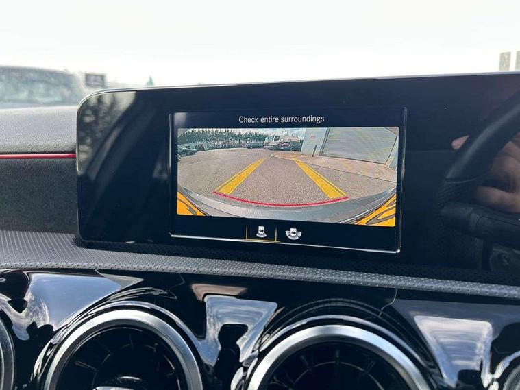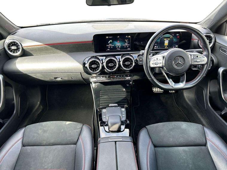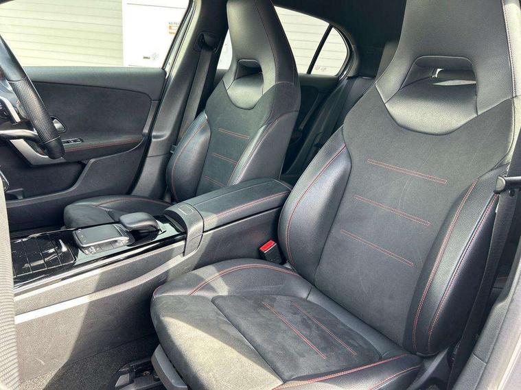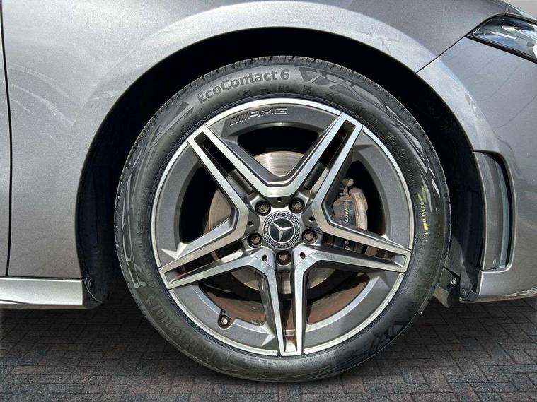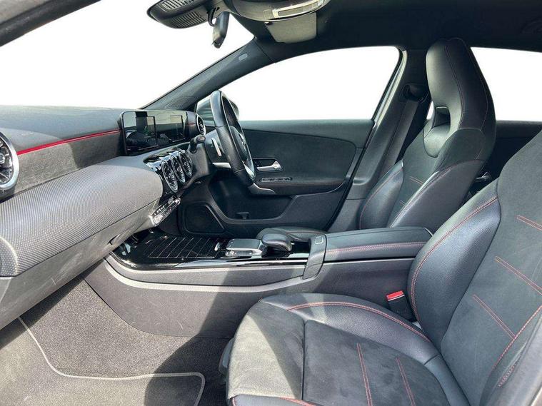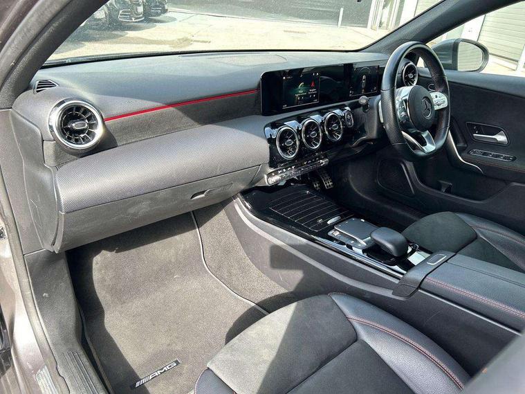 180 degree rear view camera with parking guidelines, 7" colour screen in instrument panel, 7" touchscreen media display, Attention assist, Brake pad wear indicator warning light, Car wash mode, Cruise control + speed limiter, Direct steering, Dual bluetooth interfaces, DYNAMIC SELECT with a choice of driving modes (ECO, Comfort, Sport and Individual), ECO start/stop function, Fluid level warning indicator for fuel, oil, coolant and washer fluid, Hard-disk navigation, Hey Mercedes Voice activation, Lamp failure indicator, Mercedes me connect including emergency call system, accident recovery, breakdown management and maintenance, Mercedes me remote services, Outside temperature gauge, Owners manual in English, Pre-installation for car sharing, Preinstallation for Mercedes Benz link, Service indicator (ASSYST), Speed sensitive power steering, Trip computer, Lowered comfort suspension, Rear axle torsion beam, 2 USB ports (type C) in rear stowage compartment and one in front of center console, 6 speakers, DAB Digital radio, MBUX multimedia system with DAB digital radio and touchpad including satellite navigation, Mercedes-Benz sound system - 100W, 4 Electric Front and Rear windows, Adaptive brake lights, AMG bodystyling - Front apron with splitter in chrome, rear apron with chrome trim and chrome visible trim elements in tailpipe, Black weather strip, Body colour bumpers, Body colour door handles, Body colour side skirt, Body coloured door mirrors, Chrome beltline trim, Diamond radiator grille with chrome pins and silver louvre + chrome insert, Electric adjustable and heated door mirrors with integrated LED side indicators, Exhaust system - Twin visible tailpipes in polished stainless steel, Headlamp assist automatic headlamp activation, Heated glass rear windscreen + timer control, LED high performance headlamps with integrated LED daytime running lights, LED tail lamp, LED third brake light, Privacy glass, Radio aerial, Rain sensing windscreen wipers with two sensitivity settings, Rear fog lights, Rear wiper, Window line trim strip in chrome, 3 Spoke flat bottom leather multi function steering wheel with perforated leather in grip area, 40:20:40 split folding rear seats, Artico man-made leather/Microfibre Dinamica upholstery with red contrast stitching, Auto Mercedes-Benz child seat recognition sensor, Black air vents with surround in silver chrome, Black roof lining, Brushed stainless steel sports pedals with rubber studs, Controller on centre console with chrome surround, Floor mats with stitched edging and AMG lettering, Front centre armrest with storage compartment, Front door sills with Mercedes Benz lettering, Front seat backs luggage nets, Front seat cushion length adjustment, Galvanished gear shift paddles on steering wheel, Heated front seats, Height/reach adjustable steering column, Interior mirror with reading lamps in black and frameless, ISOFIX and top tether child seat fixing points in two outer rear seats, Manual height adjustable front seats, Rear head restraints, Seat occupancy sensor for front passenger seat, Sports seats with integrated headrests, Stowage compartment in centre console with retractable cover, Sunvisors with illuminated vanity mirrors, Touchpad on center console, Twin front cupholders, Two zone thermotronic luxury automatic climate control, Light and sight pack - A Class, Seat comfort pack - A Class, 3 rear 3 point seatbelts, ABS with Brake Assist, Active bonnet, Active brake assist includes forward collision warning system with autonomous braking, Adaptive brake assist with hold function and hill start assist, Black seatbelts, Childproof locks manually operated for rear doors and electrically operated for rear power windows, Crash responsive emergency lighting, Driver and passenger head and side airbags, Drivers knee airbag, Dual stage driver/passenger airbags, Electronic parking brake, ESP curve dynamic assist, ESP with ASR, Front and rear seatbelt reminder, Front brake callipers with Mercedes Benz lettering, Tyre pressure monitoring system, Warning triangle and first aid kit, Window airbags, Alarm system/interior protection/immobiliser, Keyless Go, Remote central locking and crash sensor with emergency opening function, Urban guard vehicle protection system with immobiliser and interior protection, Dinamica microfibre trim in black, 18" AMG 5 twin spoke light alloy wheels in titanium grey with highsheen finish, Summer tyres, Tirefit sealant kit,