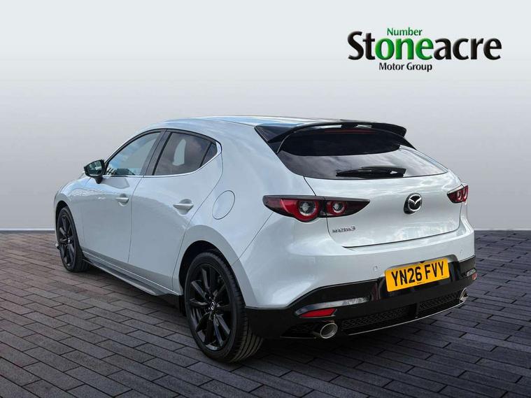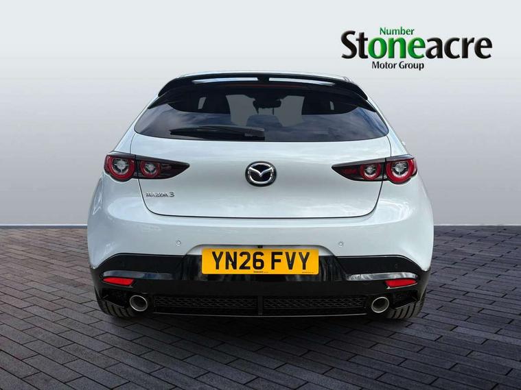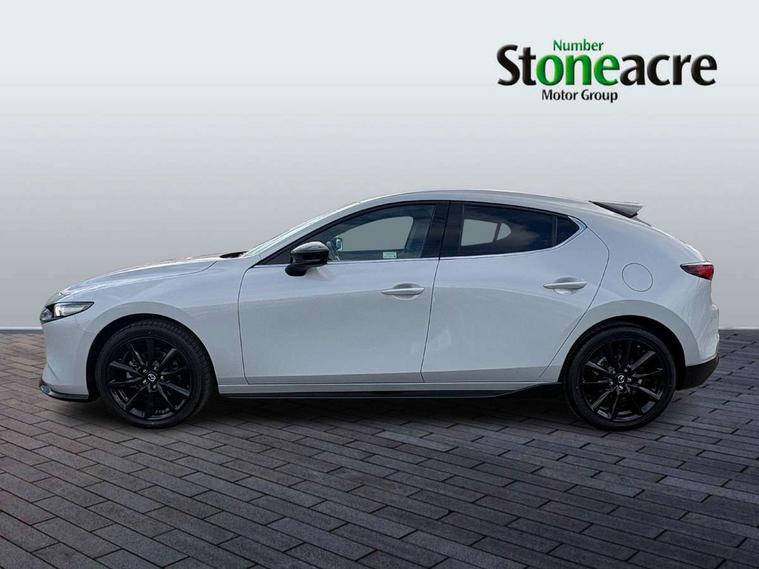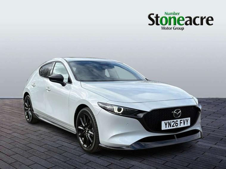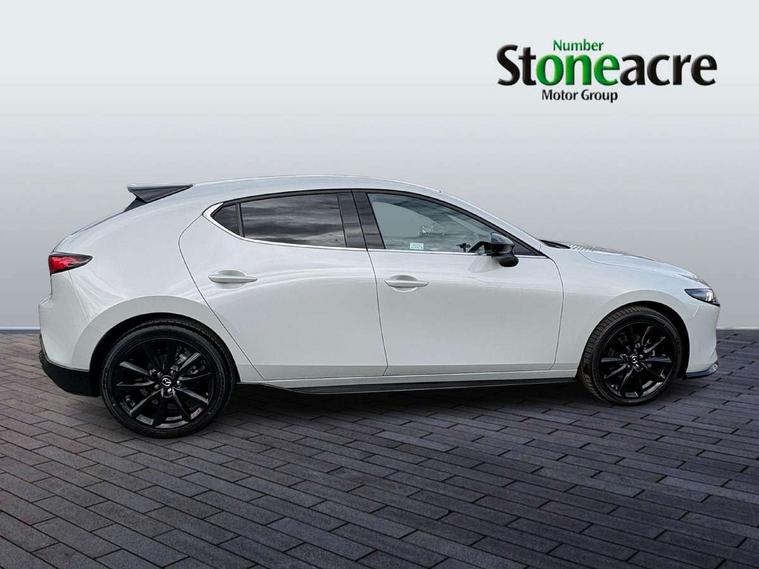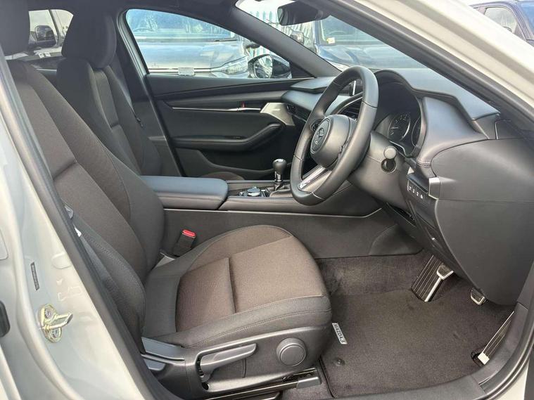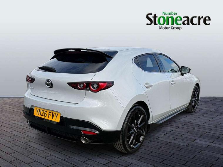 10.25" display with Mazda Connect infotainment, 7" colour TFT display, Adjustable speed limiter, Advanced E-call with GPS, Alexa in-car voice assistant, Audio transfer from bluetooth devices, Blind spot monitoring with rear cross traffic alert, Car finder, Colour active driving display inc Windscreen projected, Traffic Sign Recognition, turn-by- turn navigation and Mazda Radar Cruise Control information, Digital instrument cluster, Driver attention alert system, Emergency stop signalling system, Engine start/stop button, Front and rear parking sensor with audible and visual warning, Head up Display, Integrated bluetooth with steering wheel mounted controls, Intelligent speed assist, Lane keep assist system (LAS) with Lane departure warning system (LDWS), Mazda connected services, Mazda Navigation System with european mapping, Mazda Radar Cruise Control, Mobile App interface, Multimedia Commander, PAS, Qi wireless charging, Reversing camera, Service indicator, Tailgate, Traffic sign recognition (TSR), Trip computer, Wireless Apple CarPlay/Android Auto, i-stop, 2 USB-C ports in the front, Mazda Multimedia System with AM / FM / DAB radio with 12 Speaker Bose sound system, bose centerpoint, bassmatch+audiopilot technology, Adaptive LED Headlights, Auto dimming driver's door mirrors, B-pillar garnish in piano black, Body coloured door mirrors, Coming/leaving home lighting function, Dark metallic finish signature wing, Dual chrome tailpipes tip, Dusk sensing headlights, Electric front/rear windows with one touch/auto up/down, Electrically adjustable, heated auto power folding door mirrors, Frameless auto dimming interior rear view mirror, Front body coloured bumper with black lower bezel, Front kodo turn signal, Gloss black finish front grille, Gloss black rear roof spoiler, LED auto headlight levelling, LED indicator lights, LED third brake light, Power tilt and slide sunroof, Privacy glass with dark tinting on rear side windows and rear window, Rain sensing front wipers with adjustable sensitivity and speed, Rear colour coded bumper with gloss black lower moulding, Rear fog lights, Rear side wing doors, Signature LED daytime running lights, Signature LED rear combination lights, Speed adjustable rear wash wiper with intermittent wipe, 12v electrical power outlet, 3 seat bench in 2nd row, 60/40 split fold down rear seats, Chrome interior trim accents with steering wheel centre bezel, surround of engine start / stop button and glove box handle, Cloth upholstery, Dark cloth door panel inserts, Dark roof headlining, ceiling and pillars, Driver seat manual slide, recline, height and seat tilt adjust, Driver, front passenger and two rear door pockets, Driver, Front passenger and two rear grab handles with coathooks, Driver/passenger sunvisors + vanity mirrors (drivers side with ticket holder), Dual zone climate control air conditioning, Folding rear centre armrest with two cup holders, Front and rear courtesy lamps, Front armrest, Front centre storage with two cupholders, Front head restraints, Front passenger seatback pocket, Front passengers seat manual slide, recline and height adjustment, Gear shift indicator, Heated front seats with 3 stage setting, Illuminated glovebox, Interior colouration dashboard and doorcards in black with dark stitching, ISOFIX child seat anchorage points attached on outer rear seats, Leather wrapped gear shift knob, Leather wrapped steering wheel, LED interior light, LED light in luggage compartment, Power outlet in luggage compartment, Roof mounted sunglasses holder, Single front passenger seat, Three height adjustable rear head restraints, Tilt/height adjustable steering wheel, 3 point ELR front seatbelts with pretensioners, 3 rear 3 point seatbelts with ELR, Anti-lock braking system (ABS), Drivers knee airbag, DSC - Dynamic Stability Control, Dual stage driver and single stage passenger airbags, EBD - Electronic brakeforce distribution, Electronic parking brake with auto disengage function and auto hold function, Front and rear curtain airbags, Front passenger airbag cut-off switch, Front side airbags, Front smart city brake support, G-Vectoring control plus, Hill launch assist, Intelligent Traction Control system, Manual child lock in rear doors, Mild Hybrid system with regenerative braking, Seatbelt reminder audible warning for driver, passenger and rear seats, Tyre pressure monitoring system (TPMS), Auto door lock when driving, Remote central locking + deadlocks, Smart keyless entry, Thatcham accredited alarm and immobiliser, 18" Black alloy wheels, Emergency tyre repair kit,