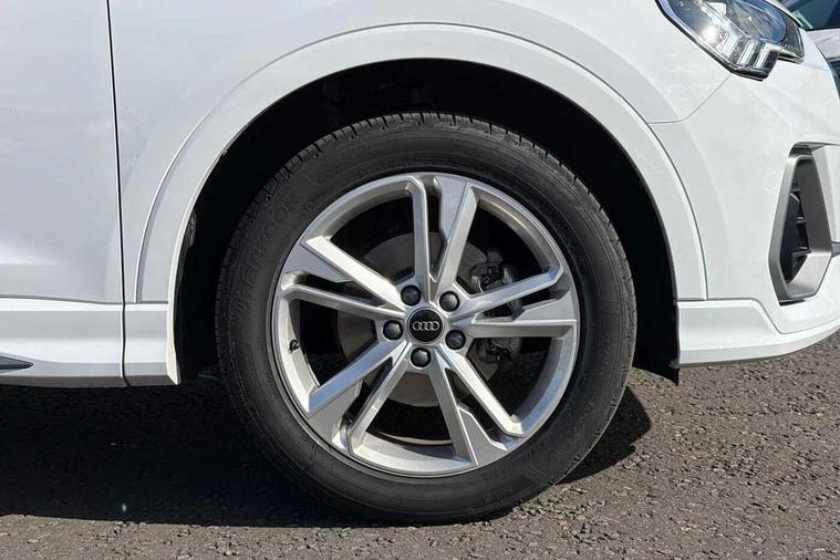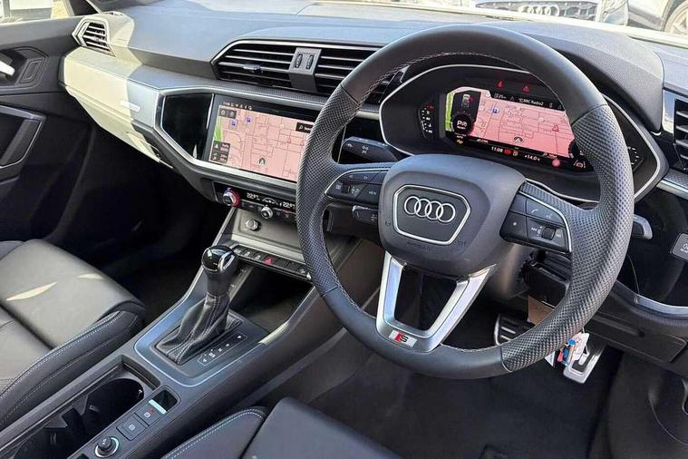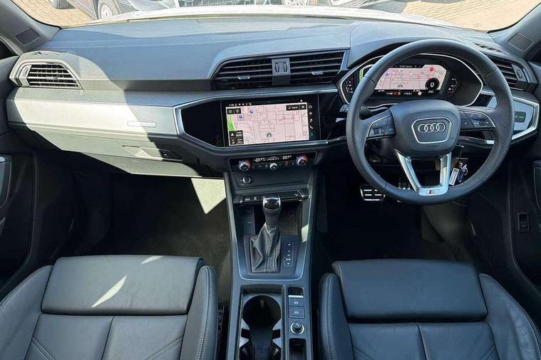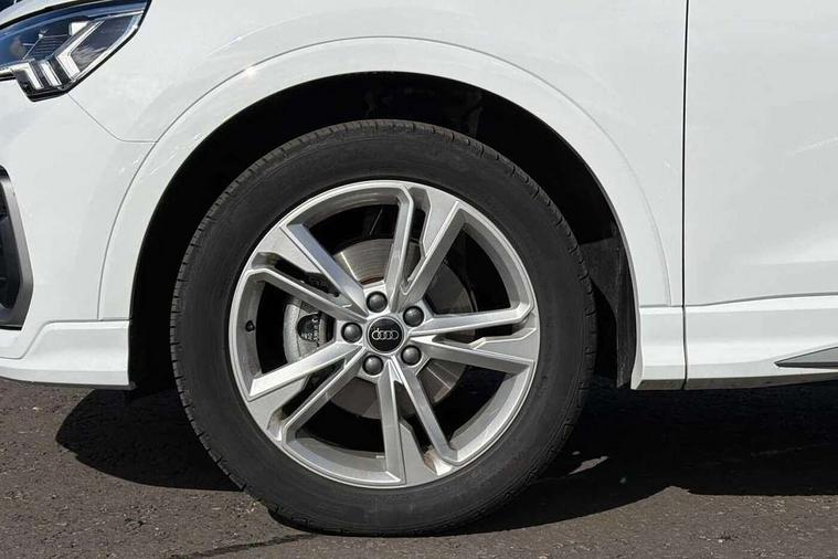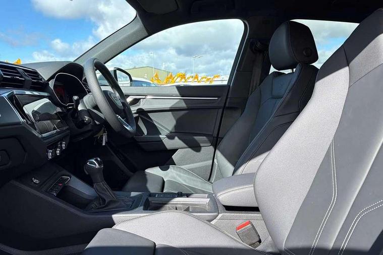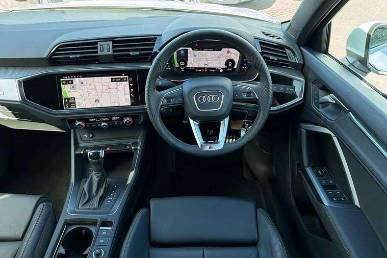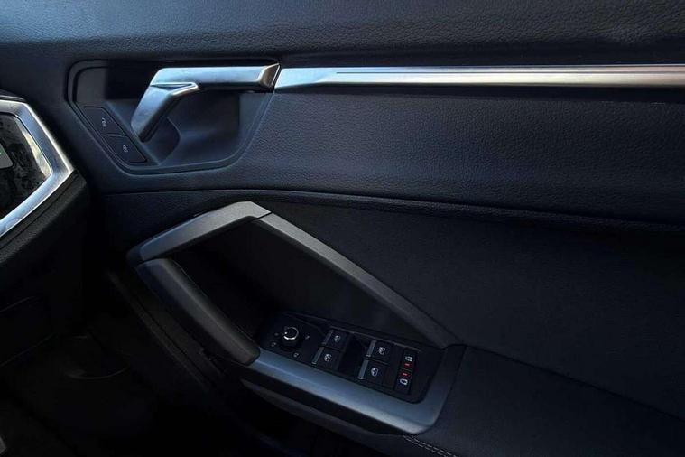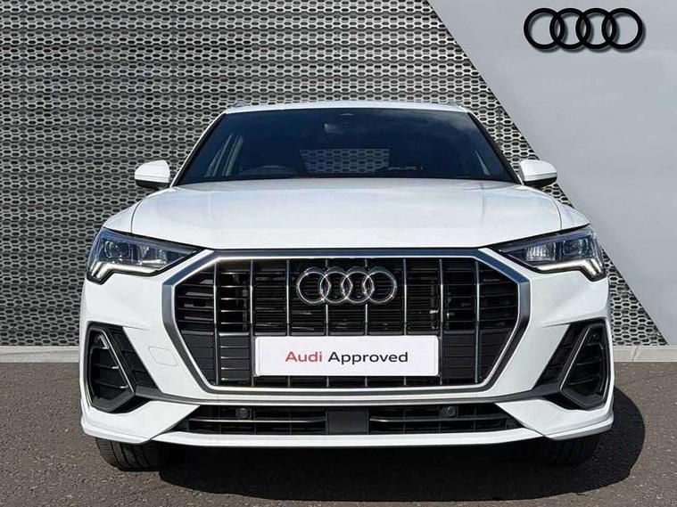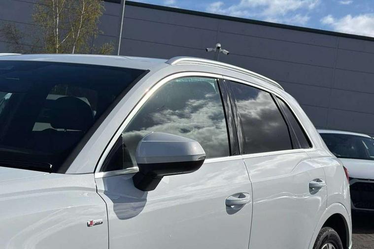 Amazon alexa Integration, Audi connect safety and service, Audi drive select, Audi lane departure warning, Audi Virtual Cockpit - 10.25" display, Bluetooth interface, Camera based traffic sign recognition, Distraction and Fatigue warning, Legal emergency call, MMI Navigation Plus with high resolution 10.1 inch touchscreen colour display, Power operated tailgate, Progressive steering, Service interval indicator, Smartphone interface includes wireless Apple carplay/Android Auto, Start stop system with recuperation, Voice control system with natural language interaction, Sports suspension, 2 USB-C ports with charge and data functions, 6 passive loudspeakers, DAB digital radio module, Acoustic windscreen, Aluminium roof rails, Aluminium window trim, Anthracite black radiator grille, Auto dimming door mirrors, Auto dimming frameless rear view mirror, Body colour front spoiler blade, Electrically folding, adjustable and heated door mirrors with integrated LED side indicators and kerb view function for passenger side, Front and rear electric windows, Front fog lights, Front side air inlets in matt platinum grey, Grille vertical bars in aluminium silver/Matt, High gloss black finish B and C pillars, LED Dynamic rear indicators, LED headlights with LED daytime running lights, LED rear lights, LED third brake light, Privacy glass dark tinted rear and rear-side windows (from B-pillar backwards), Rain and light sensors, Rear diffuser grille in grained matt black, Rear diffuser strip in matt anthracite black, Rear side wing doors, Rear wiper, S line badges on front wings, S Line front and rear bumpers and side skirts, Side skirt insert in matt Platinium grey, Variable front intermittent wipers, 12V socket in rear centre console, 3 seat bench in 2nd row, 3 spoke leather multifunction steering wheel features S badging and grips in perforated leather with contrast stitching, 40:20:40 folding with manual adjustment for 60:40 forwards/backwards position and backrest angle, Adjustable rear seat bench/backrest with centre armrest and cupholder, Black carpet mats, Black cloth headlining, Dual zone electronic climate control, Electric lumbar support, Front and rear black floor mats with contrast stitching in rock grey, Front and rear headrests, Front centre armrest, Height and reach adjustable steering wheel, Horizontal trim strip in matt platinum grey, Illuminated door sill trims with S logo, ISOFIX child seat mounting for front passenger with airbag deactivation and outer rear seat including top tether attachment point for outer rear seats, Luggage compartment sill protection in stainless steel, Manual front seats with height adjustment, Perforated leather gearknob, Single front passenger seat, Stainless steel pedals, Twin leather upholstery with front sport seats + S embossing, Non smoking pack - Q3, 3x3 point rear seatbelts, 6 airbags - Driver, front passenger, curtain and side windows, Audi pre-sense front with pedestrain and cyclist recognition, Electrically operated child locks on rear doors, Electromechanical parking brake, Electronic stabilisation control including ABS, ASR and EDL, Front seatbelt reminder, Hill descent control, Hill hold assist, Pre sense basic, Seatbelt monitoring, Tyre pressure warning, Warning triangle and first aid kit, Anti theft wheel bolts, Immobiliser, Remote central locking, Thatcham approved category 1 anti theft alarm, Aluminium look interior elements, Dark matt brushed aluminium inlay, Detail dashboard around MMI touch colour display in glass look, black with surround in aluminium look, Leatherette door armrest,