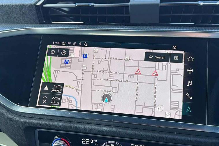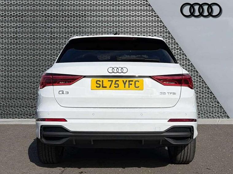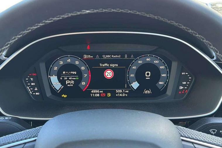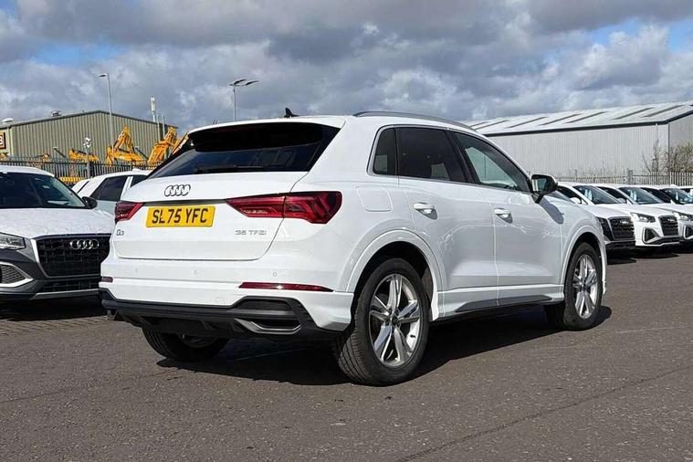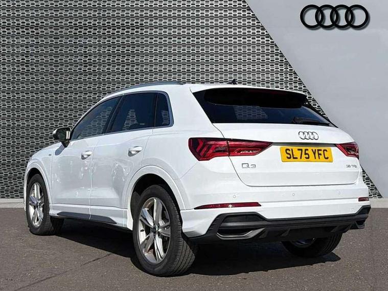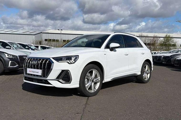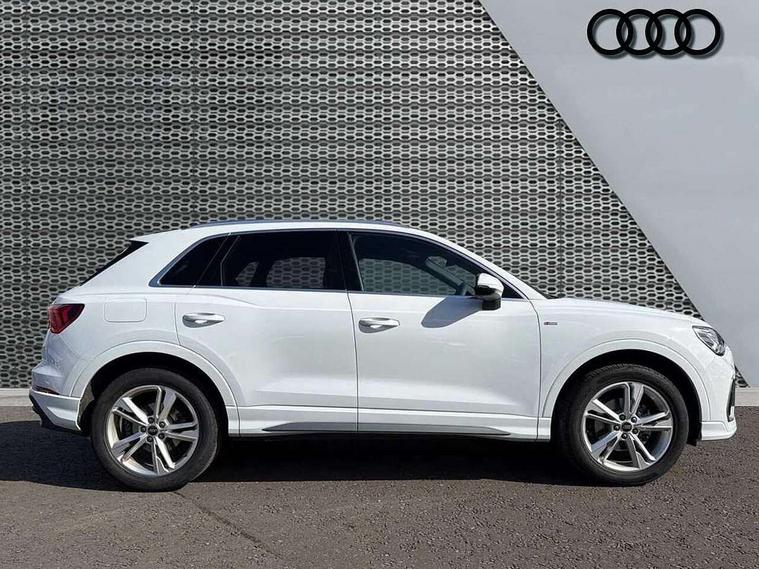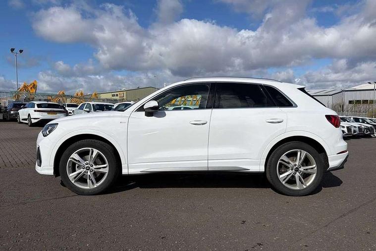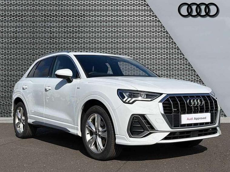 Amazon alexa Integration, Audi connect safety and service, Audi drive select, Audi lane departure warning, Audi Virtual Cockpit - 10.25" display, Bluetooth interface, Camera based traffic sign recognition, Distraction and Fatigue warning, Legal emergency call, MMI Navigation Plus with high resolution 10.1 inch touchscreen colour display, Power operated tailgate, Progressive steering, Service interval indicator, Smartphone interface includes wireless Apple carplay/Android Auto, Start stop system with recuperation, Voice control system with natural language interaction, Sports suspension, 2 USB-C ports with charge and data functions, 6 passive loudspeakers, DAB digital radio module, Acoustic windscreen, Aluminium roof rails, Aluminium window trim, Anthracite black radiator grille, Auto dimming door mirrors, Auto dimming frameless rear view mirror, Body colour front spoiler blade, Electrically folding, adjustable and heated door mirrors with integrated LED side indicators and kerb view function for passenger side, Front and rear electric windows, Front fog lights, Front side air inlets in matt platinum grey, Grille vertical bars in aluminium silver/Matt, High gloss black finish B and C pillars, LED Dynamic rear indicators, LED headlights with LED daytime running lights, LED rear lights, LED third brake light, Privacy glass dark tinted rear and rear-side windows (from B-pillar backwards), Rain and light sensors, Rear diffuser grille in grained matt black, Rear diffuser strip in matt anthracite black, Rear side wing doors, Rear wiper, S line badges on front wings, S Line front and rear bumpers and side skirts, Side skirt insert in matt Platinium grey, Variable front intermittent wipers, 12V socket in rear centre console, 3 seat bench in 2nd row, 3 spoke leather multifunction steering wheel features S badging and grips in perforated leather with contrast stitching, 40:20:40 folding with manual adjustment for 60:40 forwards/backwards position and backrest angle, Adjustable rear seat bench/backrest with centre armrest and cupholder, Black carpet mats, Black cloth headlining, Dual zone electronic climate control, Electric lumbar support, Front and rear black floor mats with contrast stitching in rock grey, Front and rear headrests, Front centre armrest, Height and reach adjustable steering wheel, Horizontal trim strip in matt platinum grey, Illuminated door sill trims with S logo, ISOFIX child seat mounting for front passenger with airbag deactivation and outer rear seat including top tether attachment point for outer rear seats, Luggage compartment sill protection in stainless steel, Manual front seats with height adjustment, Perforated leather gearknob, Single front passenger seat, Stainless steel pedals, Twin leather upholstery with front sport seats + S embossing, Non smoking pack - Q3, 3x3 point rear seatbelts, 6 airbags - Driver, front passenger, curtain and side windows, Audi pre-sense front with pedestrain and cyclist recognition, Electrically operated child locks on rear doors, Electromechanical parking brake, Electronic stabilisation control including ABS, ASR and EDL, Front seatbelt reminder, Hill descent control, Hill hold assist, Pre sense basic, Seatbelt monitoring, Tyre pressure warning, Warning triangle and first aid kit, Anti theft wheel bolts, Immobiliser, Remote central locking, Thatcham approved category 1 anti theft alarm, Aluminium look interior elements, Dark matt brushed aluminium inlay, Detail dashboard around MMI touch colour display in glass look, black with surround in aluminium look, Leatherette door armrest,