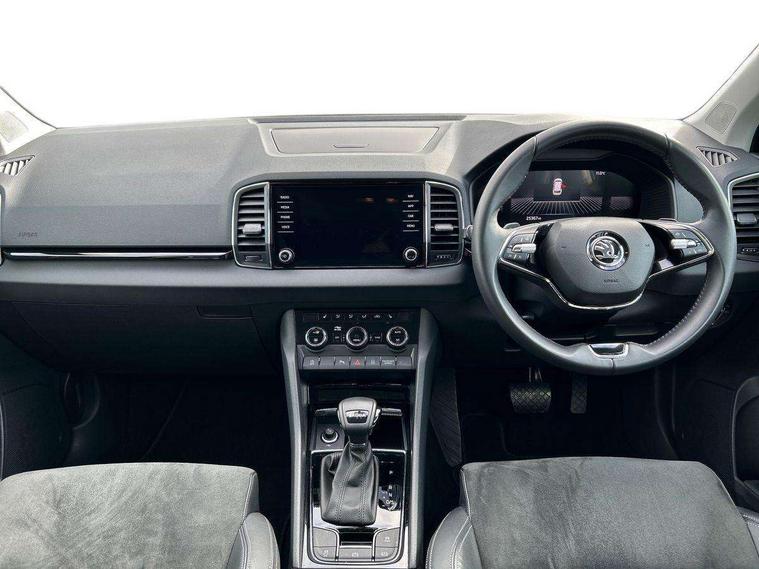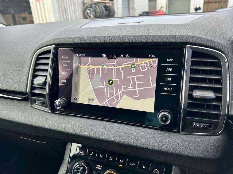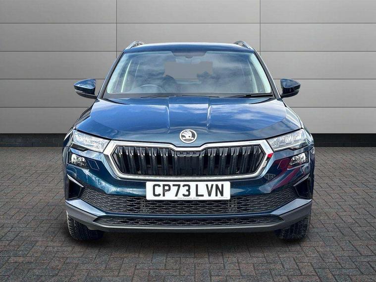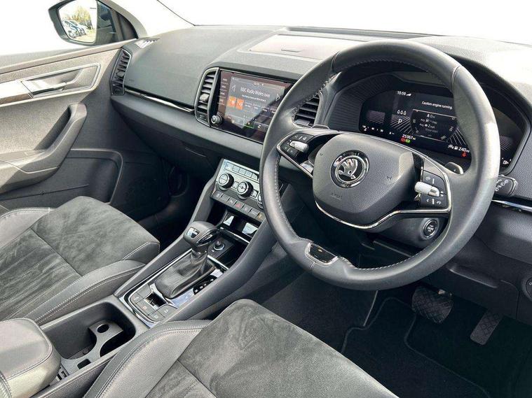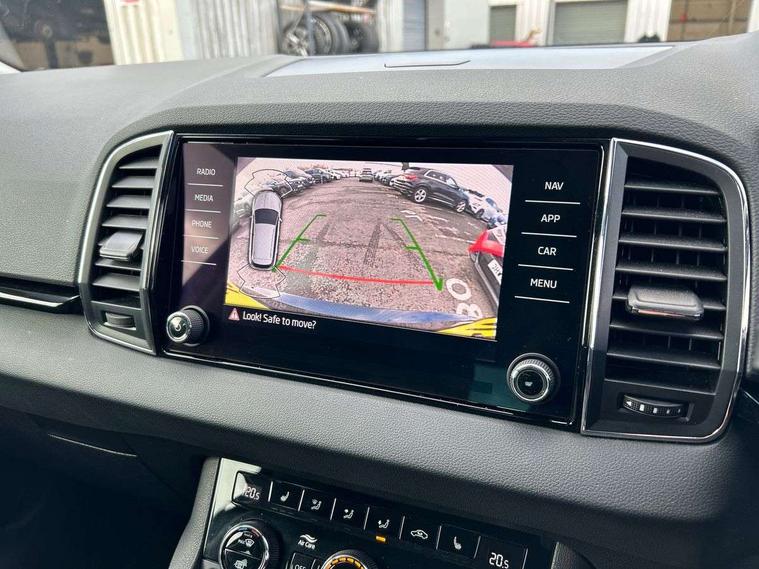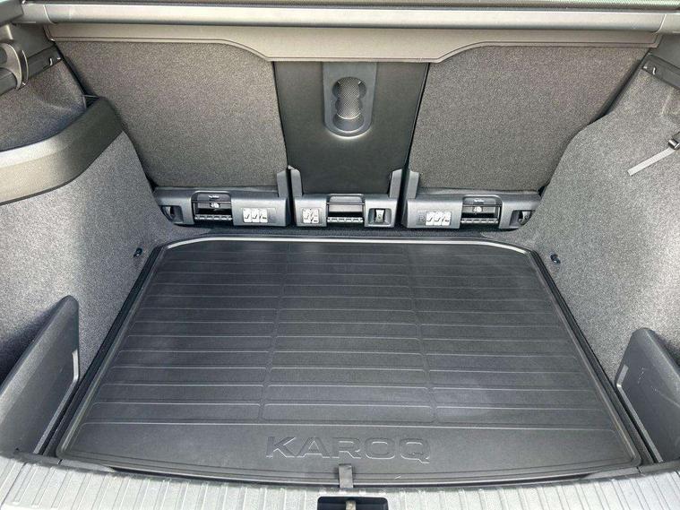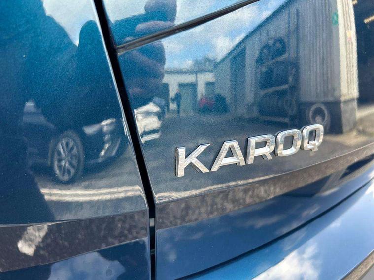 8" Digital display, Care connect, Driver fatigue sensor, Emergency services call system, Outside temperature gauge, Service interval indicator, SmartLink wireless for Apple and wired for Android, Start/stop system with regenerative braking, USB C Port x 2 in front centre console, 8 Speakers, DAB radio with Bluetooth, USB connection, Acoustic glass, Aero front windscreen wipers with intermittent function, Auto dimming rear view mirror with light and rain sensors, Black electric window control buttons, Body colour door mirrors and handles, Dynamic headlight range control with cornering light function, Electric front and rear windows with child proof lock, Heated rear windscreen, LED daytime running lights, LED rear lights with high functionality welcome effect and dynamic indicators, Light assistant (coming/leaving home/tunnel light), Plastic scuff plates, Privacy glass, Rear side wing doors, Rear spoiler, Rear window wiper with washer system and intermittent control, Safety reflectors on front doors, 1.5 litre bottle holders in driver and front passenger door panels, 12V socket in boot, 12v socket in front centre armrest with storage compartment and rear air vents, 2 spoke leather heated multifunction steering wheel with DSG paddles, 2 x Tablet holder, 3 rear height adjustable headrests, 3 seat bench in 2nd row, 4 foldable roof handles with rear coat hooks, Black floor carpet, Chrome inner door handles, Double sided boot floor, Foldable hooks in the boot, Front head restraints, Height adjustable front three point seats belts with tensioners, Height/reach adjust steering wheel, Ice scraper, Illuminated glovebox, Illuminated luggage compartment, Isofix child seat preparation for front passenger seat, Isofix child seat preparation outer rear, Manual lumbar support for front seats, Pen holder, Pollen filter, Rear boot cover, Rear reading lights, Rubbish bin door, Safety vest holder, Single front passenger seat, Storage box in upper central dashboard closed, Sunvisors with illuminated vanity mirrors, Textile floor mats, Ticket holder, VarioFlex seats with standard rear seat release, Boot pack - Karoq, Design Pack - Karoq, Parking pack - Karoq, Automatic door unlocking in case of crash, Automatic fuel cut off in case of crash, Child locks on rear doors, Driver airbag, Electronic parking brake with auto hold function, Emergency rear braking signal, ESC including ABS, MSR, ASR, EDS, HBA, DSR, RBS, MKB and traction control, Front side airbags, Hill hold control, Knee airbags, Passenger airbag with switch-off function, Pedestrian monitor, Seatbelt reminder signalisation and pretensioner for all seats, Three point seatbelts rear, Two tone horn, Tyre pressure display, Tyre pressure monitor, Alarm with interior monitoring, back up horn and tilt sensor with safe function, Electronic engine immobiliser, Keyless entry and start/stop, Remote central locking with 2 remote folding keys, Chrome framed air vents, 18" Miran alloy wheels in black, Anti-theft wheel bolts protection, Tool kit,