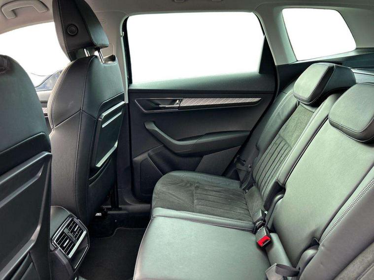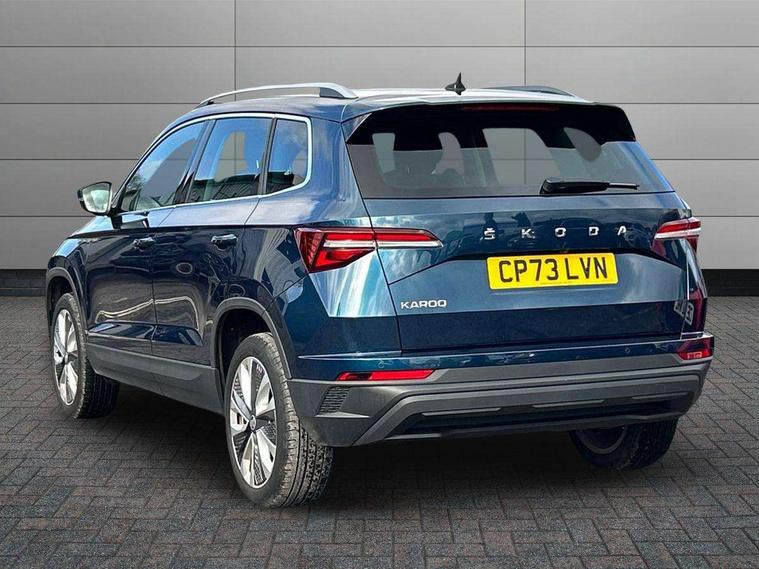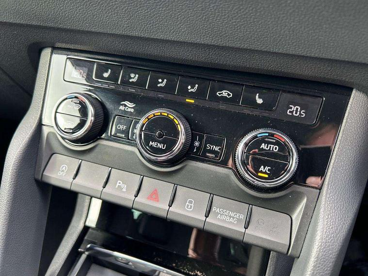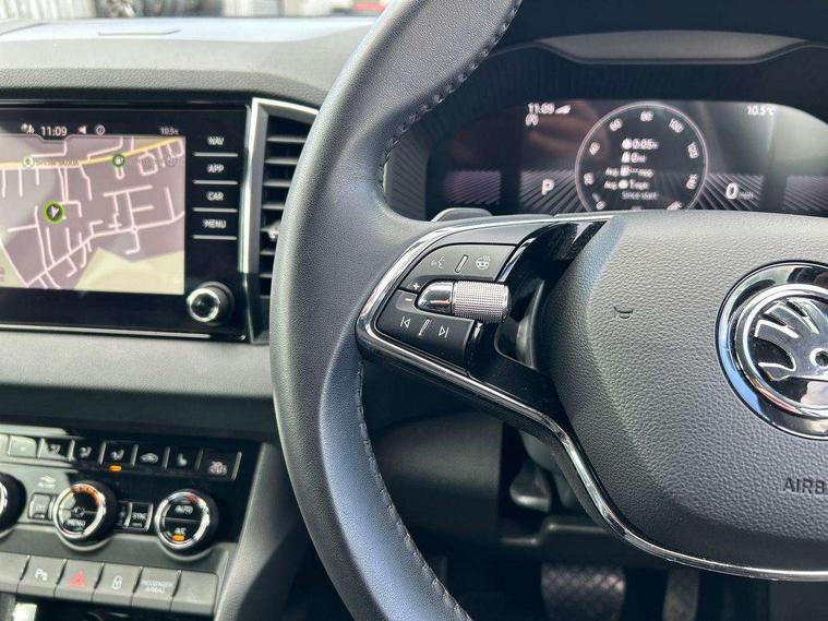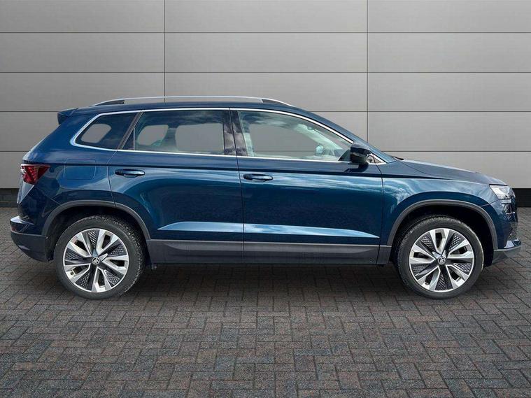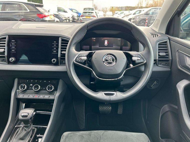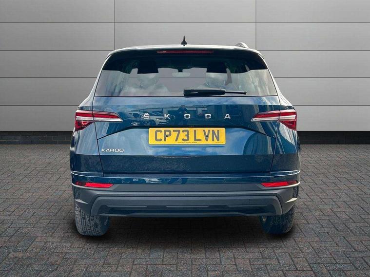 8" Digital display, Care connect, Driver fatigue sensor, Emergency services call system, Outside temperature gauge, Service interval indicator, SmartLink wireless for Apple and wired for Android, Start/stop system with regenerative braking, USB C Port x 2 in front centre console, 8 Speakers, DAB radio with Bluetooth, USB connection, Acoustic glass, Aero front windscreen wipers with intermittent function, Auto dimming rear view mirror with light and rain sensors, Black electric window control buttons, Body colour door mirrors and handles, Dynamic headlight range control with cornering light function, Electric front and rear windows with child proof lock, Heated rear windscreen, LED daytime running lights, LED rear lights with high functionality welcome effect and dynamic indicators, Light assistant (coming/leaving home/tunnel light), Plastic scuff plates, Privacy glass, Rear side wing doors, Rear spoiler, Rear window wiper with washer system and intermittent control, Safety reflectors on front doors, 1.5 litre bottle holders in driver and front passenger door panels, 12V socket in boot, 12v socket in front centre armrest with storage compartment and rear air vents, 2 spoke leather heated multifunction steering wheel with DSG paddles, 2 x Tablet holder, 3 rear height adjustable headrests, 3 seat bench in 2nd row, 4 foldable roof handles with rear coat hooks, Black floor carpet, Chrome inner door handles, Double sided boot floor, Foldable hooks in the boot, Front head restraints, Height adjustable front three point seats belts with tensioners, Height/reach adjust steering wheel, Ice scraper, Illuminated glovebox, Illuminated luggage compartment, Isofix child seat preparation for front passenger seat, Isofix child seat preparation outer rear, Manual lumbar support for front seats, Pen holder, Pollen filter, Rear boot cover, Rear reading lights, Rubbish bin door, Safety vest holder, Single front passenger seat, Storage box in upper central dashboard closed, Sunvisors with illuminated vanity mirrors, Textile floor mats, Ticket holder, VarioFlex seats with standard rear seat release, Boot pack - Karoq, Design Pack - Karoq, Parking pack - Karoq, Automatic door unlocking in case of crash, Automatic fuel cut off in case of crash, Child locks on rear doors, Driver airbag, Electronic parking brake with auto hold function, Emergency rear braking signal, ESC including ABS, MSR, ASR, EDS, HBA, DSR, RBS, MKB and traction control, Front side airbags, Hill hold control, Knee airbags, Passenger airbag with switch-off function, Pedestrian monitor, Seatbelt reminder signalisation and pretensioner for all seats, Three point seatbelts rear, Two tone horn, Tyre pressure display, Tyre pressure monitor, Alarm with interior monitoring, back up horn and tilt sensor with safe function, Electronic engine immobiliser, Keyless entry and start/stop, Remote central locking with 2 remote folding keys, Chrome framed air vents, 18" Miran alloy wheels in black, Anti-theft wheel bolts protection, Tool kit,
