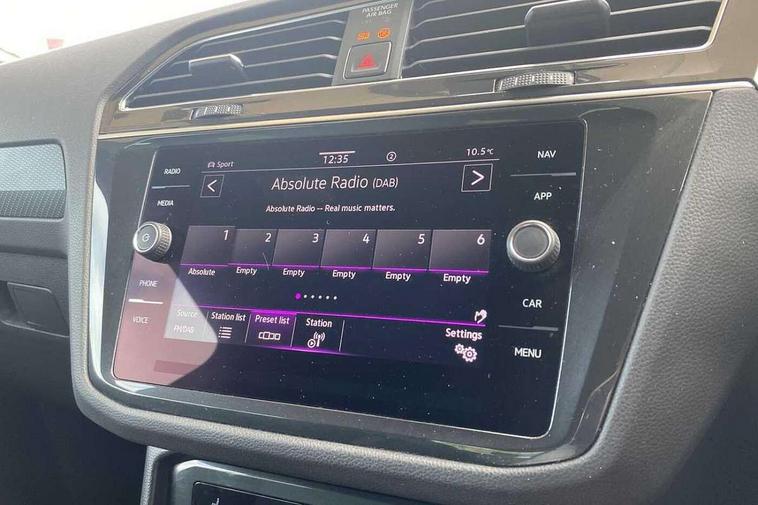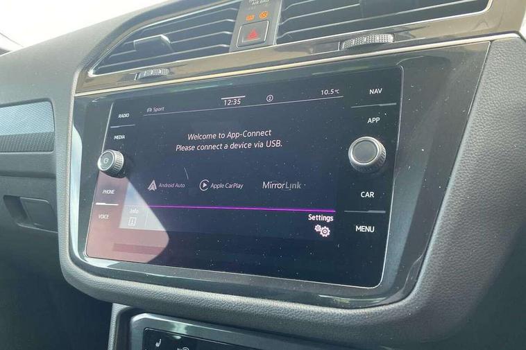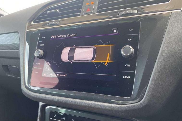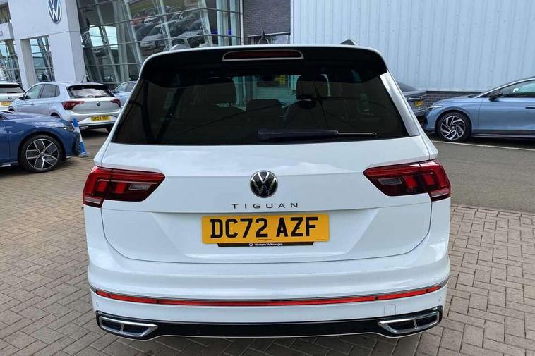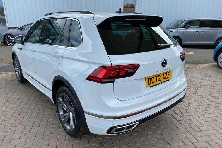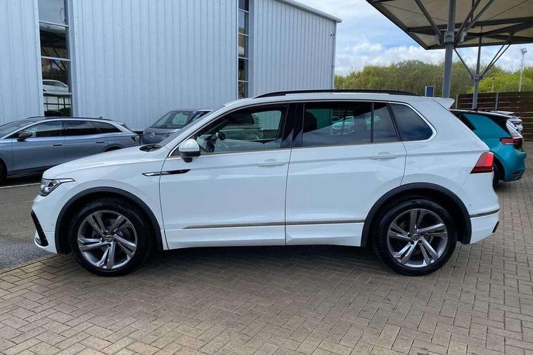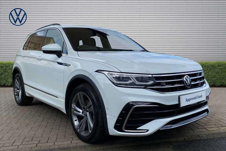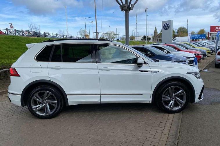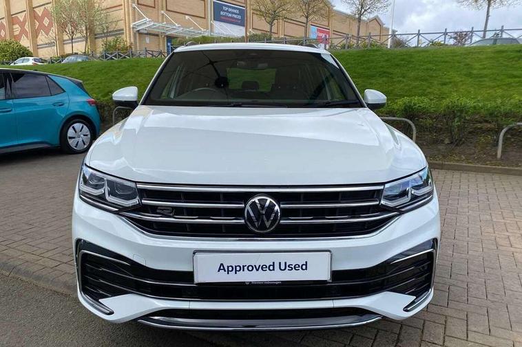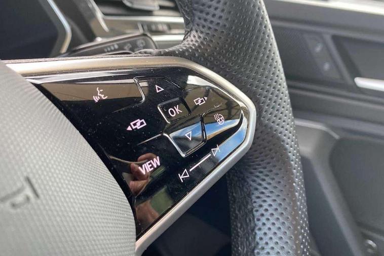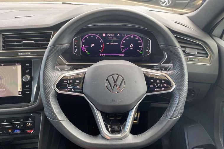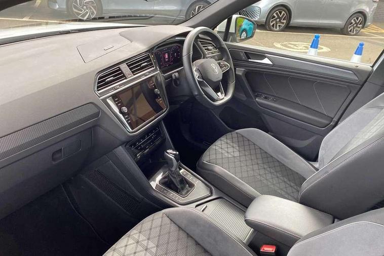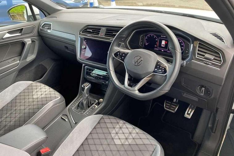 Adaptive cruise control ACC stop and go including speed limiter, App-Connect incl. App-Connect Wireless for Apple CarPlay and Android Auto, Bluetooth phone integration system, Comfort drive travel assist, Digital cockpit pro, Driver alert system, Driver profile selection, Dynamic road sign display, eCall emergency call system, Electromechanical speed sensitive power steering, Emergency assist, Front and rear parking distance sensors, Instrument cluster mph speedometer Great Britain, Lane keeping system Lane Assist, Lights on warning, Multifunction front facing camera, Outside temperature display, Premium multifunction display with multi colour display, Preparation for subsequent activation Navigation feature Discover Media includes Streaming and Internet, Remote control boot opening, Rev counter, Service interval indicator, Speed limit display, Start/stop system with regenerative braking, Tailgate/trunk lid unlocking from outside, Trip computer, Warning sound and light for doors and tailgate open, Battery regeneration during braking, Sports suspension, 8 Speakers, Digital radio reception DAB+, Diversity antenna for FM reception, Radio, Auto dimming interior rear view mirror, Automatic headlight control system, Body colored bumpers in R-Line style, Body colored exterior mirror housings, Body colour door handles, Chrome moldings on the side windows, Coming/leaving home lighting function, Dynamic headlight range control, Front and rear electric windows, Heated rear window, High level 3rd brake light, Laminated safety glass windshield, heat and sound insulating, LED headlamps with LED separate daytime running light and dynamic cornering light, LED rear combination lamps, LED rear number plate lights, License plate carrier in front and rear, Poor weather light and cornering light, Power adjustable, folding and heated door mirrors with surround lighting, front passenger exterior mirror lowering function, Privacy glass for rear side windows and rear window, R Line body kit, R Line side sills, Rain sensor, Rear exhaust tailpipe, Rear fog lamp, Rear side wing doors, Rear spoiler in R style, Rear windscreen washer and wiper with interval delay, Side and rear windows in heat insulating glass, Trailer Stability Programme, Unique R Line badging, Windscreen wipers/ intermittent wipe + 4 position delay, 12V outlet in center console rear and in luggage compartment, 12V outlet in front and tray, 2 LED front reading lights, 2 LED rear reading lights, 3 bench rear seats in 2nd row, 3 rear headrests, Air Care Climatronic 3 zone automatic climate control with enhanced air filter and controls in the rear, Art Velours greyson sports cloth upholstery, Backrest release for left front seat, Black headlining, Brushed stainless steel pedals and footrest, Carpet mats in front and rear with decorative stitching in Gray, Climate control unit rear with touch function, Door and side trim panel in foam film, insert in leatherette, Driver + front passenger lumbar support, Front footwell illumination, Front scuff plates in aluminum with R-Line logo, Front seats head restraints (x-adjustment), Height adjustable front seats, Height/reach adjust steering wheel, Isofix Preparation 2 Rear child seats, Leather gear knob, Rear bench seat asymetrically split folding, longitudinally movable and folding with load-through hatch and center armrest, Remote unlocking for rear seat backrest, Single front passenger seat, Sun visors with illuminated vanity mirrors, Top front comfort seats, Winter pack - Tiguan, 3 point seat belt for centre rear seats, 3 point seat belts with seat belt pretensioners for the outer rear seats, Curtain airbags for front and rear passengers, Driver/Front Passenger airbags, Drivers knee airbag, Electronic parking brake with auto hold, Electronic Stability Control with driver steering recommendation, ABS, ASR, EDL, EDTC and trailer stabilization, Front assist with autonomous emergency braking (for Adaptive Cruise Control ACC up to 130 mph), Front disc brakes, Front passenger airbag deactivation, Front side airbags, Height adjustable front 3 point seatbelts + pretensioners, Manual child proof rear door locks, Pedestrian monitoring system, Proactive passenger protection system in combination with front assist, Rear disc brakes, Two tone horn, Tyre pressure loss indicator, Warning sound and light for front seat belts if unfastened, Warning triangle, Anti theft alarm system with interior monitoring, backup horn and towing protection, Anti theft wheel bolts, Electronic engine immobiliser, Keyless locking and starting system keyless access with safelock, Chrome elements on the mirror switch power window switches and door pulls, Decorative inserts Carbon Gray for dashboard and front door trim panels, Interior door handle in matte chrome, 19" Valencia alloy wheels with AirStop tyres, Tool kit, Tyre mobility kit Includes 12V compressor and tyre sealant,