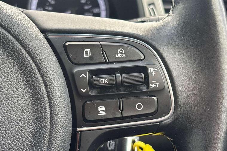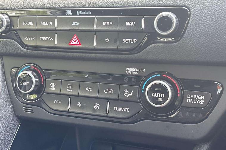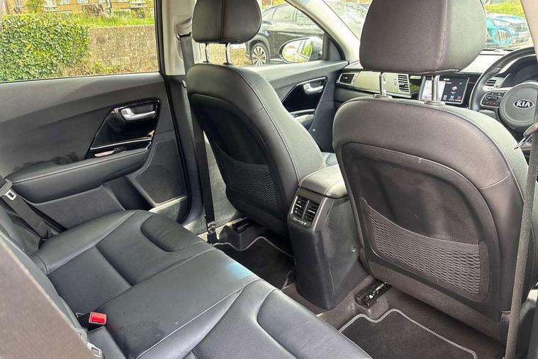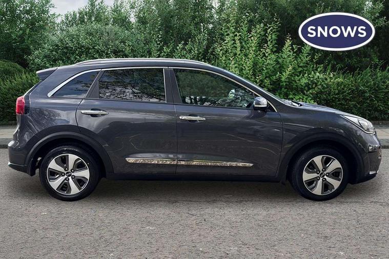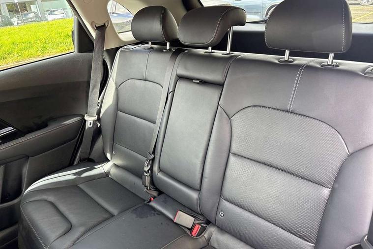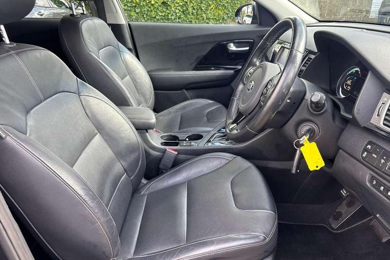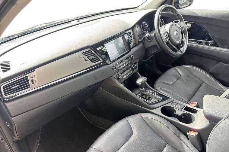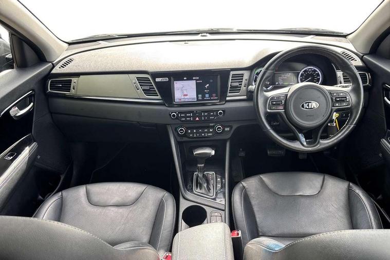 8" touch screen sat nav with TMC, Apple car play/Android Auto, Bluetooth audio streaming with voice recognition, Colour information display, Digital clock, Drive mode selector, Emergency stop signalling system, Front parking sensors, Kia connected services, Lane keep assist, Power Steering, Rear parking sensors, Reversing camera, Trip computer, Wireless Smartphone charger, 8 speakers, DAB Radio with MP3, JBL Premium Sound System, Steering wheel mounted controls, USB/iPod/auxiliary input connections, Auto dimming rear view mirror, Automatic defog system, Automatic headlight control system, Black side sills, Body colour bumpers, Chrome beltline trim, Chrome door handles, Chrome grille surround, Driver's side wide angle mirror, Electric adjustable/heated/folding door mirrors, Electric windows one touch open/close, Follow me home headlights, Front fog lights, High gloss black door mirrors, LED daytime running lights, LED indicators in door mirrors, LED tail lights, Matt black radiator grille, Privacy glass (rear side windows and rear screen), Rain sensing front wipers, Rear spoiler, Rear wiper, Roof rails, Solar glass, Wheel arch mouldings, 12V power in rear centre console, 60/40 split/folding 2nd row of seats, 8 way electric adjustable drivers seat, Ambient lighting, Assist grips, Centre console storage box, Door armrest in leather, Driver's electric lumbar adjustment, Driver/passenger sunvisors with illuminated vanity mirrors, Dual zone automatic air conditioning, Front and rear door pockets, Front map light with sunglasses case, Front seatback pocket, Front/rear centre armrests, Headlining in Light grey, Heated front seats, Heated steering wheel, Height adjustable headrests, High gloss black steering wheel trim, Illuminated ignition key hole, Isofix child seat attachment, Leather trimmed gearshift, Leather trimmed steering wheel, Leather upholstery, Luggage area lamp, Luggage compartment cover, Luggage net hooks, Rear armrests with cupholder, Satin chrome interior door handles, Stainless Steel Scuff Plates, Tilt/telescopic adjustable steering wheel, Ventiliation ducts to rear compartment, Advanced Driver Assistance Pack - Niro, 3 point seatbelts on all seats, ABS, Active front headrests, Automatic unlocking of doors in case of impact, Curtain airbags, Drivers knee airbag, Electronic stability control, Height adjustable front seatbelts, Hill start assist control (HAC), Passenger airbag deactivate switch, Traction control, Twin front and side airbags, Tyre pressure monitoring system, Anti theft alarm system, Deadlocks, Folding key, Immobiliser, Locking wheel nuts, Remote central door locking, High gloss black centre fascia, High gloss black door inserts, 16" alloy wheels with plastic wheel cover, Tyre mobility system,