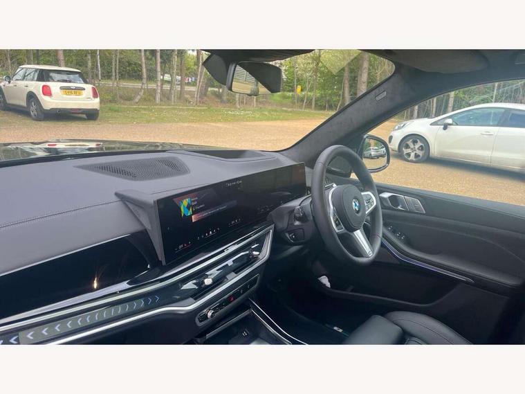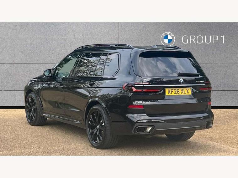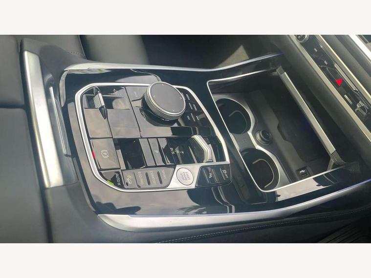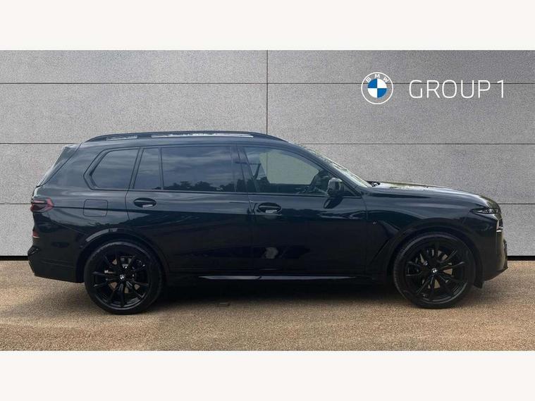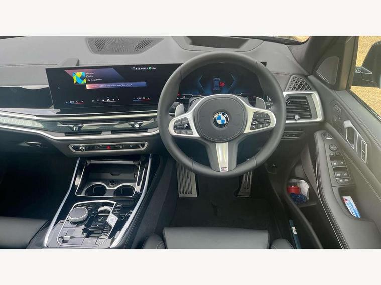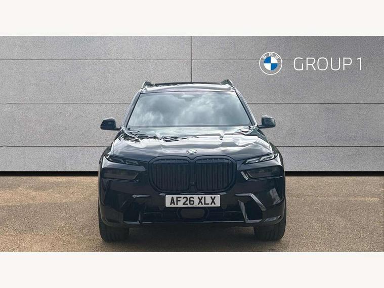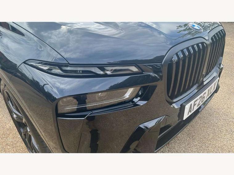 Attentiveness assist, Automatic start/stop function, Automatic tailgate operation, BMW ConnectedDrive online services, BMW Drive recorder, BMW gesture control, BMW Teleservices, Brake pad wear indicator in front and rear, Condition based service, Integrated owner's handbook, Live Cockpit Professional with head up display including 12.3" instrument cluster and 14.9" central display, Parking assistant pro including reversing assistant, PDC, lateral parking aid, reversing assist camera, parking drive off monitoring, 48V Mild hybrid technology, 8 speed automatic with steptronic transmission including automatic hold function and gearshift paddles on the steering wheel, Drive experience switch with comfort mode + ECO PRO + sport mode, Front and rear air suspension, Permanent all wheel drive, 2 rear USB-C ports, 2x Front USB (1x USB-C, 1x USB-A), DAB radio, Personal eSim, Acoustic glazing, Adaptive air flap control bars in high gloss black, Air breather and door claddings in high gloss chrome, Body coloured wheel arches, Dynamic brake lights with LED technology, Electrically adjustable and heated aspheric folding side mirrors with auto dimming, electric fold in function, automatic parking function, Exterior and central air inlets in front bumper painted pearl chrome, Follow me home headlight function, Frameless interior mirror, Front and rear electric windows, Heated windscreen washer nozzles, High beam assist, High gloss black shadow line roof rails, High gloss black shadowline trim in side/window frame, window recess cover, window guide, B and C pillar, mirror triangle, mirror base, mirror frame, Integrated turn indicators (door), LED daytime running lights, LED rear lights, LED third brake light in rear spoiler, Rain sensor with automatic headlight activation and windscreen wiper control, Rear side wing doors, Side window graphic bars + B and C pillar trim panels in black high gloss, Sump guard front and rear painted in silver, Trailer stabilisation logic, 12V - Power sockets with 2x centre console and 1x luggage compartment, 2 seat bench in 3rd row, 2x cupholders in front, rear centre armrest and two in third row seats, 3 seat bench in 2nd row, 3 spoke M leather multifunction steering wheel, 40:20:40 split folding rear seat backrests, Ambient lighting strip in the instrument panel with illuminated, Armrest in front centre console, Compartment in front of cupholder, Driver and front passenger sunvisors with illuminated vanity mirrors and ticket holder, Electrical steering column with adjustable height and length with activation and control on the steering column, Entry sills with illuminated M inscription, Fold down flush into floor of luggage compartment 50:50, Front and rear colour co-ordinated with all standard carpet colours, Front and rear door pockets, Front and rear side armrests integrated into door trim, Front seat back pockets, Grab handles, Height adjustable front headrests, Height adjustable rear headrests, Lockable glove compartment, Nano filter, Single front passenger seat, Soft close doors, Storage tray and compartment with lid in centre console, Wireless charging tray, Additional storage compartment pack - X7, Ambient light interior pack - X7, Connected Package Professional - X7, Interior lighting pack - X7, Luggage compartment pack - X7, M aerodynamics pack - X7, M Sport pack - X7, 3 point seatbelts on all seats, front pyrotechnic belt tensioners, stopper and belt force limiters, front and outer rear seats, Acoustic protection for pedestrians, Active protection, Airbag - Front driver and passenger, side airbags and Head airbags, Anti lock braking system (ABS) with cornering brake control, BMW emergency call, Child seat ISOFIX attachment rear outer seats in 2nd row and both seats in 3rd row includes top tether, Comfort access system with digital key plus, Comfort cushion seats for outer seats in 2nd row, Crash sensor inclu activation of airbags, interior light, safety battery terminal clamp, hazard warn flasher, unlock doors, deactivation of fuel pump, DSC - Dynamic Stability Control, Dynamic Traction Control - DTC, Electromechanical parking brake with automatic drive away release and auto hold function, Front and rear brake discs with interior ventilation, Hill descent control, Integrated braking system, Manual child lock in rear doors, PC iBrake PostCrash approach control warning with light braking function, Tyre pressure monitoring system, Tyre pressure sensors, Variable torque distribution, Warning triangle and first aid kit, Alarm, Central locking including 2 vehicle keys with integrated emergency key, Engine immobiliser, Locking wheel bolts, Galvanic embellisher for controls,
