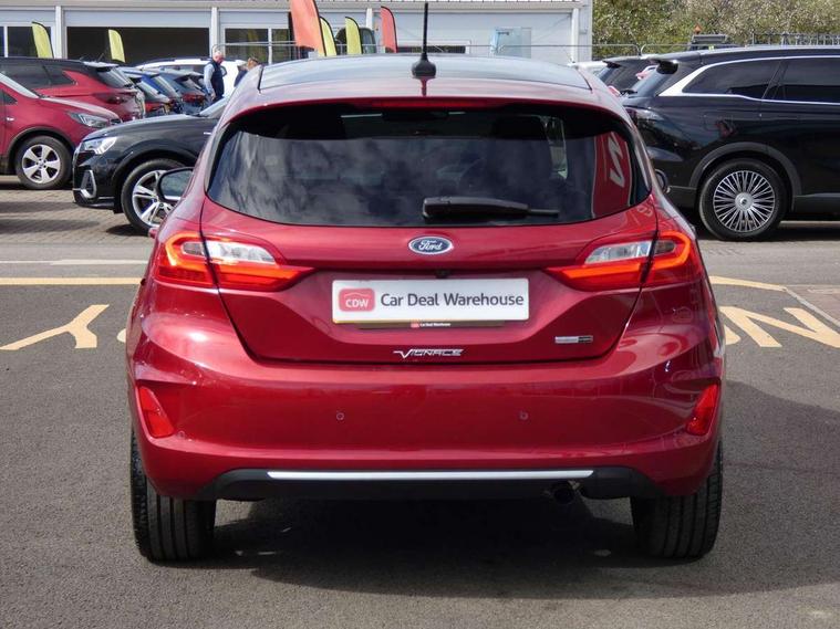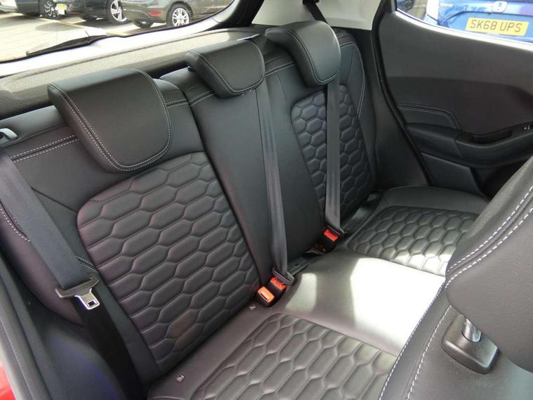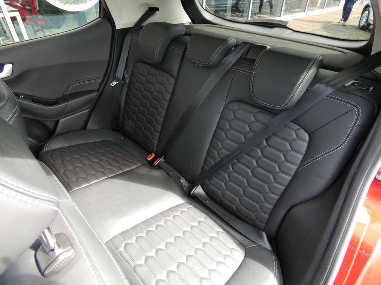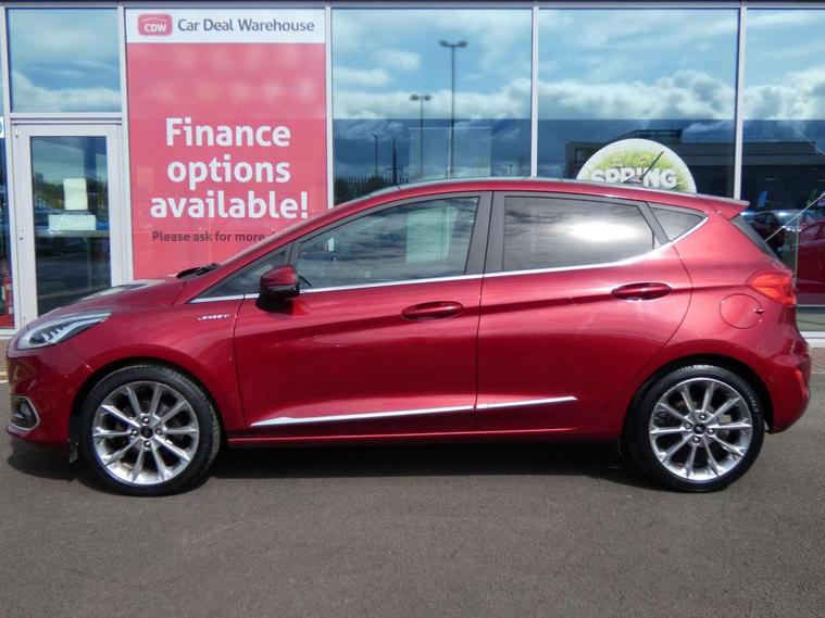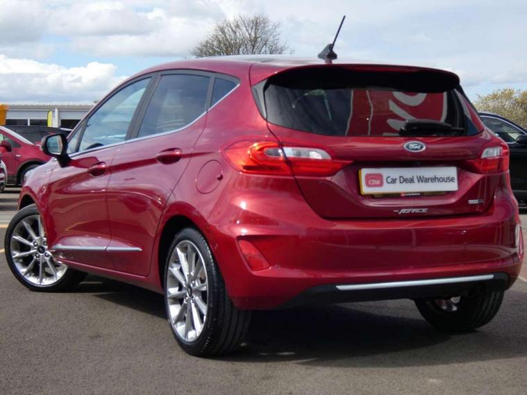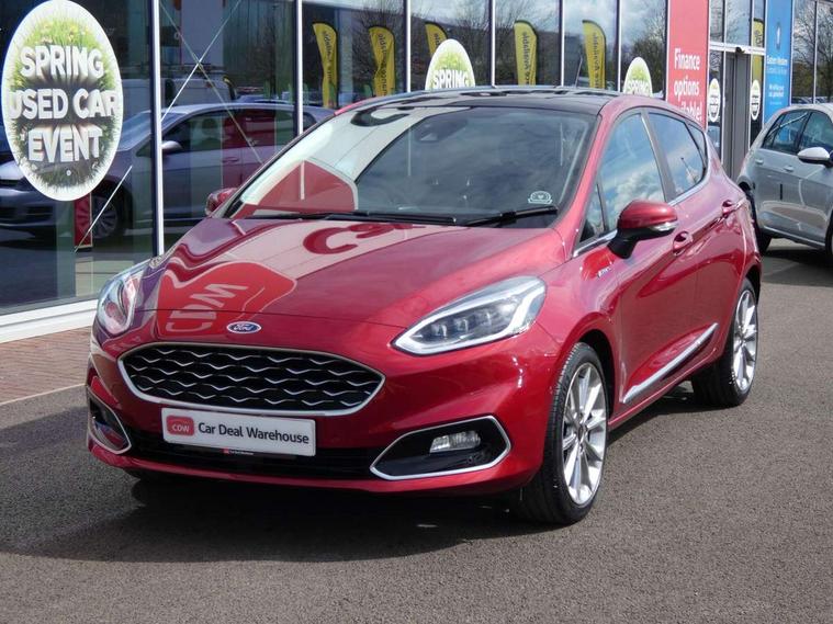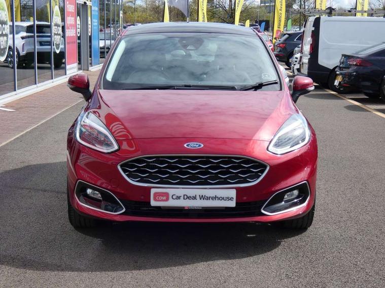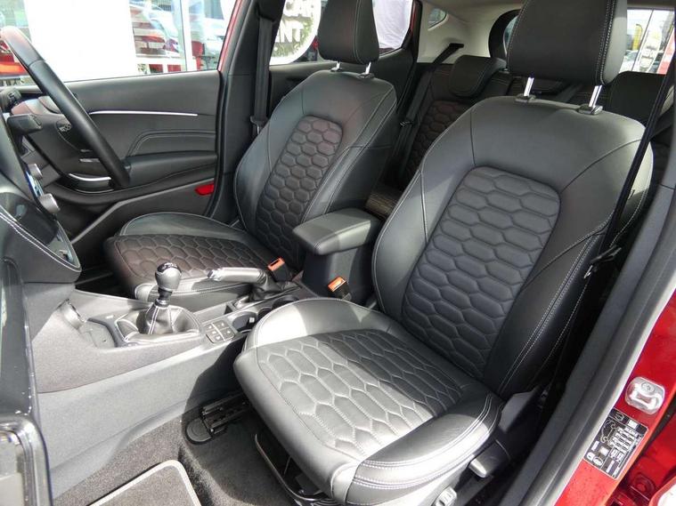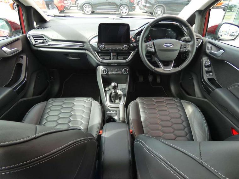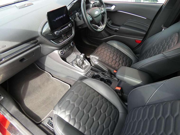 Bluetooth system, Electric power steering, Ford easy fuel, Rear parking distance sensors, Trip computer, Wireless charging, 2 USB ports, Auxiliary input socket, B&O Premium audio system with 8" touchscreen, 10 speakers, 360 degree sound system, Ford SYNC 3 navigation system and Ford pass connect, DAB Digital radio, Steering wheel mounted controls, Body colour bumpers, Body colour door handles, Body colour rear spoiler, Body coloured electrically operated and heated door mirrors with side indicators, Chrome beltline trim, Chrome lower window surround, Cornering front fog lights, Electric front windows/one touch facility, Electric rear windows, LED Night signature to rear lights, Power foldable door mirrors with puddle lights, Quickclear heated windscreen, Rain sensing wipers and auto dimming rear view mirror, Rear privacy glass, Rear wiper, Unique Vignale front grille & bodystyling, Vignale front door threshold plates, Vignale rear & wing badges, 12V Accessory socket in centre console, 3 spoke leather trimmed steering wheel with audio control, 60/40 split folding rear seat, Adjustable head restraints, Boot carpet, Centre console with armrest and illuminated cupholders, Chrome inner door handles, Drivers and Passenger lumbar support, EATC - Electronic Auto Temperature control, Footwell illumination, Front floor mats in velour, Front map reading lights, Front seat and rear pockets, Height adjustable driver's seat, Height adjustable passenger seat, Illuminated glovebox, Leather wrapped handbrake and gearknob, LED ambient lighting, Load area light, Luxury woven headliner, Overhead console with sunglasses holder, Pollen filter, Quilted leather upholstery, Rake/reach adjustable steering wheel, Comfort Pack - Fiesta, High series driver assistance pack - Fiesta, NCAP Pack - Fiesta, 3 point seatbelts on all rear seats, ABS+EBA, Curtain airbags, Driver and passenger airbags, Drivers knee airbag, Electronic stability control with hill start assist, Front passenger airbag deactivation, Front side airbags, Seatbelt warning, Two tone horn, Tyre pressure monitoring system, Ford keyfree system with Keyless entry and keyless start, MyKey system, Remote central locking & engine immobiliser, Thatcham Cat.1 alarm, Tyre repair kit,