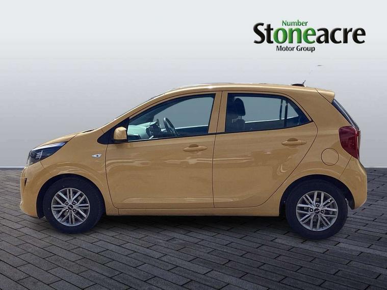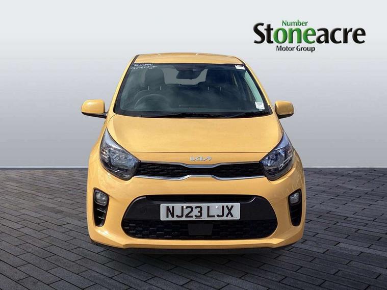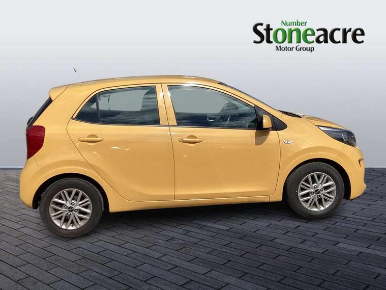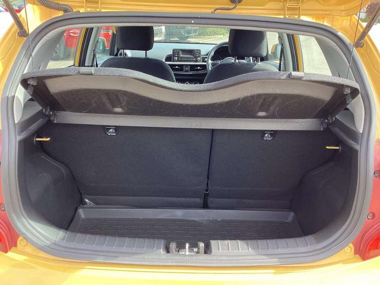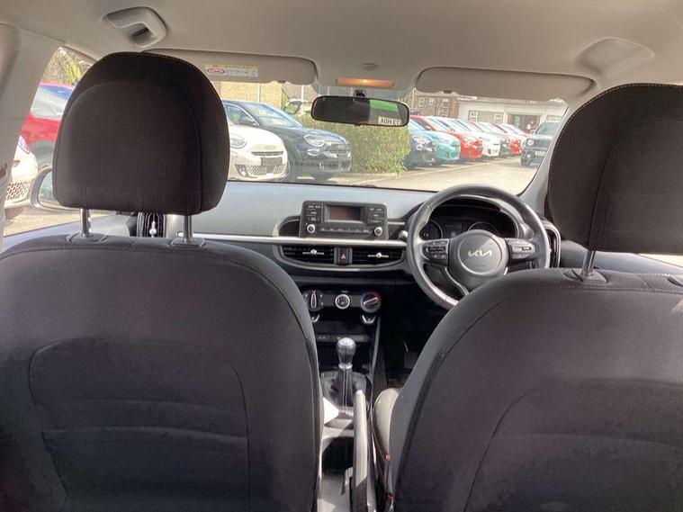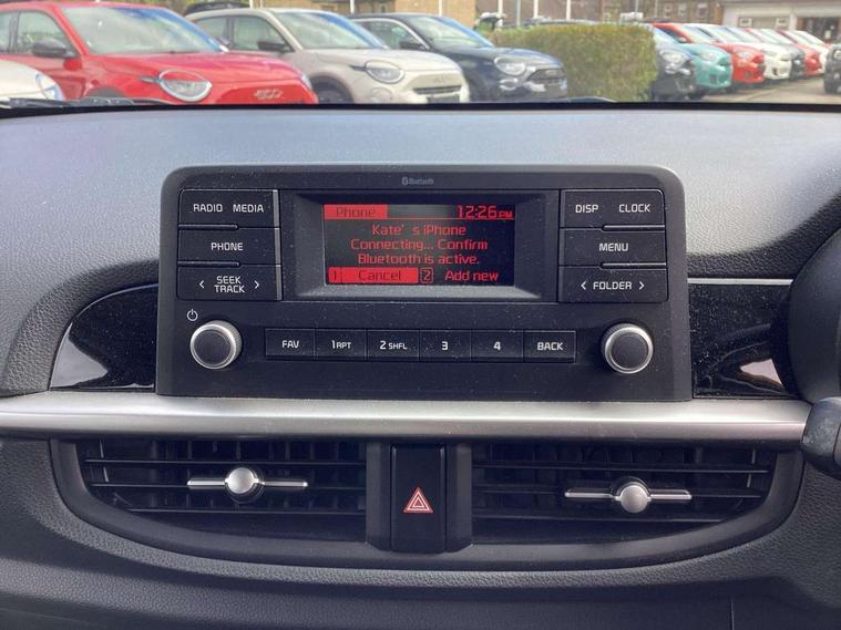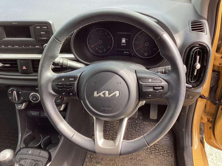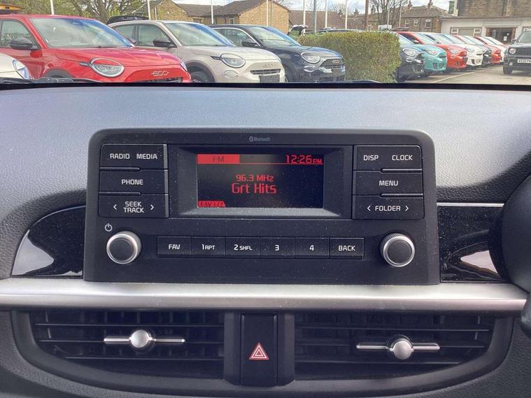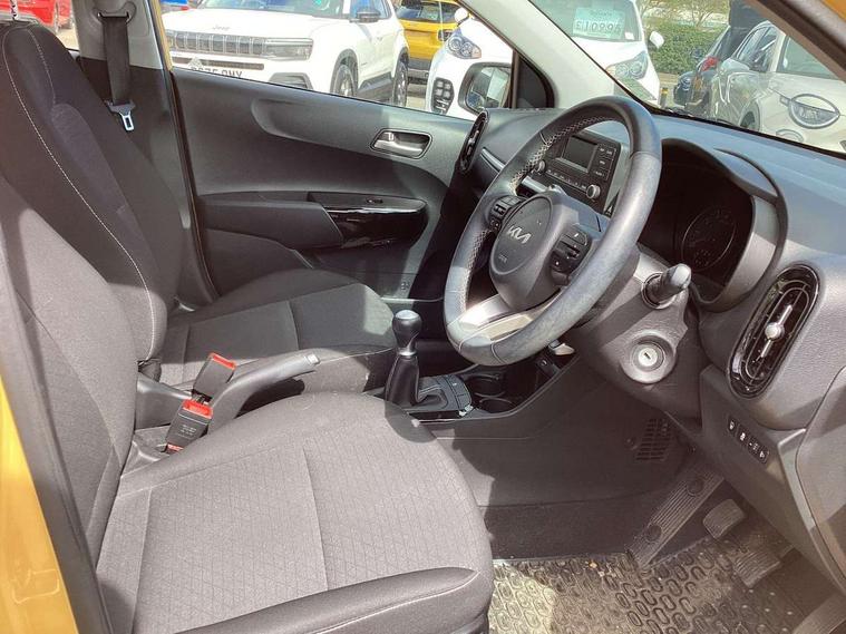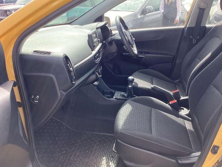 3.8" monochrome audio display with RDS and DAB, Emergency call service, Emergency stop signalling system, External temperature gauge, Motor driven power steering, Tachometer, Tailgate, Trip computer, 4 speaker audio system, Bluetooth with music streaming, Steering wheel mounted controls, USB ports for connection of a media device, Automatic headlight control system, Black radiator grille with chrome surround, Body colour bumpers, Body colour mirrors and door handles, Day/night rear view mirror, Daytime running lights, Electric adjustable heated door mirrors, Front and rear electric windows with drivers's auto up/down function, Headlamp levelling, Heated rear window, High mount brake light, MFR - Multi Focus Reflector halogen headlights with black bezel, Rain sensor, Rear fog lights, Rear side wing doors, Rear wash/wipe, Speed variable front wipers, Tinted glass, Visible VIN plate, Welcome and follow-me home light functionality, 1 x rear coat hook, 12V power point front, 2 seat bench in 2nd row, 3 x passenger assist grips, 60/40 split/folding 2nd row of seats, All round height adjustable headrests, Cupholders in centre console, Driver and front passenger sunvisor with vanity mirror, Driver seat height adjust, Front cabin lights, Glovebox, High gloss lower centre fascia trim, door armrest and air vents, ISOFIX Child seat top tethers and anchor fixings, Leather trimmed steering wheel and gearshift, Luggage area light, Luggage area parcel shelf, Manual air conditioning, Passenger front seatback pockets, Premium cloth upholstery, Silver paint finished interior door handles, Single front passenger seat, Slide/reclining front seats, Tilt adjustable steering wheel, Advanced Driver Assistance Pack - Picanto, 2 x 3-point rear seatbelts, ABS/EBD, Automatic unlocking of doors in case of impact, Dual front airbags, ESC + BAS + VSM + HAC, Front passenger airbag cut-off switch, Front seatbelt height adjusters, Front seatbelt pretensioners + load limiters, Hill hold control, Knee airbags, Rear child proof door locks, Seatbelt warning, Side impact protection, Torque vectoring brake based and straight line stability (SLS), Traction control, Twin curtain airbags, Twin front side airbags, Tyre pressure monitoring system, Anti theft alarm, Engine immobiliser, Folding key, Locking wheel nuts, Remote central door locking, 14" alloy wheels, Tyre mobility kit,