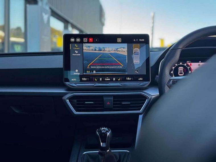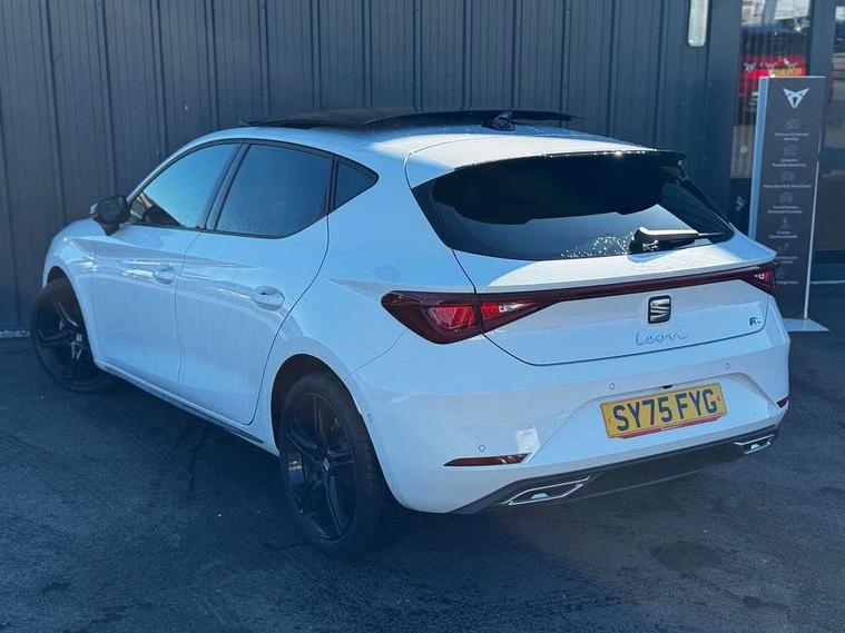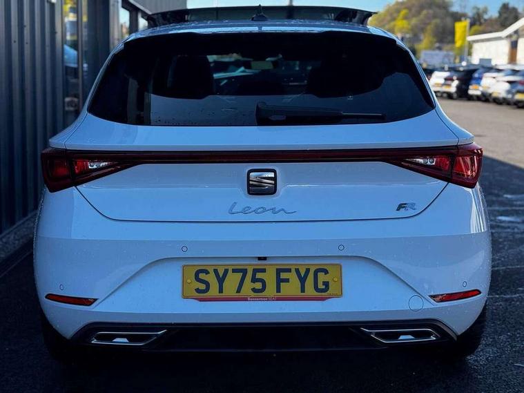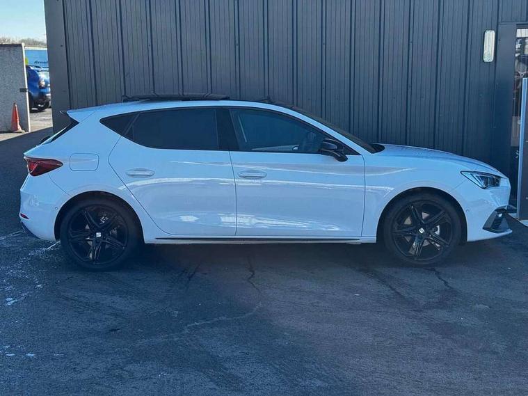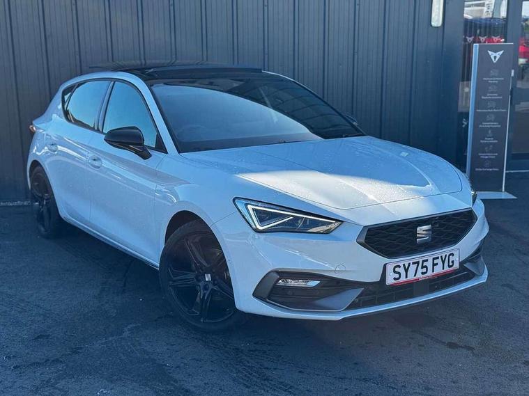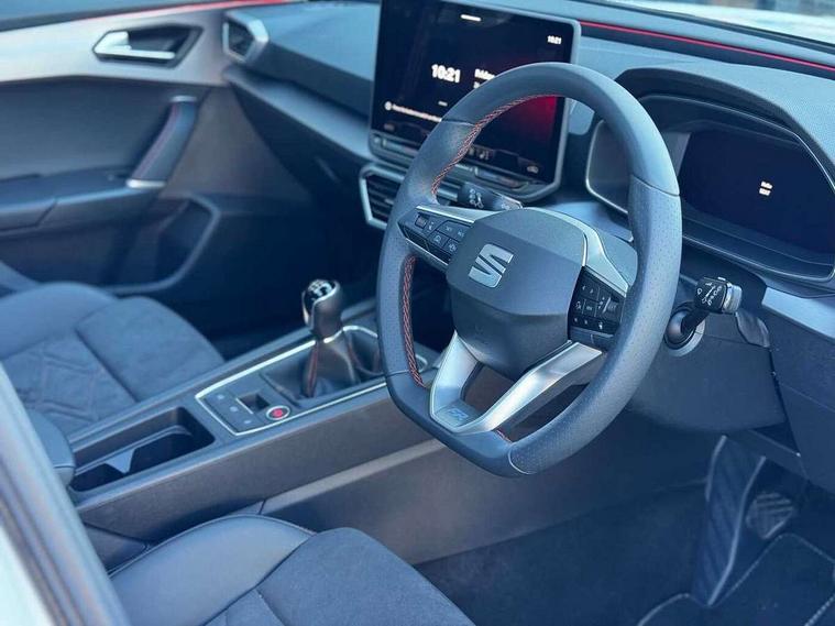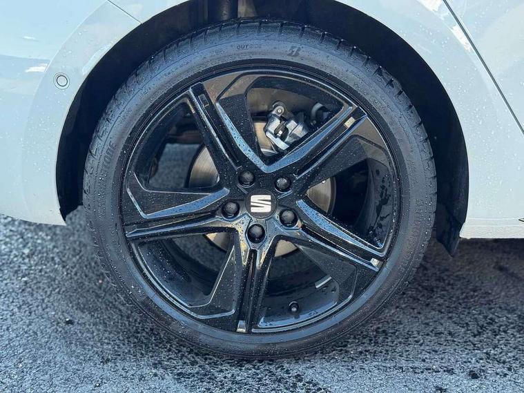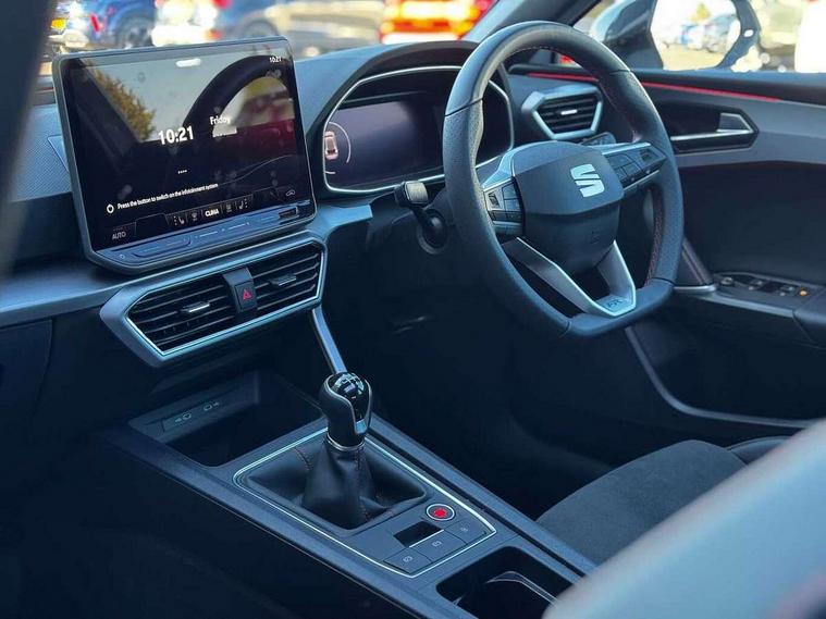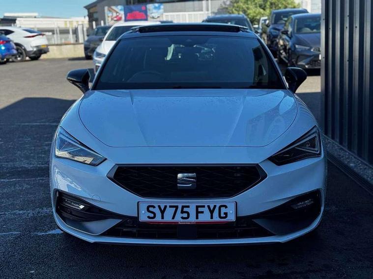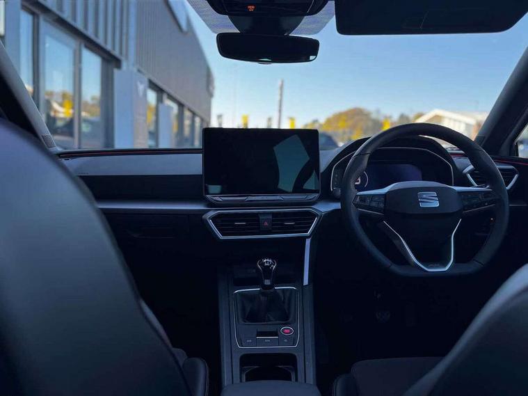 Digital cockpit with multifunction display, Driver attention alert with drowsiness warning, E-call, Front assist with forward collision warning braking reaction to vehicles, pedestrians and cyclists, Full link smartphone integration with Mirror Link, wireless Apple CarPlay and wired Google Android Auto, Intelligent speed assist, Lane assist, Lockable tailgate, Park assist (inc front/rear parking sensors), Power assisted speed sensitive electro-mechanical steering, Rear view camera, RPM, trip computer, outside temp gauge, instrument light brightness, low fuel warning light, lights on reminder, gearshift indicator, SEAT drive profile with 4 modes (Eco/Normal/Sport/Individual), throttle response, Service interval indicator, Start/stop system with regenerative braking, Wireless phone charging, Sports suspension, XDS electronic differential lock and dynamic traction support, 2 front and 2 rear USB-C ports, Auxiliary input socket, Auto dimming rear view mirror, Black door mirror housings, Black roof spoiler, Black side skirts, Body colour door handles, Body coloured bumpers, Dark tinted rear windows, Door mirror LED indicator lights, Dynamic headlight range control, Electric adjustable/heated/folding door mirrors with memory, Electric front/rear windows, FR sports bumper, Illuminated front door sill, LED front fog lamps, LED rear fog lamp with rear coast to coast light, Matrix LED headlights and beams with variable light distribution, LED rear light, Panoramic sunroof, Rear side wing doors, Rear wash/wipe, Separate daytime running light with automatic headlight control and coming home feature, Third brake light, Windshield wiper intermittent control with light/rain sensor, 12v power point in centre console, 3 seat bench in 2nd row, 60/40 split rear bench seat with armrest, Ambient lighting with glovebox, footwell and single monocolour, Black headlining, Dust/pollen filter, Electric driver lumbar support + passenger manual lumbar support, Folding boot cover, Front and rear height adjustable headrests, Front and rear reading lights X 4, Front centre armrest, Front seatback storage pockets, Heated front seats, Heated leather steering wheel with leather gearstick, Height/reach adjust steering wheel, Interior wraparound lighting (FR), ISOFIX points in outer rear seats with top tether anchorage points, Luggage tie-down hooks, Microsuede cloth upholstery, Power driver seat with memory and manual height adjustable passenger seat, Single front passenger seat, Sunvisors with covered illuminated mirror, Three zone climate control, Media system plus with navigation - Leon, 3 point seatbelts on all rear seats, ABS, Brake control system - ESC and brake booster, Child proof door locks, Driver and front passenger airbags with front passenger airbag de-activation, front side and curtain airbags, Electronic parking brake, Extended safety system - seat belt tensioner, window closure and hazard lights, Hill hold control, Rear disc brakes, Seat belt reminder for front and rear seats, Tyre pressure monitoring system, Anti theft alarm system with interior monitoring in cab, backup horn and towing protection, KESSY Advanced - Keyless start, keyless entry, Locking wheel bolts, Chrome interior detailing, 18" Black alloy wheels, Tool kit without jack,