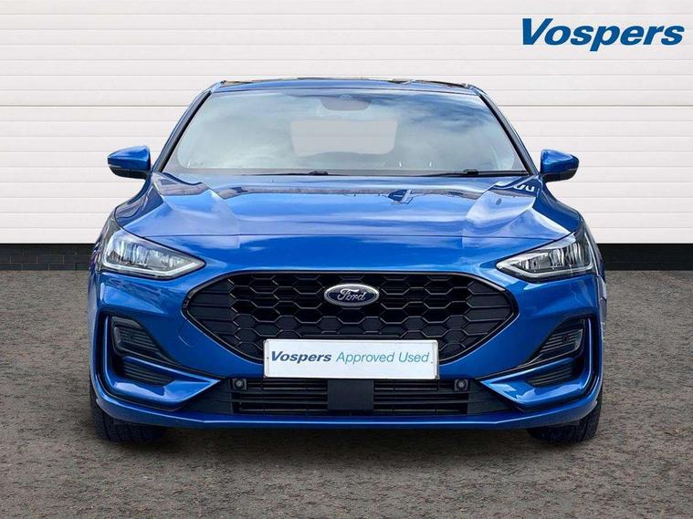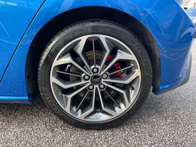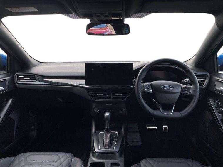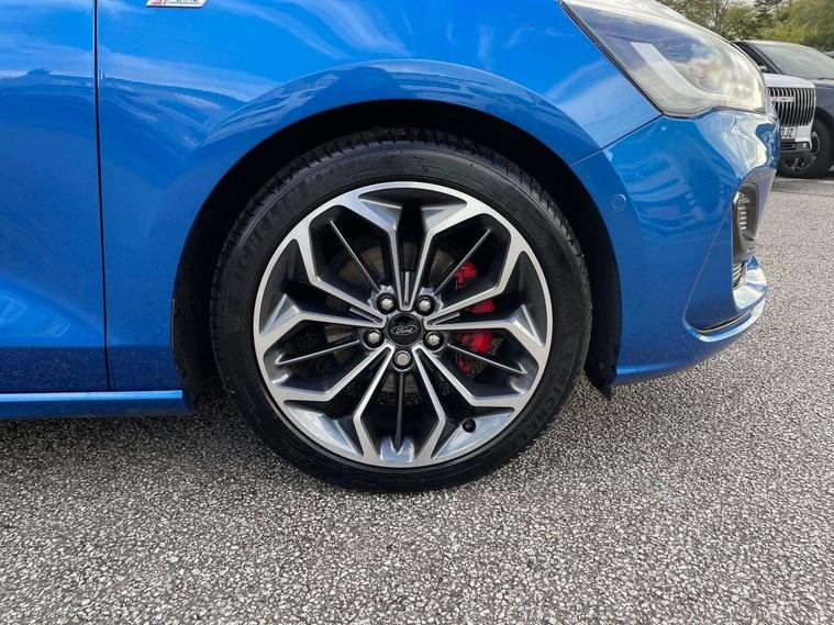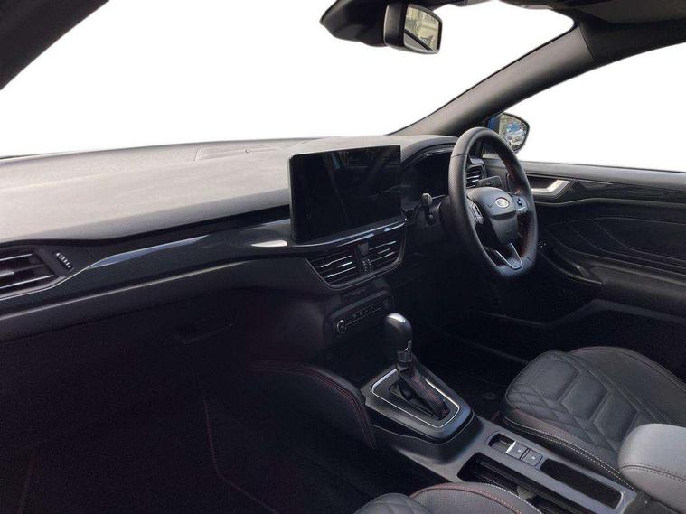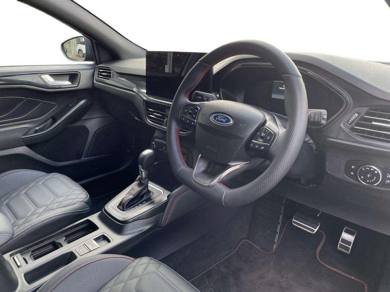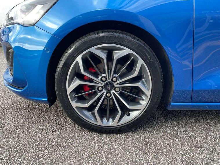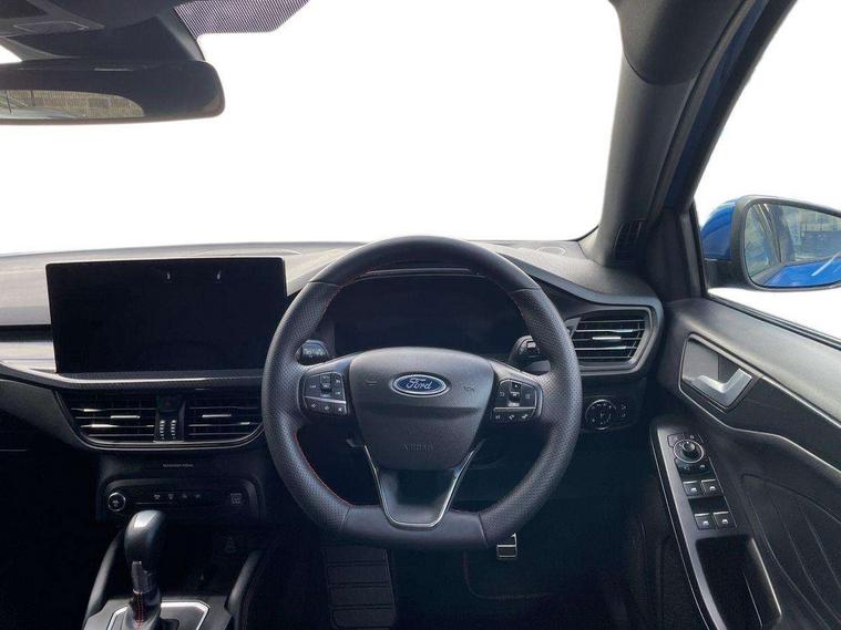 12.3" Digital instrument cluster, Bluetooth system, Digital clock, Easy fuel capless refuelling system, Eco mode, Ford SYNC4 Nav with 13.2'' touchscreen, DAB, Emergency Assistance, Apple Carplay & Android Auto, B&O Premium Audio with 10 speakers, FordPass Connect, Lane keeping system - lane keeping alert and lane keeping aid, PAS, Rev counter, Selectable drive mode, Service interval indicator, Trip computer, Wireless charging pad, Sports tuned suspension, 2 USB ports, Auto headlamps (on/off), Body coloured door handles, Electrically operated front and rear windows with one touch opening and closing, Electrically operated heated power fold door mirrors with puddle lamp with side indicators, Front variable intermittent wipers with electric wash, Heated rear window, LED daytime running lamp, LED rear lamps, LED third brake light, Polished twin tailpipe, Privacy glass, Quickclear heated windscreen, Rain sensor, Rear side wing doors, Tailgate wash/wipe, Unique ST-Line grille, full bodystyling kit, and large body coloured rear roof spoiler, 3 rear headrests, 3 seat bench in 2nd row, Dual zone electronic air temperature control, Full sensico premium upholstery, Height adjustable front headrests, Isofix child seat preparation, Load through ski hatch, Manual 2-way passenger seat adjust, Power 4-way driver seat adjust, with power lumbar adjust, Reach + rake adjustable steering column, Single front passenger seat, ST-Line Design pack - Focus, Winter pack - Focus, 3x3 point rear seatbelts, ABS+Electronic Brake force Distribution, Auto hold function, Driver airbag, EDL traction control, Electronic parking brake, Electronic stability control, Front and rear seatbelt reminder, Front inertia reel height adjustable seatbelts with pre-tensioners, Front passenger airbag, Front side airbags, Passenger airbag deactivate switch, Post collision braking, Pre collision assist with autonomous emergency braking and pedestrian/cyclist detection, Remote/power child rear door locks, Side curtain airbags, Three rear inertia reel lap/diagonal seatbelts, Tyre pressure monitoring system, Keyless entry and keyless start, MyKey system, Remote central locking & engine immobiliser, Thatcham alarm with power door dead locks, 18" 5x3 spoke pearl grey high gloss machined finish alloy wheels with mini spare wheel,