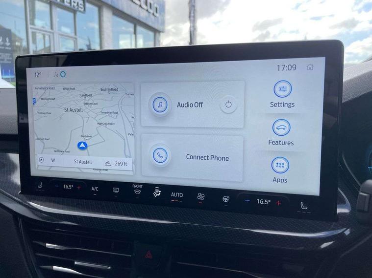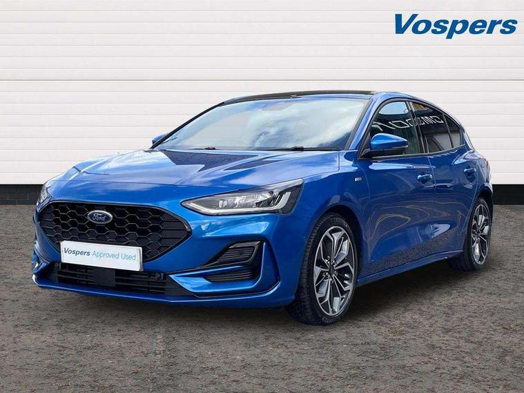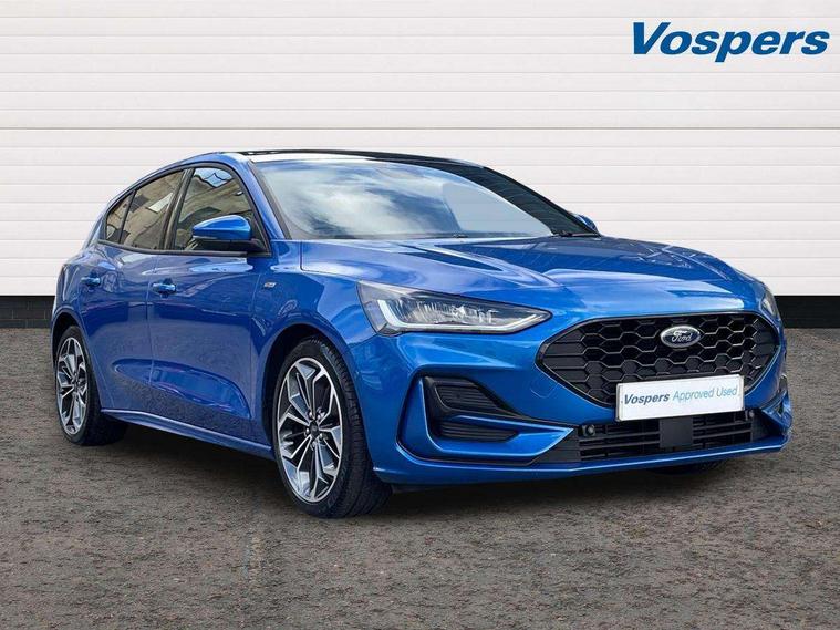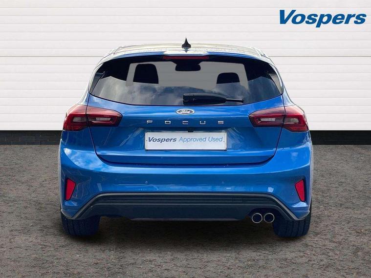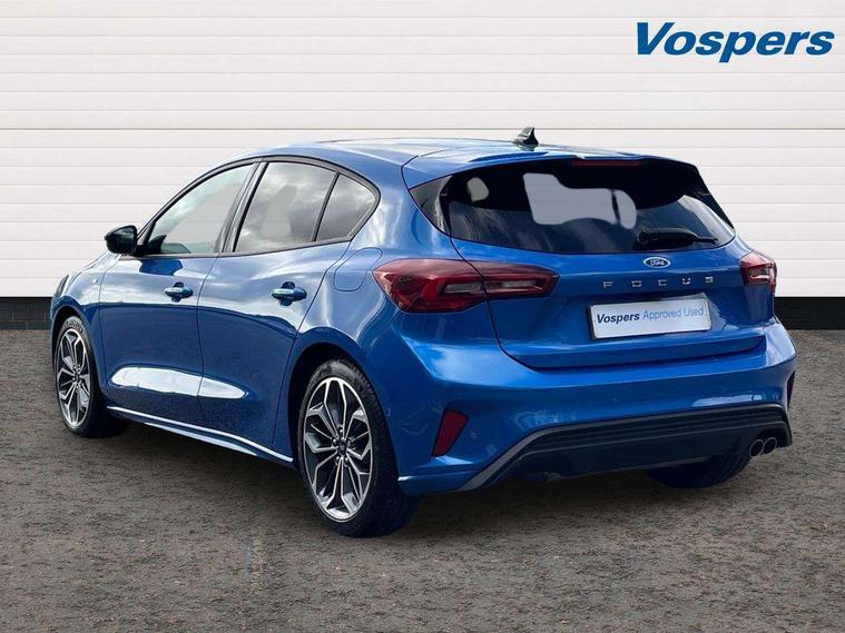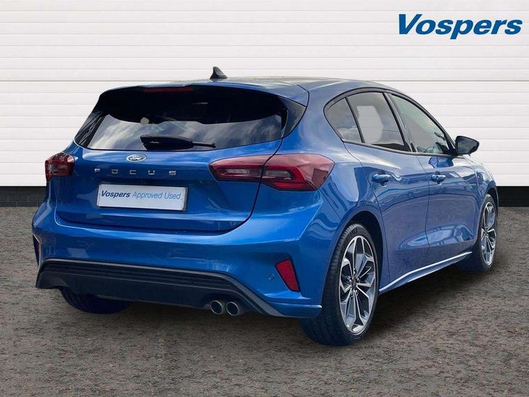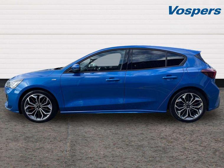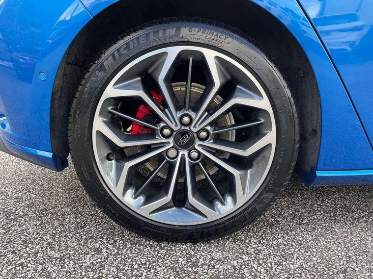 12.3" Digital instrument cluster, Bluetooth system, Digital clock, Easy fuel capless refuelling system, Eco mode, Ford SYNC4 Nav with 13.2'' touchscreen, DAB, Emergency Assistance, Apple Carplay & Android Auto, B&O Premium Audio with 10 speakers, FordPass Connect, Lane keeping system - lane keeping alert and lane keeping aid, PAS, Rev counter, Selectable drive mode, Service interval indicator, Trip computer, Wireless charging pad, Sports tuned suspension, 2 USB ports, Auto headlamps (on/off), Body coloured door handles, Electrically operated front and rear windows with one touch opening and closing, Electrically operated heated power fold door mirrors with puddle lamp with side indicators, Front variable intermittent wipers with electric wash, Heated rear window, LED daytime running lamp, LED rear lamps, LED third brake light, Polished twin tailpipe, Privacy glass, Quickclear heated windscreen, Rain sensor, Rear side wing doors, Tailgate wash/wipe, Unique ST-Line grille, full bodystyling kit, and large body coloured rear roof spoiler, 3 rear headrests, 3 seat bench in 2nd row, Dual zone electronic air temperature control, Full sensico premium upholstery, Height adjustable front headrests, Isofix child seat preparation, Load through ski hatch, Manual 2-way passenger seat adjust, Power 4-way driver seat adjust, with power lumbar adjust, Reach + rake adjustable steering column, Single front passenger seat, ST-Line Design pack - Focus, Winter pack - Focus, 3x3 point rear seatbelts, ABS+Electronic Brake force Distribution, Auto hold function, Driver airbag, EDL traction control, Electronic parking brake, Electronic stability control, Front and rear seatbelt reminder, Front inertia reel height adjustable seatbelts with pre-tensioners, Front passenger airbag, Front side airbags, Passenger airbag deactivate switch, Post collision braking, Pre collision assist with autonomous emergency braking and pedestrian/cyclist detection, Remote/power child rear door locks, Side curtain airbags, Three rear inertia reel lap/diagonal seatbelts, Tyre pressure monitoring system, Keyless entry and keyless start, MyKey system, Remote central locking & engine immobiliser, Thatcham alarm with power door dead locks, 18" 5x3 spoke pearl grey high gloss machined finish alloy wheels with mini spare wheel,