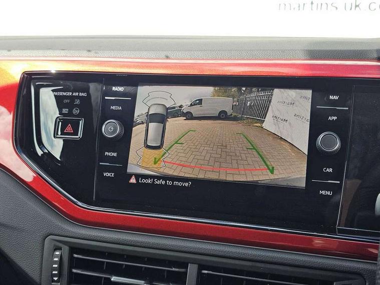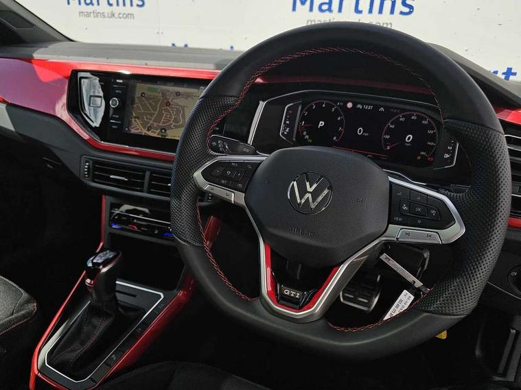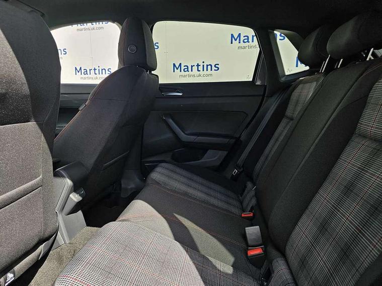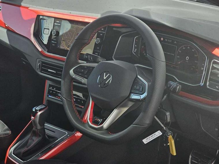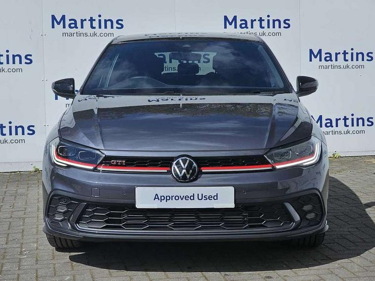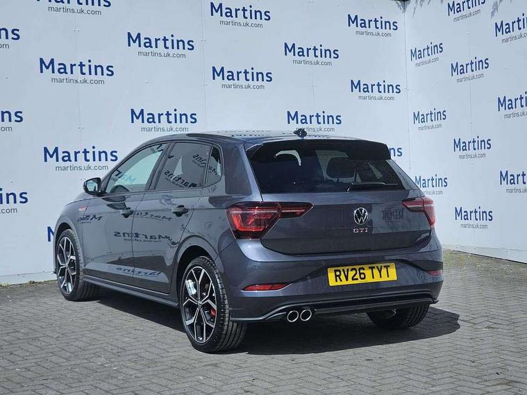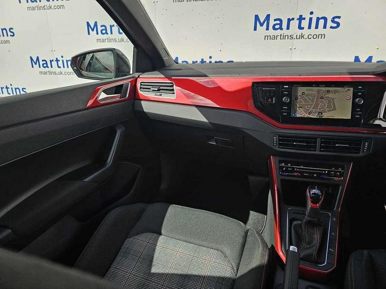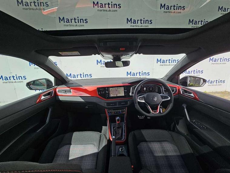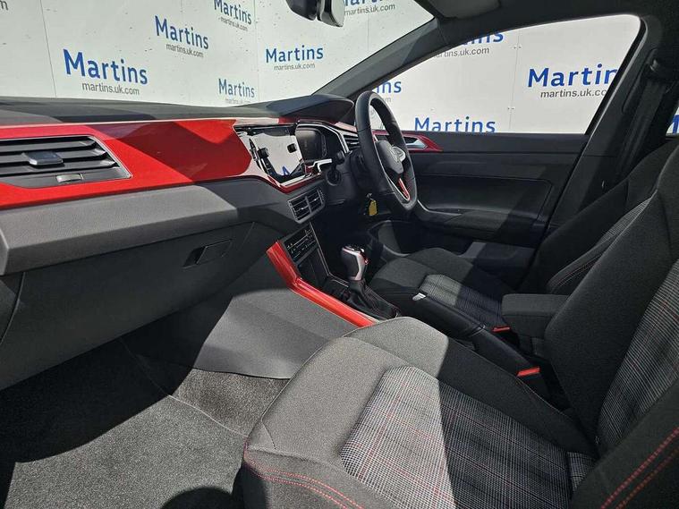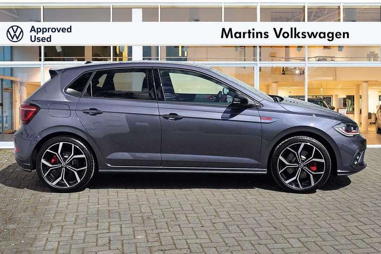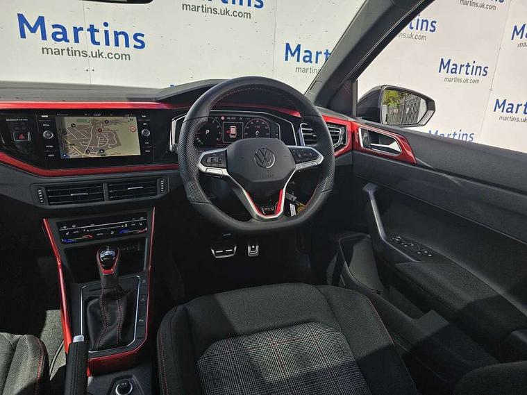 Adaptive cruise control with follow-to-stop and speed limiter, Advanced driver attention and drowsiness monitor, Bluetooth mobile phone interface, Digital Cockpit Pro with 10.25" Display, Dynamic road sign display, Eco mode, Emergency call service, Multifunction camera, Power assisted speed sensitive steering, Preparation for We connect and We connect plus, Speedo and rev counter, electronic odometer, trip, service interval display and fuel gauge, Travel Assist - Lane keeping system and traffic jam assist, Travel assist including emergency assist, Trip computer, Warning signal and warning light for front and rear seatbelts not fastened, Washer fluid level indicator, Wireless app connect, Adaptive chassis control, Front wheel drive, Heavy duty rear axle, Rear shock absorpion sports version, Sports select suspension lowered by 15mm, Start-stop system with battery regeneration (recuperation - energy recovery during braking), DAB Digital radio, Diversity antenna for FM reception, Body colour bumpers, Body colour door handles, Electric front windows, Front scuff plates in aluminium with GTI logo, Heat insulating glass windscreen, Power folding adjustable/heated exterior mirrors and front passenger exterior mirror lowering function, Rain sensor, Rear electric windows, Rear fog light, Rear side wing doors, Rear windscreen washer and wiper with interval delay, Sport bumpers with air intakes with honeycomb structure, Third brake light, Twin chrome exhaust tailpipes, 12V power socket in centre console, 2 USB-C ports in the front, 2 USB-C charging sockets on the center console in the rear, 3 rear head restraints, 60/40 split folding rear seat and rear seat bench not split, Air care climatronic air conditoning system with active combination filter and 2-zone temperature control, Black roof lining, Carpet mats, front and rear, Chrome plated radiator grille inserts, air vent surrounds and light switch surrounds, Door and side trim panel, Driver and front passenger seat height adjustment, Driver/passenger sunvisors with illuminated vanity mirrors, Front centre armrest, Front footwell illumination, Front seat backrest storage pockets, GTI sports gearshift knob in aluminium leather, Handbrake lever handle in leather, Headliner in recycled material, Isofix child seat preparation easy-fit (for two outer rear seats, and front passenger seat) compatible with I-size, LED interior light with switch off delay and dimmer, 2 reading lights front and rear, Luggage compartment cover, Luggage compartment floor, Luggage compartment lighting, Lumbar adjustment for front seats, Single front passenger seat, Stainless steel pedals, Standard pedal cluster, Three spoke leather wrapped multifunction sports steering wheel with shifting paddles, IQ LED matrix headlights pack - Polo, Light and sight pack - Polo GTI, 3 point height adj front seatbelts + pretensioners, 3x3 point rear seatbelts, ABS, Driver and front passenger airbag with front passenger airbag deactivation, Drivers and front passengers safety optimised head restraints, ESC (Electronic stability control) + EDL (Electronic Differntial lock) and ASR (Traction control), Extended and predictive pedestrian/ cyclist protection, Front and rear disc brakes with red brake calipers, Front curtain and side airbags with center airbag, Hill hold control, Manual child lock in rear doors, Two tone horn, Tyre pressure loss indicator, Alarm with interior protection, Anti-theft alarm system with interior monitoring, backup horn, and towing protection, Anti-theft wheel bolts, Electronic engine immobiliser, Chrome applications on rotary light, mirror adjustment, window regulator switches, outlet with frame in black, Low rolling resistance tyres,