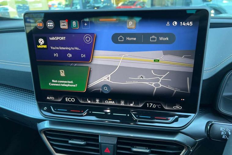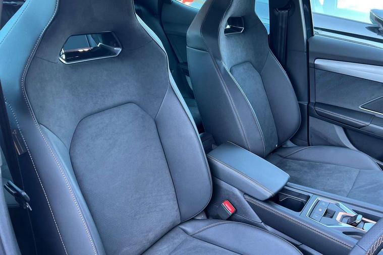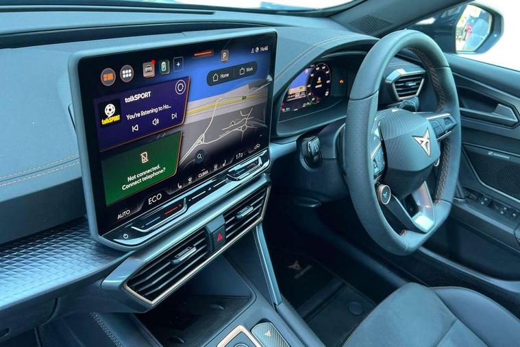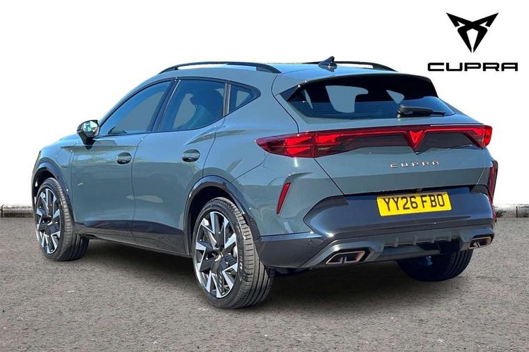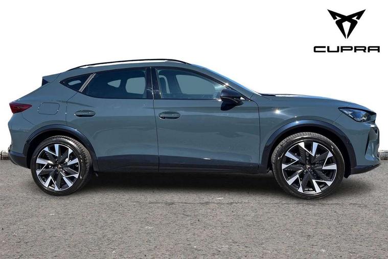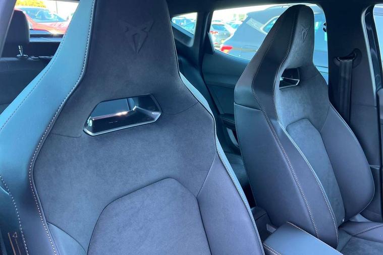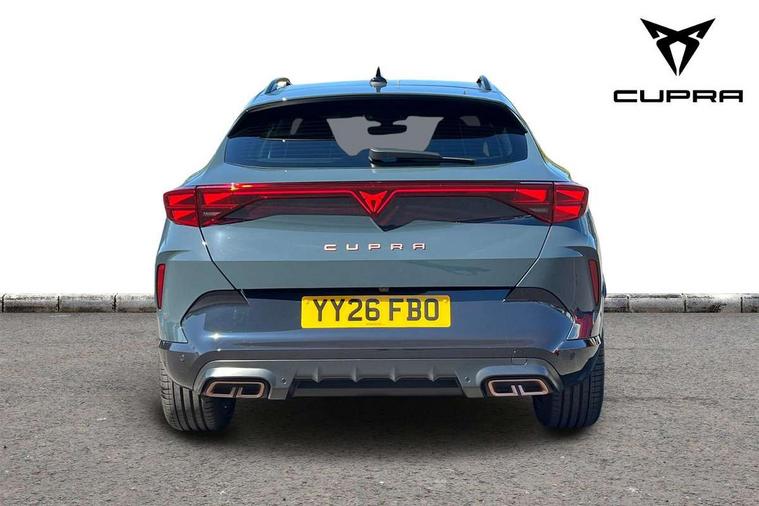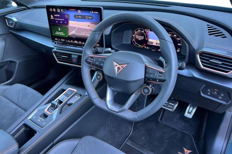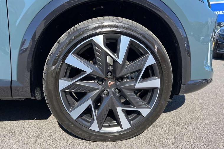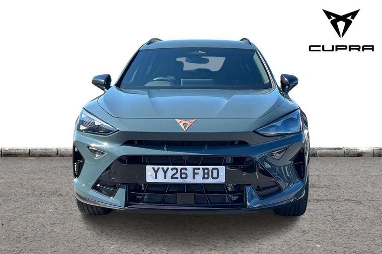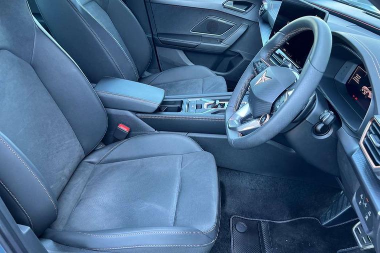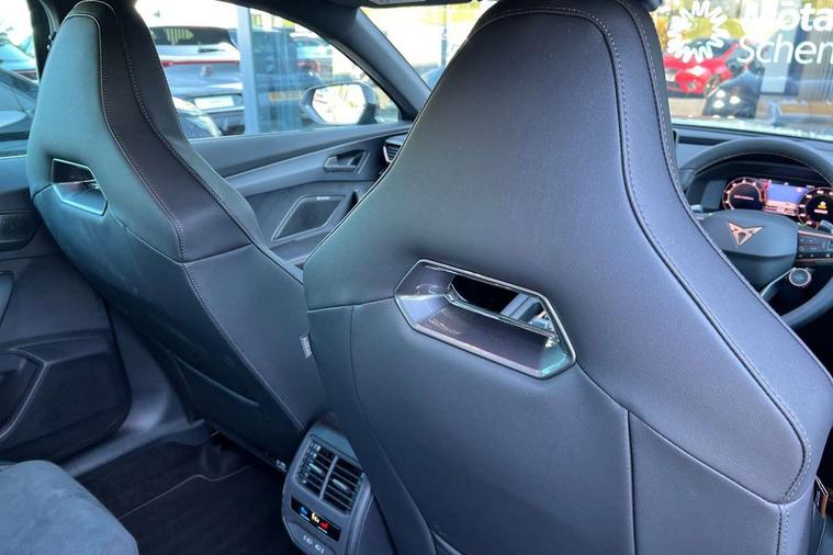 10.25" digital cockpit and configurable dashboard, Adaptive cruise control with follow-to-stop and speed limiter, Driver alert system with driver monitoring, Driving profile selection, Dynamic road sign display, Emergency steering support with turn assist, Forward collision warning with automatic braking, Front and rear parking sensors, Front cross traffic assist, Full link phone integration, Lane assist, Progressive steering, Rear view camera, RPM, trip computer, outside temp gauge, instrument light brightness, low fuel warning light, lights on reminder, gearshift indicator, Service interval indicator, Start/stop system with regenerative braking, Virtual pedal and electric tailgate, Voice control system, Wired Android Auto, Wireless apple carplay, Wireless phone charger, 10 amp mode 2 charging cable, 32 amp mode 3 charging cable, CUPRA sport suspension, Electronic locking differential and dynamic traction support, 2 front and 2 rear USB type C sockets, Media system with navigation, 12.9" touchscreen display, voice control, DAB, steering wheel mounted controls, Auto dimming rear view mirror, Body colour door handles, Body coloured bumpers, Dark grey wing mirror, Daytime running lights with automatic headlight control and Coming and Leaving home function, Door panel ambient lighting, Dynamic headlight range control, Electric front/rear windows, Electrically adjustable heated and folding door mirrors with memory function, Gloss black roof rails and window surrounds, High beam assist, LED 3rd brake light, LED front fog lamps with cornering function, LED Taillights with dynamic indicator, Rain sensing wipers, Rear diffuser with copper simulated exhaust pipes, Rear fog lights, Rear side wing doors, Rear wash/wipe, Tinted rear windows, Welcome lights (within exterior mirror housing), 12V socket, 2 front and 2 rear reading lights, 3 seat bench in 2nd row, 60/40 split rear bench seat with armrest and mechanical seat release, Black headlining, Cupra sports pedals, Dust/pollen filter, Electrically adjustable driver's seat with memory and lumbar support, Front and rear head restraints, Front centre armrest, Heated front seats, Heated supersports multifunction leather steering wheel with satellite buttons and gear shift paddles, Height/reach adjust steering wheel, Illuminated aluminium doorsteps, Illuminated interior front door sills, Illuminated sunvisor with mirror, Isofix, Leather dashboard, door insert and side trim panel, LED smart wraparound lighting, PVC/Dinamica microfiber upholstery + bucket seats, Single front passenger seat, Storage pockets on rear of front seats, Three zone climate control with control panel in rear, 3 point seatbelts on all rear seats, ABS, Brake control system - ESC and brake booster, Child proof door locks, Driver and front passenger airbags with front passenger airbag de-activation, Electronic parking brake, Front and rear disc brakes, Front side curtain airbags, Hill hold control, Public e-call, Seat belt reminder for front and rear seats, Tyre pressure monitoring system, Anti theft alarm system, KESSY Advanced - Keyless start, keyless entry with SAFELOCK, Locking wheel bolts, Warranty - 5 years/90, 000 miles, Copper and aluminium interior detailing, Breakdown and tool kit,