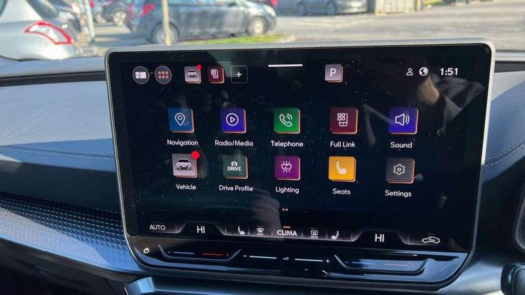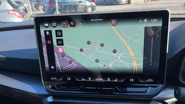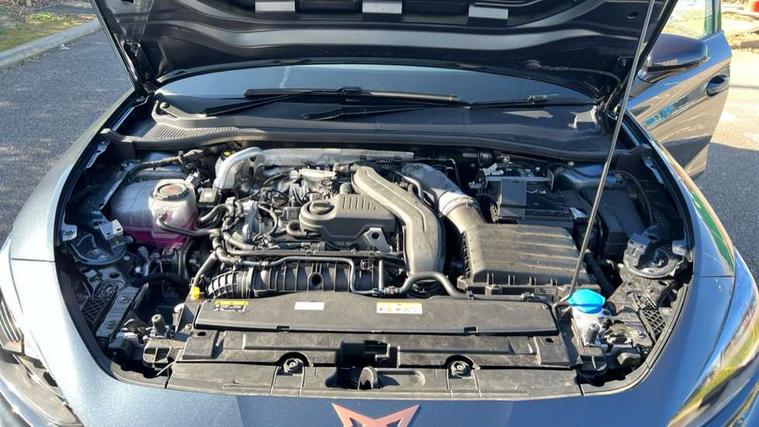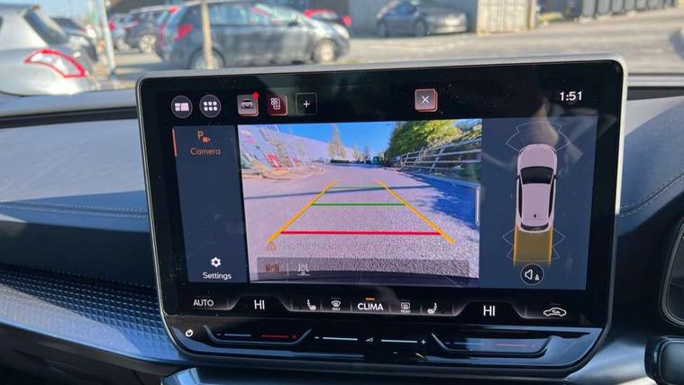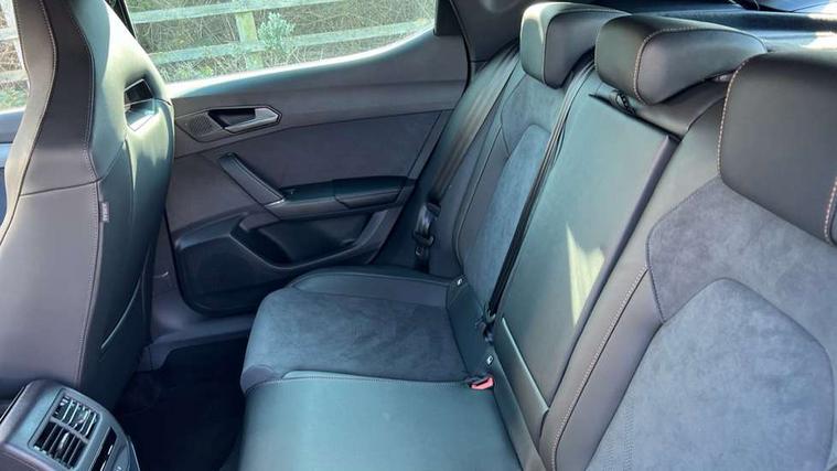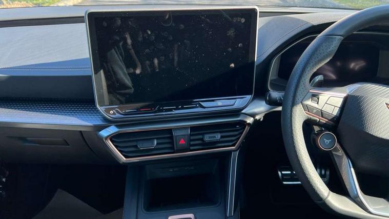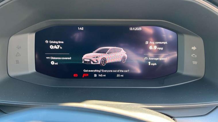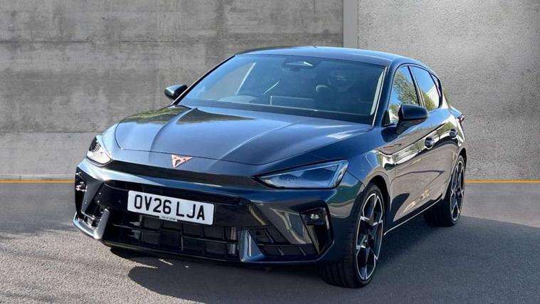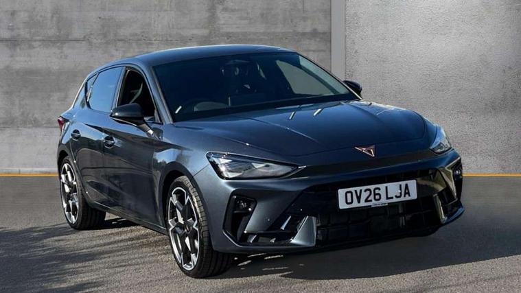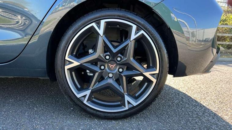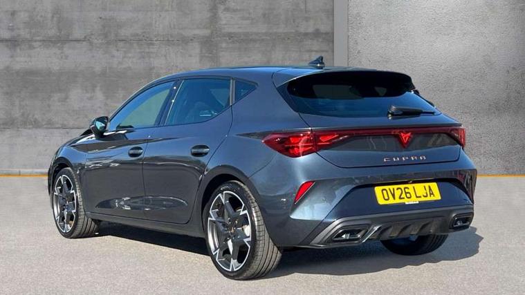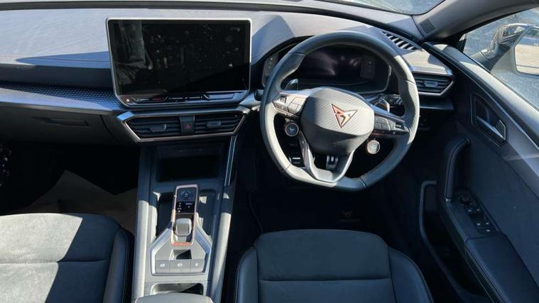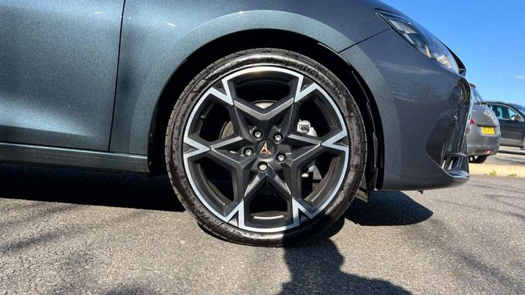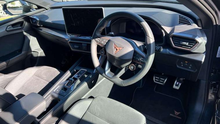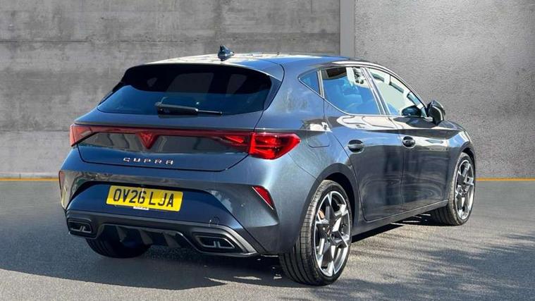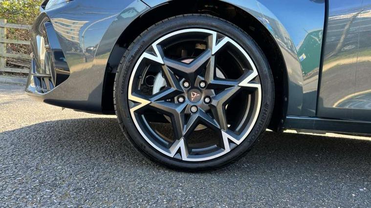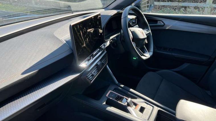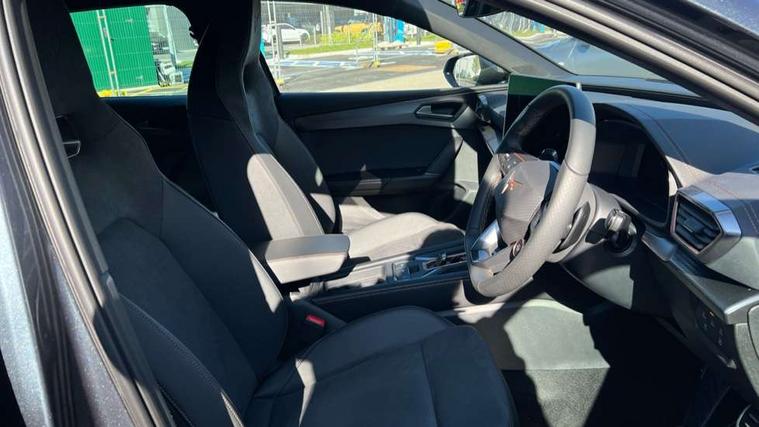 Adaptive cruise control with follow-to-stop and speed limiter, CUPRA drive profile selection with (Comfort/Performance/Individual), throttle response and gearshift mode, Digital cockpit, Driver alert system, Dynamic road sign display, E-call, Front and rear parking sensors, Front assist with forward collision warning braking reaction to vehicles, pedestrians and cyclists, Front cross traffic assist, Full link smartphone integration with Mirror Link, wireless Apple CarPlay and wired Google Android Auto, Lane assist, Lockable tailgate, PAS, Rear view camera, RPM, trip computer, outside temp gauge, instrument light brightness, low fuel warning light, lights on reminder, gearshift indicator, Service interval indicator, Start/stop system with regenerative braking, Wireless phone charger, Dynamic chassis control, Auxiliary input socket, Auto dimming rear view mirror, Body colour door handles, Body coloured bumpers, Cupra sports bumpers, Dark tinted rear windows, Electric front/rear windows, Electrically adjustable, heated and folding door mirrors, High beam assist, LED 3rd brake light, LED front fog lamps with cornering function, LED headlights with dynamic turn signals, tail lights, rear fog lights with rear coast to coast lighting, LED rear fog lamp, Rain sensing wipers, Rear diffuser with black simulated exhaust pipes, Rear side wing doors, Rear wash/wipe, Separate daytime running light with automatic headlight control and coming home feature, Welcome light with logo projector in door mirrors, 12v power supply in centre console, 3 seat bench in 2nd row, 5 headrests, 60/40 split rear bench seat with armrest, Ambient lighting (glovebox, footwell, ambient lighting multicoloured), Black headlining, Cupra sports pedals, CUPRA Supersports, heated steering wheel with satellite buttons, Dinamica cloth upholstery, Electrically adjustable driver seat and lumbar support with memory function + manually adjustable passenger seat, Folding boot cover, Four x USB Type C ports (2 in front and 2 in rear), Front and rear reading lights X 4, Front centre armrest, Heated front seats, Height/reach adjust steering wheel, Illuminated interior front door sills, Interior wraparound lighting, ISOFIX points in outer rear seats with top tether anchorage points, Single front passenger seat, Storage pockets on rear of front seats, Sunvisors with illuminated mirror, Three zone climate control, Media system plus with 12.9" display + navigation pack - Leon Cupra, 3 point seatbelts on all rear seats, ABS, Brake control system - ESC and brake booster, Child proof door locks, Cupra black brake calipers, Disc brakes in front, Driver and front passenger airbags with front passenger airbag de-activation, front side and curtain airbags, Electronic parking brake, Hill hold control, Rear disc brakes, Seat belt reminder for front and rear seats, Tiredness recognition system, Tyre pressure monitoring system, Anti theft alarm system with interior monitoring in cab, backup horn and towing protection, KESSY Advanced - Keyless start, keyless entry with SAFELOCK, Locking wheel bolts, Warranty - 5 years/90, 000 miles, Chrome and copper interior detailing, 19" Mistral machined black and copper alloy wheel with 91Y tyres, Tool kit,