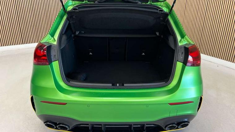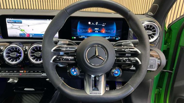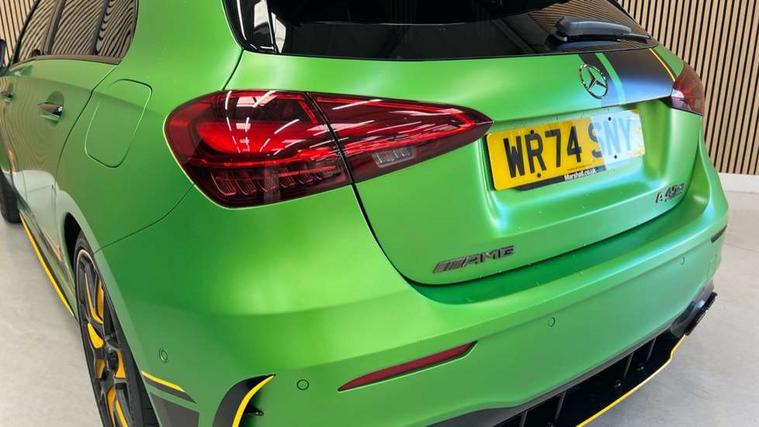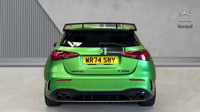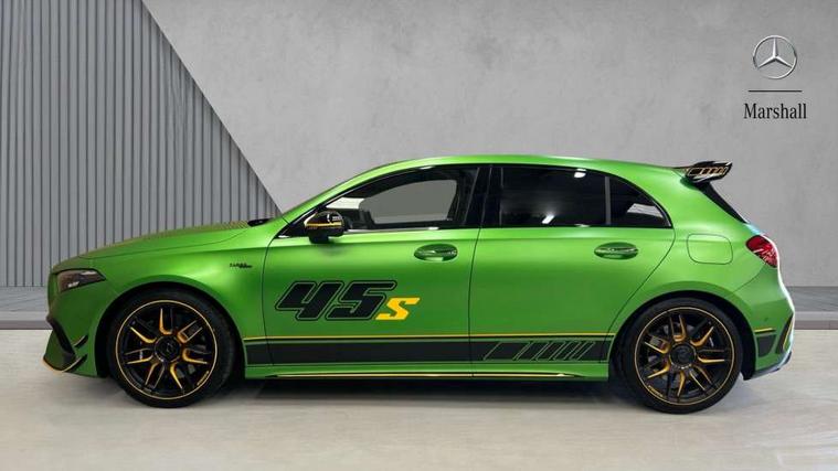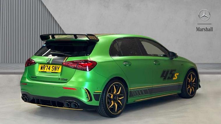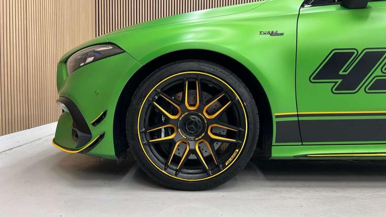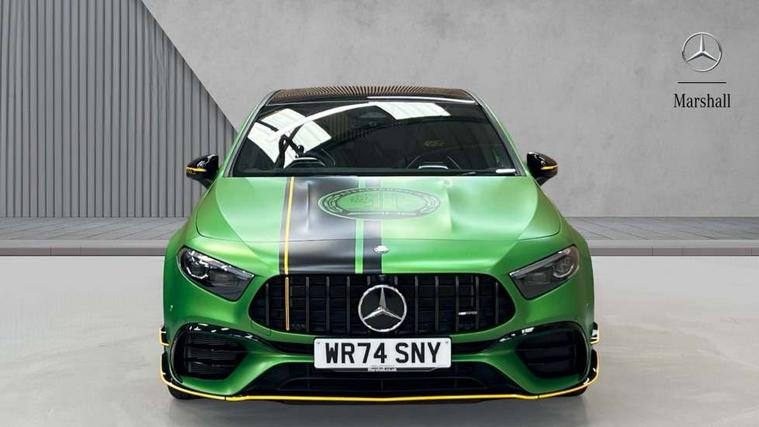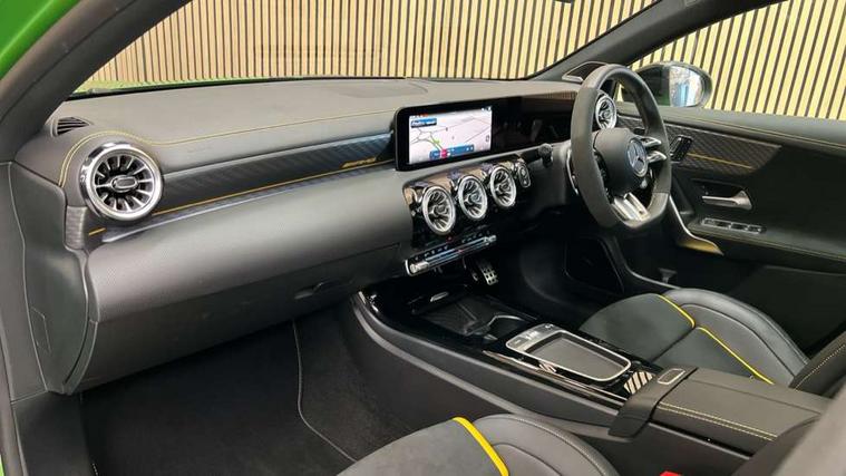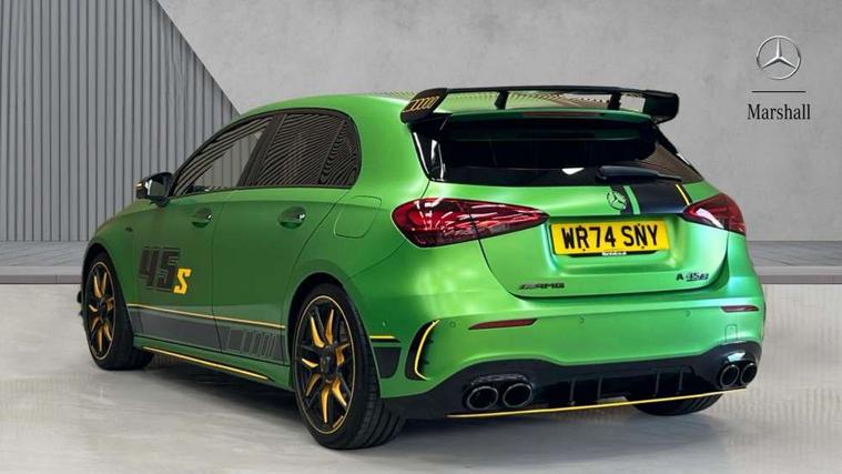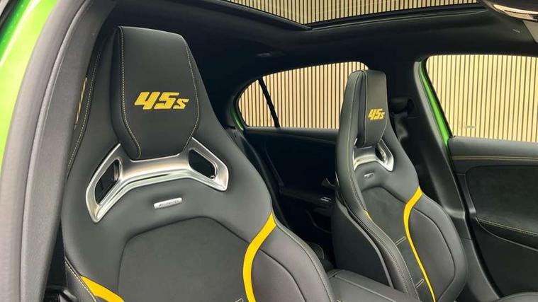 10.25 inch touchscreen central media display with AMG specific, AMG start up logo, visualisation of the AMG drive programs, vehicle and engine data, 10.25" Digital instrument cluster display screen, AMG DYNAMIC SELECT with drive modes(Slippery, Comfort, Sport, Sport+, Individual and Race) incl drift mode via steering wheel shift paddles+Race Start, AMG menu with sporty additional information - Gear indicator with yellow M symbol manual mode, Warm Up menu and Set Up menu, AMG speed sensitive steering with two sets of steering characteristics, Attention assist, Brake pad wear indicator warning light, Car wash mode, Direct steering, Dual bluetooth interfaces, ECO start/stop function, Fingerprint scanner, Fluid level warning indicator for fuel, oil, coolant and washer fluid, Fluorescent jacket for driver, Hard-disk navigation, Head up Display, Hey Mercedes Voice activation, Lamp failure indicator, MBUX augmented reality for navigation, MBUX Interior assistant, Mercedes me connect including emergency call system, accident recovery, breakdown and maintenance management, Mercedes me remote services, Outside temperature gauge, Owners manual in English, Pre-installation of private car share, Preinstallation for Mercedes Benz link, Service indicator (ASSYST), Smartphone integration with Apple CarPlay and Android auto, Speed sensitive power steering, Traffic sign assist, Trip computer in multifunction display with current consumption indicator, Wireless charging, AMG performance 4MATIC+ with torque control, AMG suspension including AMG specific axles and sporty spring/damper setup, Suspension with adaptive damping system, Burmester surround sound system (590W) with Dolby atmos, speakers - 1 center+4 doors+2 in C pillars, tweeter, subwoofer, DSP amp, burmester lettering, DAB Digital radio, MBUX multimedia system, 4 Electric Front and Rear windows, 45S logo on driver and passenger doors, Adaptive brake lights, AMG A45 S bodystyling -rear apron, four vertical fins, side sill panels, roof spoiler lip, specific front apron, diffuser look and S label on boot lid, AMG crest on bonnet, AMG magno paint, AMG real performance exhaust sound system, Beltline strips in High gloss Black, Body colour bumpers, Body colour door handles with chrome inserts, Body colour side skirt, Electric adjustable and heated door mirrors with integrated LED side indicators, Grey and yellow stripe running over the length of the car, Grey foiling on the side skirts, Headlamp assist automatic headlamp activation, Heat insulating dark tinted rear and rear side windows, Heated glass rear windscreen + timer control, LED daytime running lights, LED High level third brake light, LED tail lamp, Multibeam LED headlamps with adaptive highbeam assist and cornering function, Panoramic sliding sunroof, Privacy glass, Radio aerial, Rain sensing windscreen wipers with two sensitivity settings, Rear fog lights, Rear side wing doors, Rear windscreen wiper, Surround lighting with logo projection, Two round twin tailpipe trim elements each measuring 90 mm in diameter and AMG lettering plus ribbing on the inside of the pipe, Valve control dependent on drive program, Wider wheel arches for AMG wheels, Window line trim strip in black, Yellow accents on front apron and air fins as well as on the side skirts and rear spoiler, 3 seat bench in 2nd row, 3 Spoke flattened lower section sporty design AMG Performance steering wheel in nappa leather/microcut microfibre, 40:20:40 split folding rear seats, Air conditioning - Two zone thermotronic luxury automatic climate control with display, AMG badge in the seat backrests, AMG brushed stainless steel sports pedals with rubber studs, AMG centre console finished with trim in silver chrome, AMG floor mats, AMG sporty centre console with raised front section and integral control switched for manual transmission mode, AMG steering wheel buttons, Artico man-made leather/microcut microfibre upholstery with contrast top stitching in yellow, Automatic child seat recognition sensor, Black air vents with surround in silver chrome, Black roof lining, Electrically adjustable front memory seats including lumbar support and backrest inclination, Front centre armrest with stowage, Front seat head restraints, Height/reach adjustable steering column, Illuminated AMG front door sills with changeable cover, Interior lighting - 64 colour Ambient lighting, Interior mirror with reading lamps in black and frameless, Rear armrest with 2 cupholders, Rear head restraints, Seat occupancy sensor for front passenger seat, Silver coloured aluminium gear shift paddles on steering wheel, Single front passenger seat, Stowage compartment in centre console with retractable cover, Sunvisors with illuminated vanity mirrors, Twin front cupholders, Aerodynamic pack - A Class, AMG Driver's pack - A Class, AMG night pack - A Class, AMG night pack II - A Class Legacy Edition, AMG performance advanced seat pack - A Class, Light and sight package - A Class, Mirror package - A Class, Multi-contour seat pack - A Class, Parking pack with 360 degree camera - A Class, Seat comfort pack - A Class, USB pack plus - A Class, 3 rear 3 point seatbelts, 3 stage electronic stability programme, ABS with Brake Assist, Active bonnet, Adaptive brake assist with hold function and hill start assist, AMG high performance brake system with black painted brake callipers and white AMG lettering at the front, ventilated and perforated brake discs, Bonnet with power domes, Childproof locks manually operated for rear doors and electrically operated for rear power windows, Crash responsive emergency lighting, Driver and passenger head and side airbags, Drivers knee airbag, Dual stage driver/passenger airbags, Electronic parking brake, ESP curve dynamic assist, ESP with ASR, Exit warning, Front and rear seatbelt reminder, ISOFIX and top tether child seat fixing points in two outer rear seats, Tyre pressure monitoring system, Warning triangle and first aid kit, Window airbags, Alarm s