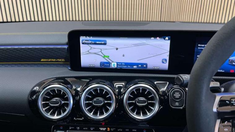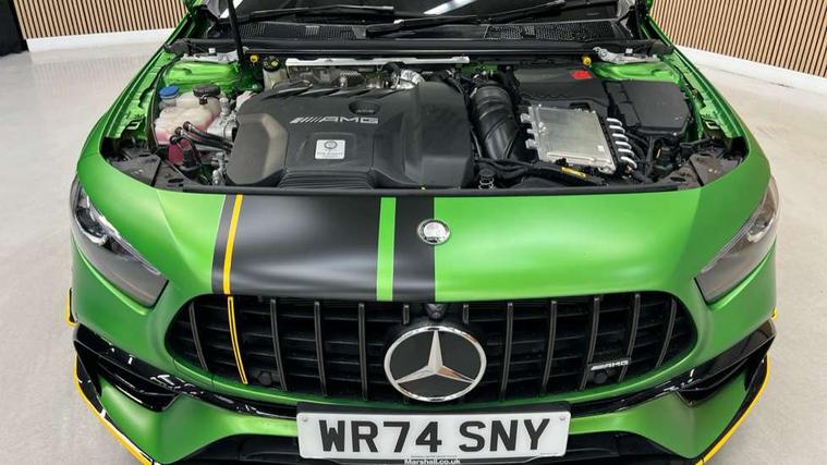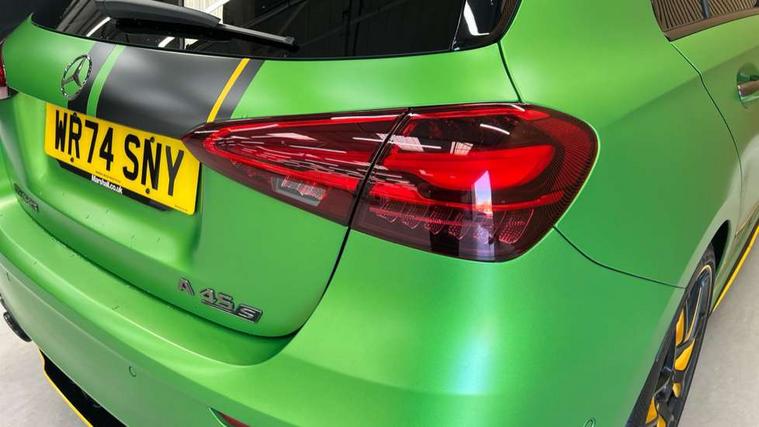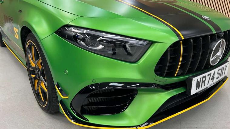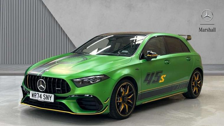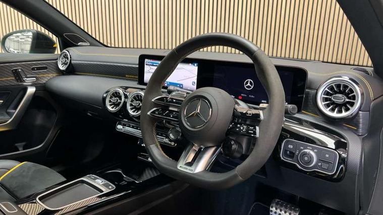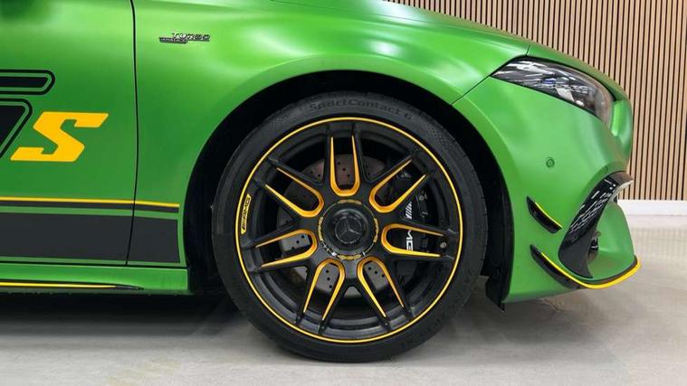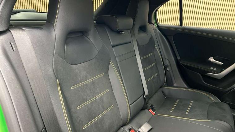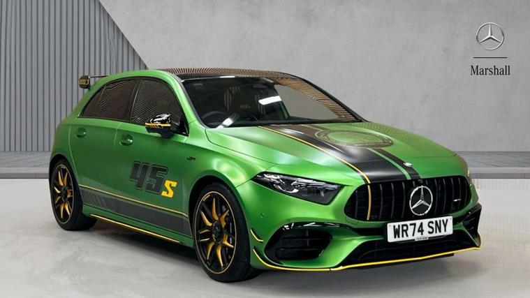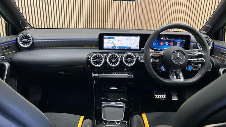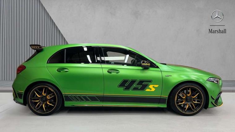 10.25 inch touchscreen central media display with AMG specific, AMG start up logo, visualisation of the AMG drive programs, vehicle and engine data, 10.25" Digital instrument cluster display screen, AMG DYNAMIC SELECT with drive modes(Slippery, Comfort, Sport, Sport+, Individual and Race) incl drift mode via steering wheel shift paddles+Race Start, AMG menu with sporty additional information - Gear indicator with yellow M symbol manual mode, Warm Up menu and Set Up menu, AMG speed sensitive steering with two sets of steering characteristics, Attention assist, Brake pad wear indicator warning light, Car wash mode, Direct steering, Dual bluetooth interfaces, ECO start/stop function, Fingerprint scanner, Fluid level warning indicator for fuel, oil, coolant and washer fluid, Fluorescent jacket for driver, Hard-disk navigation, Head up Display, Hey Mercedes Voice activation, Lamp failure indicator, MBUX augmented reality for navigation, MBUX Interior assistant, Mercedes me connect including emergency call system, accident recovery, breakdown and maintenance management, Mercedes me remote services, Outside temperature gauge, Owners manual in English, Pre-installation of private car share, Preinstallation for Mercedes Benz link, Service indicator (ASSYST), Smartphone integration with Apple CarPlay and Android auto, Speed sensitive power steering, Traffic sign assist, Trip computer in multifunction display with current consumption indicator, Wireless charging, AMG performance 4MATIC+ with torque control, AMG suspension including AMG specific axles and sporty spring/damper setup, Suspension with adaptive damping system, Burmester surround sound system (590W) with Dolby atmos, speakers - 1 center+4 doors+2 in C pillars, tweeter, subwoofer, DSP amp, burmester lettering, DAB Digital radio, MBUX multimedia system, 4 Electric Front and Rear windows, 45S logo on driver and passenger doors, Adaptive brake lights, AMG A45 S bodystyling -rear apron, four vertical fins, side sill panels, roof spoiler lip, specific front apron, diffuser look and S label on boot lid, AMG crest on bonnet, AMG magno paint, AMG real performance exhaust sound system, Beltline strips in High gloss Black, Body colour bumpers, Body colour door handles with chrome inserts, Body colour side skirt, Electric adjustable and heated door mirrors with integrated LED side indicators, Grey and yellow stripe running over the length of the car, Grey foiling on the side skirts, Headlamp assist automatic headlamp activation, Heat insulating dark tinted rear and rear side windows, Heated glass rear windscreen + timer control, LED daytime running lights, LED High level third brake light, LED tail lamp, Multibeam LED headlamps with adaptive highbeam assist and cornering function, Panoramic sliding sunroof, Privacy glass, Radio aerial, Rain sensing windscreen wipers with two sensitivity settings, Rear fog lights, Rear side wing doors, Rear windscreen wiper, Surround lighting with logo projection, Two round twin tailpipe trim elements each measuring 90 mm in diameter and AMG lettering plus ribbing on the inside of the pipe, Valve control dependent on drive program, Wider wheel arches for AMG wheels, Window line trim strip in black, Yellow accents on front apron and air fins as well as on the side skirts and rear spoiler, 3 seat bench in 2nd row, 3 Spoke flattened lower section sporty design AMG Performance steering wheel in nappa leather/microcut microfibre, 40:20:40 split folding rear seats, Air conditioning - Two zone thermotronic luxury automatic climate control with display, AMG badge in the seat backrests, AMG brushed stainless steel sports pedals with rubber studs, AMG centre console finished with trim in silver chrome, AMG floor mats, AMG sporty centre console with raised front section and integral control switched for manual transmission mode, AMG steering wheel buttons, Artico man-made leather/microcut microfibre upholstery with contrast top stitching in yellow, Automatic child seat recognition sensor, Black air vents with surround in silver chrome, Black roof lining, Electrically adjustable front memory seats including lumbar support and backrest inclination, Front centre armrest with stowage, Front seat head restraints, Height/reach adjustable steering column, Illuminated AMG front door sills with changeable cover, Interior lighting - 64 colour Ambient lighting, Interior mirror with reading lamps in black and frameless, Rear armrest with 2 cupholders, Rear head restraints, Seat occupancy sensor for front passenger seat, Silver coloured aluminium gear shift paddles on steering wheel, Single front passenger seat, Stowage compartment in centre console with retractable cover, Sunvisors with illuminated vanity mirrors, Twin front cupholders, Aerodynamic pack - A Class, AMG Driver's pack - A Class, AMG night pack - A Class, AMG night pack II - A Class Legacy Edition, AMG performance advanced seat pack - A Class, Light and sight package - A Class, Mirror package - A Class, Multi-contour seat pack - A Class, Parking pack with 360 degree camera - A Class, Seat comfort pack - A Class, USB pack plus - A Class, 3 rear 3 point seatbelts, 3 stage electronic stability programme, ABS with Brake Assist, Active bonnet, Adaptive brake assist with hold function and hill start assist, AMG high performance brake system with black painted brake callipers and white AMG lettering at the front, ventilated and perforated brake discs, Bonnet with power domes, Childproof locks manually operated for rear doors and electrically operated for rear power windows, Crash responsive emergency lighting, Driver and passenger head and side airbags, Drivers knee airbag, Dual stage driver/passenger airbags, Electronic parking brake, ESP curve dynamic assist, ESP with ASR, Exit warning, Front and rear seatbelt reminder, ISOFIX and top tether child seat fixing points in two outer rear seats, Tyre pressure monitoring system, Warning triangle and first aid kit, Window airbags, Alarm s