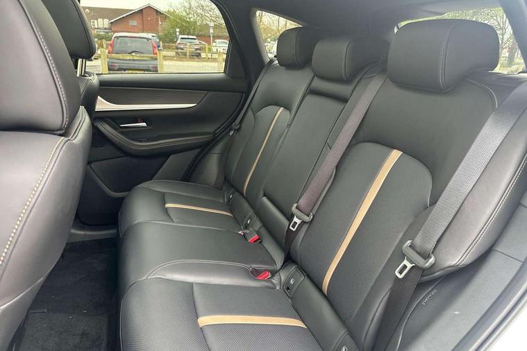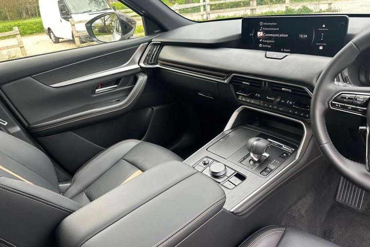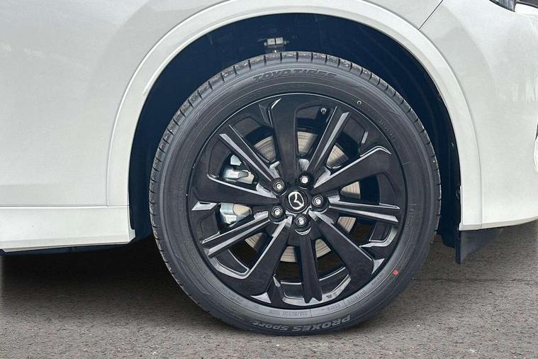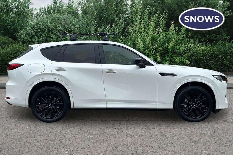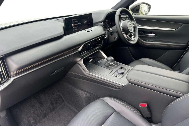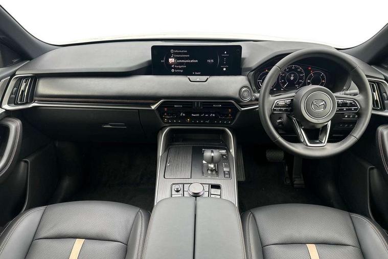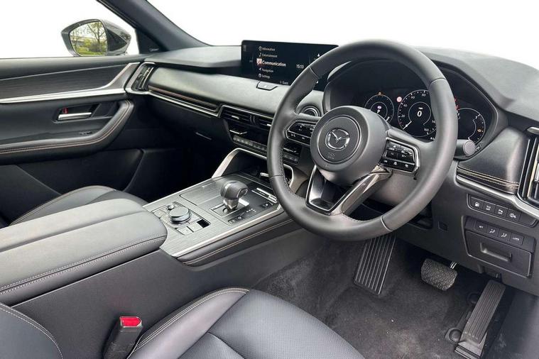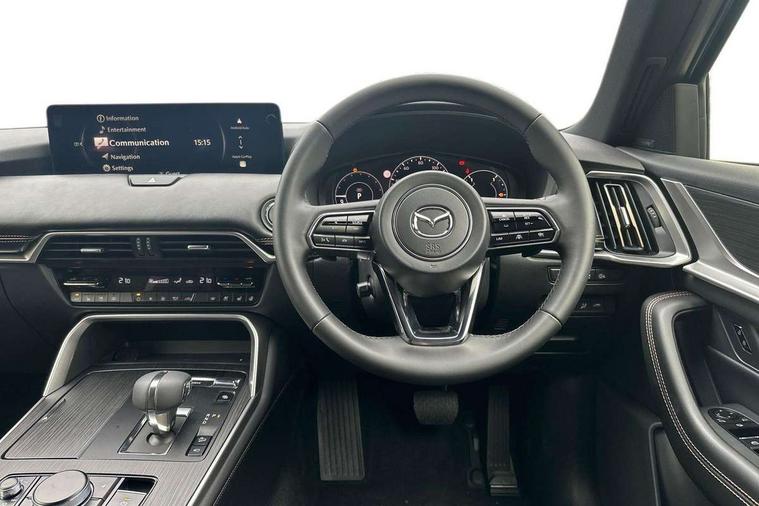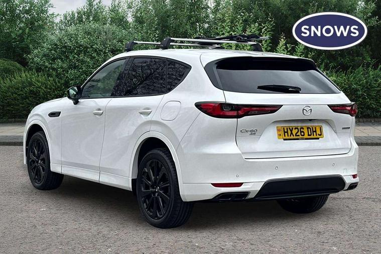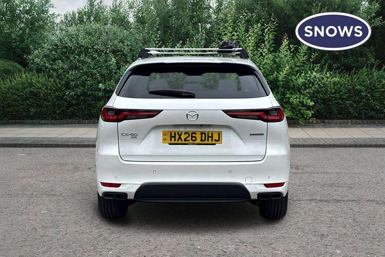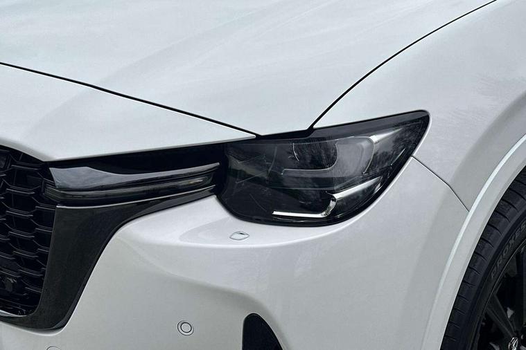 Low washer fluid warning light, 12.3" Colour entertainment centre display with mazda connect infotainment, 12.3" TFT Colour display, Adjustable speed limiter, Blind spot assist, Blind spot monitoring with rear cross traffic alert, Distance alert system, Driver attention alert system, Driver Monitoring with personal identification, E-call with GPS, Emergency lane keeping with blind spot assist, Emergency stop signalling system, Exit warning function, Front and rear parking sensors, Ingress / Egress support and automatic driver position guide, Integrated bluetooth, Intelligent speed assist, Kinematic posture control, Lane keep assist system (LAS) with Lane departure warning system (LDWS), Mazda Driver Personalisation System, Mazda hybrid navigation system with european mapping, Multimedia Commander, PAS, Power lift gate with handsfree function, Power start/stop button, Speed alert, Traffic sign recognition enhanced with mandated excessive speed warning, Trip computer, Windscreen projected colour active driving display, Wireless apple car play/android Auto, Type 2 Mode 2 cable for AC charging via UK 3-pin plug, 7.2 kw On board Charger, Mi-Drive (Normal, Sport, Off-road, Towing and EV mode), Paddle shift, Type 2 Mode 3 cable for AC charging via home or public charge points, AM/FM and DAB radio, Bose surround sound system with 12 Speaker, Bose center point, Bass match and audio pilot technology, Steering wheel mounted audio/bluetooth controls, USB-C inputs (x2 front and x2 rear), Auto dimming driver's door mirror, Automatic headlight levelling, B-pillar and C-pillar garnishes in gloss black finish, Body colour roof spoiler, Body coloured bumpers, Body coloured lower bumper, wheel arch and side mouldings, Coming/leaving home lighting function, Dark plated headlight lense, Dark plating finish signature wing in front grille, Dark plating front side garnish, Differentiated front bumper design to accentuate the intake, Dusk sensing headlights, Electric front/rear windows with one touch auto up/down, Electric panoramic sunroof, Electrically adjustable, heated auto power folding door mirrors with memory, Frameless auto dimming interior rear view mirror, Front kodo turn signal, Front wiper de-icer, Gloss black door mirrors, Headlight washers, High beam control, Honeycomb radiator grille in piano black, LED 3rd brake light, LED rear signature combination lamps, Rain sensing front wipers with adjustable sensitivity and speed, Rear side wing doors, Rear wiper, Roof pillars and roof lining finished in lighter colour to soften the overall look, Signature LED daytime running lights, Silver decoration panel, 12v power outlet - front, 12V socket in boot, 3 height adjustable rear headrests, 3 seat bench in 2nd row, 40/20/40 split folding rear seats with quick levers in the boot, Ambient lighting, Cargo net, Chrome interior trim accents with steering wheel centre bezel, surround of engine start / stop button and glove box handle, Door panel trim vinyl leather with armrest, Driver and front passenger two rear grab handles with rear coat hooks, Driver and front passenger visors with covered vanity mirror and driver ticket holder, Driver seat electric tilt, slide, recline, height and lumbar adjustment, Driver, front passenger and two rear door pockets, Driver/passenger front seatback pockets, Dual zone climate control air conditioning with rear air vents, Electric telescopic and tilt adjustment steering wheel, Featuring black vinyl leather dashboard trim with titanium coloured accents, Folding rear centre armrest with two cup holders, Front centre storage with two cupholders, Front down lamp with front and rear foot lamps, Front headrests, Front passengers seat electric slide, recline, height and lumbar adjustment, Front seat ventilation with 3-stage setting, Glovebox illumination, Heated front seats with 3 stage setting, Heated leather wrapped steering wheel, Heated outer rear seats with 3-stage setting, ISOFIX child seat anchorage points attached on outer rear seats, Karakuri tonneau cover, Leather wrapped gear shift knob, LED illumination luggage compartment, Nappa leather upholstery, Practical and spacious front centre armrest storage, Rear seat recline function for rear passenger comfort, Remote fold down rear seats, Roof lining (ceiling and pillars) - Black, Roof mounted sunglasses holder, Single front passenger seat, Convenience Pack - CX-60 PHEV, Driver Assistance Package - CX-60, 3 point ELR front seat belts x2 with pretensioners, 3 point ELR rear seat belts, Active bonnet, Anti-lock braking system (ABS), Drivers knee airbag, DSC - Dynamic Stability Control, Electronic parking brake with auto disengage function and auto hold function, Front and rear curtain airbags, Front dual stage driver and single stage front passenger airbags, Front passenger airbag cut-off switch, Front side airbags, Front smart city brake support, Hill decent control, Hill launch assist, Manual rear child locks, Seatbelt reminder for driver/front passenger and rear seats, Traction control, Tyre pressure monitoring system (TPMS), Remote central locking with deadlocking and automatic door lock when driving, Smart keyless entry, Thatcham accredited alarm and immobiliser, Mesh metal film centre console panel, 20" Black metallic alloy wheels, Emergency tyre repair kit,
