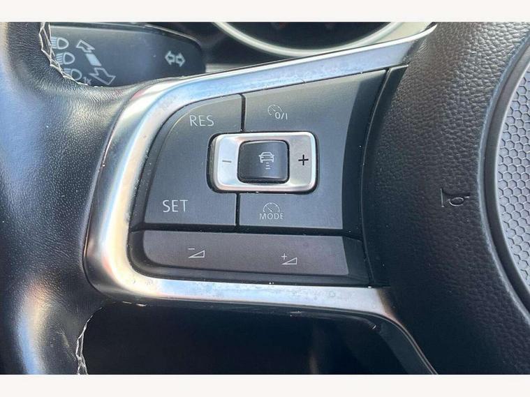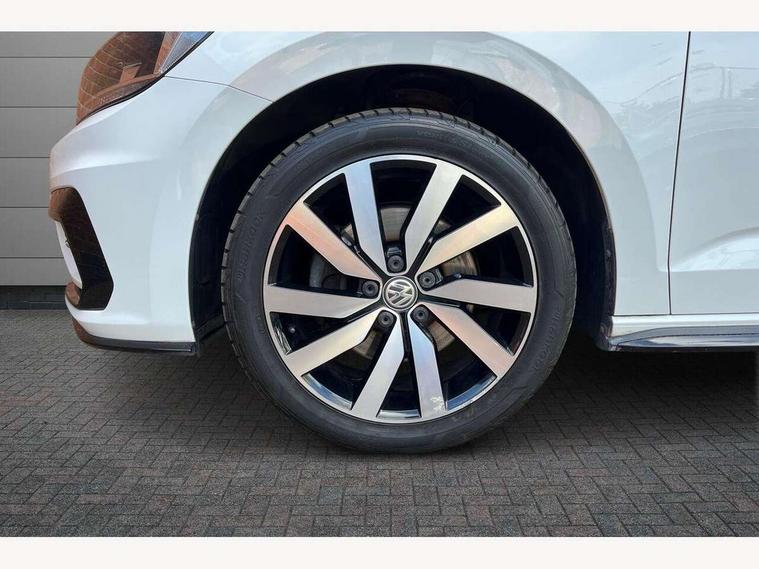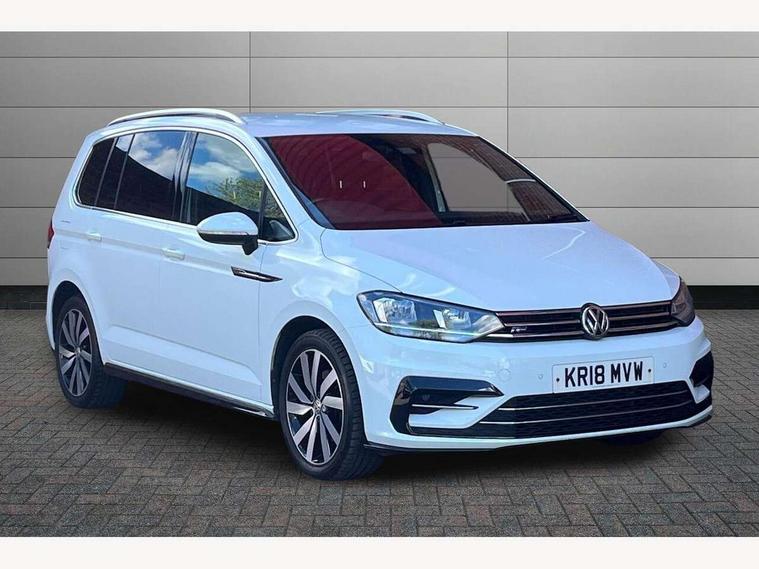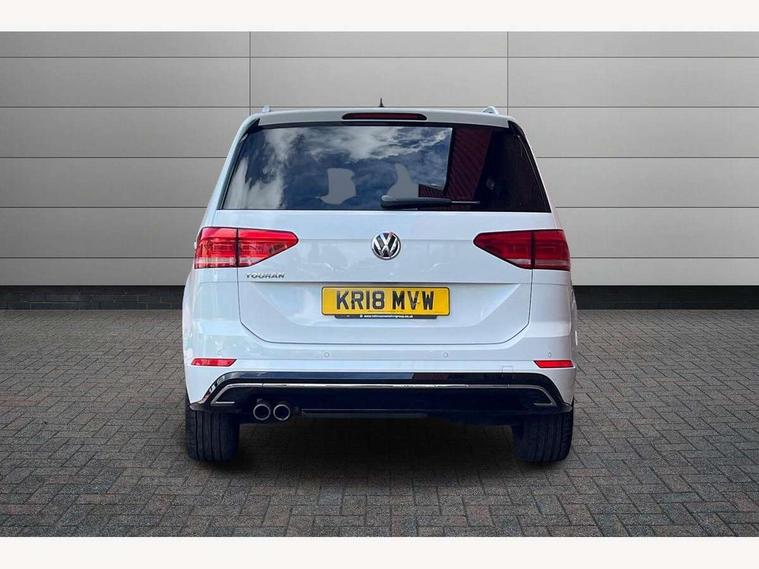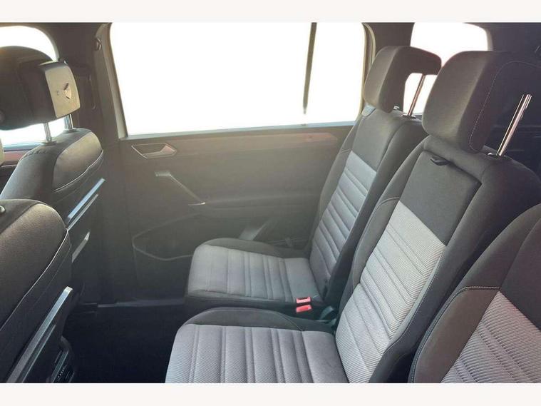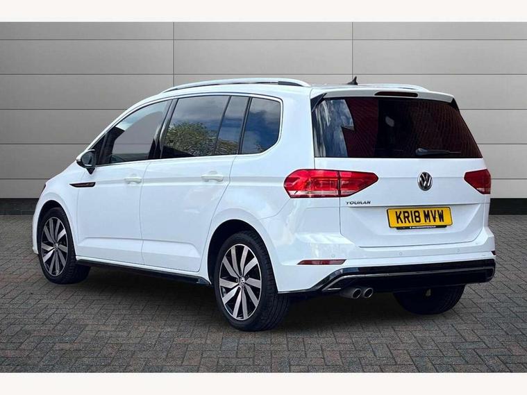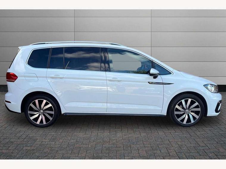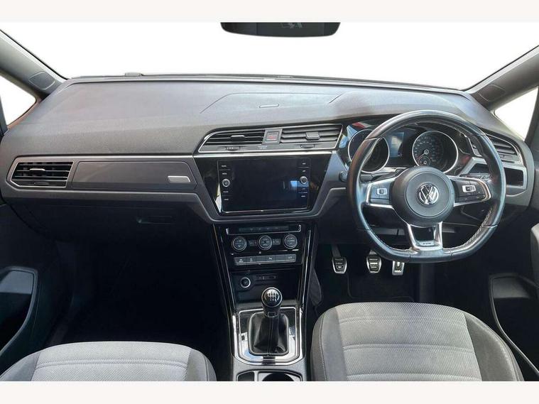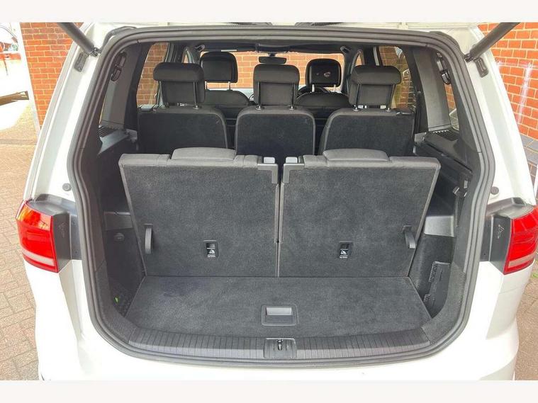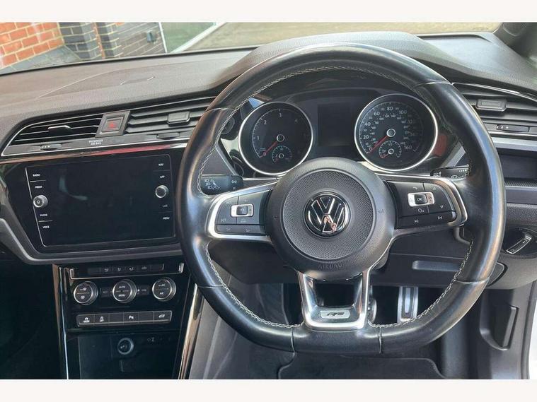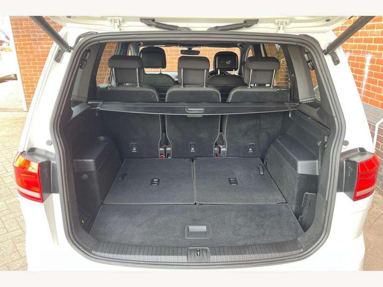 Adaptive cruise control, App-Connect, Audible lights on warning, Driver alert system, Driver profile selection, External temperature gauge, Flat tyre indicator, Speed limiter, Speed sensitive power steering, Trip and service interval display, Diesel particulate filter, 8 Speakers, DAB Digital radio, Multi device interface, SD card slot, Aerial integrated into side window, Auto dimming rear view mirror/rain sensor, Automatic coming/leaving home lighting function, Automatic headlights, Body colour door handles, Body colour door mirrors with integral indicators, Chrome fog light surround, Chrome lower front bumper insert, Chrome trimmed front air intake surrounds, Chrome trimmed radiator grille louvre inserts, Chrome trimmed side windows, Daytime running lights, Electric folding door mirrors, Electric heated + adjustable door mirrors, Front and rear electric windows, Green tinted heat insulating glass, Heat insulated tinted glass 65% light absorbing from B pillar back, Rear wash/wipe with intermittent wipe setting, Silver roof rails, Tailgate wiper- reverse gear activation, Twin chrome exhaust tailpipes, Windscreen wipers/ intermittent wipe + 4 position delay, 12V power point for Row 2, 12V socket in luggage compartment, 2 head restraints in 3rd row, 2 individual fold flat 3rd row seats, 2 three point seatbelts in 3rd row, 2nd row centre seat converts into table, 3 head restraints in 2nd row, 3 single slide/fold/removable 2nd row seats, 3 Zone electronic climate control with automatic air recirculation, 3x3 point seatbelts on 2nd row with height adjust on outer seats, 4 boot load lashing points, 4 way adjustable front head restraints, Aluminium kick plate, Ambient lighting in door trim, Black roof lining, Brushed stainless steel pedals and footrest, Centre armrest on rear seat bench, Driver and front passenger under seat drawer, Dust/pollen filters, Folding front passenger seat, Front and rear reading lights, Front centre armrest with storage compartment, Front cupholders x 2, Front height/lumbar adj comfort seats, Front passenger seat height adjust, Front seat storage pockets, Front seatback folding tables, Front/rear floor mats, Height adjustable driver's seat, Height/reach adjust steering wheel, Illuminated sun visor mirrors, Interior light with delay, Isofix on 3rd row seats, Leather gear knob and handbrake grip, Leather multifunction steering wheel, Lockable/illuminated glovebox, Luggage compartment lighting, Multi storage in passenger/luggage areas, Multi-function centre console with storage facilities, Retractable luggage cover, Split folding rear seat backrests, Storage bins on all doors, Storage in roof console, Convenience Pack - Touran, Mirror pack - Touran, R line styling pack - Touran, 3 point height adjustable front seatbelts, ABS, Automatic post collision braking system, Door open warning reflectors, Driver/Front Passenger airbags, Driver/Passenger whiplash optimised head restraints, Drivers knee airbag, EDL + ASR, Electrically operated child locks on rear doors, Electronic parking brake, ESP, Front and rear (row 2) curtain airbags, Front assist including city emergency braking, Front seat side impact airbags, Hill hold control, Hydraulic Brake Assist (HBA), Loose wheel warning function, Manual passenger airbag deactivation function, Pre crash system, Seatbelt warning lamp and buzzer, Traction control, Warning triangle, Alarm, Electronic engine immobiliser, Remote central locking with 2 remote folding keys, Black lead grey decorative inserts dash and door panel, Chrome plated instrument surrounds, Embroidered emblems to headrestraints, 18" Marseille alloy wheels with mobility tyres and anti-theft wheel bolts, Tyre repair kit,