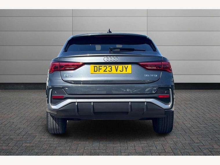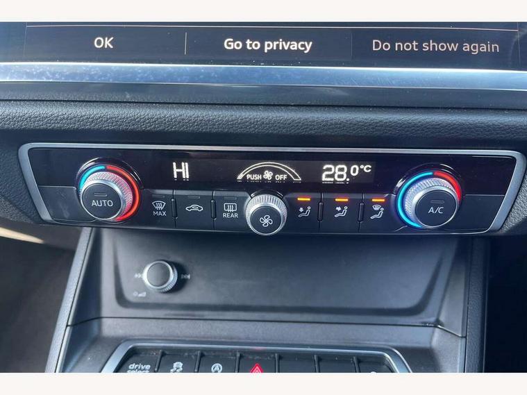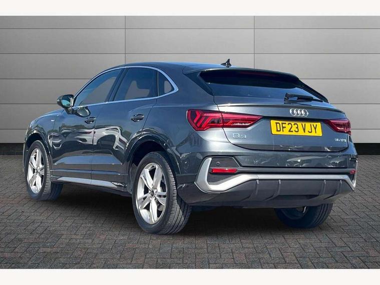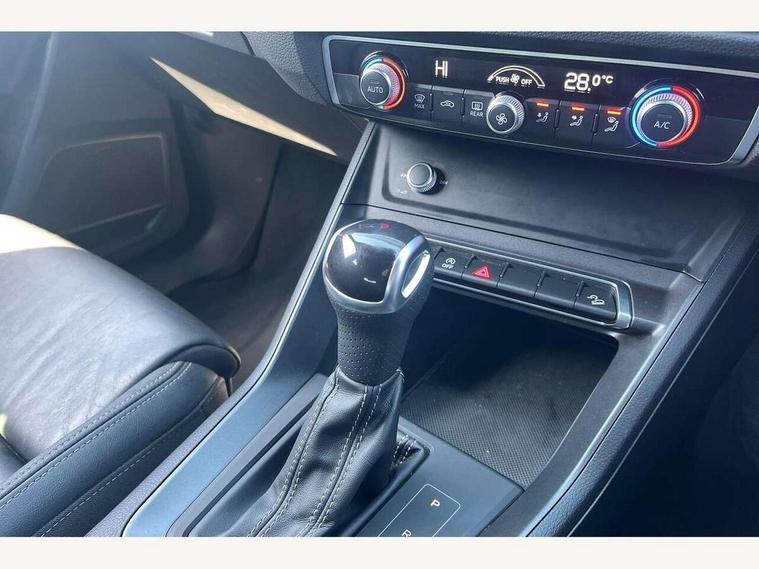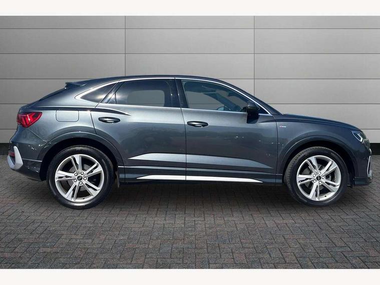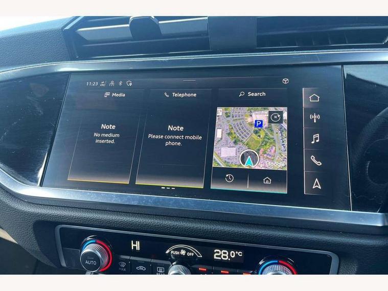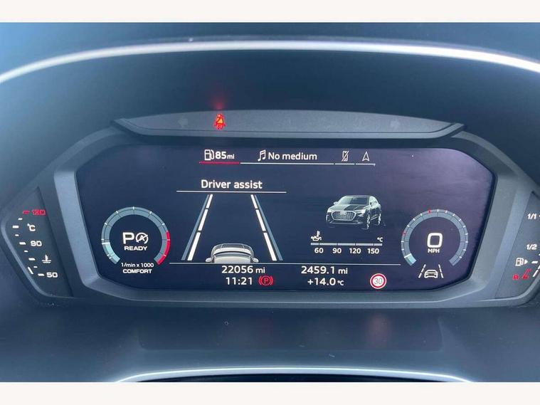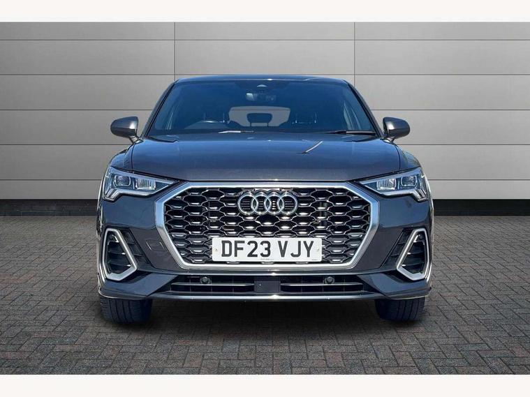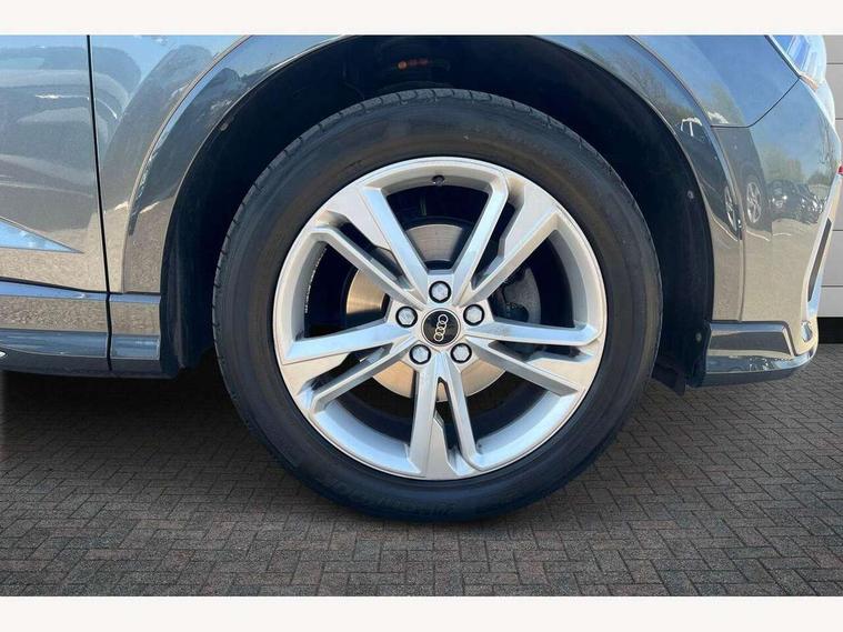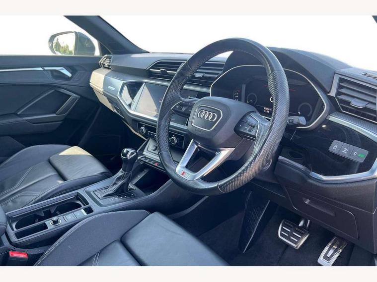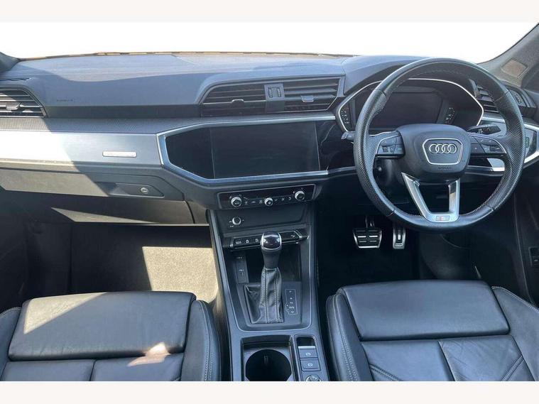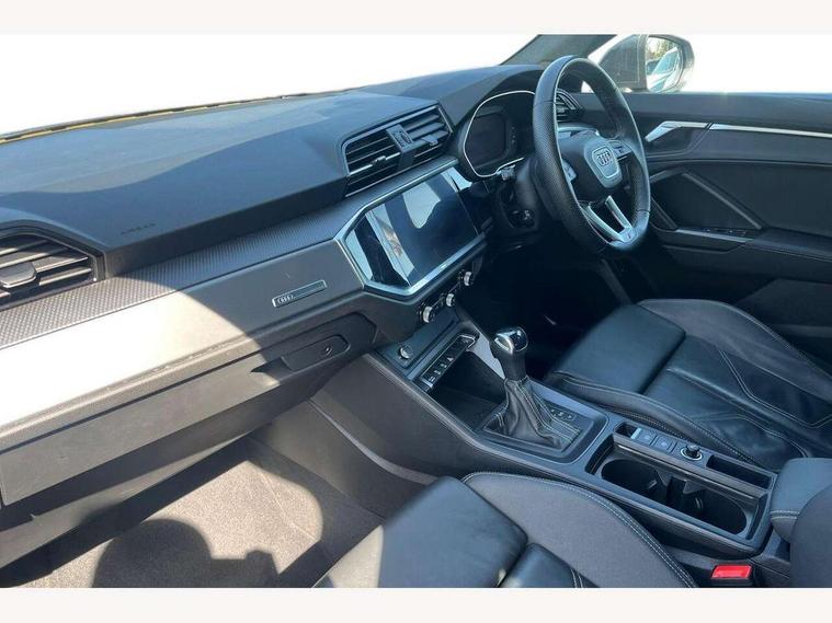Audi drive select, Audi lane departure warning, Audi Virtual Cockpit - 10.25" display, Bluetooth interface, Camera based traffic sign recognition, Legal emergency call, MMI Navigation Plus with high resolution 10.1 inch touchscreen colour display, Power operated tailgate, Progressive steering, Service interval indicator, Smartphone interface includes wireless Apple carplay/Android Auto, Start stop system with recuperation, Voice control system with natural language interaction, Sports suspension, 2 USB-C ports with charge and data functions, 6 passive loudspeakers, DAB digital radio module, Acoustic windscreen, Aluminium window trim, Auto dimming frameless rear view mirror, Diffuser grille in grained matt black, Diffuser trim in selenite silver, Electrically folding, adjustable and heated door mirrors with integrated LED side indicators and kerb view function for passenger side, Front and rear electric windows, Front fog lights, Front side air inlets in selenite silver, Front underbody protection in manhattan grey paint finish, Grille surround in aluminium silver matt, High gloss black finish B and C pillars, LED Dynamic rear indicators, LED headlights with LED daytime running lights, LED rear lights, LED third brake light, Privacy glass dark tinted rear and rear-side windows (from B-pillar backwards), Radiator grille in anthracite black with inlay in matt aluminium silver, Rain and light sensors, Rear side wing doors, Rear underbody protection in matt black, Rear wiper, S line badges on front wings, S line front and rear bumpers and side skirts in contrasting Manhattan grey paint finish, Side skirt insert in matt Platinium grey, Variable front intermittent wipers, 12V socket in rear centre console, 3 seat bench in 2nd row, 3 spoke leather multifunction steering wheel features S badging and grips in perforated leather with contrast stitching, 40:20:40 folding with manual adjustment for 60:40 forwards/backwards position and backrest angle, Adjustable rear seat bench/backrest with centre armrest and cupholder, Black cloth headlining, Dual zone electronic climate control, Front and rear black floor mats with contrast stitching, Front and rear headrests, Front and rear roof module including reading lights, Front centre armrest, Glove compartment lighting, Height and reach adjustable steering wheel, Illuminated door sill trims with S logo, ISOFIX child seat mounting for front passenger with airbag deactivation and outer rear seat including top tether attachment point for outer rear seats, Luggage compartment light right in white, Luggage compartment sill protection in stainless steel, Manual front seats with height adjustment, Perforated leather gearknob, Single front passenger seat, Stainless steel pedals, Ambient lighting pack - Q3, Non smoking pack - Q3, 3x3 point rear seatbelts, 6 airbags - Driver, front passenger, curtain and side windows, Audi pre-sense front with pedestrain and cyclist recognition, Electrically operated child locks on rear doors, Electromechanical parking brake, Electronic stabilisation control including ABS, ASR and EDL, Front seatbelt reminder, Hill descent control, Hill hold assist, Pre sense basic, Seatbelt monitoring, Tyre pressure warning, Warning triangle and first aid kit, Anti theft alarm, Anti theft wheel bolts, Immobiliser, Remote central locking, Aluminium look interior elements, Black dashboard, Dark matt brushed aluminium inlay, Detail dashboard around MMI touch colour display in glass look, black with surround in aluminium look, Leatherette door armrest,