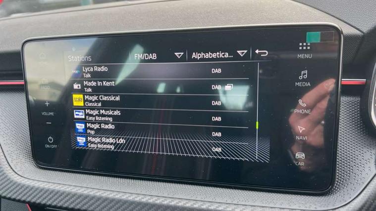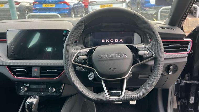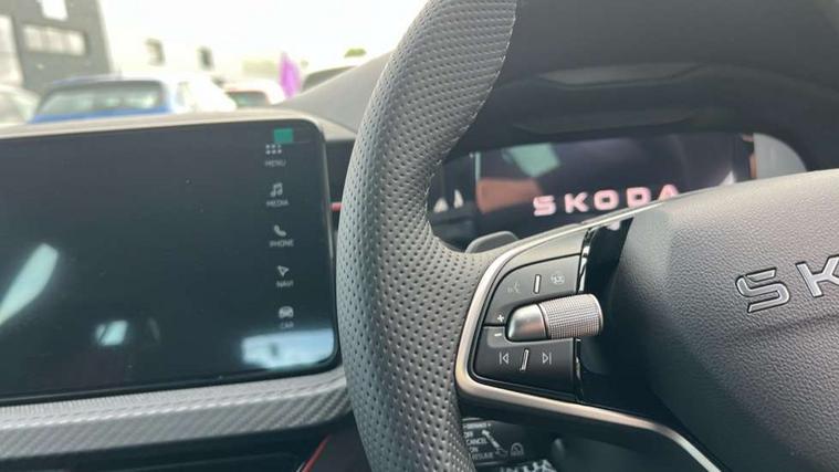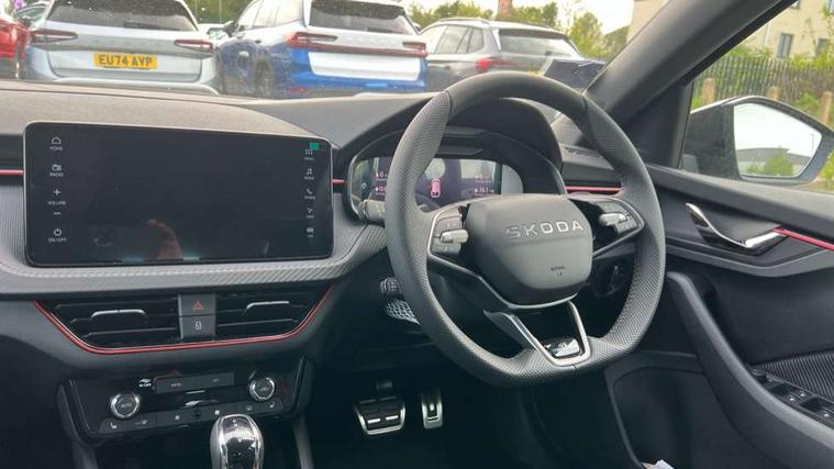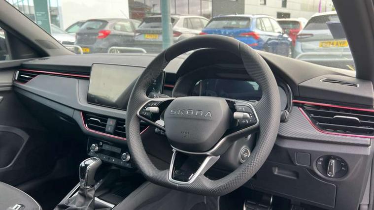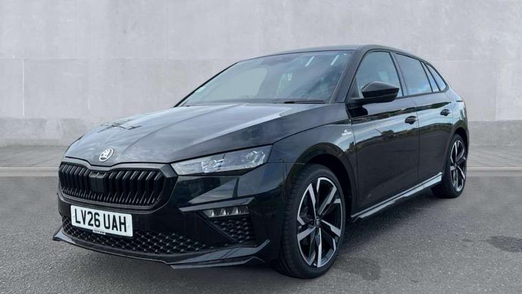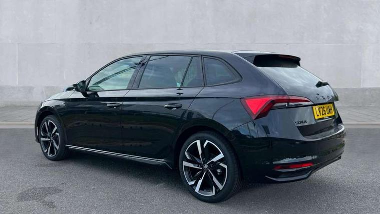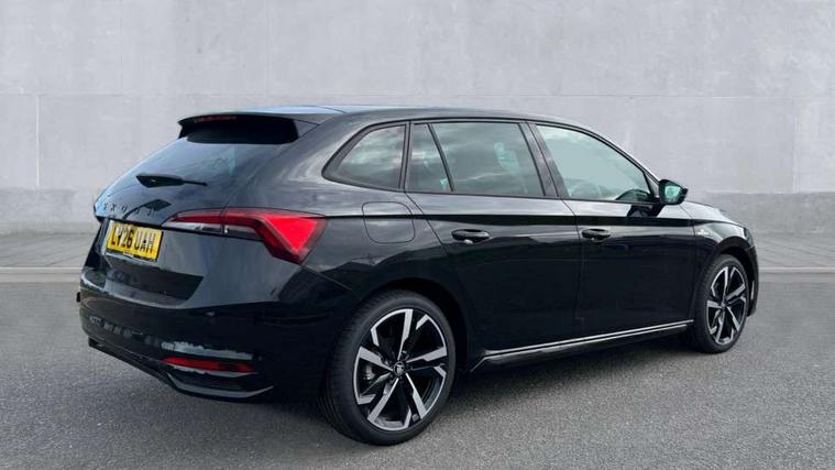 Advanced driver attention and drowsiness monitor, Bluetooth, e-Call (emergency call), Front assist system, PAS, Rear parking sensors, Rear view camera, Speed limiter, Tailgate, Traffic sign recognition, Virtual Cockpit - 10.25" digital display, Voice control system, Wireless smartlink, Drive mode select with Sport Chassis Control and ECO mode, 4 USB C ports, 9.2" Skoda navigation display, DAB radio, Auto dimming rear view mirror, Automatic headlight control with manual coming and leaving home feature, Automatic intermittent wipers, Black door mirrors, Black lettering on boot lid, Black radiator grille, Black rear diffuser, Black roof spoiler, Black window frames, Body colour bumpers, Body colour door handles, Extended tailgate glass, Front and rear electric windows, Heated rear window, LED 3rd brake light, LED daytime running lights, LED high beam, LED low beam, Light sensors, Monte carlo plaque, Panoramic glass roof, Privacy glass, Rear LED fog light, Rear side wing doors, Rear wiper, Tinted windows, Unique dark chrome design logo on alloy wheels, 12V socket in luggage compartment, 3 seat bench in 2nd row, Aluminium pedals, Ambient lighting in white/red, Black / White armrest stitching, Black roof headlining, Cargo elements, Chrome inner door handles, Door inserts in art.leather carbon, Driver and passenger sun visors with vanity mirror, Dual zone climate control, Front and rear roof lights, Front centre armrest, Front head restraints, Height adjustable driver seat, Height adjustable passenger seat, Ice scraper, Illuminated glove compartment, Inner circulation control with pollen filter, ISOFIX for front passenger seat, Isofix preparation for back seats, Leather gearknob and handbrake lever, Luggage net under rear parcel shelf, Manual lumbar support for front seats, Monte Carlo cloth upholstery, Net package and top tether hooks in boot space, Pocket on the back of both front seats, incl. mobile phone pockets, Rear centre armrest, Red hotstamping, Single front passenger seat, Skoda lettering on steering wheel, Sport seats, Textile floor mats, Third rear headrest, Ticket holder, Top tether for front passenger seat, Umbrella in driver's door, Light and view plus pack - Scala, 3x3 point rear seatbelts, ABS, Child locks, Curtain airbags and front side airbags, Disc brakes, Driver and front passenger airbags, ESP, Hill hold control, Manual leather parking brake, One tone horn, Passenger airbag switch off function, Seatbelt reminder for driver and front passenger, Tyre pressure monitoring system, Anti theft alarm system with interior monitoring, backup horn and towing protection, Anti-theft wheel bolts, Remote central locking with 2 remote folding keys, SAFE function for remote central locking, Carbon effect decorative inserts, 18" Ursa black diamond cut alloy wheels,