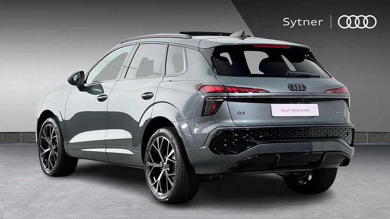 Adaptive cruise control, Audi connect emergency call and service, Audi connect remote and controls, Audi drive select (Balanced/individual, efficiency, comfort, dynamic and Offroad+), Audi virtual cockpit plus - 11.9" display, Bluetooth interface, Camera based traffic sign recognition, Driver attention and fatigue monitor with driver monitoring, Emergency assist, Front cross traffic assist, Panoramic curved display with 12.8" MMI navigation plus and MMI touch, Park assist plus with parking system and 360 display, Phonebox light with wireless charging, Projection of a black ice warning, Reversing camera, Smartphone interface includes wireless Apple carplay/Android Auto, Start/stop system, Swerve assist and turn assist, Traffic sign based speed limiter, Voice control system with natural language interaction, Petrol Particulate Filter, 2 USB-C ports with charge and data functions, Audi sound system with 10 loudspeakers, subwoofer, 8 channel amplifier with 260 watts, DAB digital radio module, Acoustic glass for front door windows, Acoustic windscreen, Advanced dynamic light scenario of the coming home/leaving home function, All weather light, Aluminium window trim, Audi Q3 lettering on the B-pillars, Auto dimming door mirrors, Auto dimming rear view mirror, Automatic dynamic headlight range control, Contrasting finish in volcano grey, Cornering light, Digital daytime running lights with a choice of 4 digital light signatures, Digital matrix LED headlights, Dipped beam, Dynamic indicators, Electrically folding, adjustable and heated door mirrors with integrated LED side indicators and kerb view function for passenger side, Full paint finish, High resolution main beam, Illuminated door sills with aluminium inserts at the front with S logo, Intersection light, Lane light with side assist and direction indicator, LED third brake light, Loading sill protector in stainless steel, Manoeuvring light, Motorway light, Orientation light with lane departure warning, Position light, Privacy glass - dark tinted rear window, rear door and side windows, Projection light in the exterior mirrors - Projects a graphic element onto the ground, Q3 badging on the rear, Rain and light sensors, Rear side wing doors, Rear window, rear door windows and rear side windows in clear glass, Rear wiper, Sports bumpers, Turning light, 3 seat bench in 2nd row, 3 spoke heated flat top and bottomed leather multi function sport steering wheel with gear shift paddles and "S" badging, 3-zone deluxe automatic air conditioning, 4 way lumbar support for the front seats - electric with horizontal and vertical adjustment in four directions, Black cloth headlining, Front and rear floor mats, Front and rear headrests, Front centre armrest, Heated front seats, Height and reach adjustable steering wheel, Interior storage compartment, Luggage compartment lid, electrically opening and closing, Manual front seats with height adjustment, Rear seat bench plus with split folded 40:20:40, Single front passenger seat, Stainless steel pedals, Steering wheel operating unit, gloss black, Storage compartment in front centre console, Ambient lighting package pro - Q3, Black styling pack with black door mirrors - Q3, Driver assist pack - Q3, Dynamic pack - Q3, 3x3 point rear seatbelts, Convenience key with safelock, Driver and front passenger airbag with passenger airbag deactivation, Electromechanical parking brake, Electronic stabilisation control including ABS, ASR and EDL, First aid kit with warning triangle and high visibility vests, Front emergency brake assist, Hill hold assist, i - Size child seat mounting on the front passenger side and i - Size and top tether on the outer rear seats, Power operated child locks, Seatbelt monitoring, Tyre pressure loss indicator, Anti theft wheel bolts, Remote central locking, Thatcham approved category 1 anti theft alarm, Anthracite american whitewood natural inlay, Interior elements in dinamica microfibre, Interior trims in aluminium look, Tool kit and Jack,