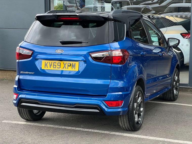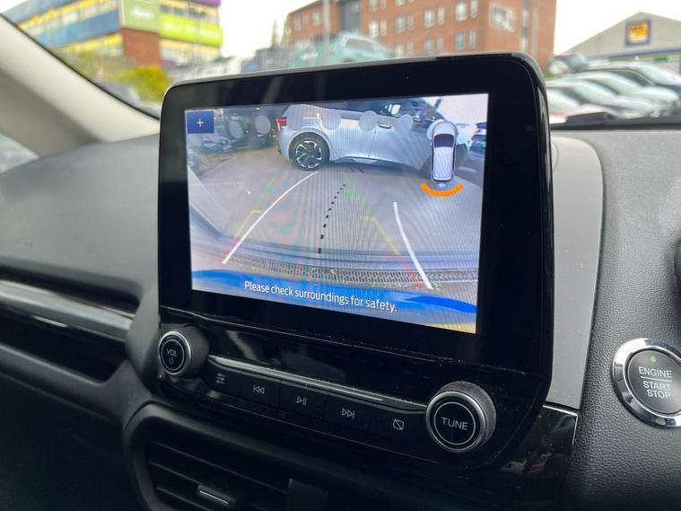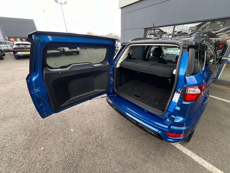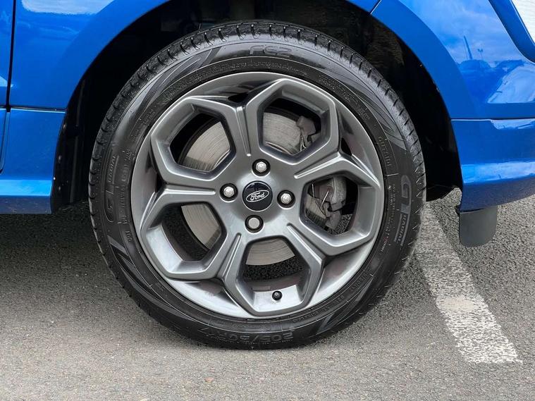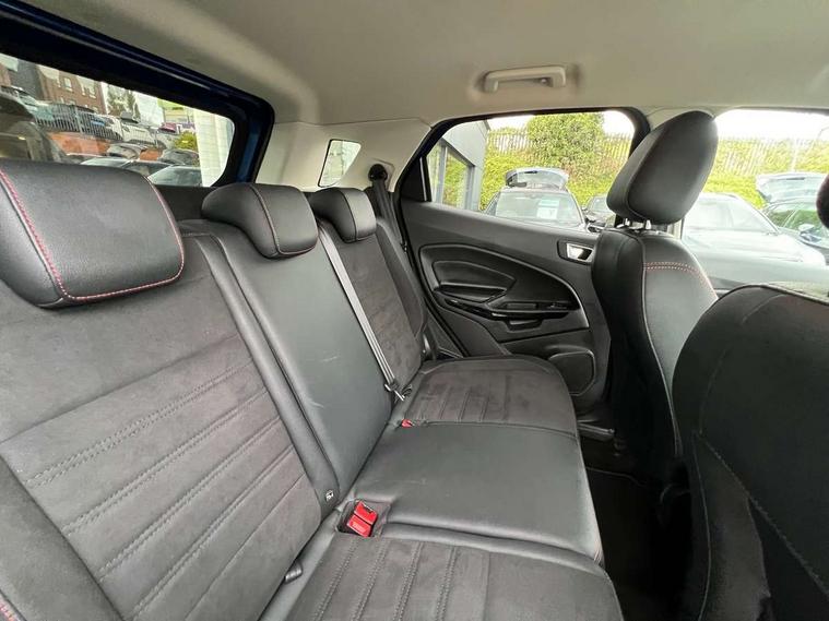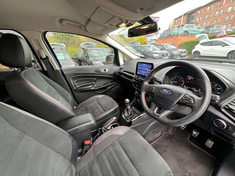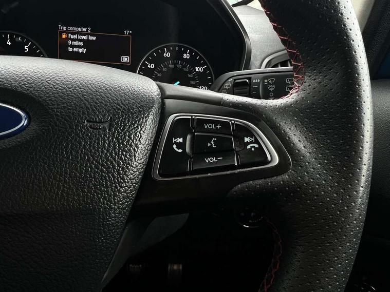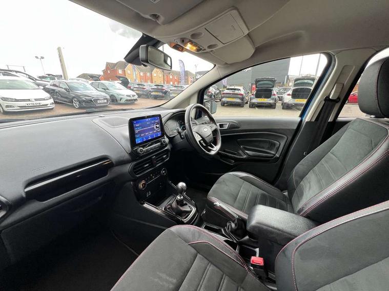Cruise control, Easy fuel capless refuelling system, PAS, SYNC 3 nav system with DAB radio, 8" screen, voice control, emergency assistance, Apple car play/Android auto, 2x USB, Ford pass connect, Trip computer, Sports suspension, Steering wheel mounted audio controls, 'Quickclear' heated windscreen/heated washer jets, Auto dimming rear view mirror, Automatic headlights, Black roof rails, Body colour door handles, Body coloured bumpers, Electrically adjustable and heated door mirrors, Front door threshold plates with ST-Line logo, Front fog lights, Headlight levelling control, Large rear spoiler, Power foldable door mirrors with puddle lights, Power front and rear windows with global opening/closing, Rain sensing front wipers, Rear wiper, ST-Line body styling kit, ST-Line front grille, 12V socket in front and rear, 60/40 split rear seats, 7 shade adjustable ambient lighting, Centre console with sliding front armrest, Cooled glovebox, Courtesy lights with map reading light, Driver seat height/lumbar adjust, Driver's side glovebox, Driver/passenger sunvisors and lidded vanity mirrors, EATC - Electronic Auto Temperature control, Folding grab handles, Front head restraints, Front seat back map pockets, Front/rear floor mats, Illuminated glovebox, Illuminated luggage compartment, Isofix system on outer rear seats, Leather steering wheel/gearshift/handbrake lever with red stitching, Luggage compartment carpet, Overhead console with sunglasses holder, Partial leather upholstery, Rake adjustable rear seats, Reach + rake adjustable steering column, Rear headrests, Stainless steel sports pedals, Steering wheel with chrome inserts, Storage drawers under front seats, Tie down hooks, Variable boot floor, Rear view camera pack - Ecosport, 3x3 point rear seatbelts, ABS, Child locks on rear doors, Curtain airbags, Driver airbag, Drivers knee airbag, Electronic Stability Programme with hill launch assist, Emergency brake assist, Front passenger airbag deactivation, Front side airbags, Passenger airbag, Seatbelt reminder for driver and front passenger, Traction control, Tyre pressure monitoring system, Immobiliser, MyKey system, Remote central locking, Thatcham 1 volume sensing alarm, Tyre inflation kit,