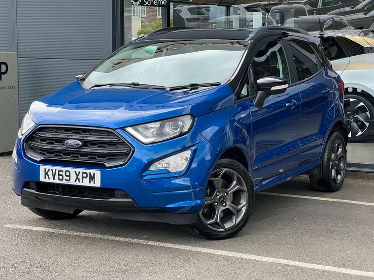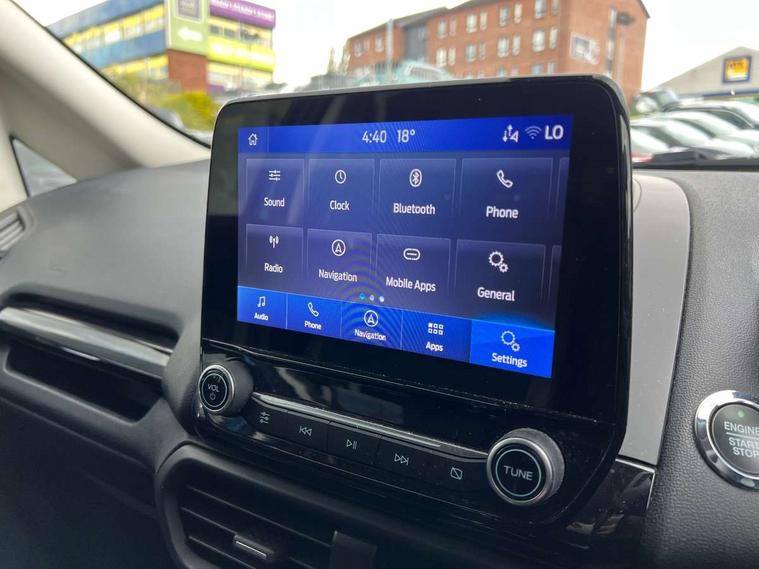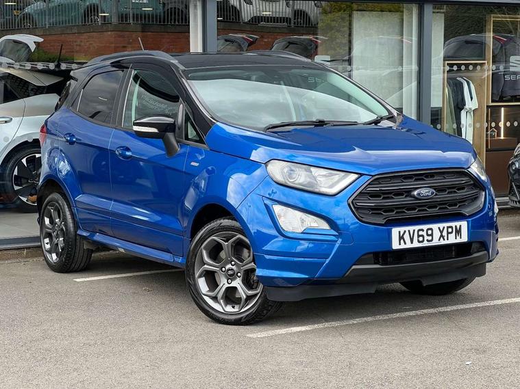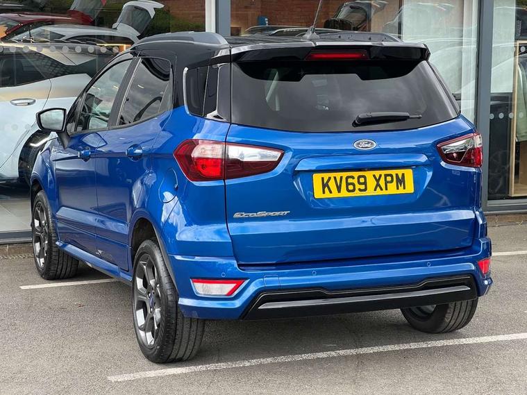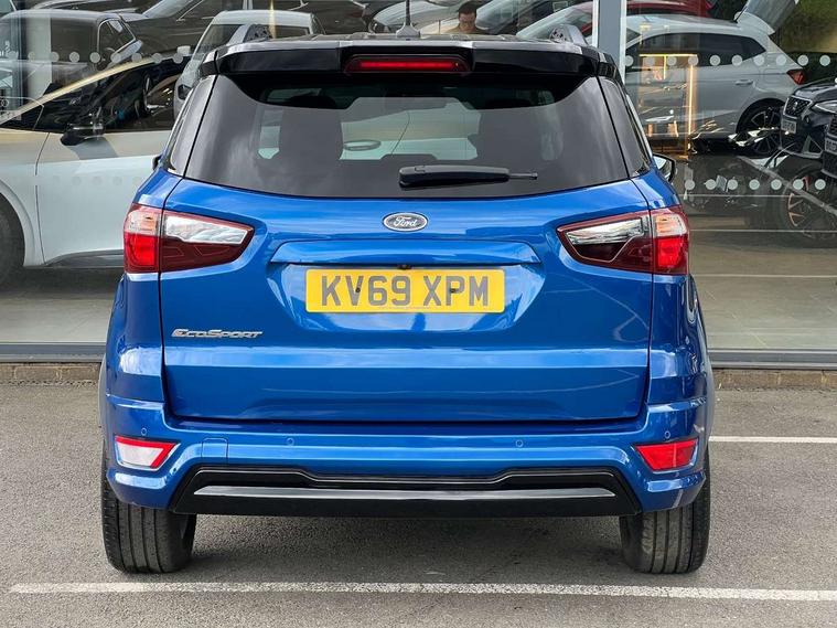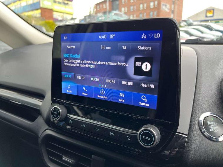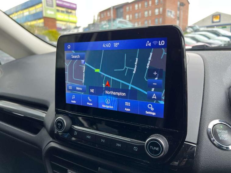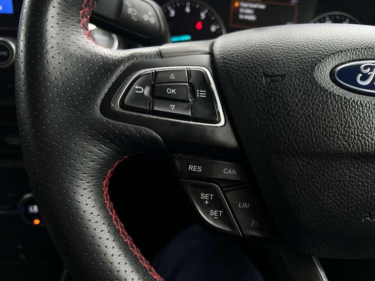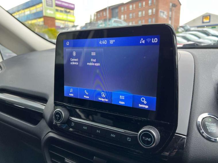 Cruise control, Easy fuel capless refuelling system, PAS, SYNC 3 nav system with DAB radio, 8" screen, voice control, emergency assistance, Apple car play/Android auto, 2x USB, Ford pass connect, Trip computer, Sports suspension, Steering wheel mounted audio controls, 'Quickclear' heated windscreen/heated washer jets, Auto dimming rear view mirror, Automatic headlights, Black roof rails, Body colour door handles, Body coloured bumpers, Electrically adjustable and heated door mirrors, Front door threshold plates with ST-Line logo, Front fog lights, Headlight levelling control, Large rear spoiler, Power foldable door mirrors with puddle lights, Power front and rear windows with global opening/closing, Rain sensing front wipers, Rear wiper, ST-Line body styling kit, ST-Line front grille, 12V socket in front and rear, 60/40 split rear seats, 7 shade adjustable ambient lighting, Centre console with sliding front armrest, Cooled glovebox, Courtesy lights with map reading light, Driver seat height/lumbar adjust, Driver's side glovebox, Driver/passenger sunvisors and lidded vanity mirrors, EATC - Electronic Auto Temperature control, Folding grab handles, Front head restraints, Front seat back map pockets, Front/rear floor mats, Illuminated glovebox, Illuminated luggage compartment, Isofix system on outer rear seats, Leather steering wheel/gearshift/handbrake lever with red stitching, Luggage compartment carpet, Overhead console with sunglasses holder, Partial leather upholstery, Rake adjustable rear seats, Reach + rake adjustable steering column, Rear headrests, Stainless steel sports pedals, Steering wheel with chrome inserts, Storage drawers under front seats, Tie down hooks, Variable boot floor, Rear view camera pack - Ecosport, 3x3 point rear seatbelts, ABS, Child locks on rear doors, Curtain airbags, Driver airbag, Drivers knee airbag, Electronic Stability Programme with hill launch assist, Emergency brake assist, Front passenger airbag deactivation, Front side airbags, Passenger airbag, Seatbelt reminder for driver and front passenger, Traction control, Tyre pressure monitoring system, Immobiliser, MyKey system, Remote central locking, Thatcham 1 volume sensing alarm, Tyre inflation kit,
