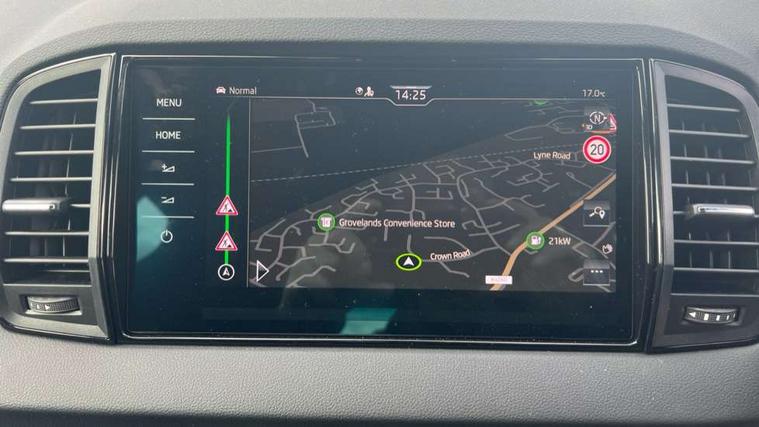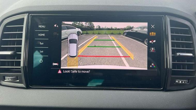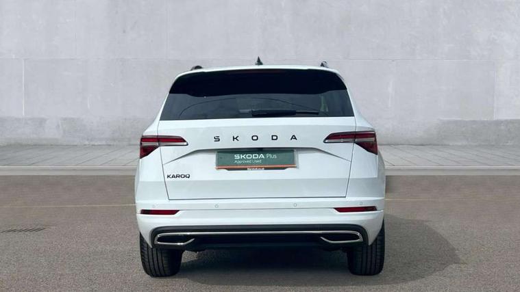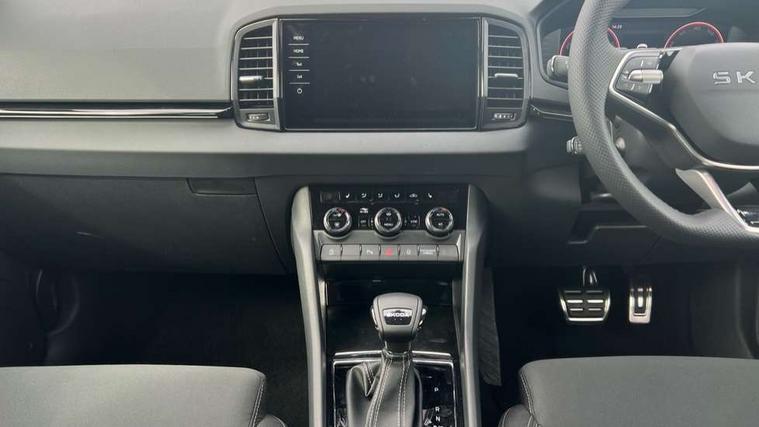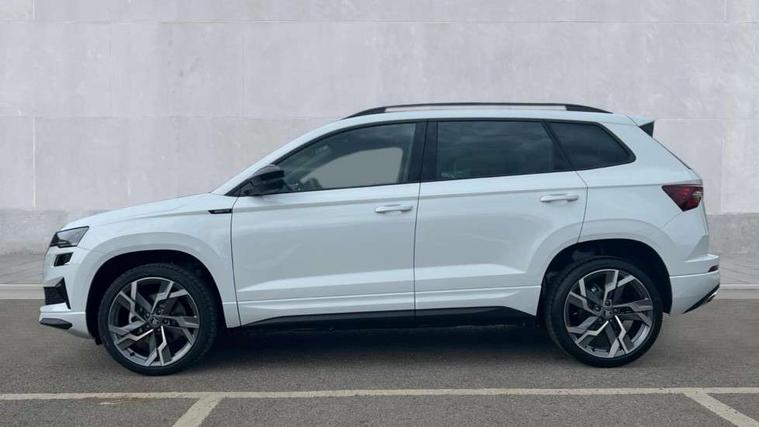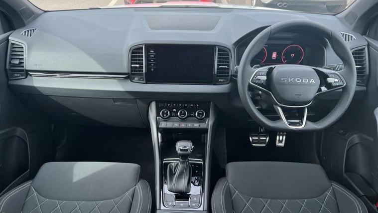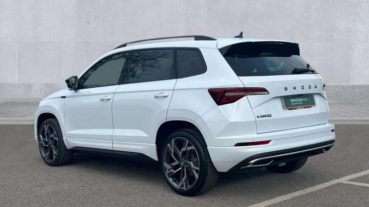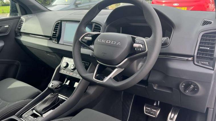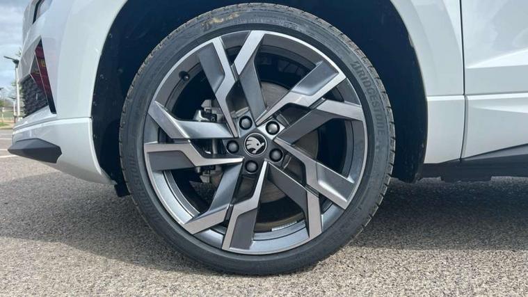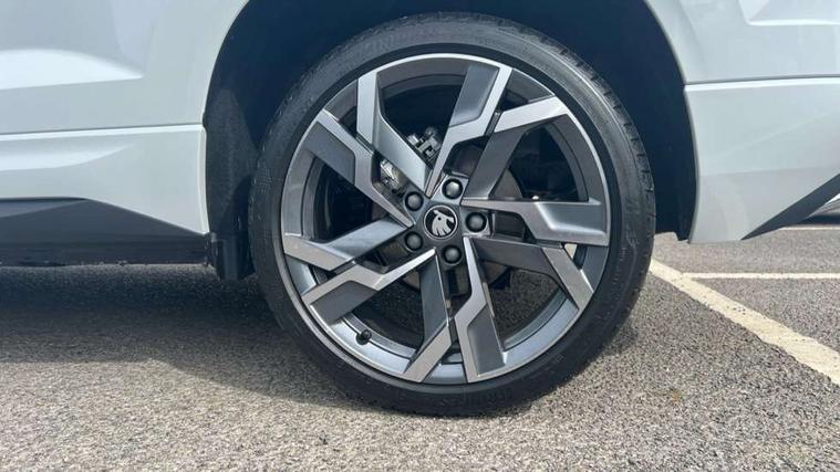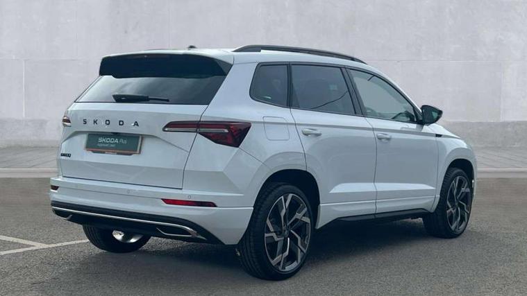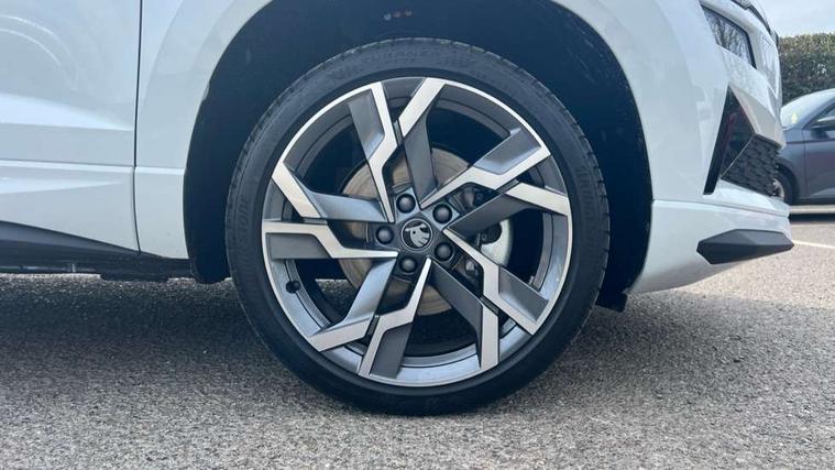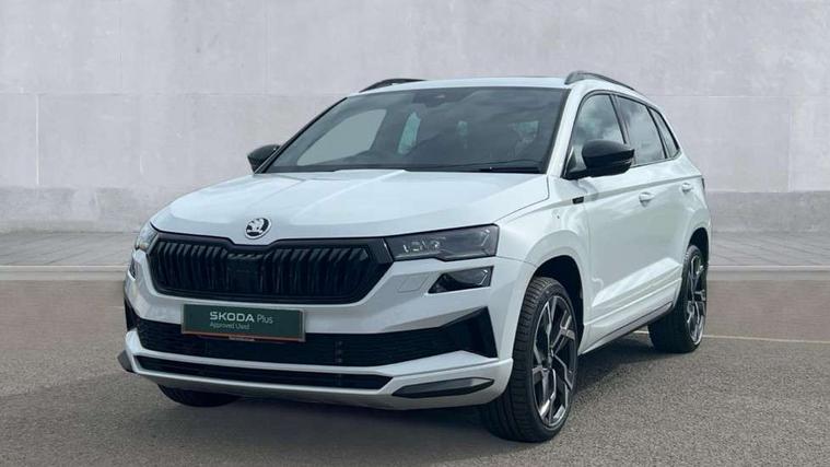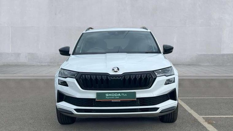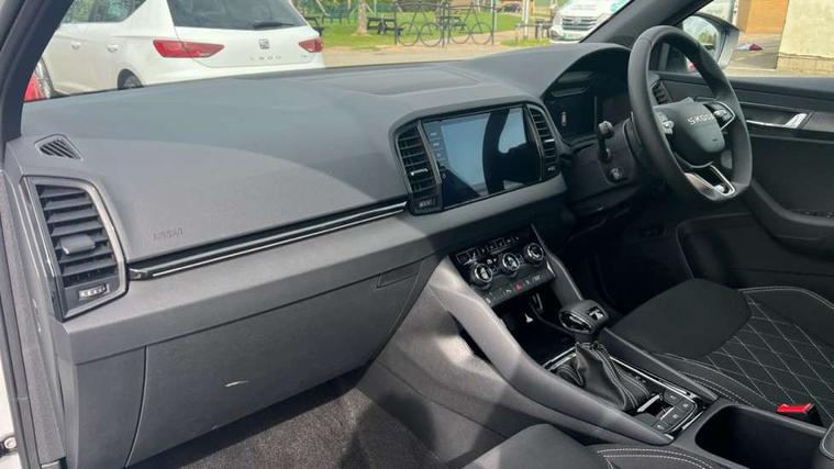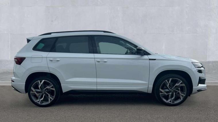 Emergency services call system, Interior driver monitoring camera, Multifunction camera for driver assistance system, Outside temperature gauge, Sensor for driver assistance systems, Service interval indicator, SmartLink wireless for Apple and wired for Android, Start/stop system with regenerative braking, Traffic sign recognition, USB C Port x 2 in front centre console, Virtual Cockpit - 10.25" digital display, Virtual pedal with electrically operated boot door, Wireless smartphone charging, DAB radio with Bluetooth, USB connection, Acoustic glass, Aero front windscreen wipers with intermittent function, Auto dimming rear view mirror with light and rain sensors, Black door mirrors, Black electric window control buttons, Black radiator grille, Black roof rails, Body colour door handles, Electric front and rear windows with child proof lock, Extended rear roof spoiler, Front door steps with SportLine logo, Heated rear windscreen, LED daytime running lights, LED rear lights with high functionality welcome effect and dynamic indicators, Light assistant (coming/leaving home/tunnel light), Panoramic sliding sunroof, Plastic scuff plates in door apertures, Privacy glass, Protective door side sills in body colour, Rear diffuser, Rear side wing doors, Rear window wiper with washer system and intermittent control, Safety reflectors on front doors, Skoda lettering on tailgate in black, Sportline badge on front fender, Sports front and rear bumpers, Third brake light, Unique dark chrome design logo on alloy wheels, 1.5 litre bottle holders in driver and front passenger door panels, 12V socket in boot, 12v socket in front centre armrest with storage compartment and rear air vents, 2 x Tablet holder, 3 rear height adjustable headrests, 3 seat bench in 2nd row, 3 spoke sports leather heated multifunction steering wheel with DSG paddles, 4 foldable roof handles with rear coat hooks, Black floor carpet, Cargo elements in boot, Chrome inner door handles, Foldable hooks in the boot, Front head restraints, Height adjustable front three point seats belts with tensioners, Height/reach adjust steering wheel, Ice scraper, Illuminated glovebox, Illuminated luggage compartment, Isofix child seat preparation for front passenger seat, Isofix child seat preparation outer rear, Manual lumbar support for front seats, Pen holder, Pollen filter, Rear backrest release from boot, Rear boot cover, Rear package tray, Rear reading lights, Rear seats fixed folding and divided 60:40, Rubbish bin door, Safety vest holder, Single front passenger seat, Skoda lettering on steering wheel, Sportline decorative inserts, Storage box in upper central dashboard closed, Sunvisors with illuminated vanity mirrors, Textile floor mats, Ticket holder, Titan black interior ceiling, Umbrella under passenger seat, Under passenger seat storage compartment, Columbus pack - Karoq, LED Interior lighting pack with Skoda welcome logo - Karoq, Light Pack - Karoq, Non Smokers pack, Performance pack - Karoq, Winter plus pack with heated front and rear seats - Karoq, Automatic door unlocking in case of crash, Automatic fuel cut off in case of crash, Driver airbag, Electronic parking brake with auto hold function, Emergency rear braking signal, ESC (incl. ABS+MSR+ASR+EDS+HBA+DSR+RBS+MKB), Front side airbags, Head airbags, Hill hold control, Knee airbags, Passenger airbag with switch-off function, Pedestrian monitor, Power operated child safety locks, Seatbelt reminder signalisation and pretensioner for all seats, Three point seatbelts rear, Two tone horn, Tyre pressure monitor, Alarm with interior monitoring, back up horn and tilt sensor with safe function, Electronic engine immobiliser, Keyless entry and start/stop, Remote central locking with 2 remote folding keys, Black air vent surround, Black centre console, carbon door decor, Satin black dashboard, Satin black door trim, 19" Sagittarius anthracite alloy wheels, Anti-theft wheel bolts protection, Breakdown and tool kit,